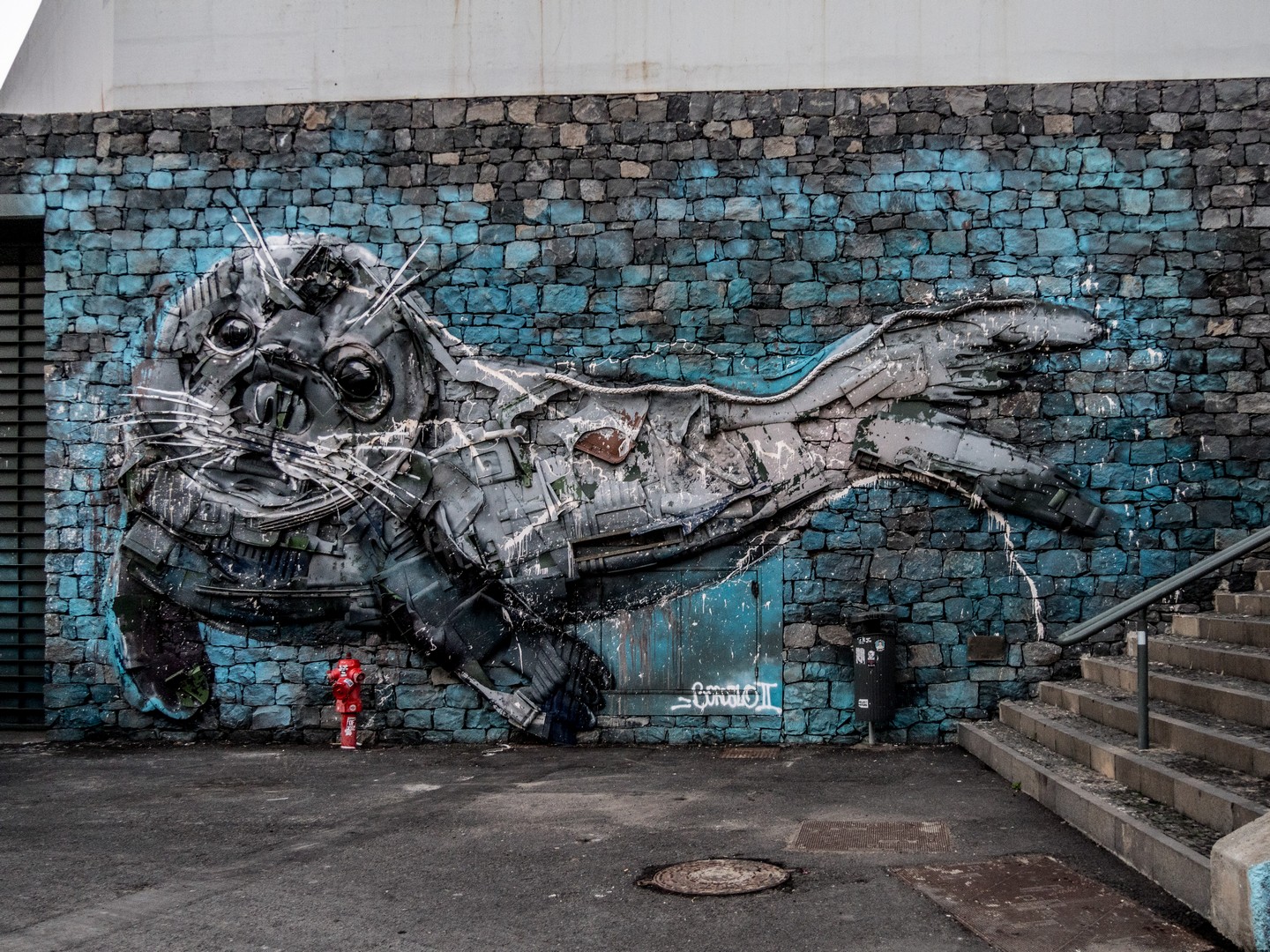 Le street-art s’est aussi frayé un chemin en ville. Tout d’abord avec une série de fresques réalisées avec des canettes de soda. A l’origine de couleurs éclatantes, le soleil, le sel marin et les intempéries ont fini par les délaver mais cela donne un côté presque vivant à ces morceaux d’aluminium, qui semblent faner comme de vieilles fleurs. Plus loin, ce sont des bidons d’essence qui ont été customisés et peints pour accueillir des plantes qui ornent les trottoirs. Mais l’œuvre la plus connue et le « lobo » de Bordalo II. Câmara de Lobos tire son nom non pas du loup, mais du « loup de mer », le nom portugais du phoque. Ils vivaient en nombre ici jusqu’à ce qu’ils soient chassés par les humains. Heureusement, ils sont de retour et protégés, ils sont juste un peu plus loin mais le street-artist Bordalo II, connu pour réaliser des fresques avec des déchets, en a réalisé une énorme au bout du port figurant un grand phoque gris. Je prends le temps de faire quelques photos, avant que ne nous ne soyons appelés pour dîner.