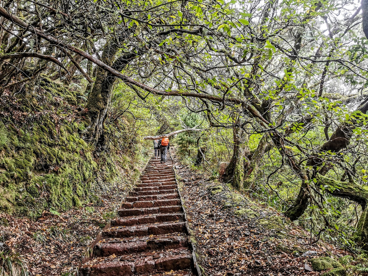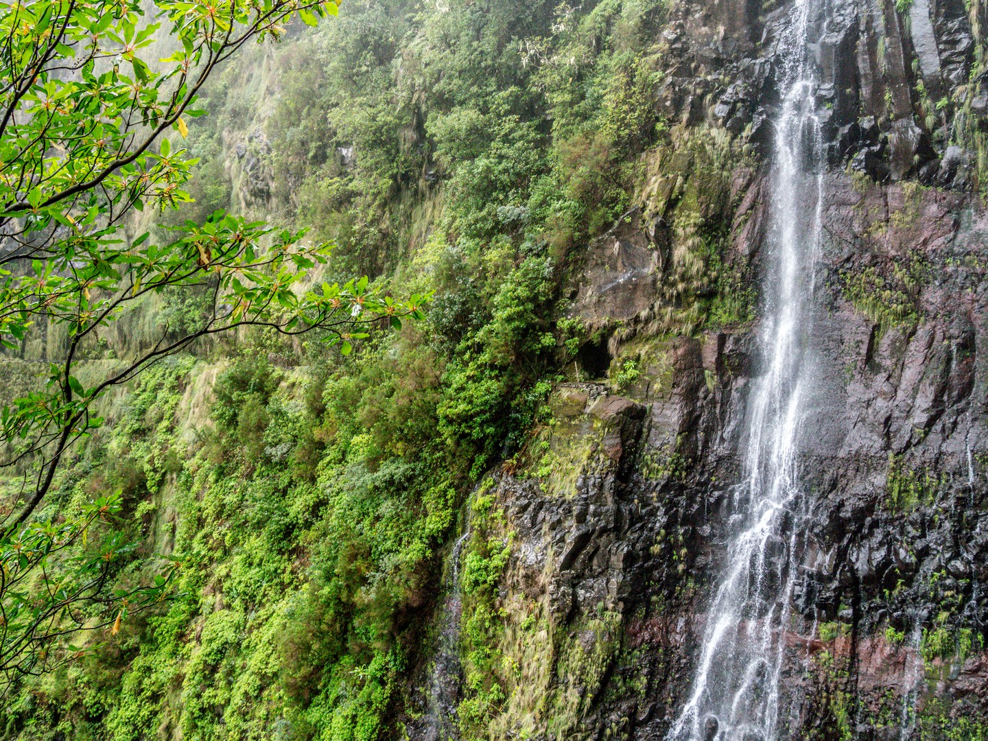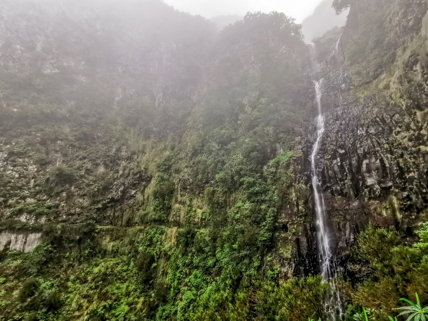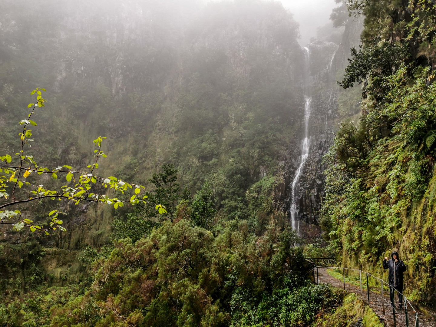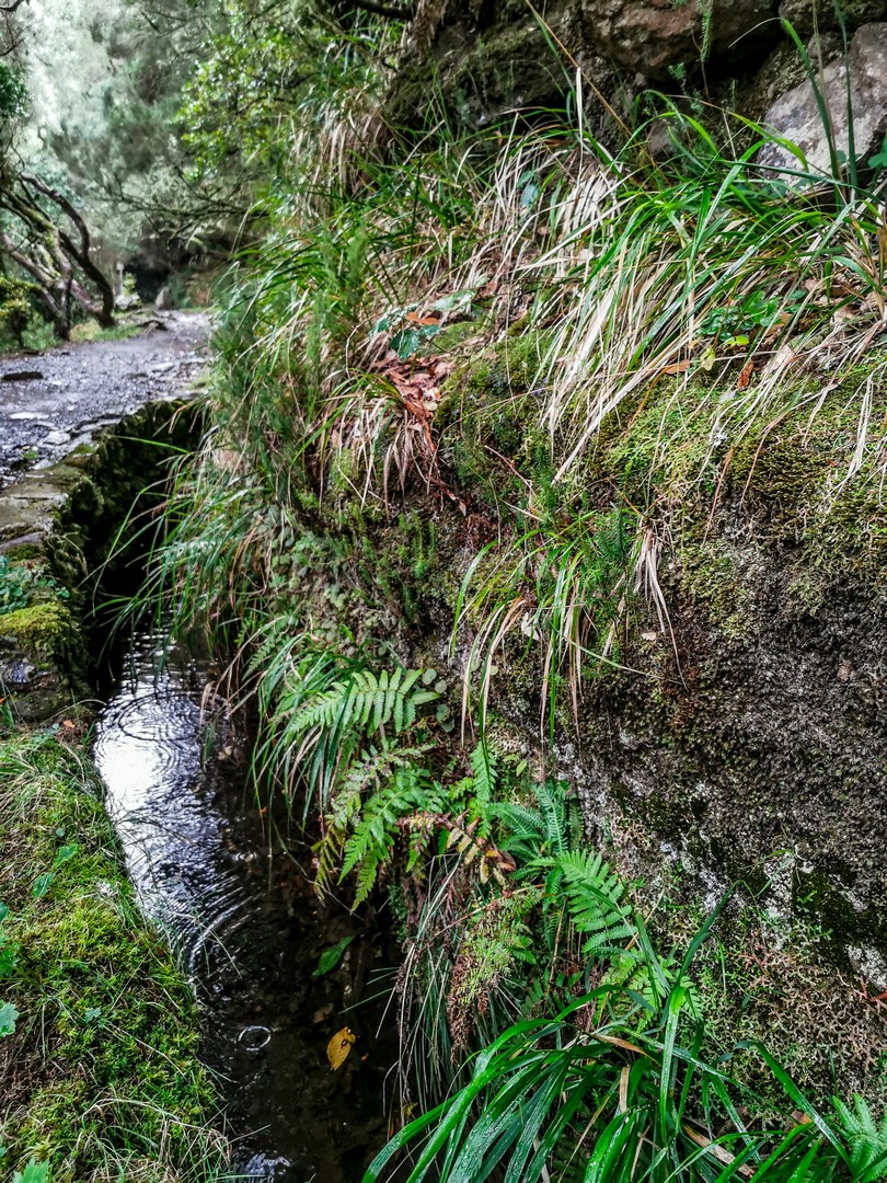 Avec cette météo grise et les nuages bas, les reliefs escarpés et les paysages fait d’arbres, de lianes et de fougères rend l’atmosphère encore plus mystérieuse.. Des images de Jurassic Park me viennent à l’esprit. Il pleuvine mais il fait doux, et le sentier bien entretenu, pas de risque de glisser ! Sam nous fait découvrir les plantes et arbres, nous raconte l’histoire des levadas, Le tout est rythmé par le doux son de l’eau. Celle de la petite pluie et de l’eau qui circule dans les levadas mais aussi par les chants d’oiseaux, dont celui des serins de Canaries, l’ancêtre de tous les canaris domestiques. Ce petit passereau au plumage vert et brun n’est pas spécialement timide et vous le croiserez le long des sentiers.