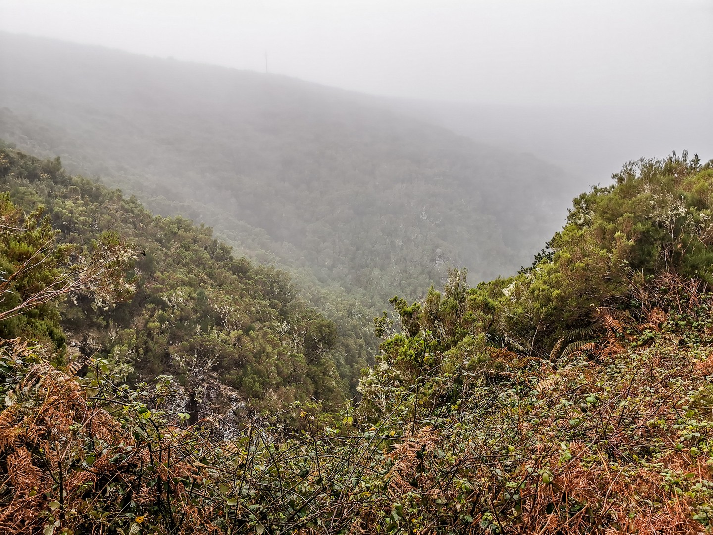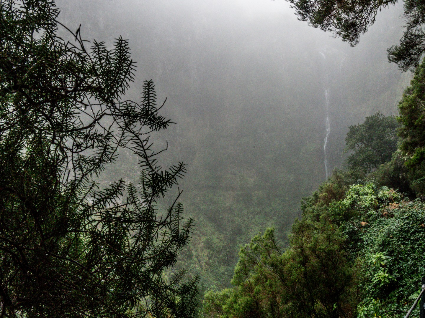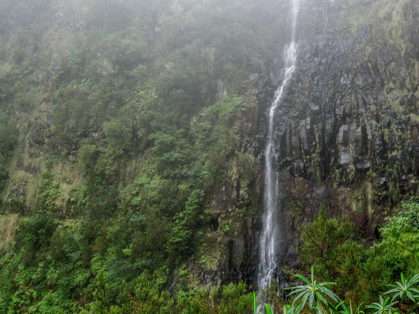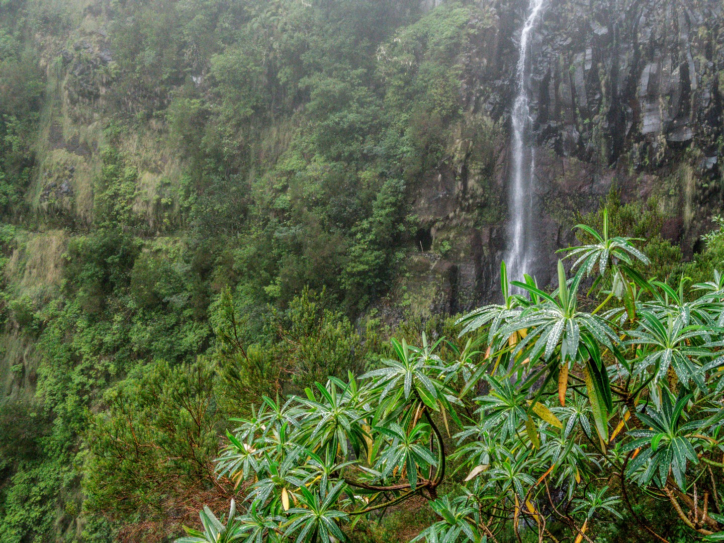 Avec cette météo grise et les nuages bas, les reliefs escarpés et les paysages fait d’arbres, de lianes et de fougères rend l’atmosphère encore plus mystérieuse.. Des images de Jurassic Park me viennent à l’esprit. Il pleuvine mais il fait doux, et le sentier bien entretenu, pas de risque de glisser ! Sam nous fait découvrir les plantes et arbres, nous raconte l’histoire des levadas, Le tout est rythmé par le doux son de l’eau. Celle de la petite pluie et de l’eau qui circule dans les levadas mais aussi par les chants d’oiseaux, dont celui des serins de Canaries, l’ancêtre de tous les canaris domestiques. Ce petit passereau au plumage vert et brun n’est pas spécialement timide et vous le croiserez le long des sentiers.