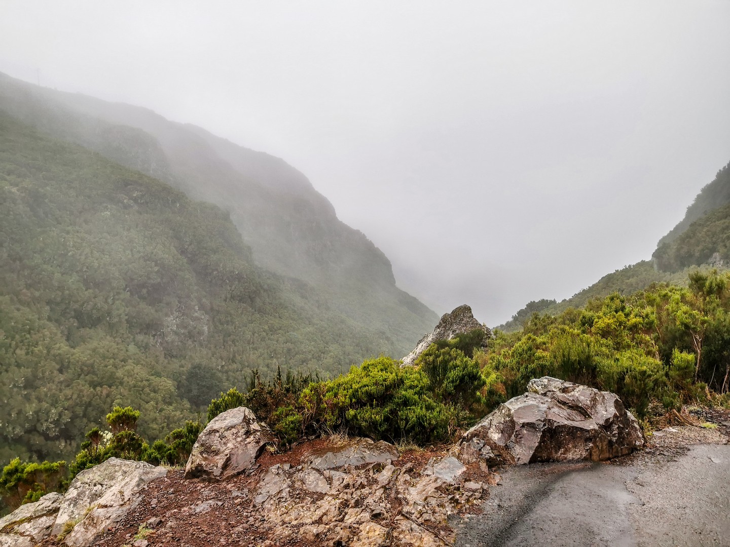 Le lendemain matin, nous quittons la côte sud de Madère pour ses montagnes du centre. L’ambiance est bien différente des deux derniers jours. Déjà, le soleil s’est levé tout gris et comme l’altitude nous rapproche des nuages, il fait beien gris et humide. Il pleuvine même. Rien qui ne nous dissuade pour faire une bonne petite rando sous la houlette de Sam, le guide de Madeira Adventure Kingdom qui va nous accompagner le long d’une activité devenue incontournable à Madère : la Levada Walk (que je traduirai comme « rando-levada ».