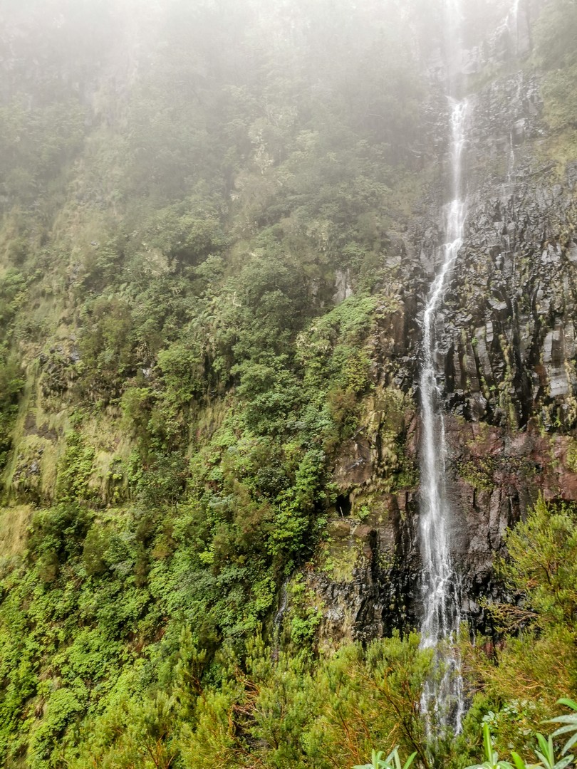 Au plus nous avançons, au plus la nature se fait sauvage avant d’arriver à flanc de montagne et de suivre le sentier jusqu’à la cascade do Risco, une superbe chute d’eau qui se déverse sans doute dans une piscine naturelle, mais qu’on ne voit pas tellement elle est noyée dans la végétation. Après avoir bien profité de ce spectacle de la nature, nous revenons sur nos pas et après avoir gravis des marches d’escalier (la seule montée de la matinée), nous voilà arrivé au Rabaçal Nature Spot Café, un café qui tombe à pic car la pluie se fait plus forte et même si les températures sont clémentes, l’humidité nous a un peu refroidies.