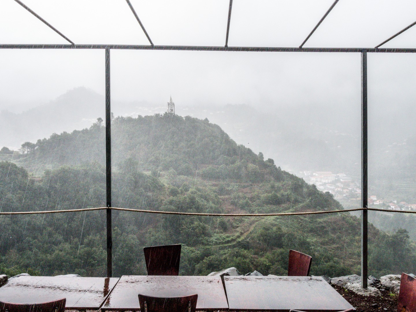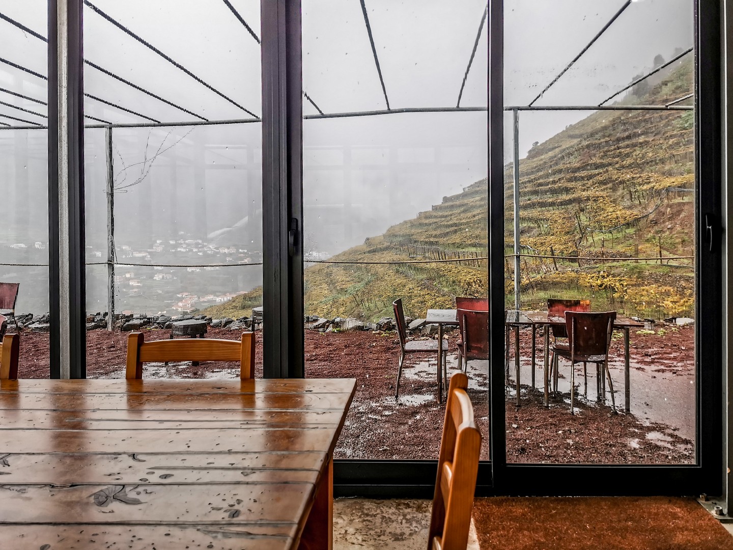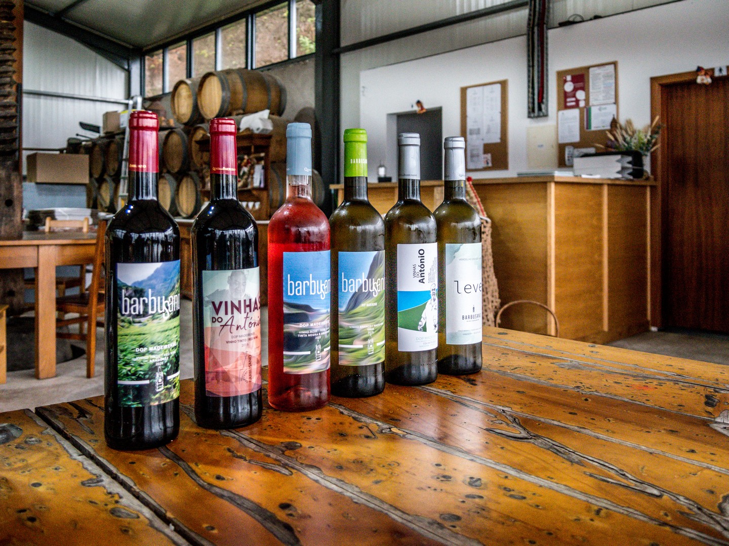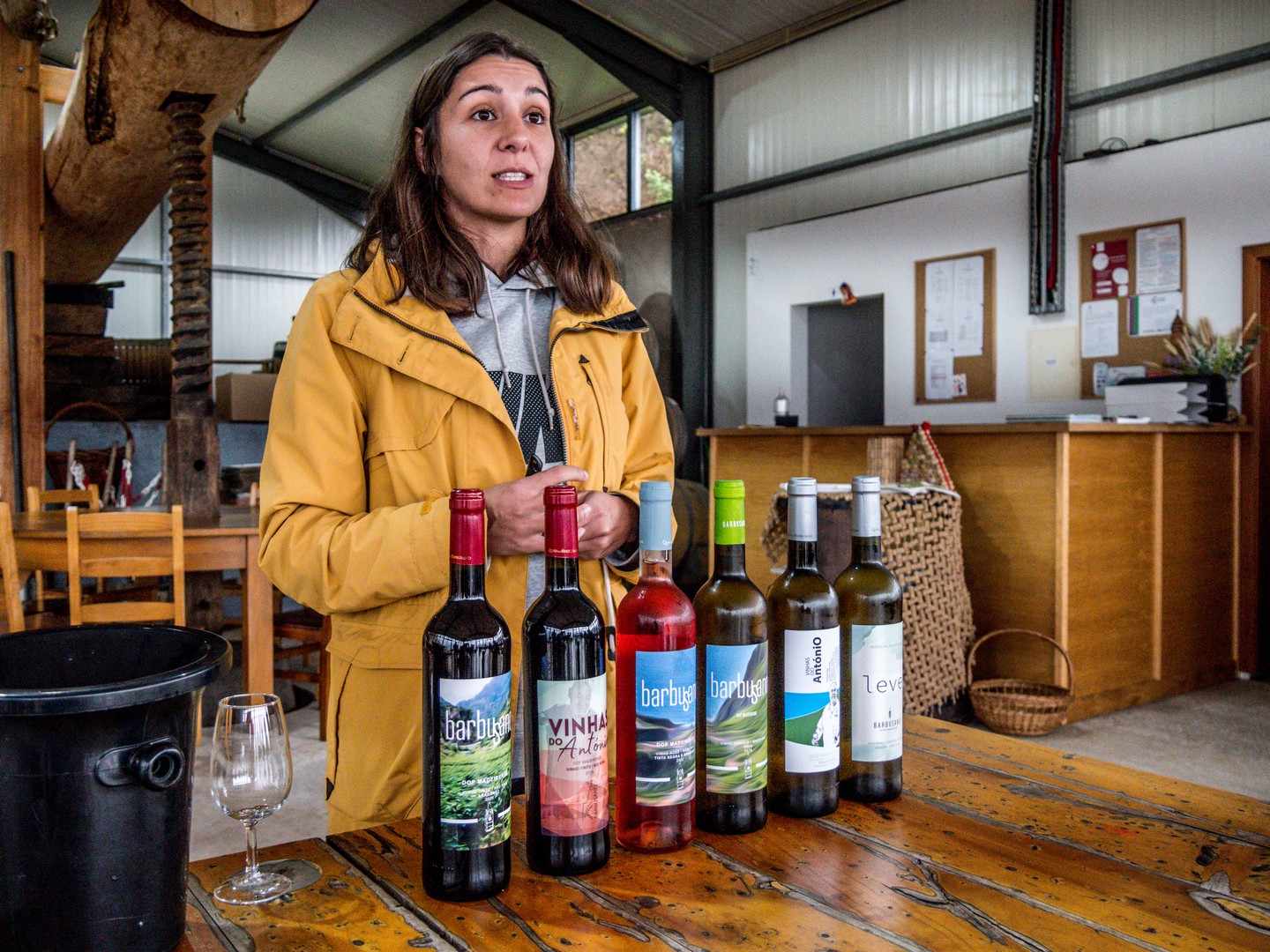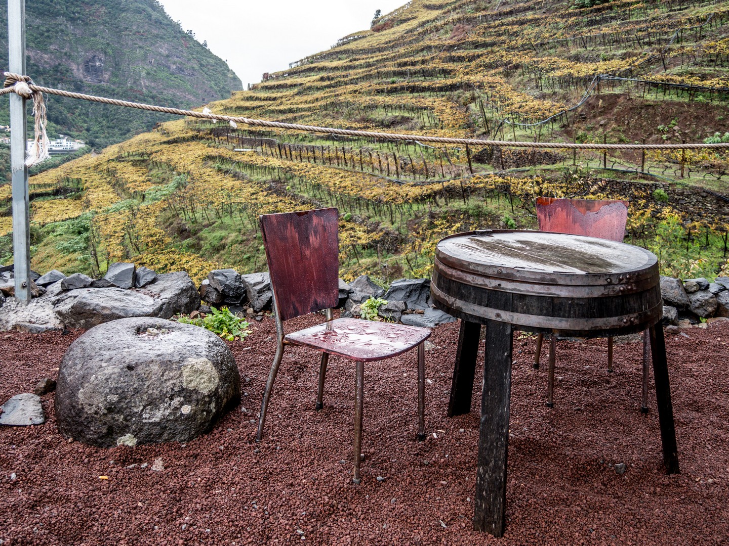 Après avoir cassé la croute, Sam nous invite à embarquer pour notre prochaine étape, beaucoup moins physique, le vignoble de la Quinta do Barbusano. Le barbusano, c’est une espèce de laurier qui porte des fruits qui ressemblent à des olives noires, le vignoble est donc bien ancré dans son terroir du nord. L’exploitation est située sur des collines juste en face du village de Saõ Vincente et offre une vue de rêve sur la Chapelle de Notre-Dame-de-Fâtima et les premières maisons de Saõ Vincente. Un lieu bien choisi pour une dégustation ! Malheureusement pour nous, il continue de pleuvoir et nous ne pourrons pas explorer le vignoble (ce qui fait normalement partie du programme). Dommage, nous nous contentons donc de la dégustation, ce qui est déjà pas mal !