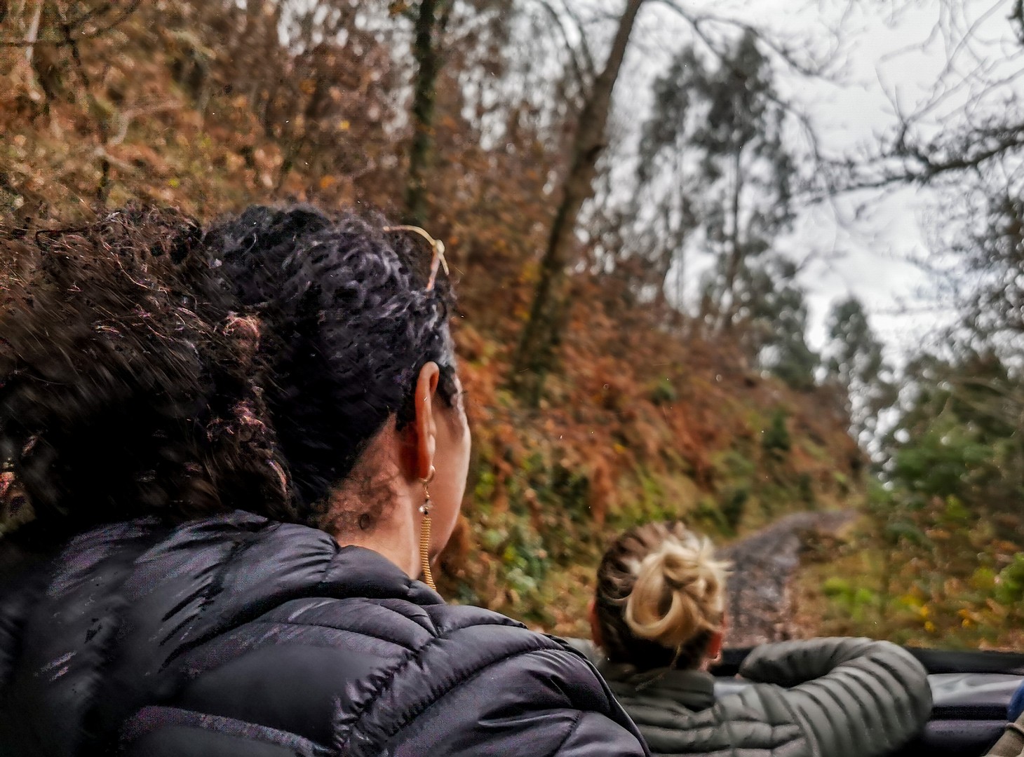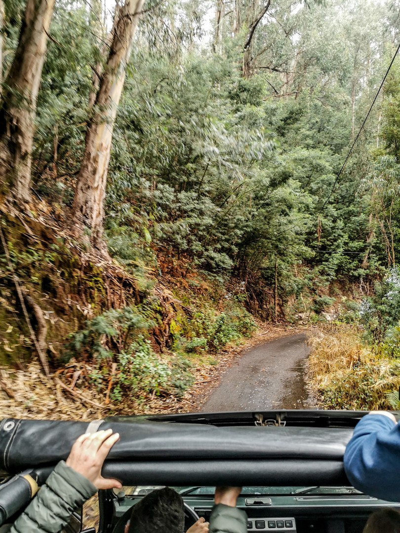 C’est en jeep qu’on vient nous chercher pour la dernière aventure de la journée : un safari en 4×4, en partie en off-road avec Mountain Expeditions. Une accalmie va nous permettre de décapoter la jeep, et c’est parti pour le fun ! Rien à faire, une fois qu’on est en voiture et que vent et la vitesse fouettent nos visages et emmêlent nos cheveux, on a le sourire aux lèvres. Nous allons traverser l’île de part en part, du nord au sud, depuis la Quinta vers le Mirador de Saõ Sebastiaõ à Ribeira Brava. Ici, c’est l’océan qui remplit le paysage. A gauche, la côte en direction de Câmara de Lobos, à droite, Ponta do Sol et ses rochers. Et à partir de là, nous allons quitter les routes principales pour s’enfoncer dans la forêt, en off-road. Si les sentiers sont balisés par le passage de jeep avant lui, le 4×4 peine un peu à certains endroits bien boueux. Dans l’habitacle, nous sommes secouées comme dans un panier en salade et on n’en peut plus de rire ! Heureusement, nous ne roulons pas trop vite, ce qui donne quand même l’occasion d’admirer la forêt.