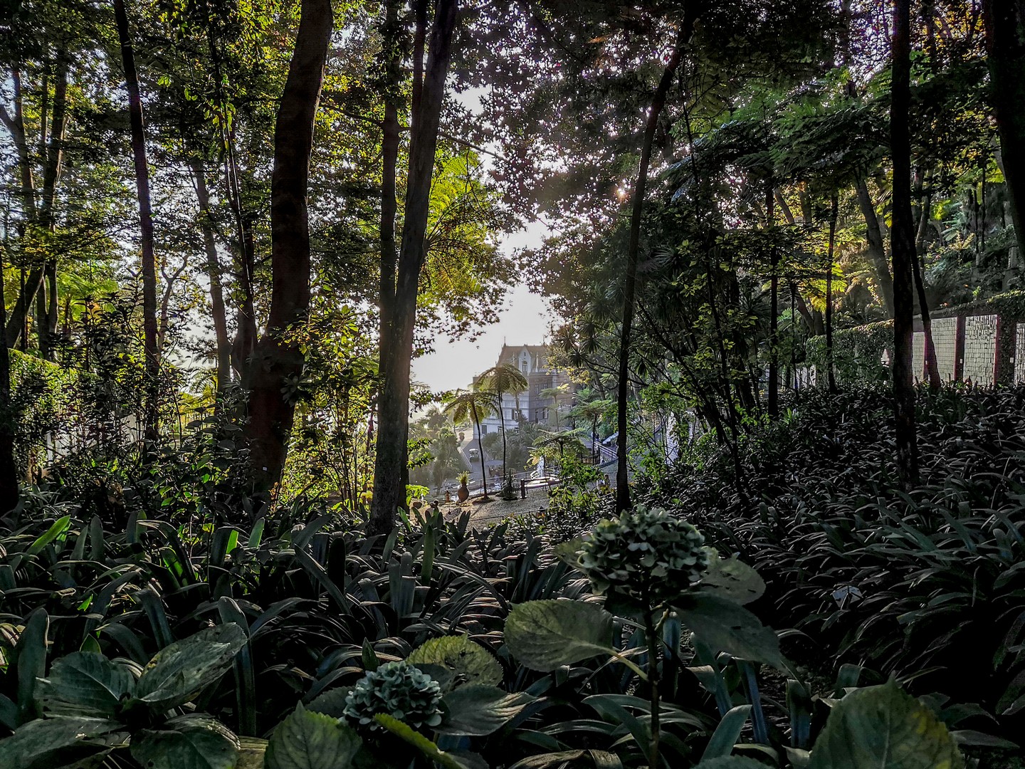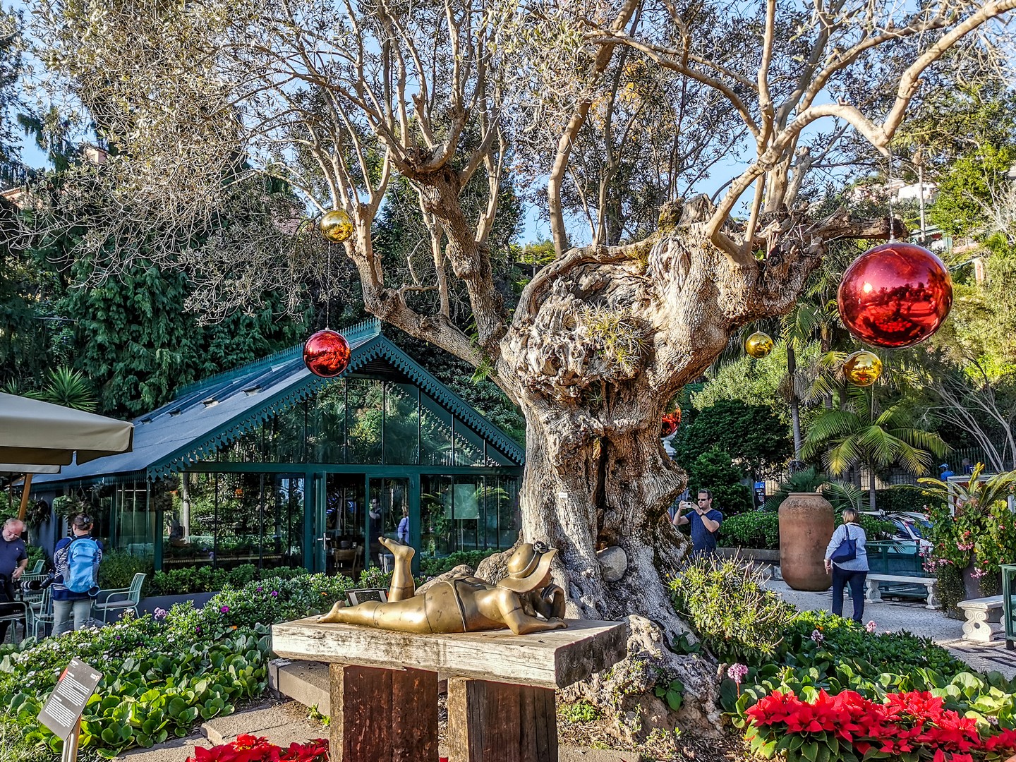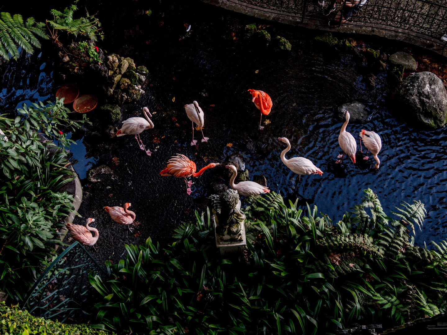 Quant aux jardins, ils regroupent une large gamme d’espèces issus de différents climats. Depuis les bruyères, azalées et hortensias jusqu’aux fougères arborescentes, palmiers, un jardin oriental, un petit lac… et même des flamants roses en résidence permanente. On peut passer des heures à s’y promèner le long d’escaliers qui montent et descendent, rythmés par des oeuvres d’art antiques et contemporaines. Une curiosité : une espèce de grottes où sont exposés des gemmes, dont d’énormes améthystes.