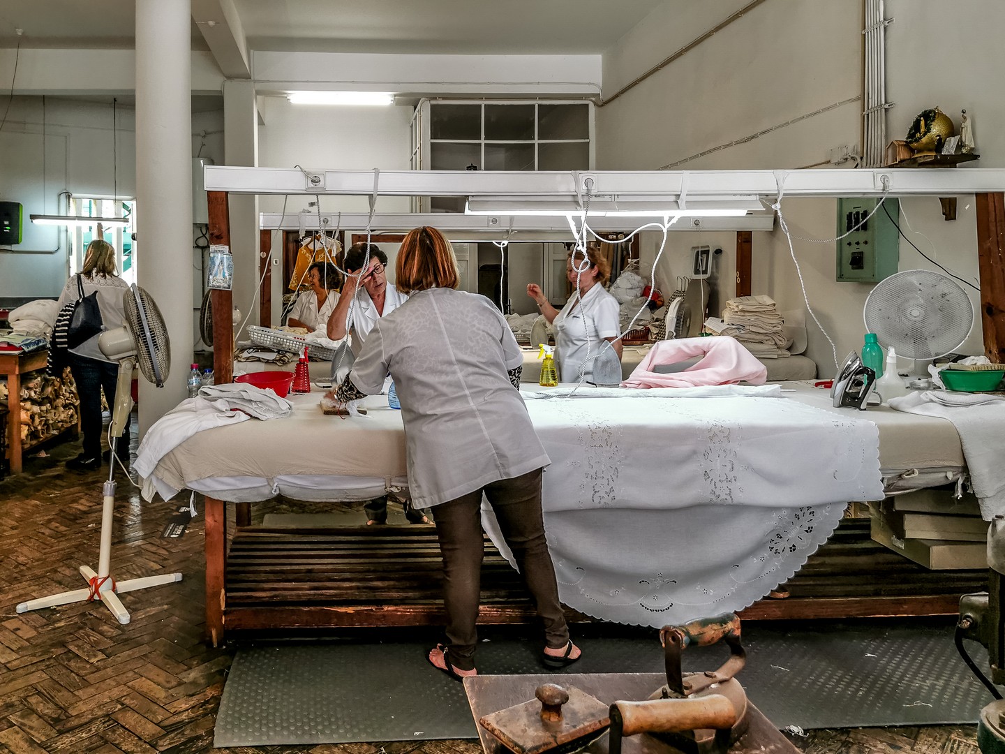 La broderie de Madère est un artisanat qui remonte aux débuts du peuplement de l’île. Même aujourd’hui, elle reste faite à la main. C’est au XIXe que la broderie commence à devenir une affaire sérieuse à Madère et ce sont à nouveau les Anglais, qui étaientt déjà friands du vin local, qui vont s’enticher de la broderie et la populariser. Tant et si bien que le trousseau du couple d’York (le prince Andrew et Sarah Ferguson) sera fait à Madère. C’est ce que nous allons découvrir dans les ateliers de Bordal, le plus célèbre fabricant de broderie. En entrant, on a vraiment l’impression de faire un saut en arrière dans le temps. Bordal compte plus de 60.000 designs dans ses cartons (en plus de nouveaux qui sont crées par leurs designers). En grimpant les escaliers, on découvre la première étape du travail manuel : le picotage où la piqueuse (une majorité de femmes travaille dans ce secteur), troue un patron de papier en suivant le motif.