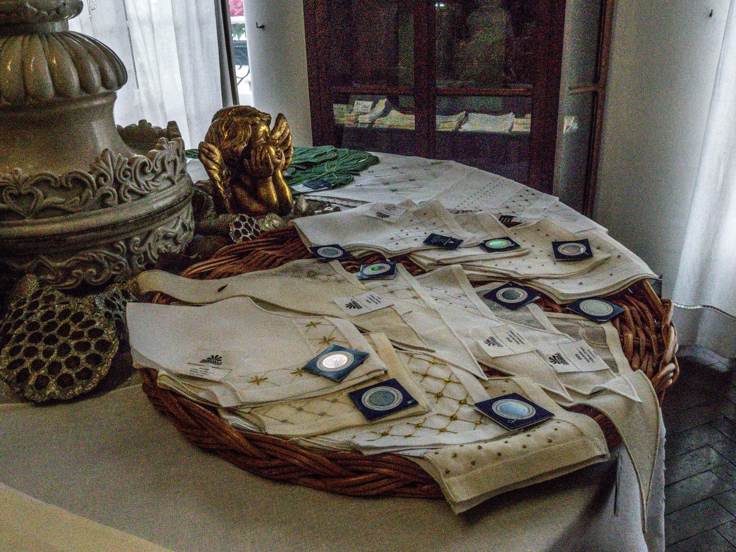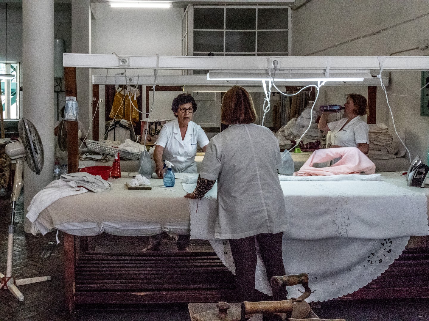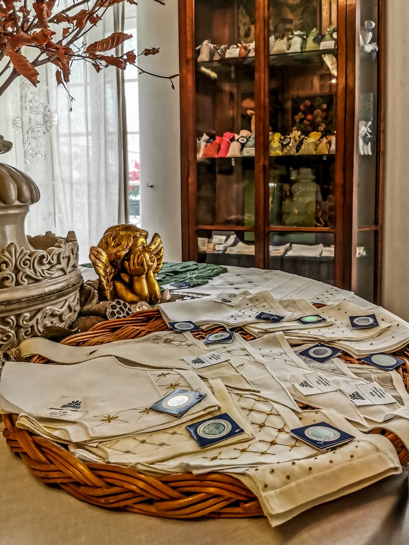 Le papier passe ensuite à l’estampage où on applique une teinte bleue sur le patron. la teinture passe à travers les trous sur le tissu, laissant le modèle à suivre pour les brodeuses. Si nécessaire, les tissus sont cousus avant d’être envoyés chez les différentes brodeuses réparties à travers l’île et qui effectuent le travail à la main. Une fois l’ouvrage terminé, il est ramené à l’atelier, lavé, cousu si nécessaire, repassé et prêt à être vendu. En cette époque de Noël, ce sont surtout les articles de tables (serviettes, nappes, décorations, couvertures de pain ou de bouteilles de vin…) qui sont mises en avant mais on trouve aussi des chemises, robes, vêtements pour enfants (particulièrement mignons) en coton ou en lin. En plus d’avoir travaillé avec de grandes maisons comme Chanel, Bordal décore d’ailleurs la grande table du repas de Noël (qui se tenait le soir même de notre visite) et nous avons même croisé le patron, qui rentrait à l’atelier après avoir inspecté que tout était en ordre. Si vous aimez ce genre de choses (j’ai vraiment hésité à acheter des décos de table en forme de poinsettias brodés), c’est LE souvenir à ramener de Madère.