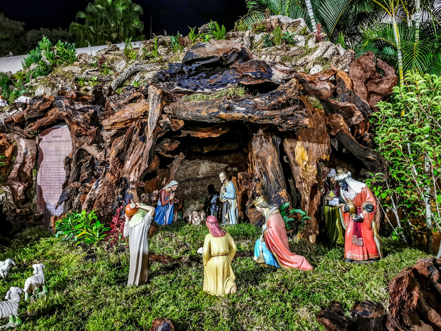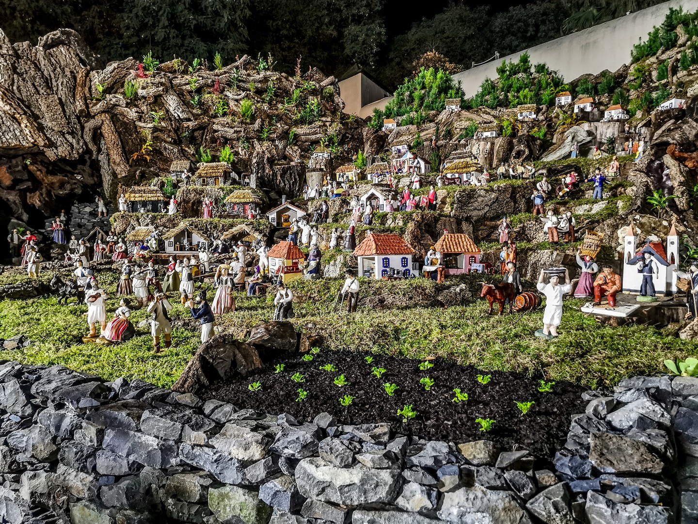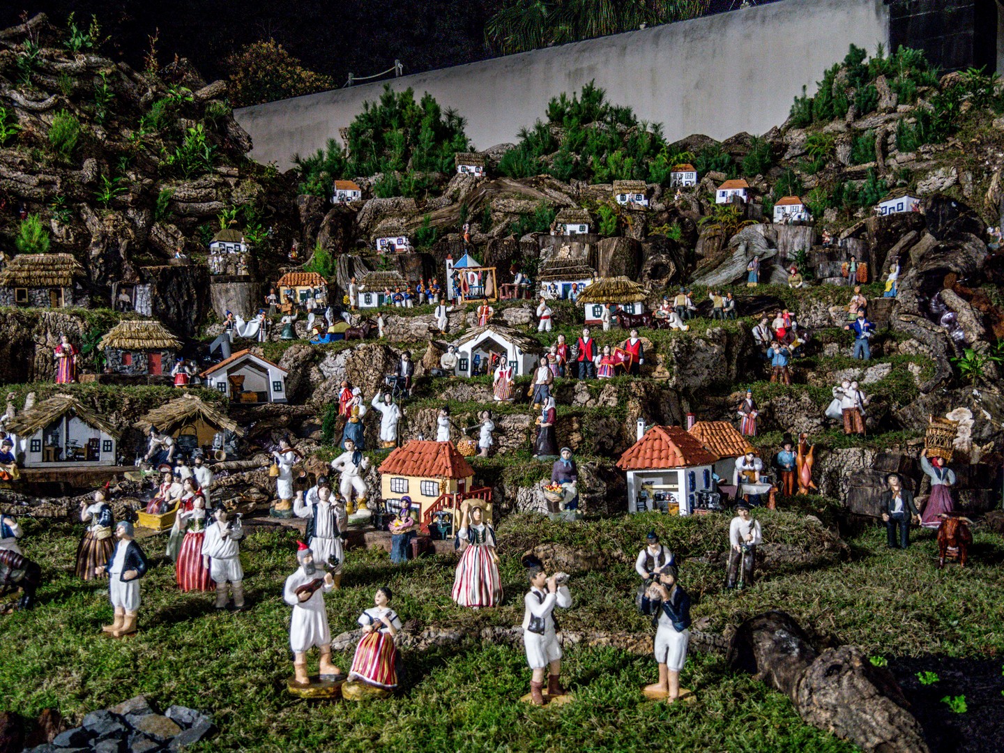 Une fois le soir tombé, Funchal reste animée avec ses nombreux bars et ses petits restaurants. L’été, la fraîcheur s’installe et il fait bon se promener par contre; si vous êtes à Madère pendant la période de l’Avent, vous allez en prendre plein les yeux. Noël se fête en grande pompe et jamais je n’ai vu une ville aussi illuminée. On dirait que pas une seule rue n’y échappe. Dans le vieux Funchal, le marché de Noël s’allume, avec chalet de nourritures, d’artisanat, chants de Noël et bien sûr, une immense crêche. En plus de la classique scène de Nativité, la crêche se prolonge avec des scènes de la Madère de jadis. Des figurines d’habitants en costumes traditionnels reproduisent des scènes de la vie quotidienne : on cultive son potager, un guitariste sérénade une dame, autre autre porte un pannier d’osier sur sa tête, un fermier monte sur le dos de son boeuf… C’est charmant et les détails sont minutieux.