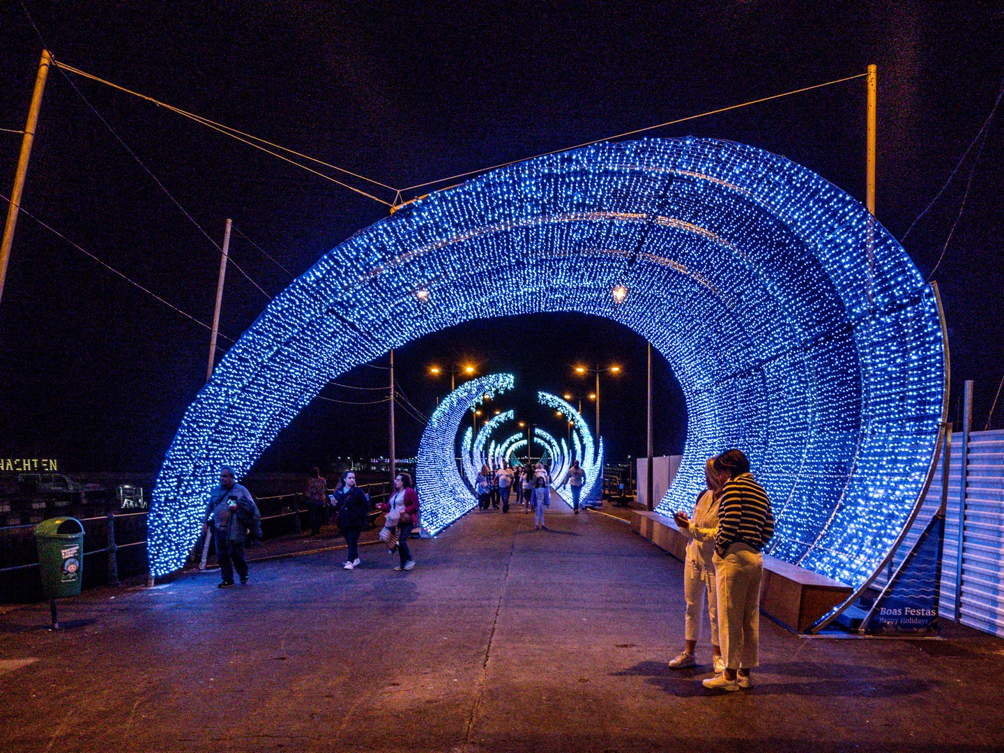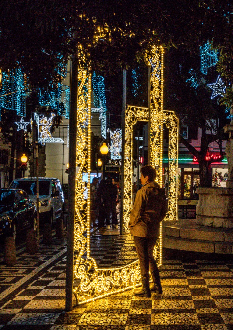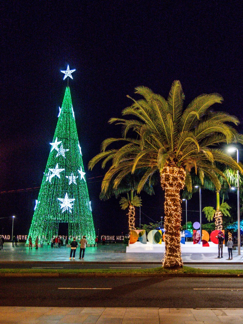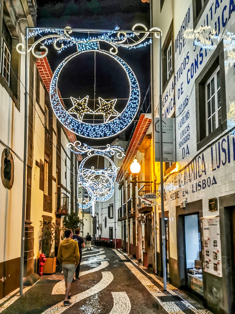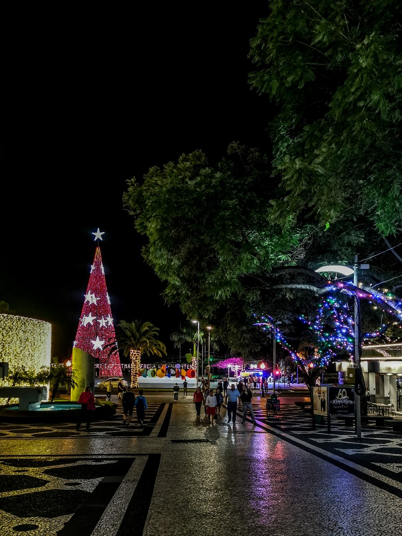 Quel sentiment étrange que de se balader dans un marché de Noël en t-shirt et veste légère ! Et pourtant, l’ambiance de fête est la même, juste un peu plus alanguie par l’air venant de l’océan, quand la balade s’achève sur l’Avenida do Mar. S’ajoute aux illuminations un grand paquebot, qui quitte lentement le port de Funchal, comme un ornement de sapin de Noël qui glisserait dans un grand vide noir.
