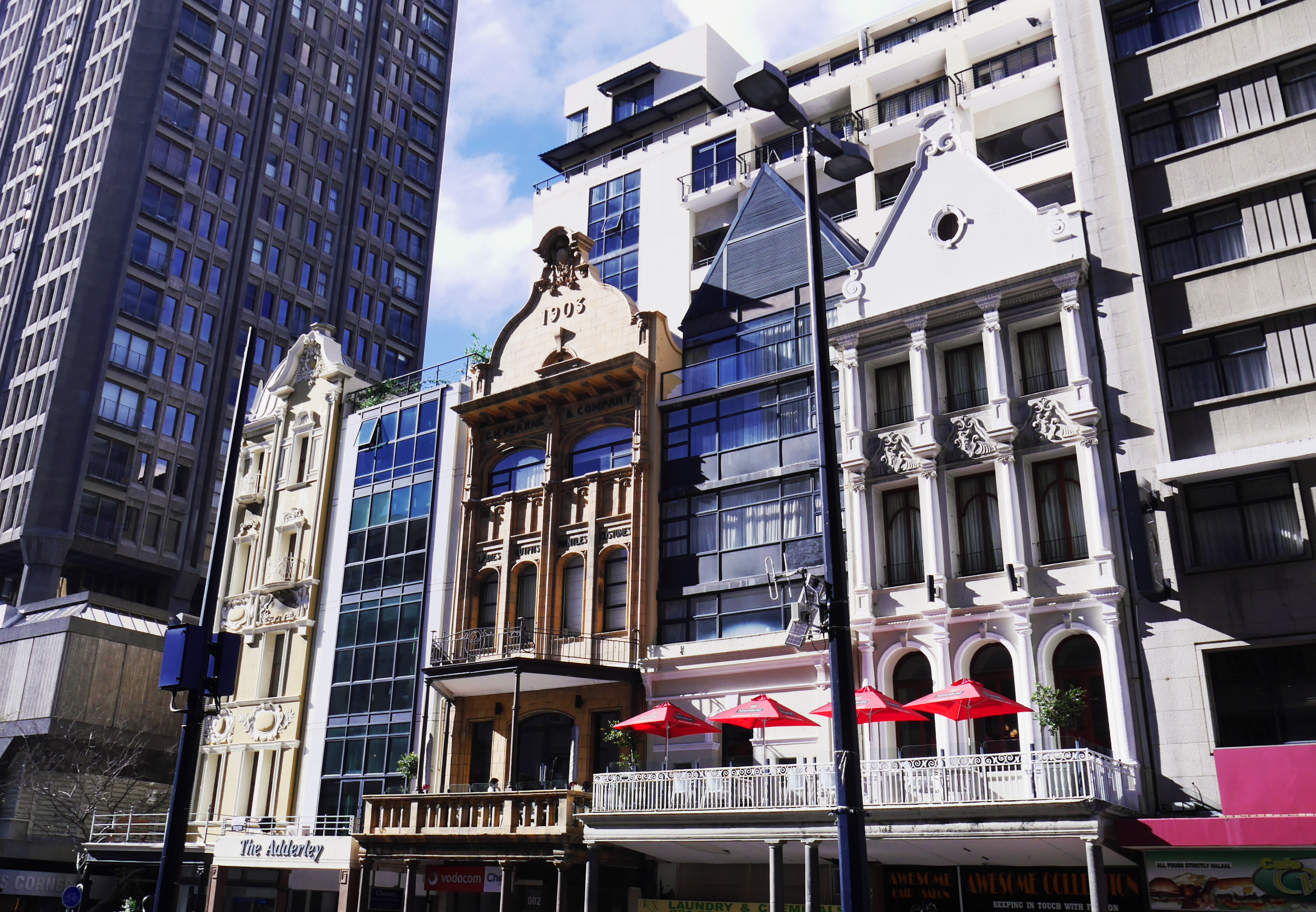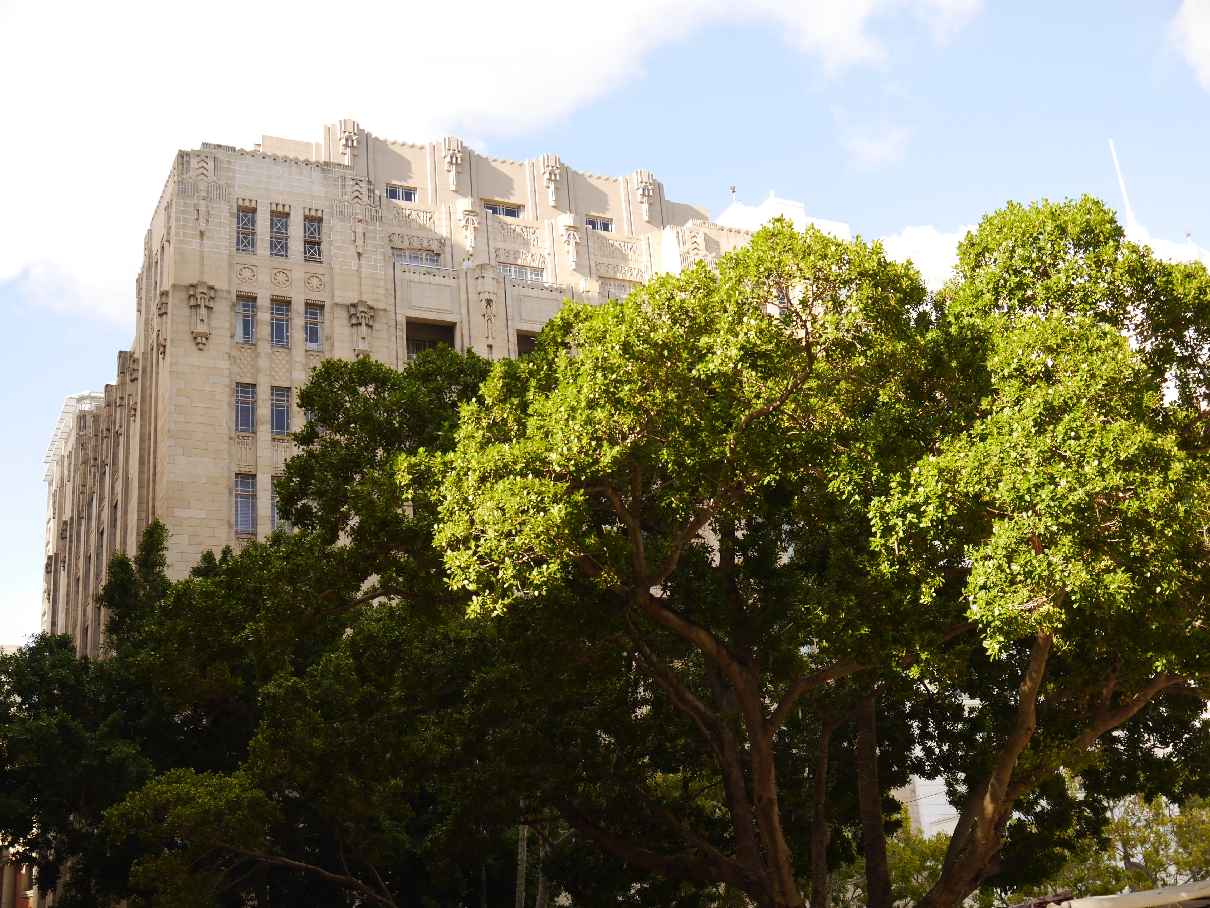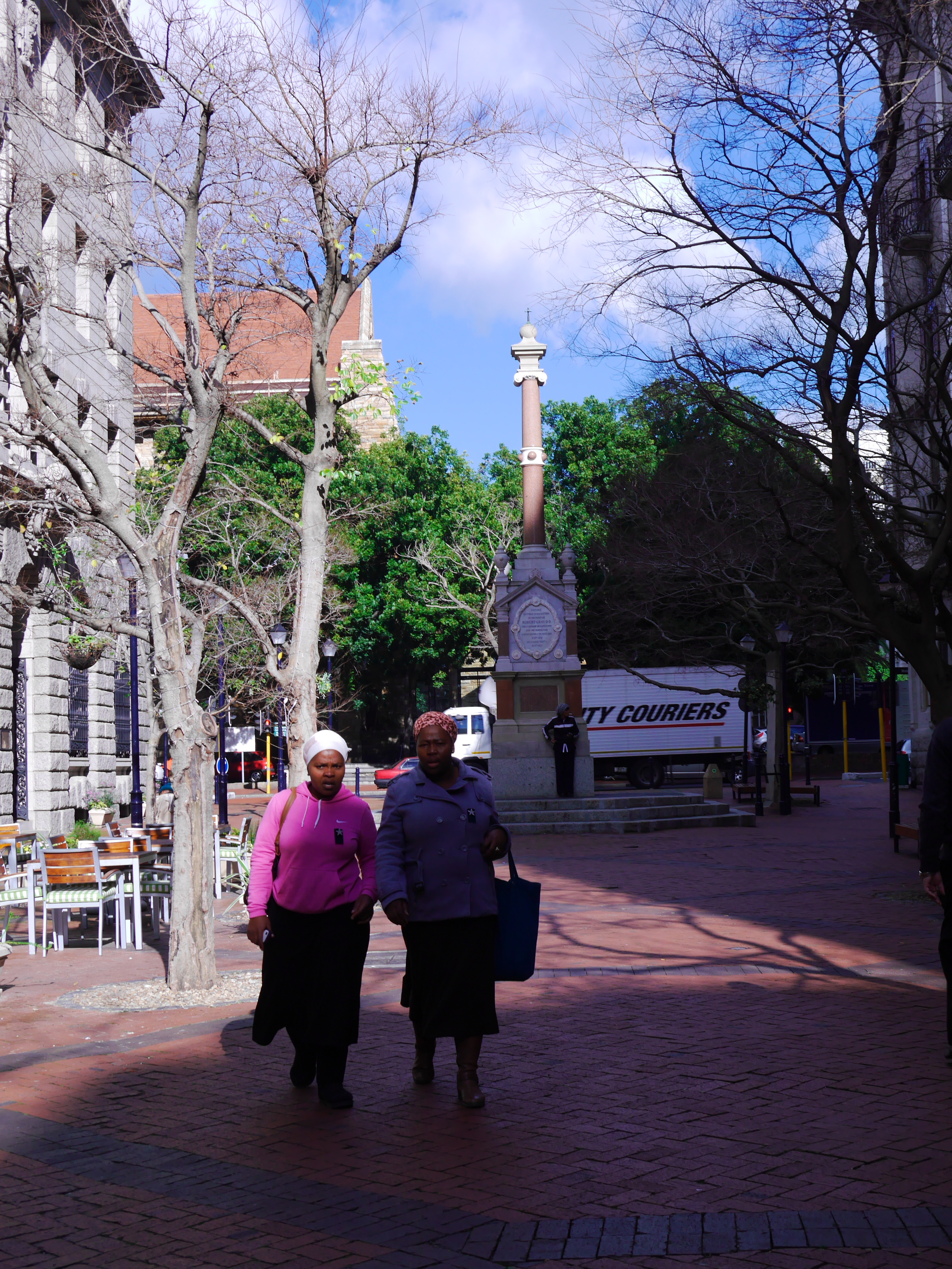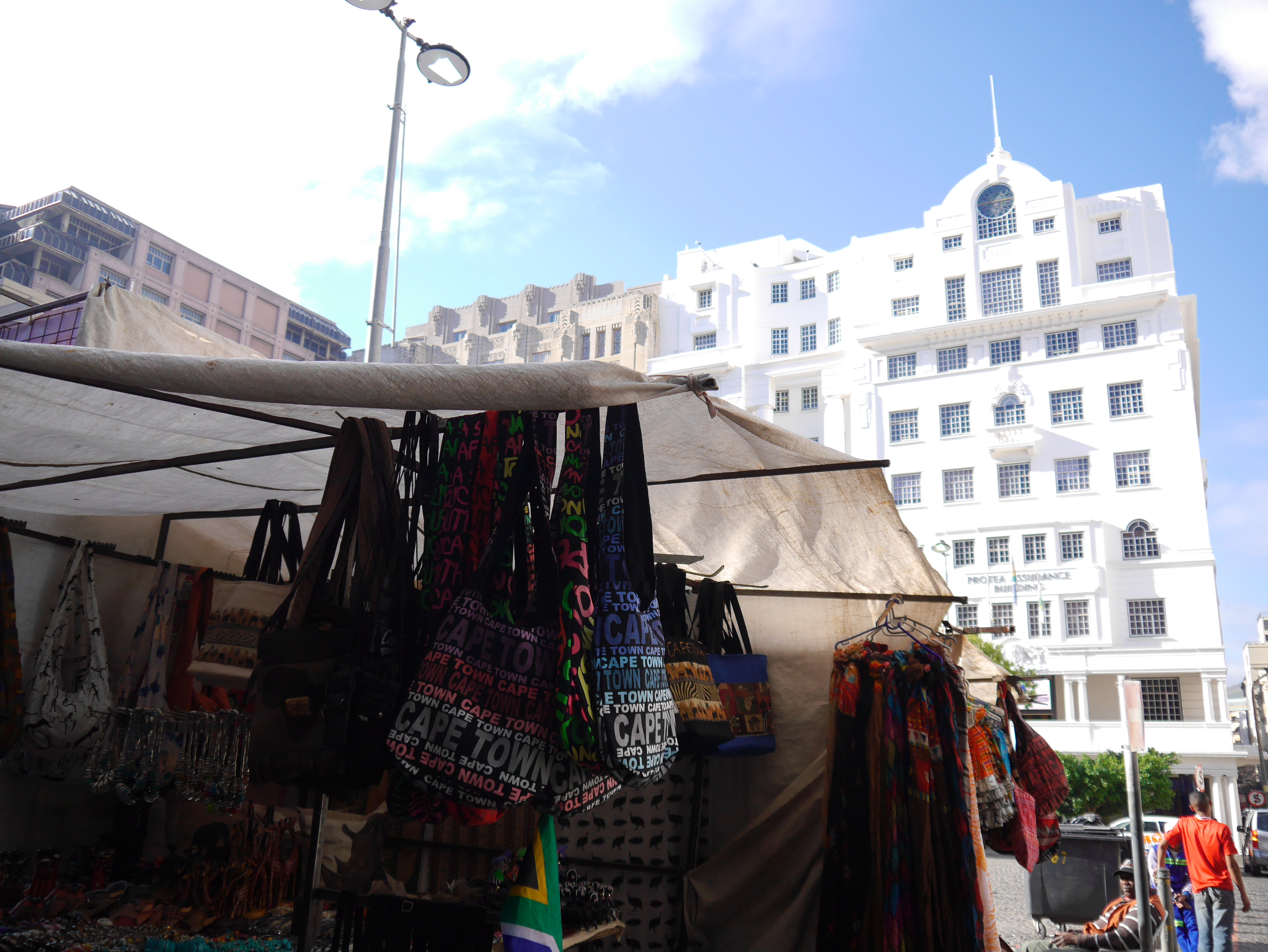 Le lendemain, c’est sur la belle Greenmarket Square que l’on prend le petit-déjeuner. Malgré le froid de la nuit qui s’accroche sur la place, la plupart de gens sont attablés sur les terrasses. Greenmarket Square, c’est sans doute le plus joli espace public du Cap, et probablement l’une des plus ancienne (elle date du XVIIe siècle). Ancien marché aux esclaves, puis marché aux légumes, ce sont maintenant les vendeurs de babioles,qui ont investi ses pavés. Elle n’est pas bien grande, mais entourée par de magnifiques bâtiments, la plupart Art Déco et ses arbres lui donne un petit côté très élégant. On flâne parmi les étals: tissus, sculptures, bijoux en perles… certes un peu cher mais d’une qualité supérieure.