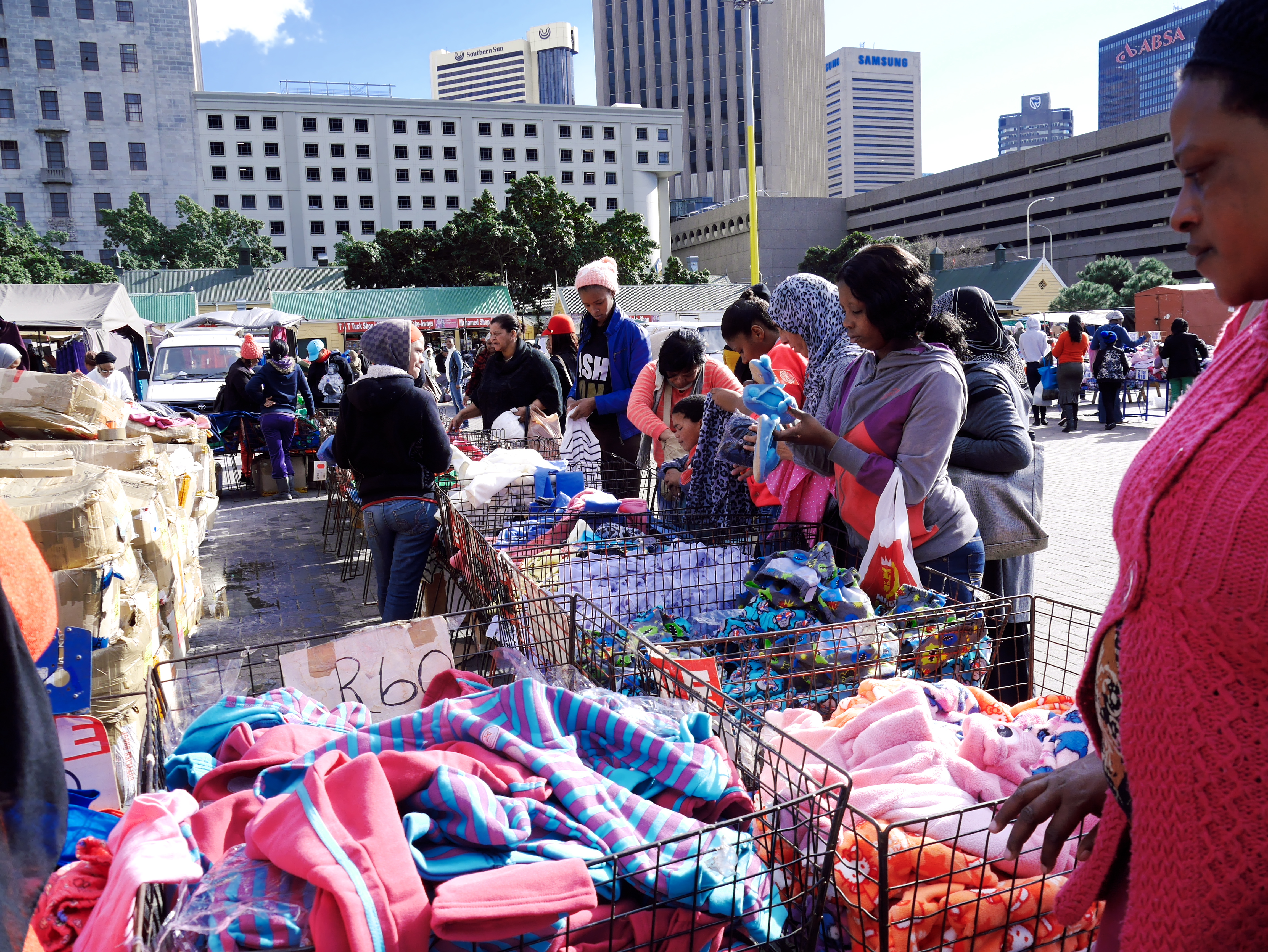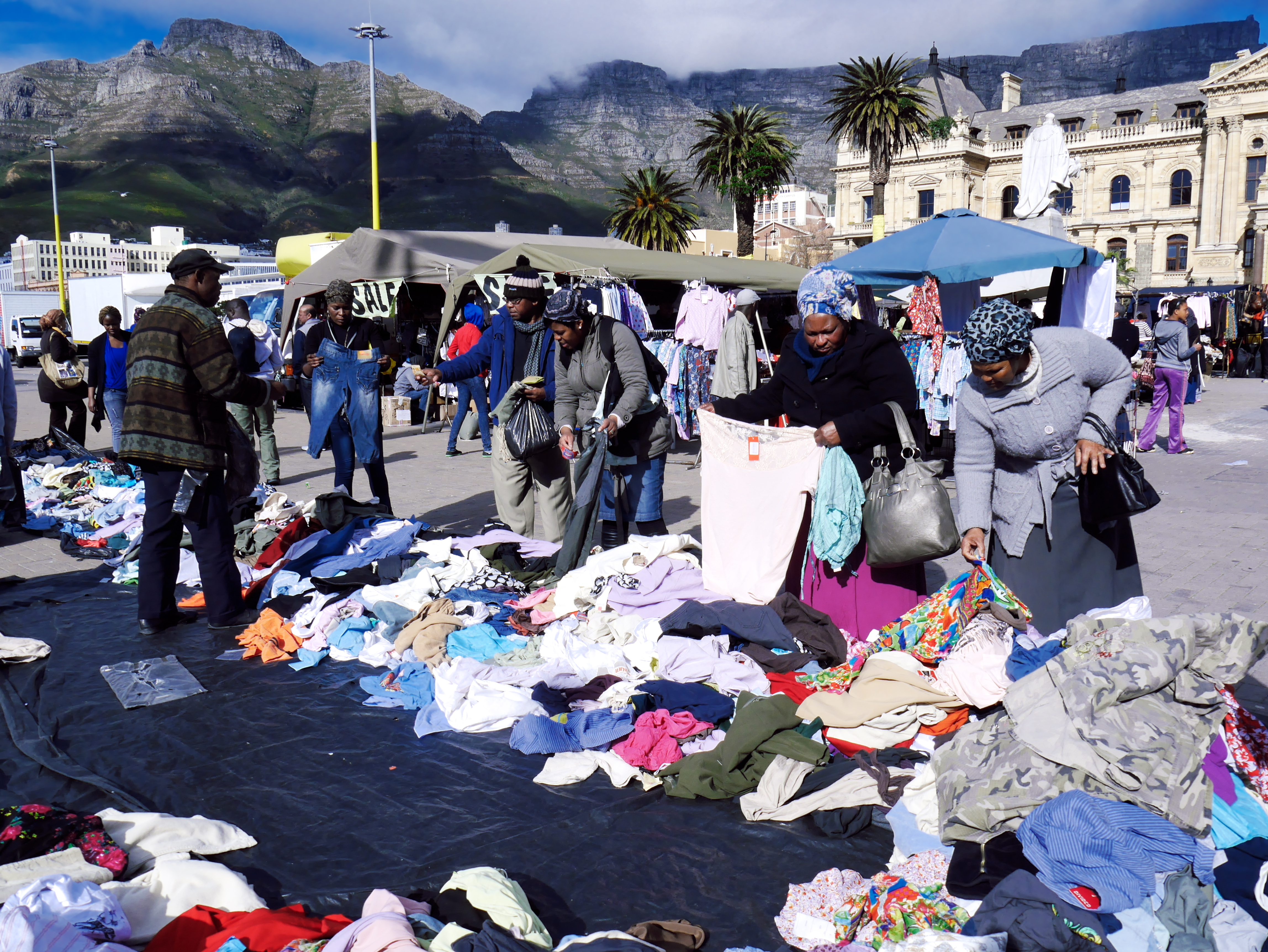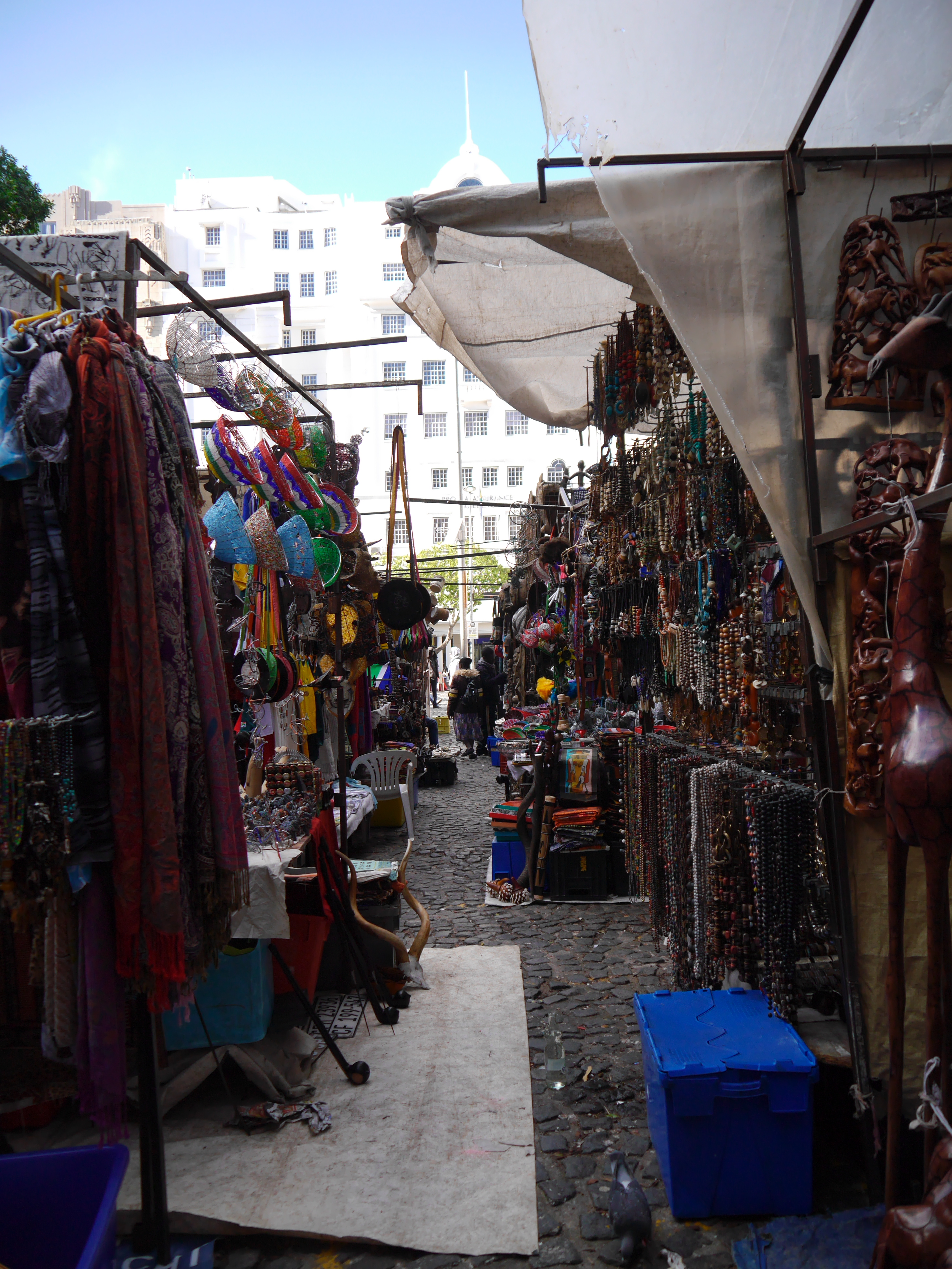 D’un marché à l’autre, nous atterrissons à celui de Grand Parade, les plus populaires des marchés du centre du Cap. Et Grand Parade porte bien son nom : c’est une grande esplanade, bordée par le monumental hôtel de ville, et plus loin encore, par la montagne de Devil’s Peak et bien entendu par Table Moutain, la Montagne de la Table, la figure tutélaire de la Ville du Cap, un mur de pierre contre lequel la cité s’est lovée. Ou que l’on soit en ville, elle est là, comme une présence rassurante. Et ce matin, la montagne de la Table trône dans un ciel d’un bleu presqu’irréel. Sur Grand Parade par contre, on s’affère! Les badauds, bien emmitouflés dans leur manteau, fouine dans les différents étals. Nous sommes en semaine et il y a un peu moins de marchands que dans mes souvenirs… mais si jamais il vous manquait quelque chose pendant votre voyage (t-shirts, chaussettes, adaptateur, chargeur, souvenirs), il y a des fortes chances que vous le trouverez là.