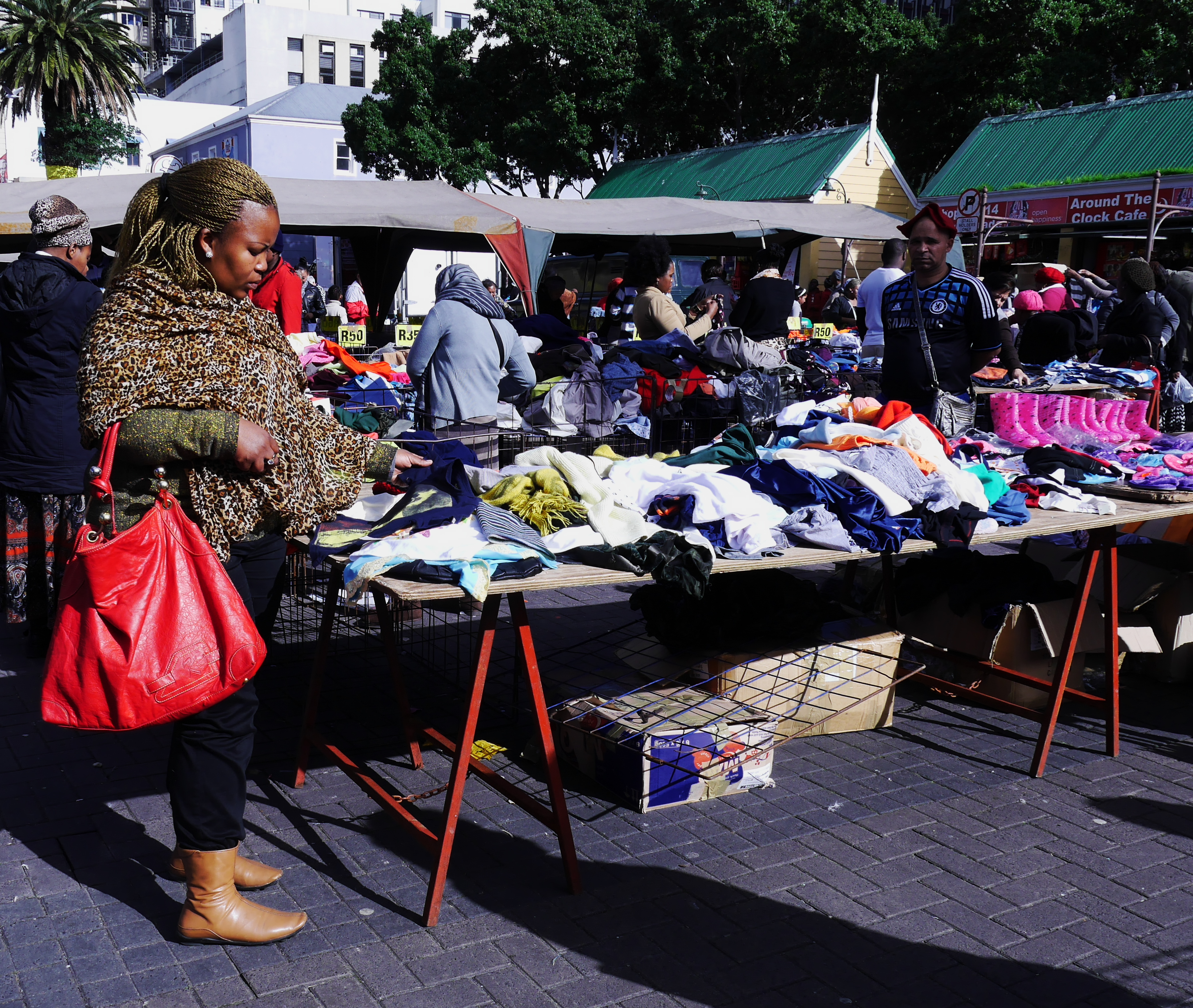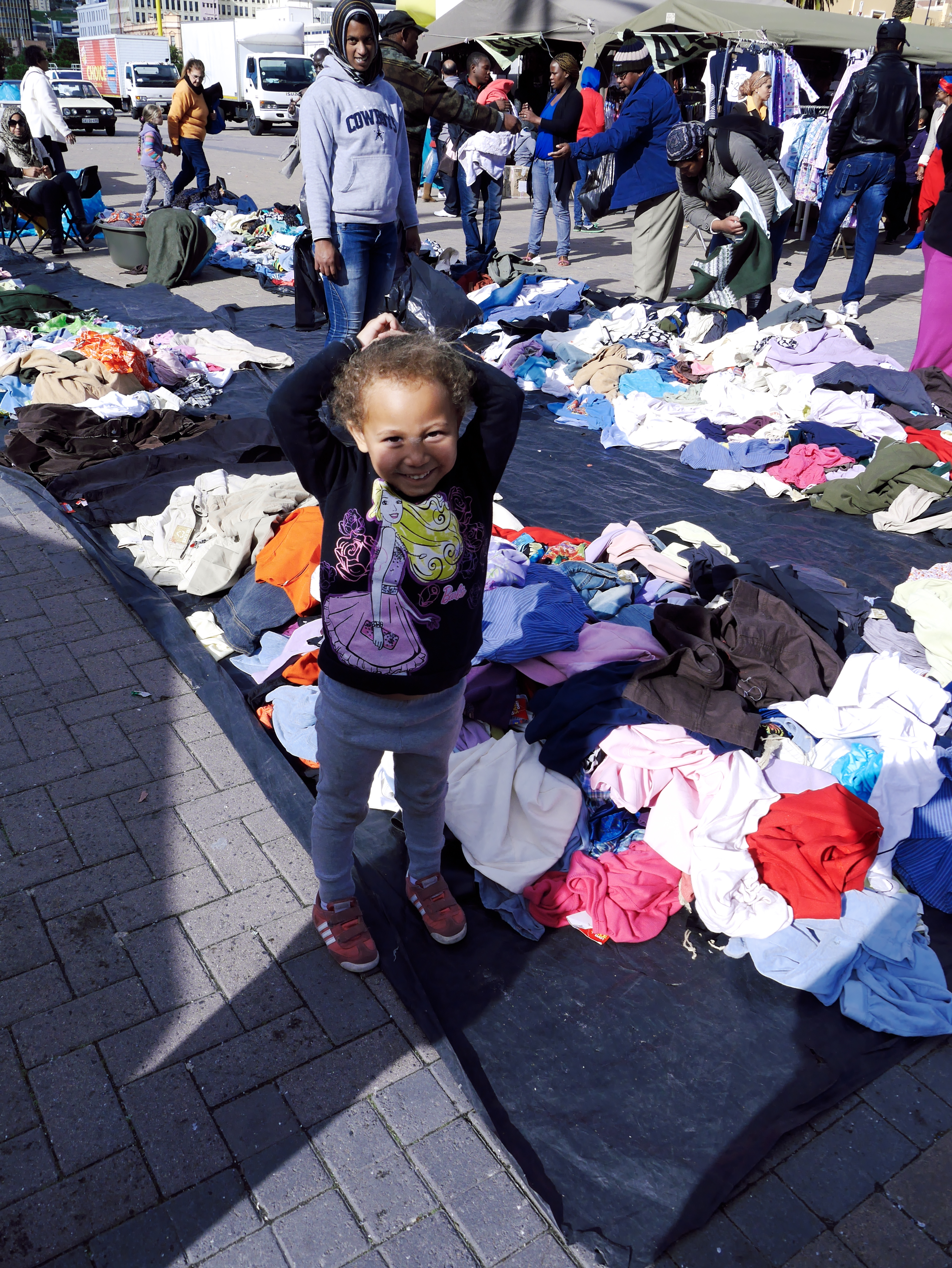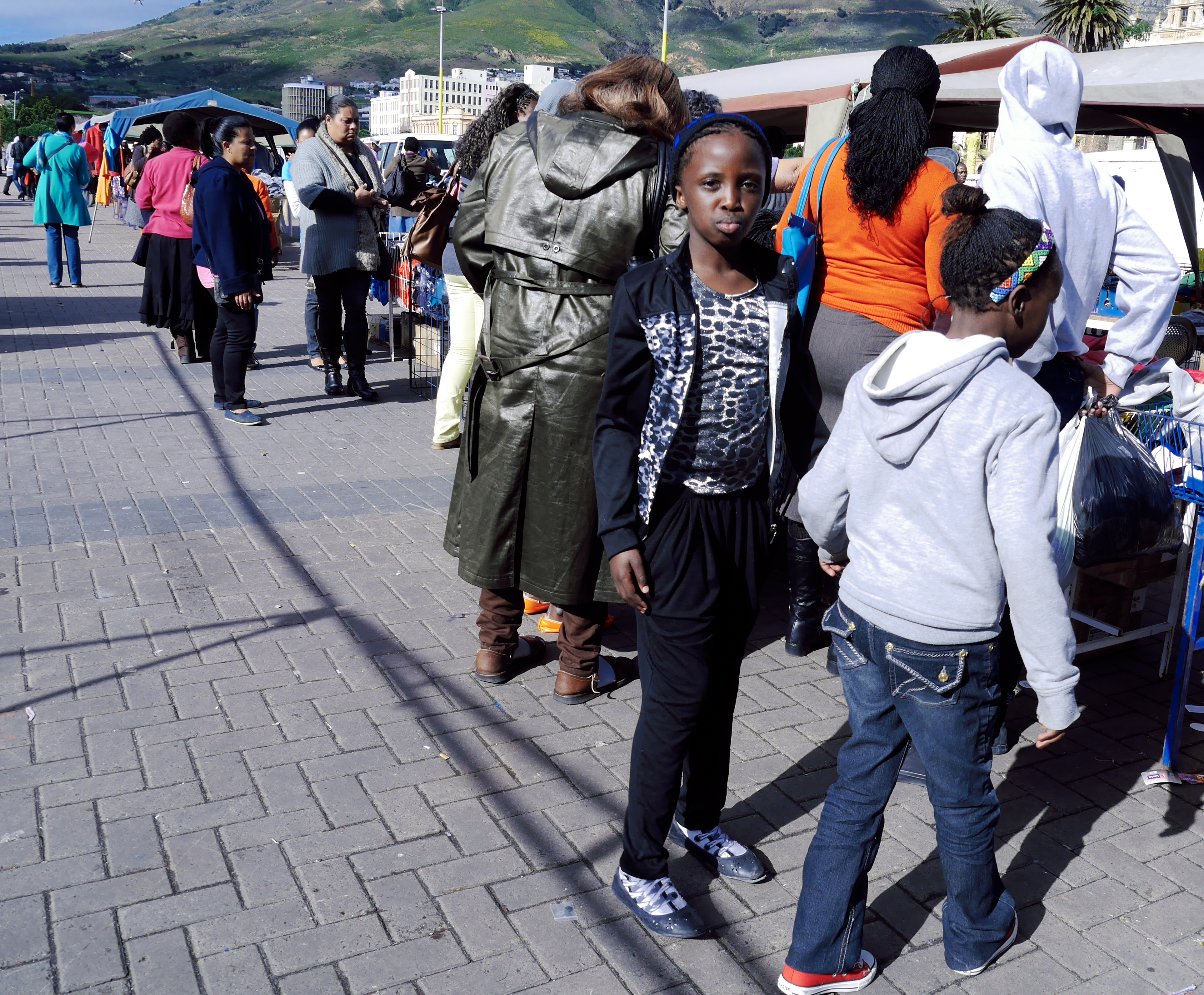 D’un marché à l’autre, nous atterrissons à celui de Grand Parade, les plus populaires des marchés du centre du Cap. Et Grand Parade porte bien son nom : c’est une grande esplanade, bordée par le monumental hôtel de ville, et plus loin encore, par la montagne de Devil’s Peak et bien entendu par Table Moutain, la Montagne de la Table, la figure tutélaire de la Ville du Cap, un mur de pierre contre lequel la cité s’est lovée. Ou que l’on soit en ville, elle est là, comme une présence rassurante. Et ce matin, la montagne de la Table trône dans un ciel d’un bleu presqu’irréel. Sur Grand Parade par contre, on s’affère! Les badauds, bien emmitouflés dans leur manteau, fouine dans les différents étals. Nous sommes en semaine et il y a un peu moins de marchands que dans mes souvenirs… mais si jamais il vous manquait quelque chose pendant votre voyage (t-shirts, chaussettes, adaptateur, chargeur, souvenirs), il y a des fortes chances que vous le trouverez là.