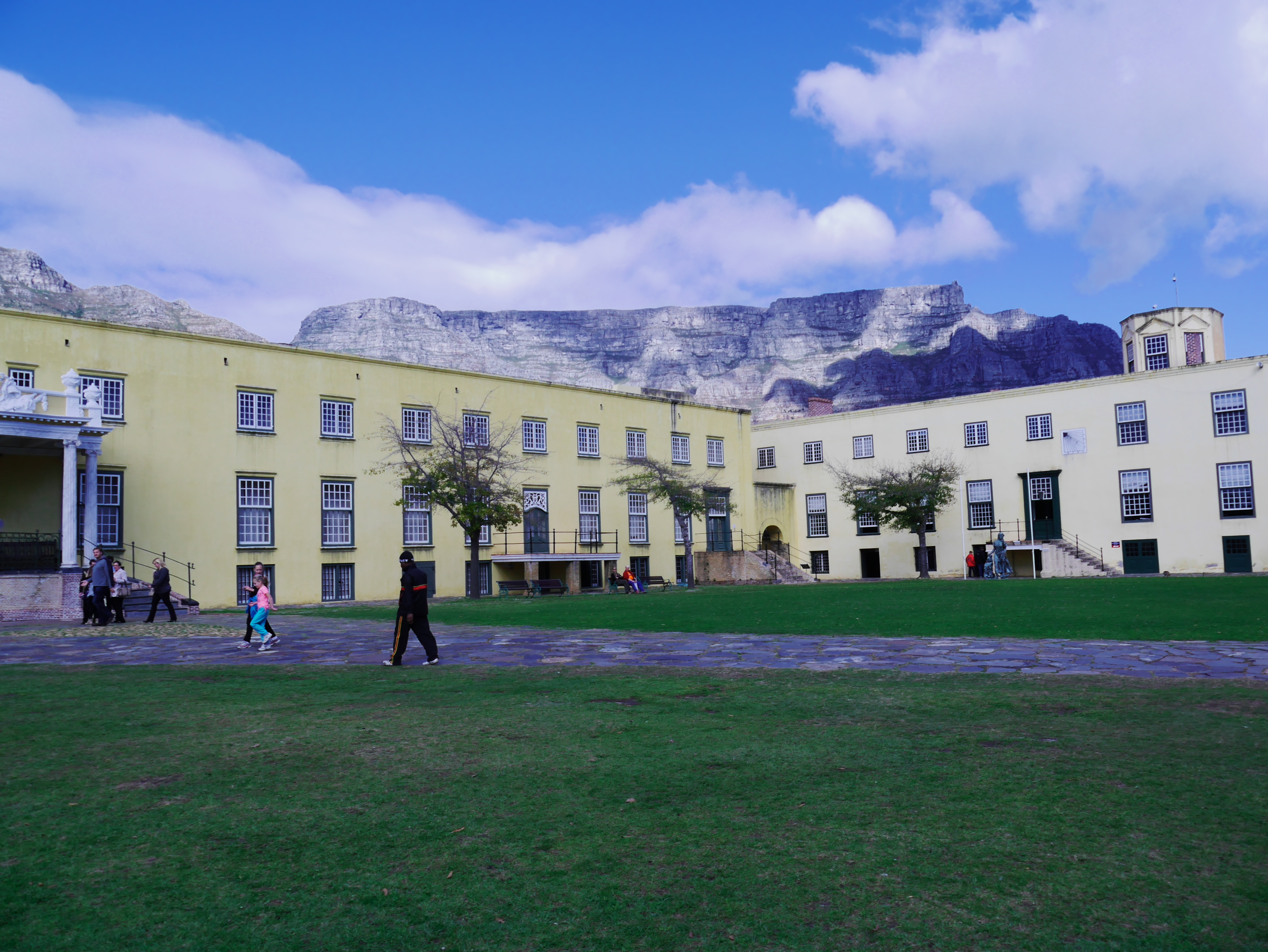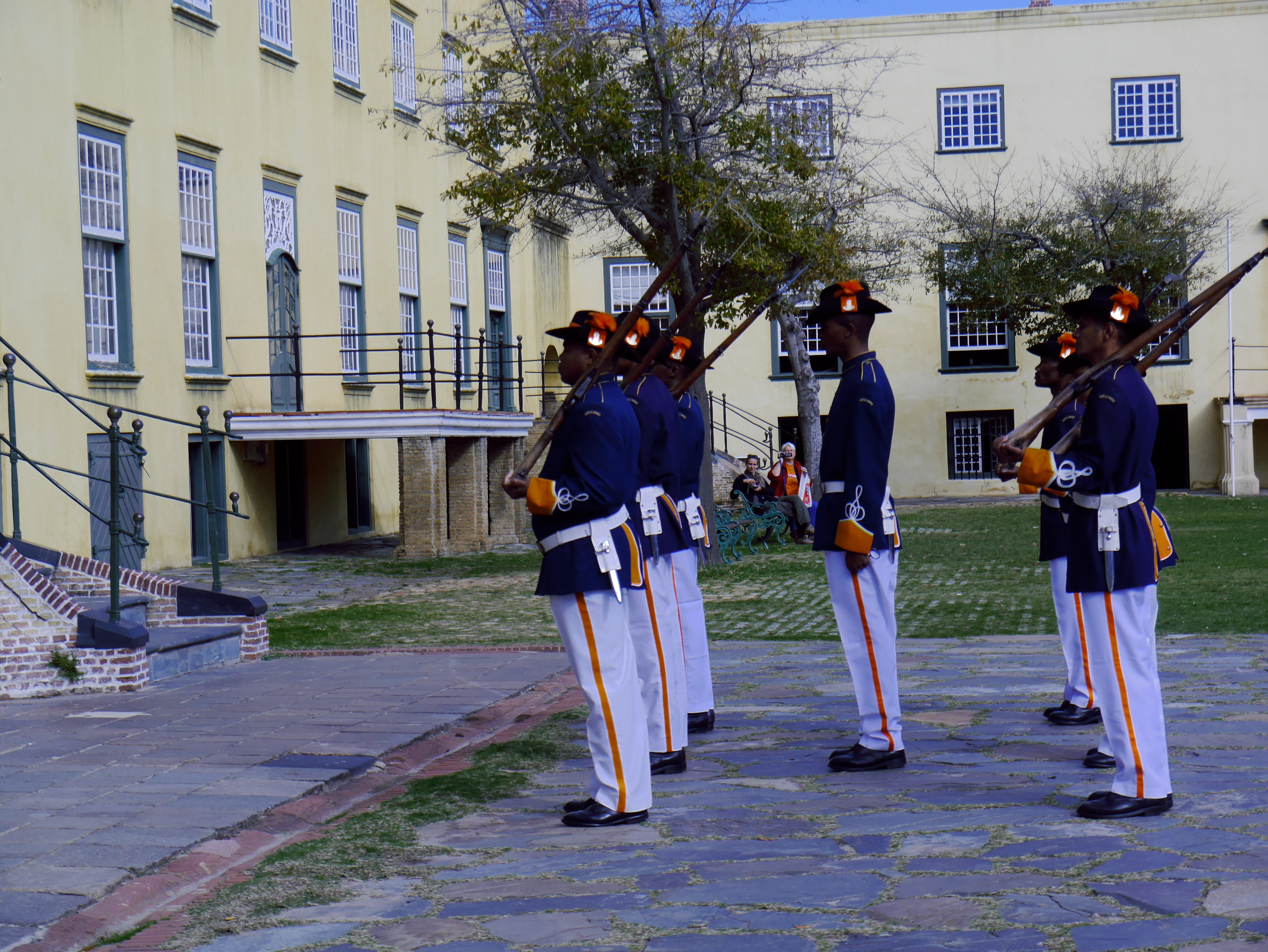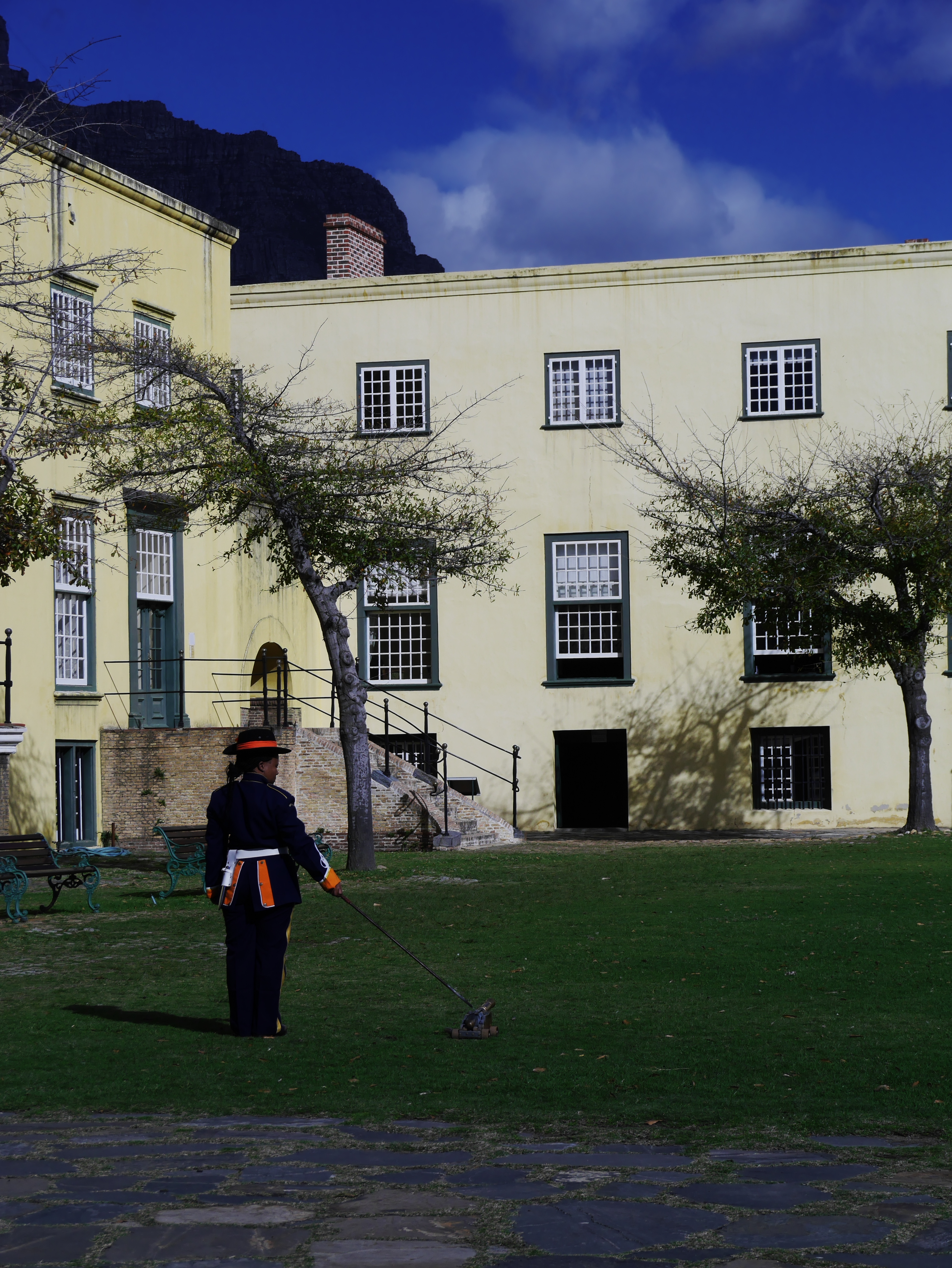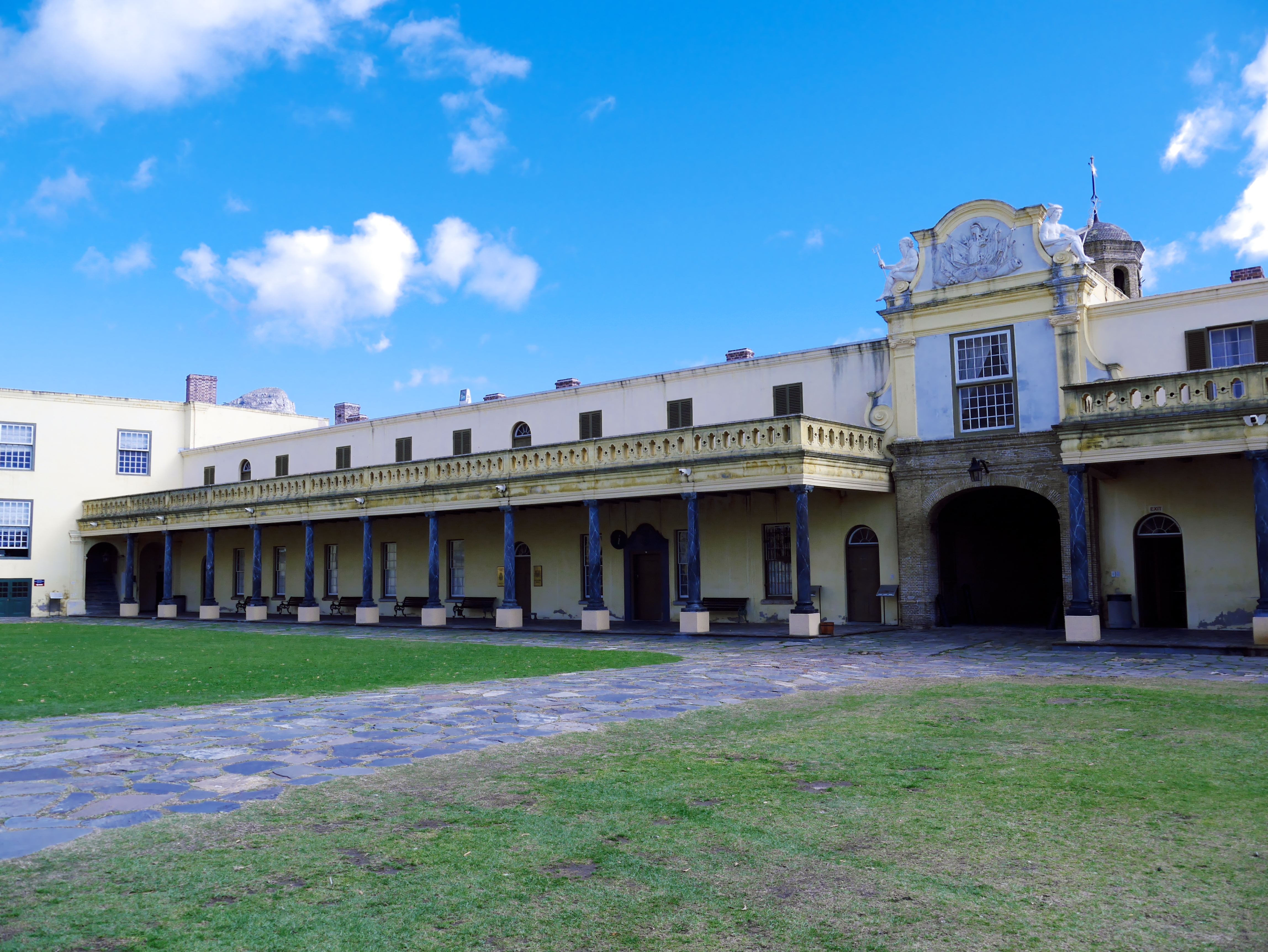 Pour commencer la visite, nous avons droit à une petite relève de la garde en costumes historiques puis nous sommes pris en charge par un guide qui nous faire faire le tour du propriétaire. Perché sur le chemin de ronde, on essaie d’imaginer. A sa création, le Fort était au bords de l’Océan. C’était un petit monde qui pouvait vivre en vase clôt: tout s’y trouvait: depuis la cave à vin, en passant par l’église, jusqu’à une boulangerie! Au fur et à mesure, ce qui était un fort militaire destiné à protéger les intérêts de la Compagnie, est devenu un lieu d’administration. Depuis le Kat Balcony, le Gouverneur venait y faire des annonces à la petite colonie. Autre signe de la « normalisation » du Fort: on y avait construit un joli bassin d’agrément, la piscine de Lady Anne Barnard, qui était l’ « hôtesse » officielle du Gouverneur.
