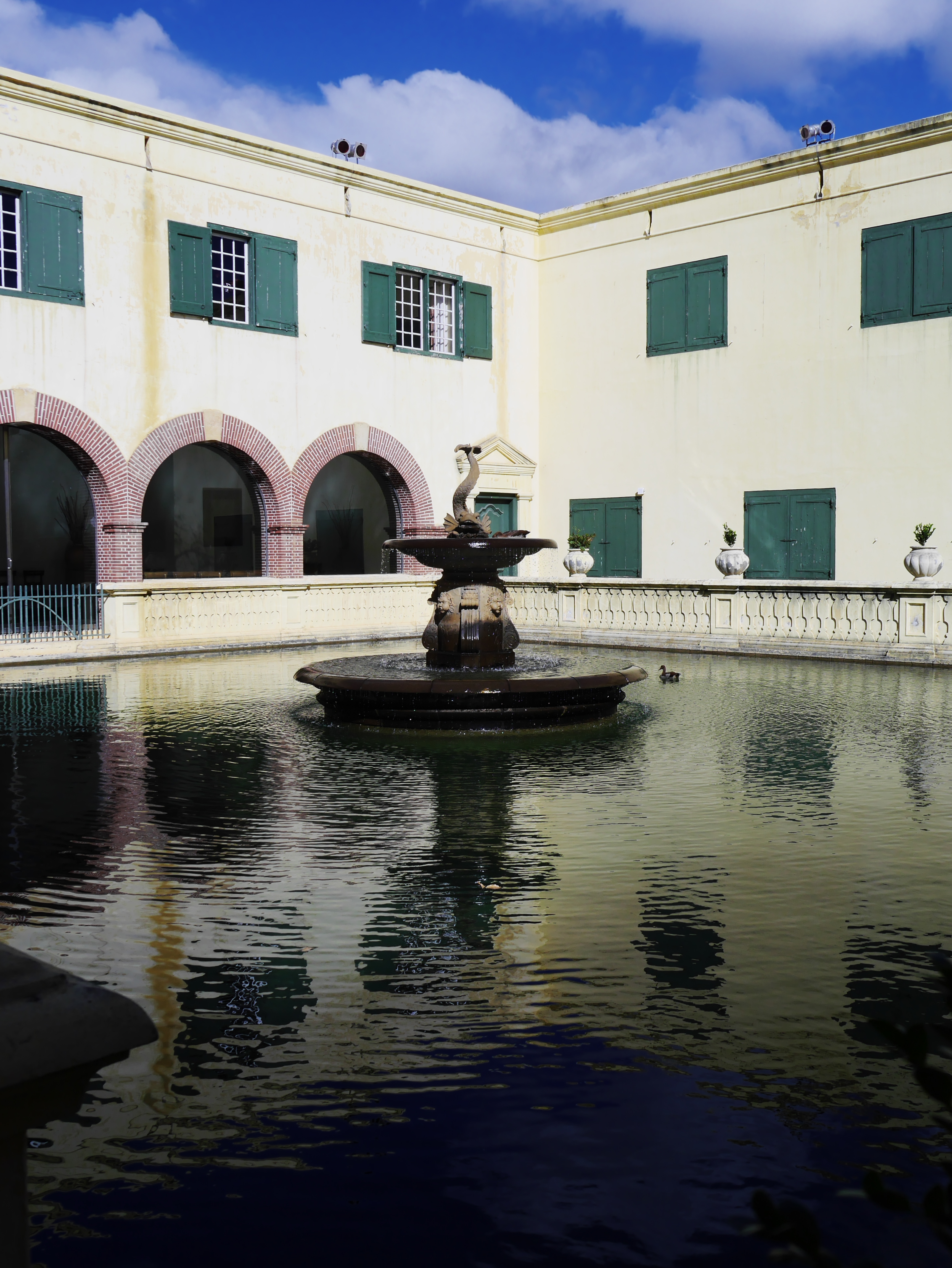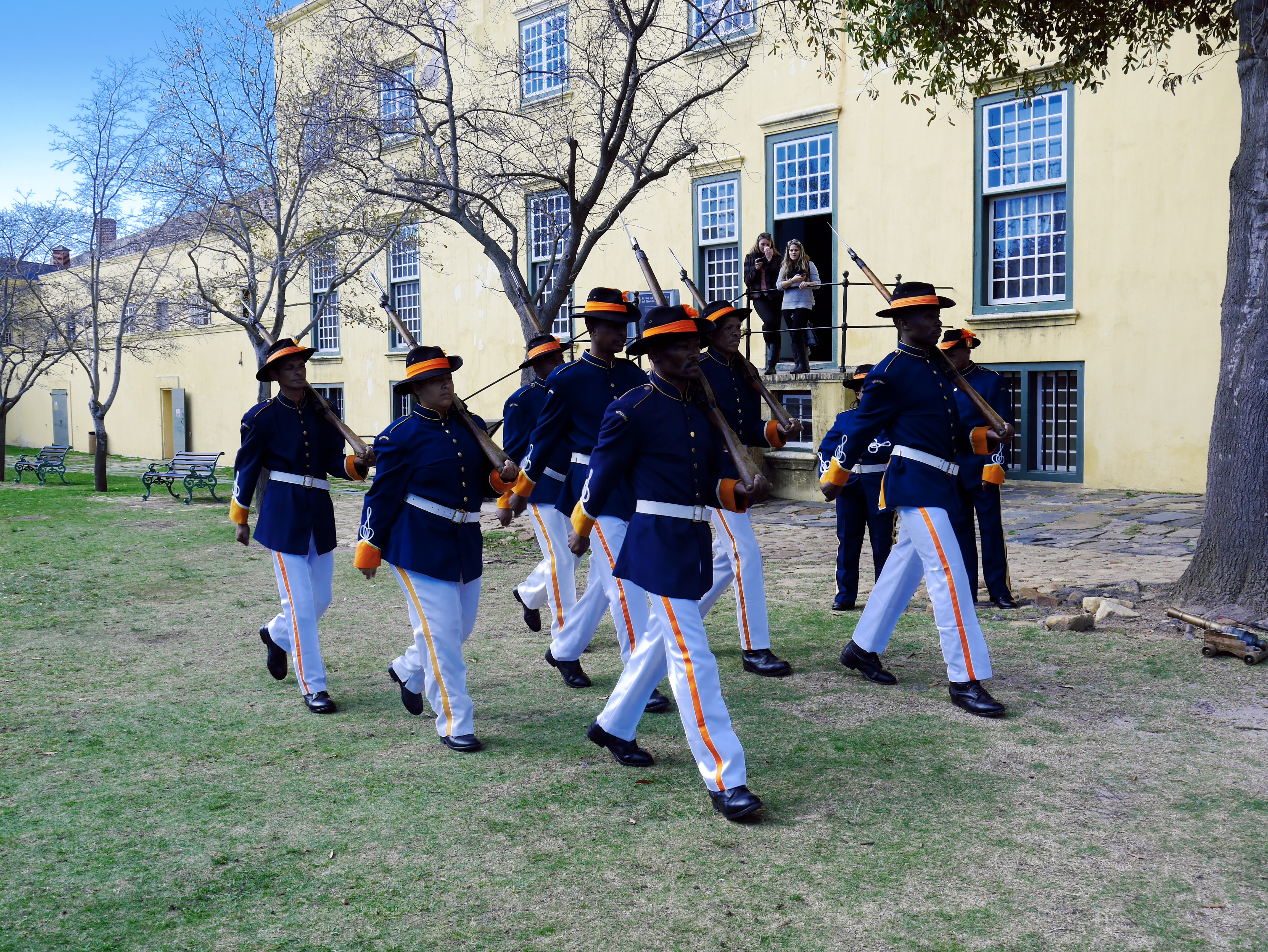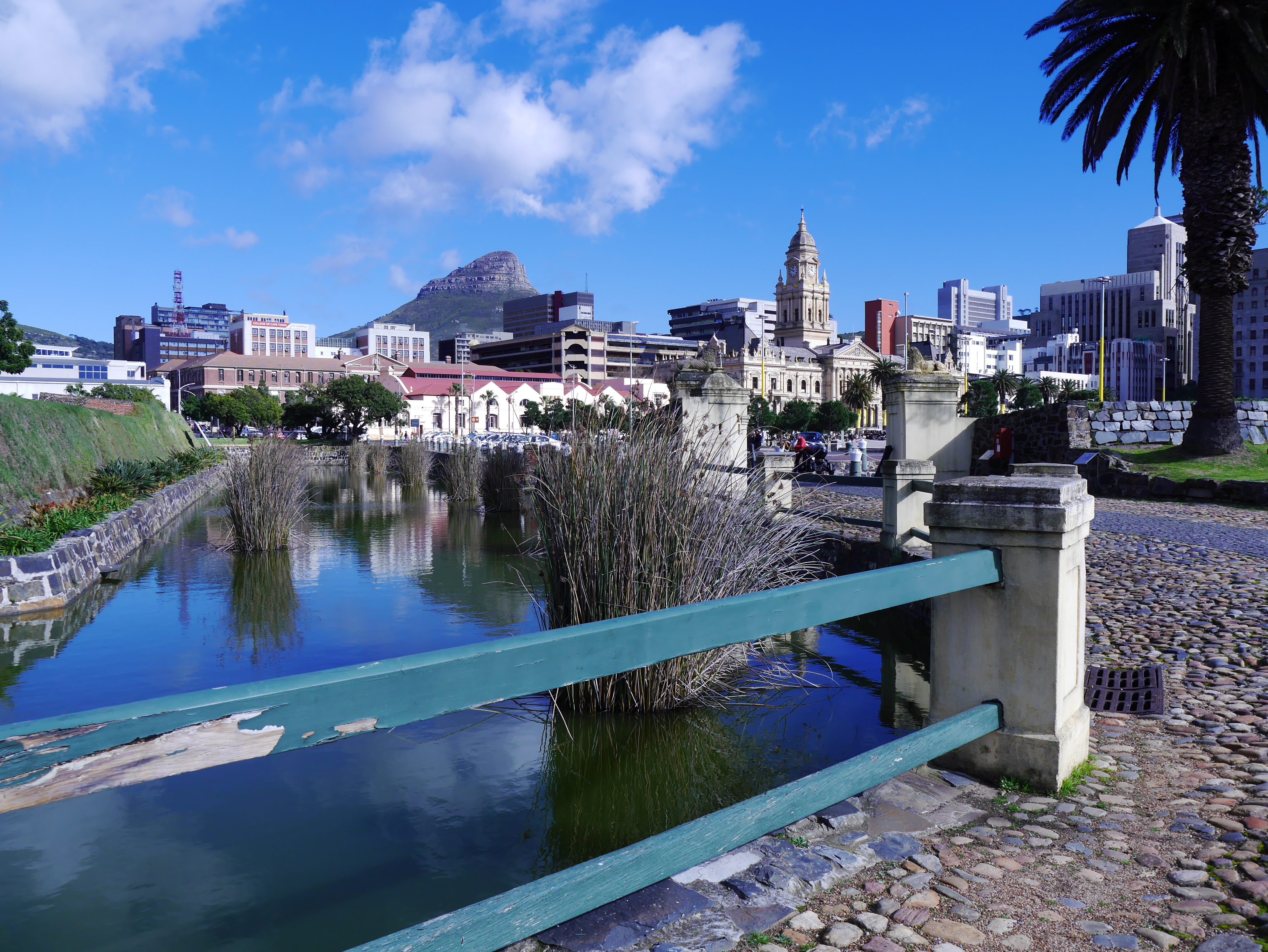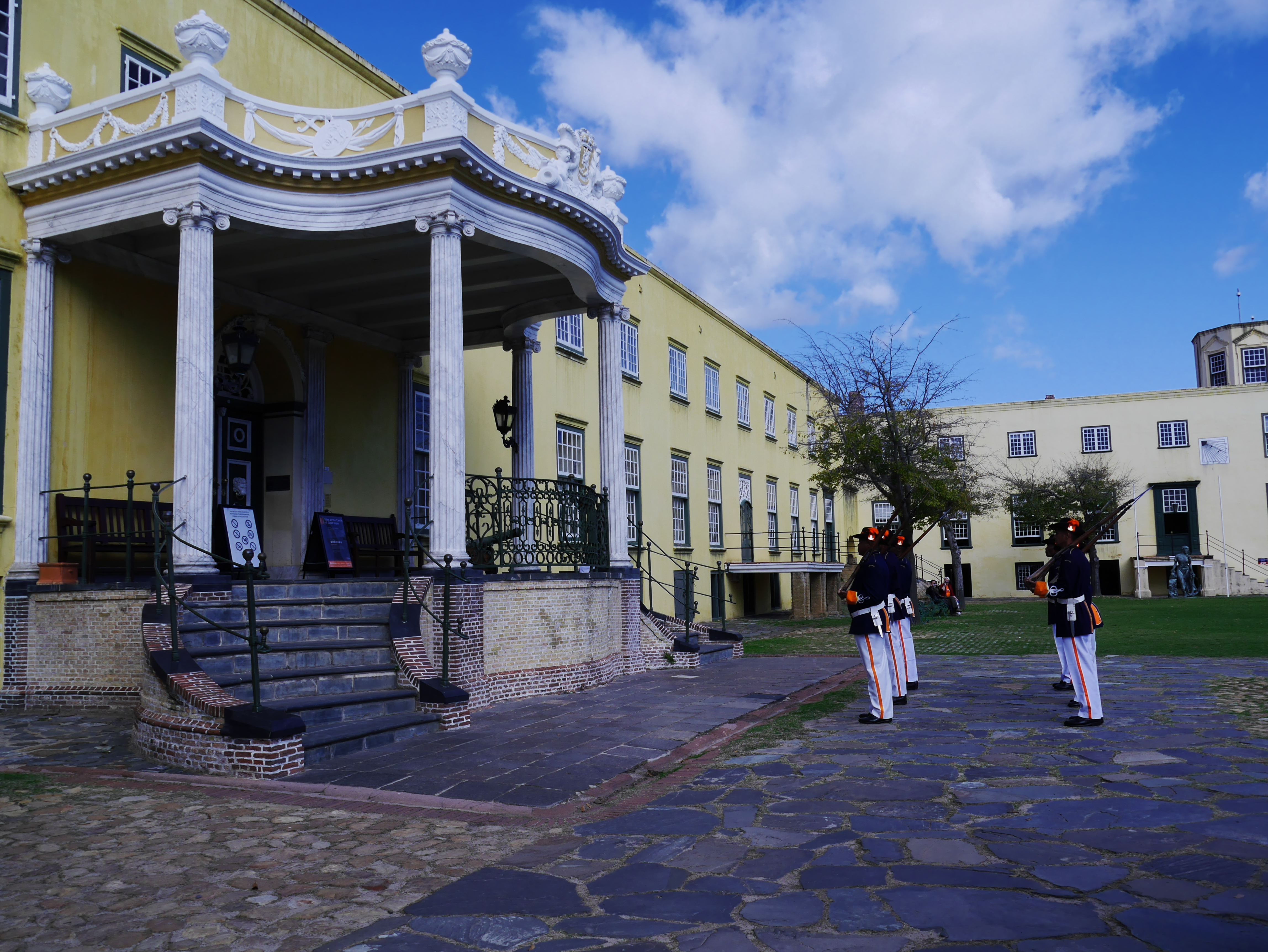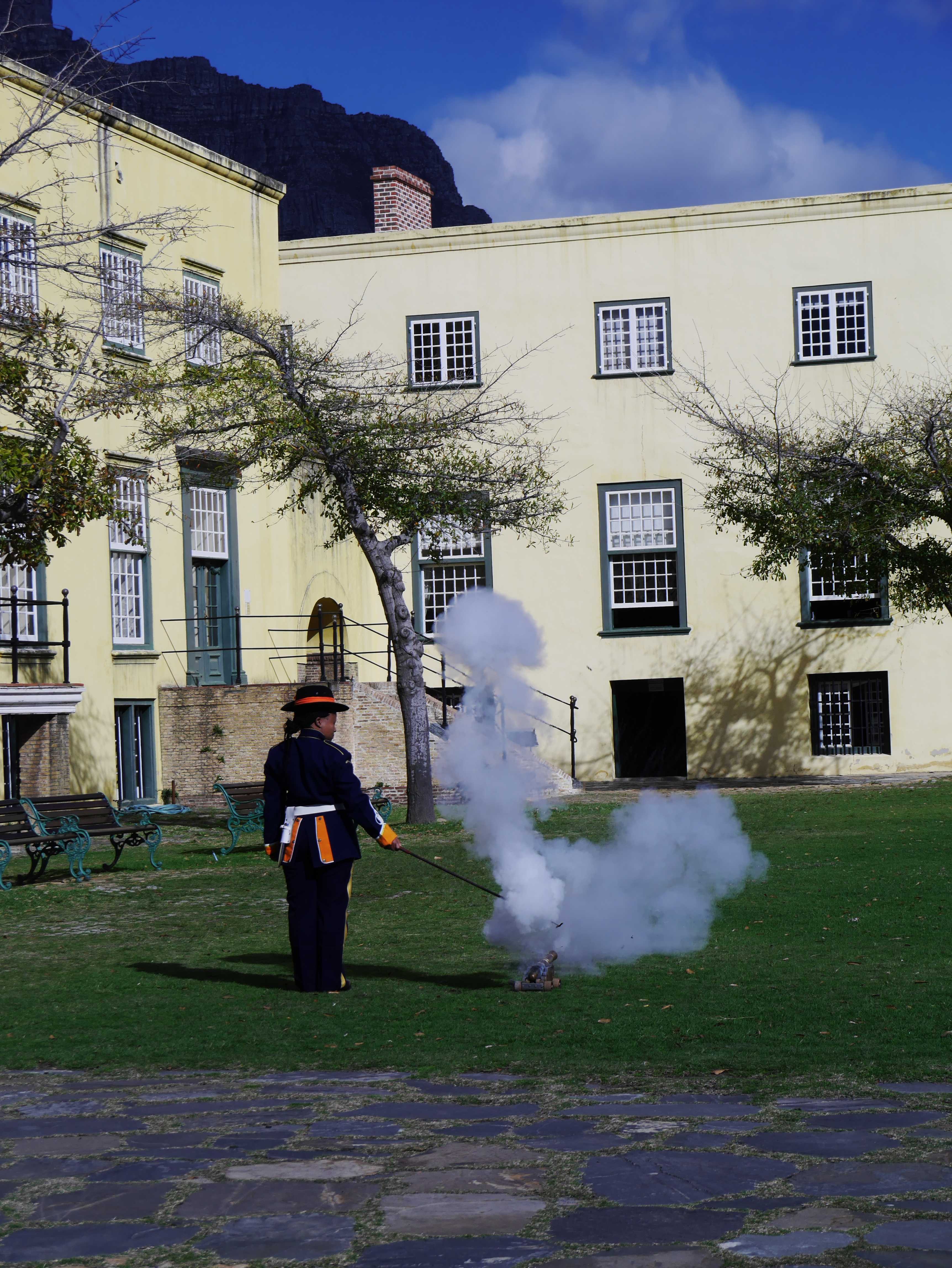 Pour commencer la visite, nous avons droit à une petite relève de la garde en costumes historiques puis nous sommes pris en charge par un guide qui nous faire faire le tour du propriétaire. Perché sur le chemin de ronde, on essaie d’imaginer. A sa création, le Fort était au bords de l’Océan. C’était un petit monde qui pouvait vivre en vase clôt: tout s’y trouvait: depuis la cave à vin, en passant par l’église, jusqu’à une boulangerie! Au fur et à mesure, ce qui était un fort militaire destiné à protéger les intérêts de la Compagnie, est devenu un lieu d’administration. Depuis le Kat Balcony, le Gouverneur venait y faire des annonces à la petite colonie. Autre signe de la « normalisation » du Fort: on y avait construit un joli bassin d’agrément, la piscine de Lady Anne Barnard, qui était l’ « hôtesse » officielle du Gouverneur.