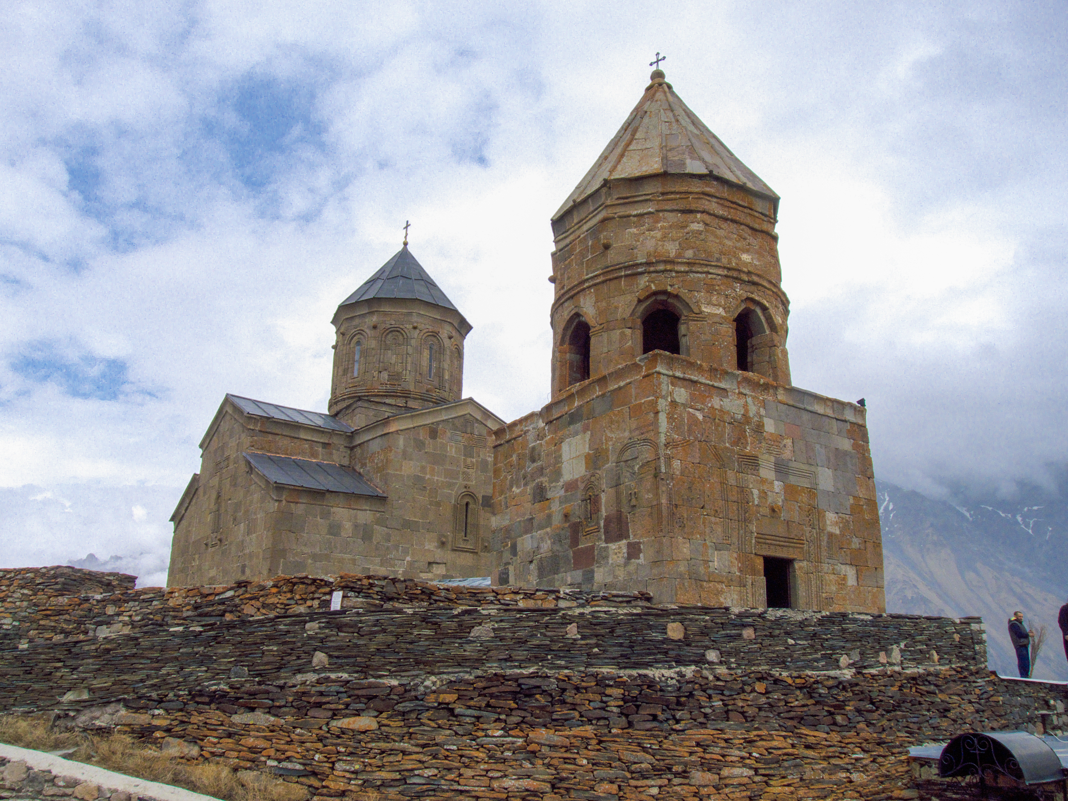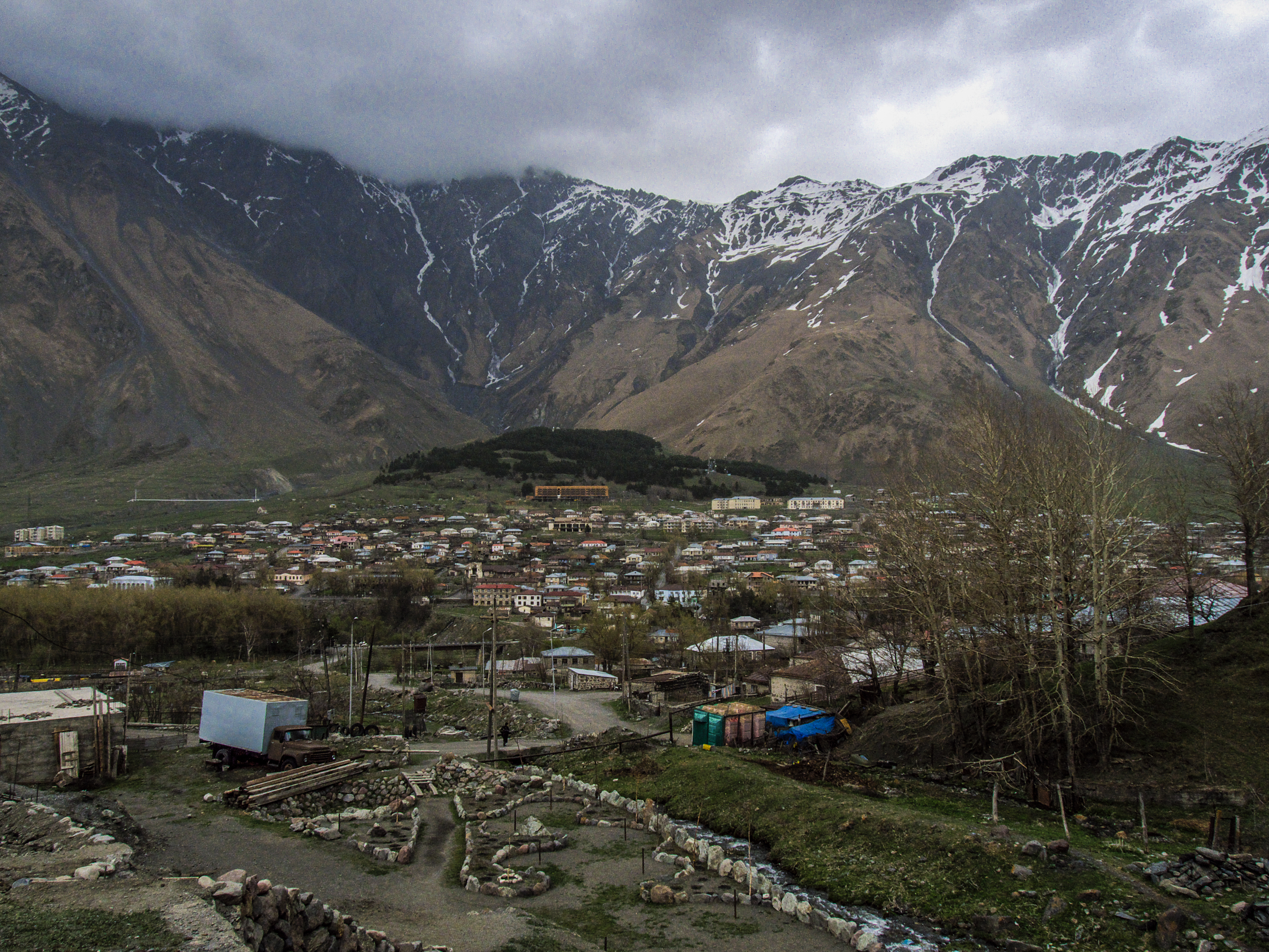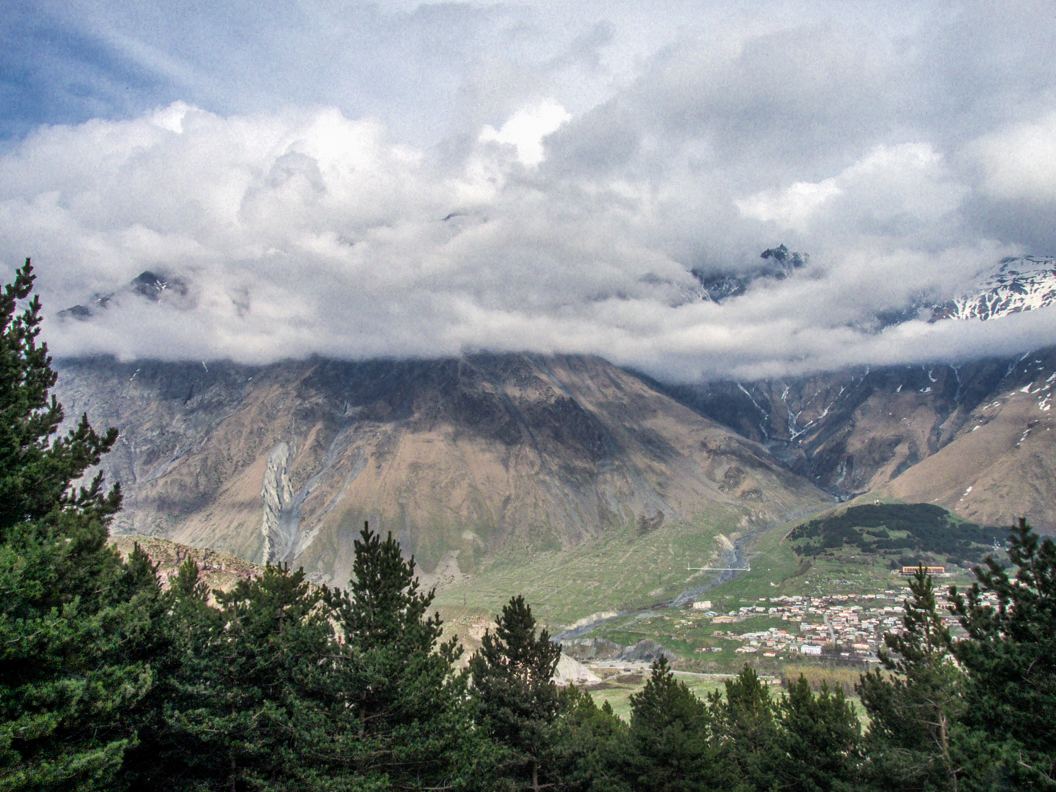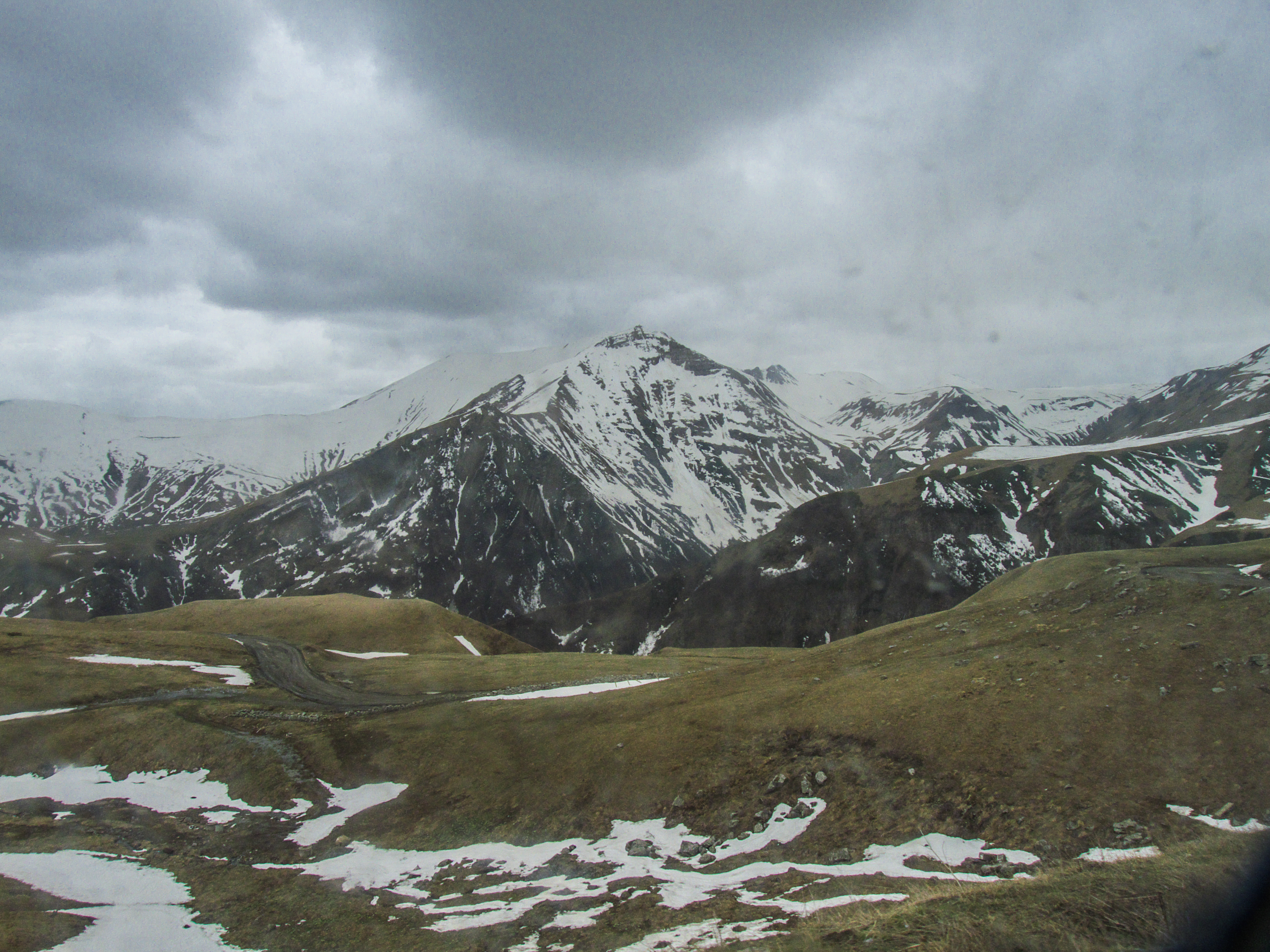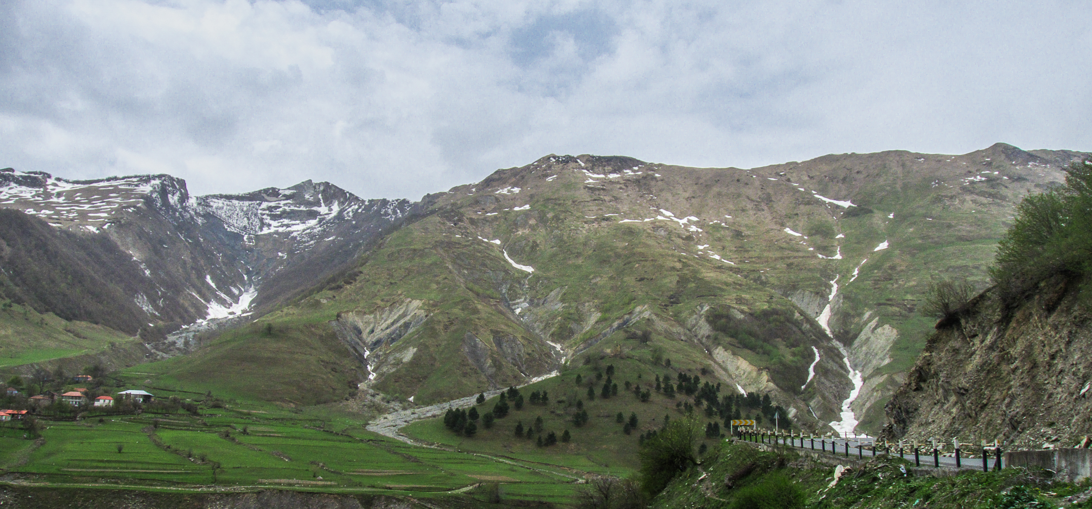 Le Caucase… un toponyme synonyme de danger pour beaucoup ! Pour moi, c’est une invitation une aventure des plus pacifiques, même si la route qui mène à la frontière russe s’appelle « la route militaire géorgienne »! Une heure après avoir quitté Tbilissi, le paysage et le climat change avec l’altitude. Alors que c’est presque l’été à Tbilissi, les arbres fruitiers sont à peine en fleurs dans les villages que nous traversons. Un paysage vert de moyenne montagne où de grosses maisons sont entourées de jardins, de potagers et de l’indispensable vigne et où broutent les vaches ou les moutons. Au fur et à mesure, les sommets enneigés du Grand Caucase apparaissent, l’ascension s’accélère et très vite, nous voilà à une station de ski.
