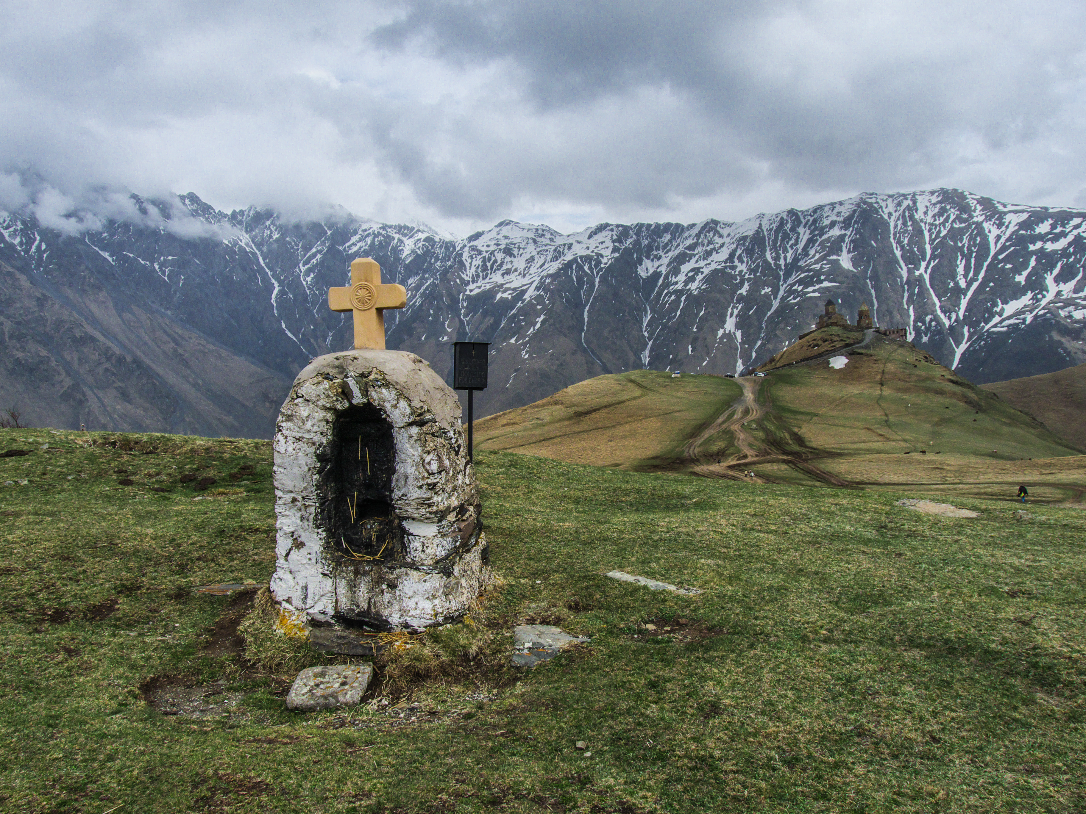 Après avoir passé le pont qui enjambe la rivière puis traversé le petit bourg de Gergeti, la route monte et avec les premiers efforts, la tête commence à tourner et mon souffle se fait court. Heureusement, je ne fais que suivre la route des voitures, d’autres randonneurs, plus courageux, prennent des raccourcis à flanc de colline. J’en tente un et mon cœur semble vouloir sortir de ma poitrine à l’arrivée. Il va VRAIMENT falloir que je fasse plus de cardio à la gym ! Aux prés à vaches succèdent les bois de sapins et le village rapetisse au fur et à mesure jusqu’à ce que les maisons deviennent minuscules comme des boîtes d’allumettes. Je ne suis pas la seule à monter à pied ! Je croise un Japonais solitaire et un couple finlandais qui a décidé de prendre tous les raccourcis possibles. « See you at the top ! » me disent ils en rigolant de me voir prendre la route la plus longue. Je n’en ai cure… Je profite du calme, d’être seule, face à moi-même avec la nature… Je ne suis pas là pour la performance sportive. Après presque deux heures d’ascension, je quitte le bois de sapins. J’ai l’impression que le « sommet » n’est plus très loin et je décide de prendre un de ces raccourcis… mais il se montre plus difficile que prévu et c’est le souffle coupé que je retrouve la route pour subitement déboucher sur une vue de rêve : sur un petit monticule, une chapelle fait face aux montagnes… 100 mètres plus loin, l’église, entourée d’un mur, monte une garde solitaire et à 360 degrés, des pics enneigés où s’effilochent les nuages. C’est comme un grand shoot d’adrénaline !!! J’y suis arrivée. Je me mets presque à courir tant je suis euphorisée. J’attends d’abords la chapelle en pierre. Même s’il n’y avait qu’elle à voir, cela vaudrait le coup. Je ne sais pas qui a eu l’idée de la bâtir là, mais la mise-en-scène est de toute beauté. N’en revenant toujours pas, je prends quelques photos puis me dirige vers l’église.