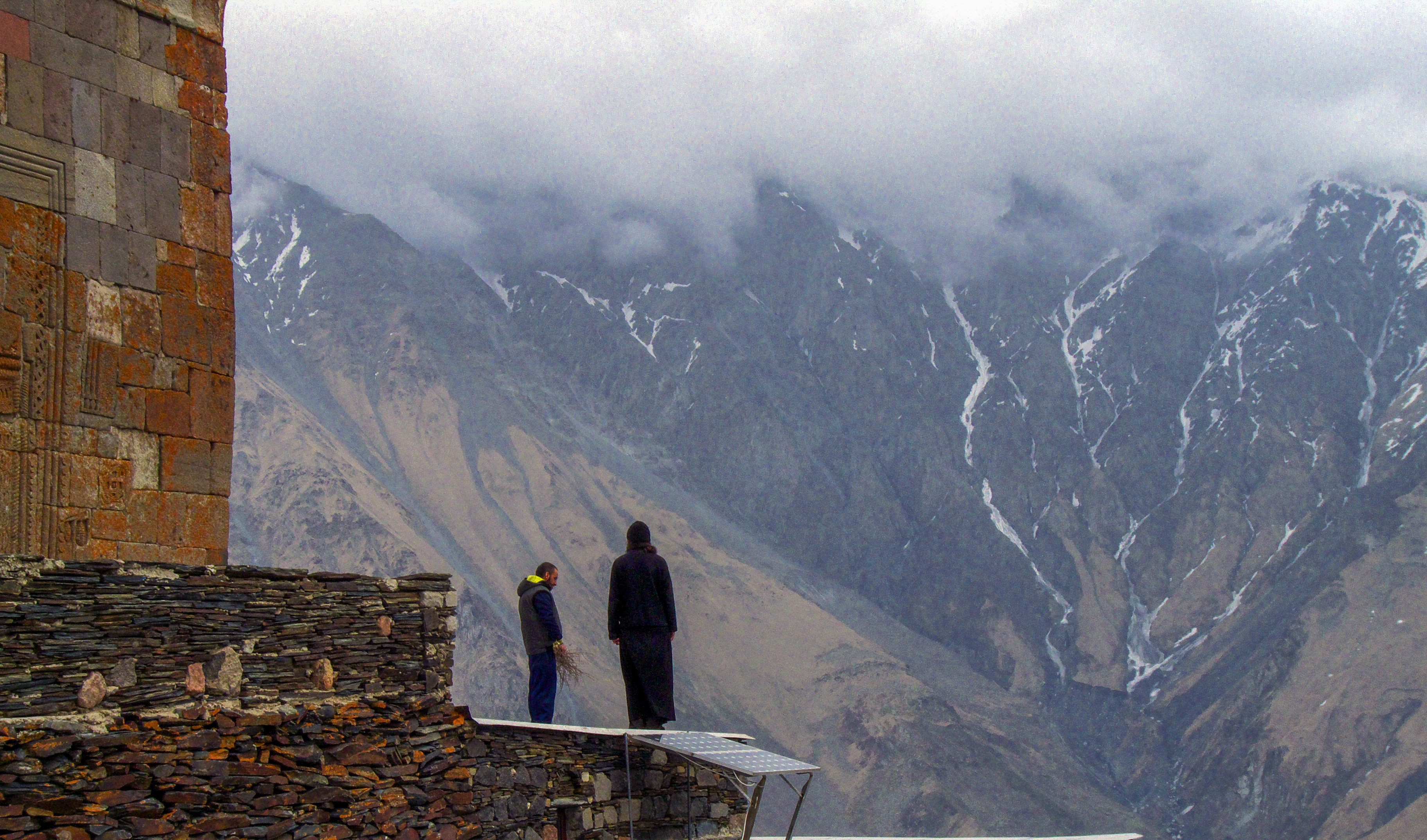 Juste en dehors, une vache se balade paresseusement. De l’autre côté, un pope et un homme qui semble tenir le rôle de sacristain se tiennent sur une plateforme et scrutent un horizon battu par le vent… L’image est forte. Je passe le portique et enfile une jupe par-dessus mon jeans. En effet, une femme en pantalon ne peut pas pénètre dans l’église mais une pile de jupes est prévue à cet effet. Il faut également se couvrir la tête mais pour cela, j’ai mon foulard. J’entre donc dans cette petite église austère avec le sentiment d’être une espèce de clown… Les règles sont strictes dans cet environnement rude et aucune photo n’est admise. En sortant, je me dirige vers le « jardin » et retrouve mes Finlandais. Assis sur le muret, ils cassent la croûte et admirent le paysage. Nous discutons un peu… Ils continueront leur route géorgienne vers Svaneti, dont la beauté est parait il, encore plus grande.