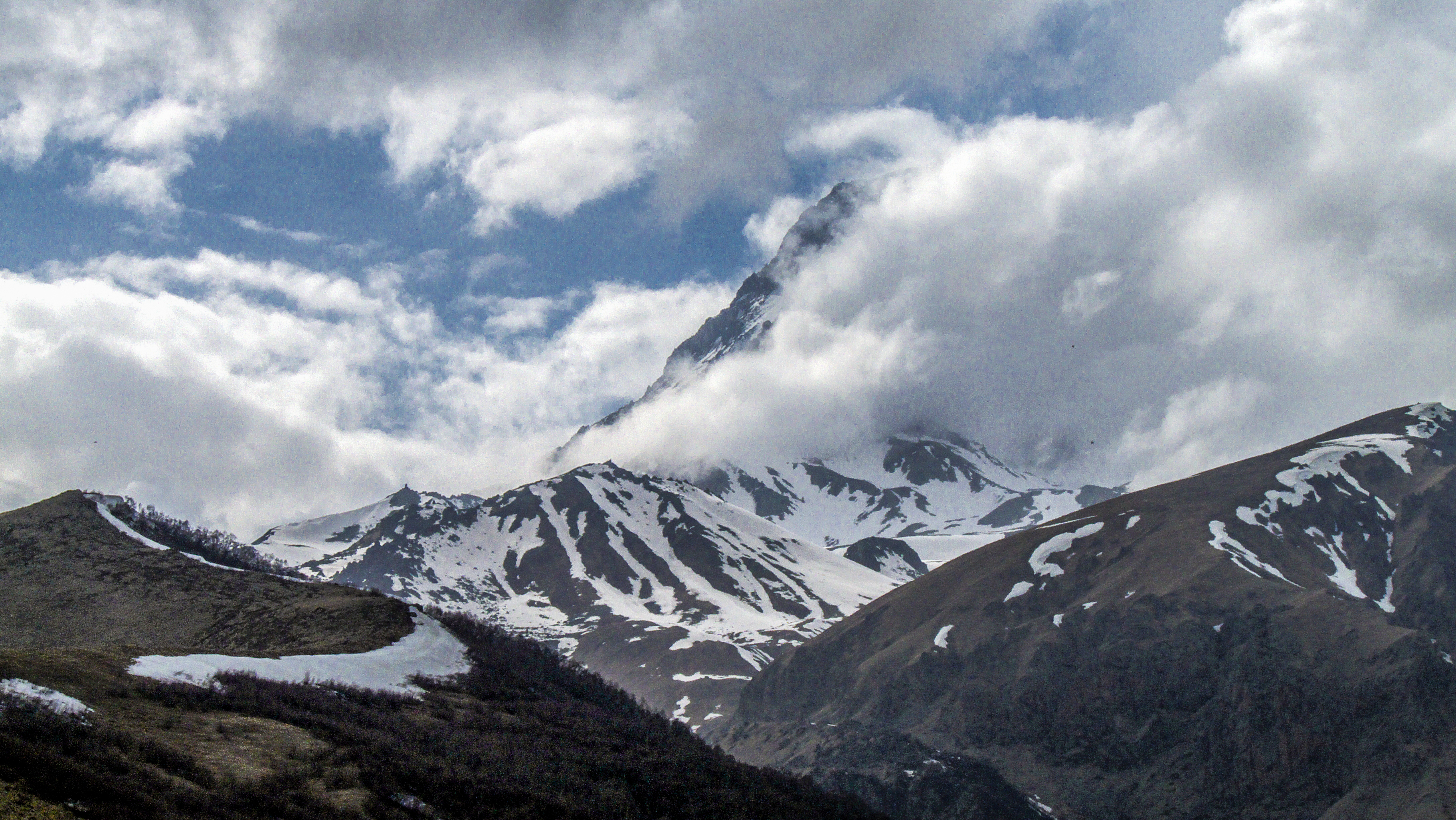 Des bouts de plus en large de ciel bleu se dévoilent et loin, très loin en bas, je vois des rectangles multicolores : les maisons de Kazbegi. Ça me donne une idée de la différence d’altitude et du chemin parcouru. Je suis assez fière de moi. Je regarde l’heure… deux heures pour redescendre, je suppose. Il est presque 17 heures et il faut rentrer si je veux arriver à temps pour le dîner. Quand je me remets en route, c’est là que le Mont Kazbek, le clou du spectacle, commence à se dévoiler.