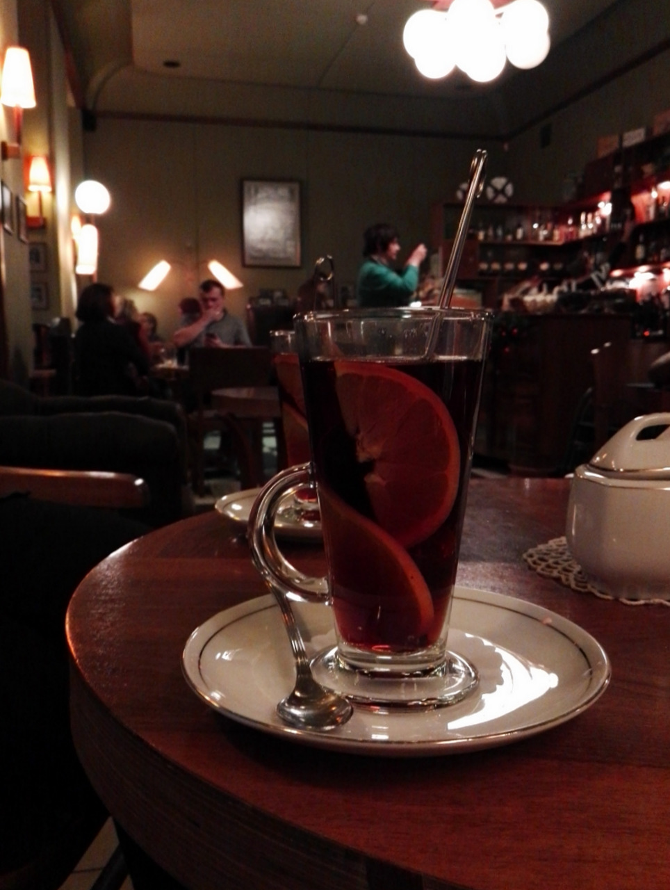 De l’Art Nouveau, à l’Art Déco, on saute quelques années pour nous retrouver dans un café tout aussi élégant, mais dans un autre genre. Ķuze, c’est d’abords une chocolaterie. On y vient aussi pour ses massepains (très populaire dans la région) et pour son décor : carrelage aux formes géométriques et l’énorme luminaire en forme d’étoile filante qui tombe du plafond. C’est ici que nous allons faire connaissance avec le « baume noir de Riga », une boisson amère faite à base d’herbes mélangées dans de la vodka et qui monte à 45 degrés. On la consomme souvent mixée avec de l’eau gazeuse, en cocktail mais aussi chaude, comme ici, avec du thé et quelques tranches d’orange mais… on reste sceptiques (c’est TRES amer) Donc, si vous l’essayer, n’hésitez pas à vous prendre une pâtisserie ou des truffes pour vous remettre un peu de sucre sur la langue. 😉