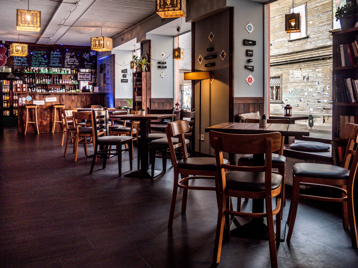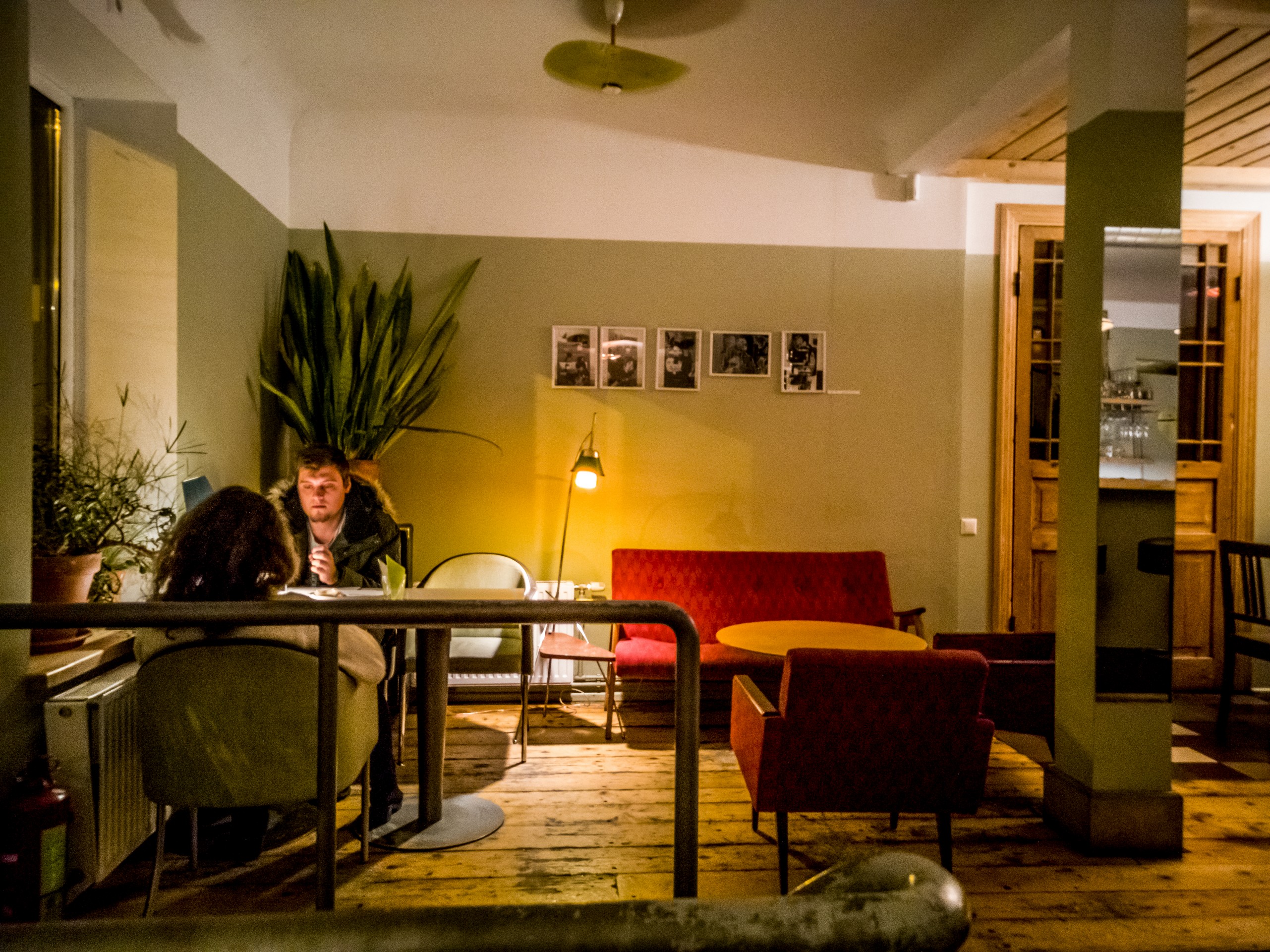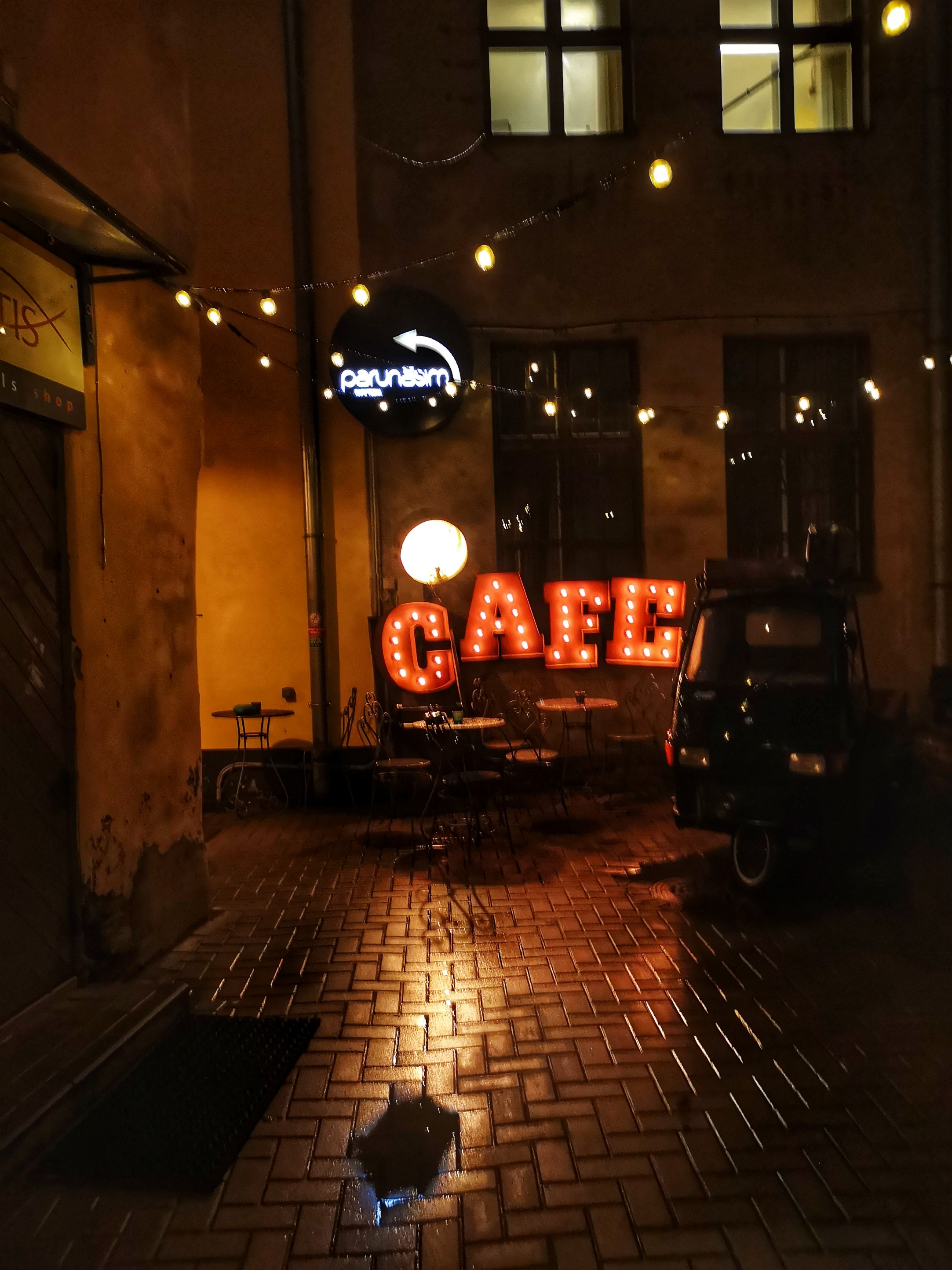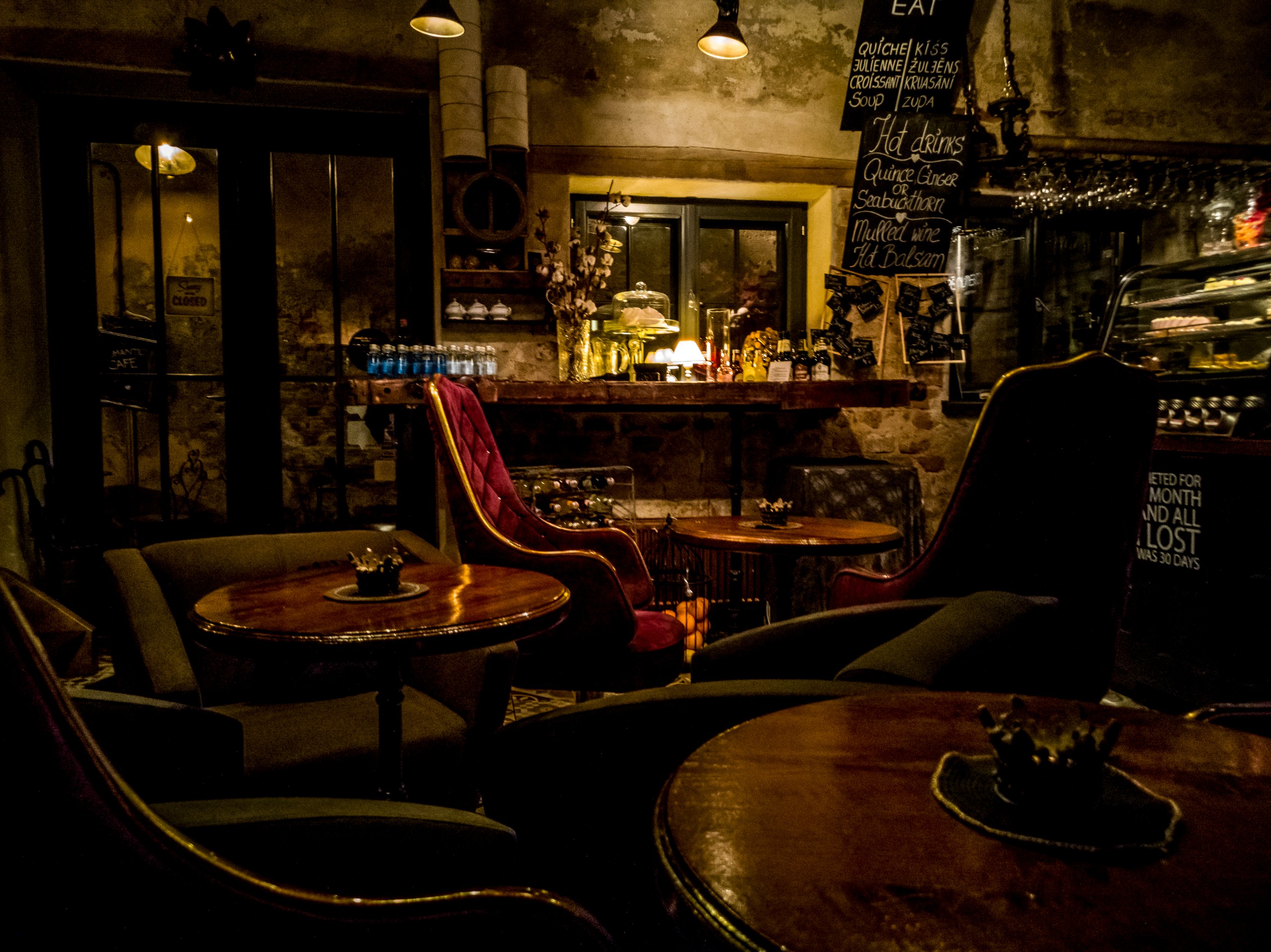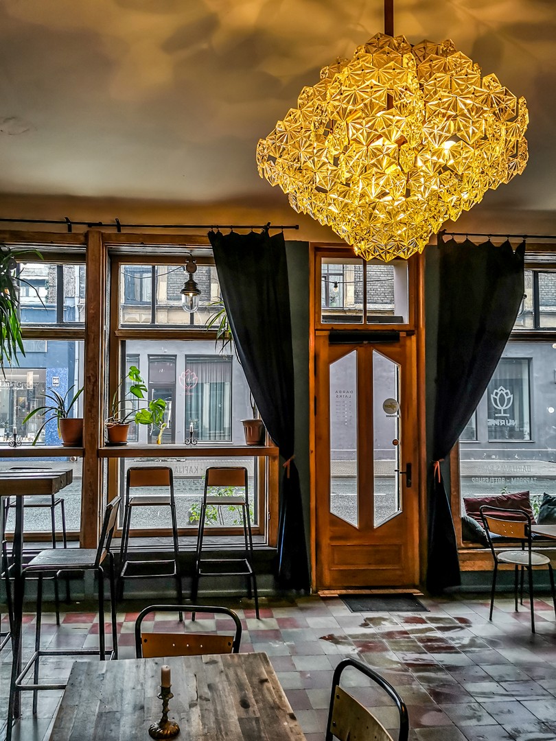 Il est 15h30/16h et le soleil est quasi déjà couché. C’est qu’à la fin de l’automne et en hiver, les journées sont courtes à Riga ! Alors pourquoi ne pas se poser dans un café un peu cozy après avoir parcouru tous les trésors de la vieille ville ? Si la nuit est déjà tombée, tu seras sûrement attiré.e, Lectrice, Lecteur, par les loupiotes d’un établissement que l’on distingue au fond d’une petite allée. Lorsque tu pousses la porte, le charme opère déjà : la porte en bois craque et couine. Une douce chaleur t’envahit, la lumière tamisée est une caresse pour les yeux, ton nez renifle une bonne odeur de café et une musique entre le jazz et le lounge vient titiller tes oreilles. Quasi tous les sens sont déjà sollicités alors que tu ne t’es même pas assis.e ! Parlons de l’intérieur : il est tout en bois, étroit, avec de petites tables et des chaises anciennes. Pas étonnant qu’il soit désigné comme le café le plus romantique de Riga !