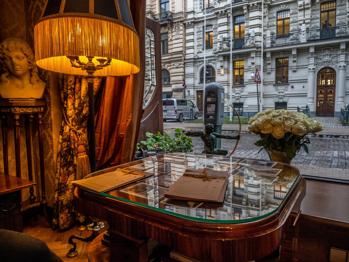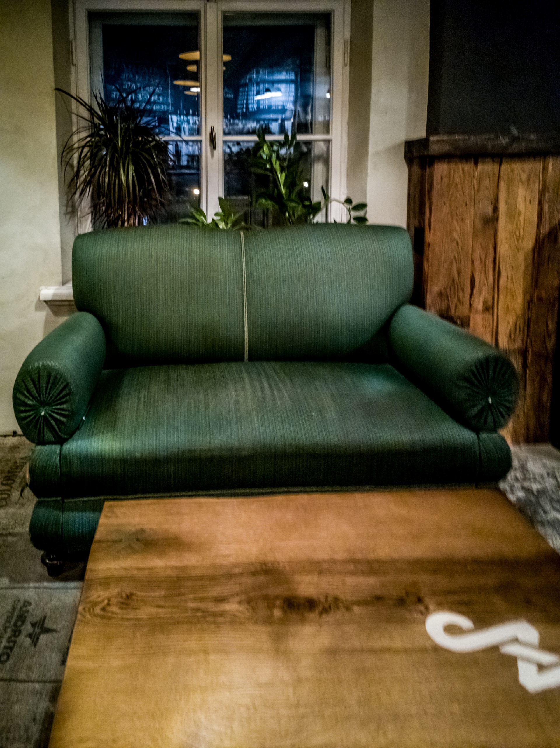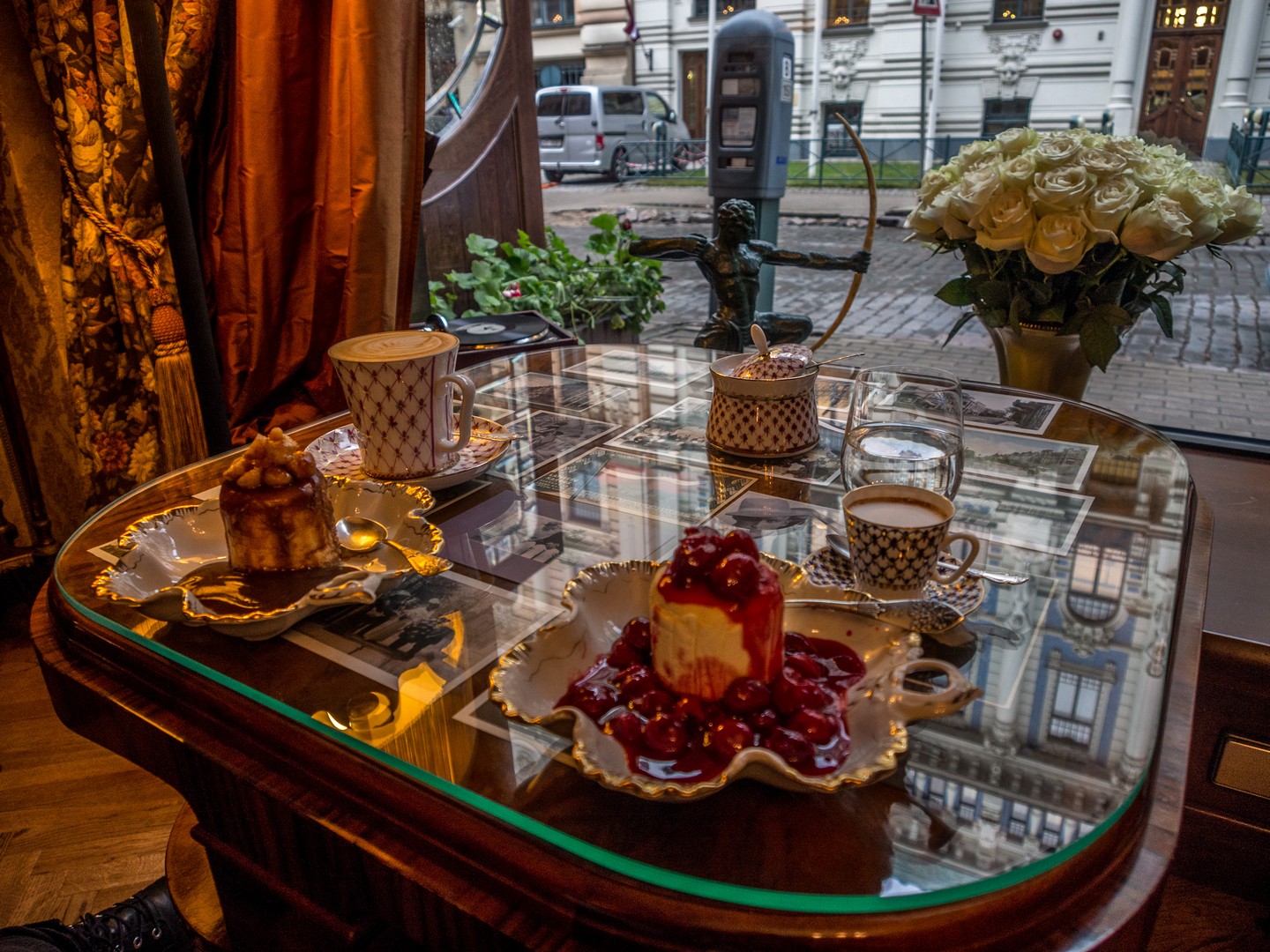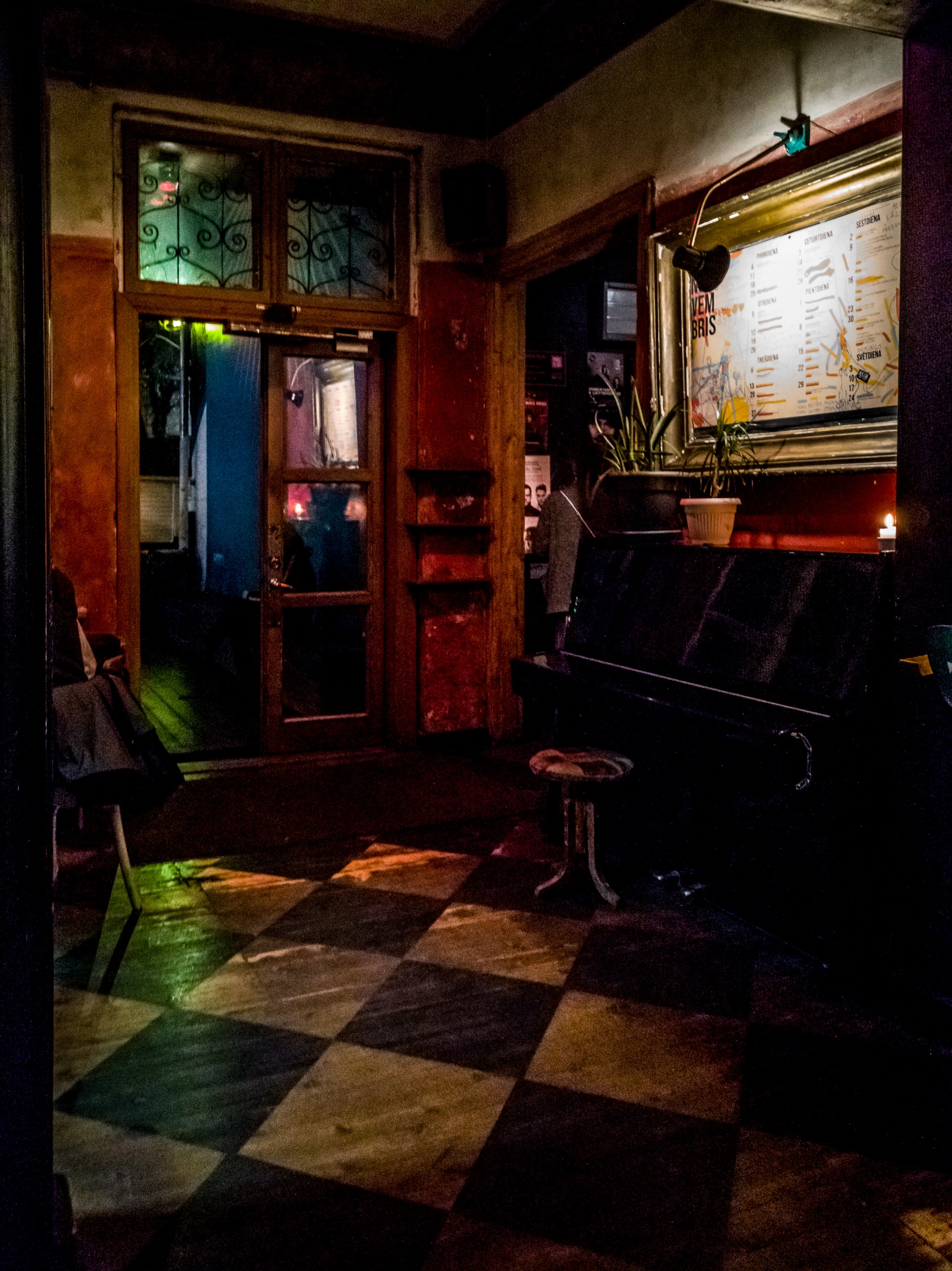Il est 15h30/16h et le soleil est quasi déjà couché. C’est qu’à la fin de l’automne et en hiver, les journées sont courtes à Riga ! Alors pourquoi ne pas se poser dans un café un peu cozy après avoir parcouru tous les trésors de la vieille ville ? Si la nuit est déjà tombée, tu seras sûrement attiré.e, Lectrice, Lecteur, par les loupiotes d’un établissement que l’on distingue au fond d’une petite allée. Lorsque tu pousses la porte, le charme opère déjà : la porte en bois craque et couine. Une douce chaleur t’envahit, la lumière tamisée est une caresse pour les yeux, ton nez renifle une bonne odeur de café et une musique entre le jazz et le lounge vient titiller tes oreilles. Quasi tous les sens sont déjà sollicités alors que tu ne t’es même pas assis.e ! Parlons de l’intérieur : il est tout en bois, étroit, avec de petites tables et des chaises anciennes. Pas étonnant qu’il soit désigné comme le café le plus romantique de Riga !