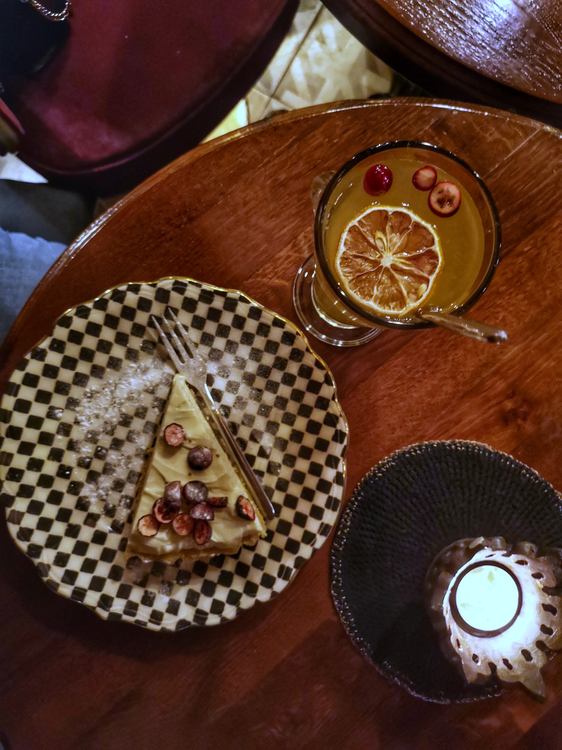Jetons un œil au comptoir où trônent des gâteaux et biscuits. Le choix va être difficile ! Si vous aimez tout ce qui est à base de crème ou de cream-cheese, vous serez au paradis en Lettonie ! Comme tous les Pays baltes, il y a une véritable passion pour ce genre d’ingrédients dans les desserts et je ne sais pas comment ils font, de la Lituanie à l’Estonie, tout ce qui est à base de lait est un véritable délice ! J’ai opté pour un gâteau cheese-cake et crème aux airelles et plutôt qu’un café, j’ai choisi un jus de coing chaud et épicé, deux fruits phares ici (je vais souvent les retrouver dans pas mal de menu). Une véritable tuerie !