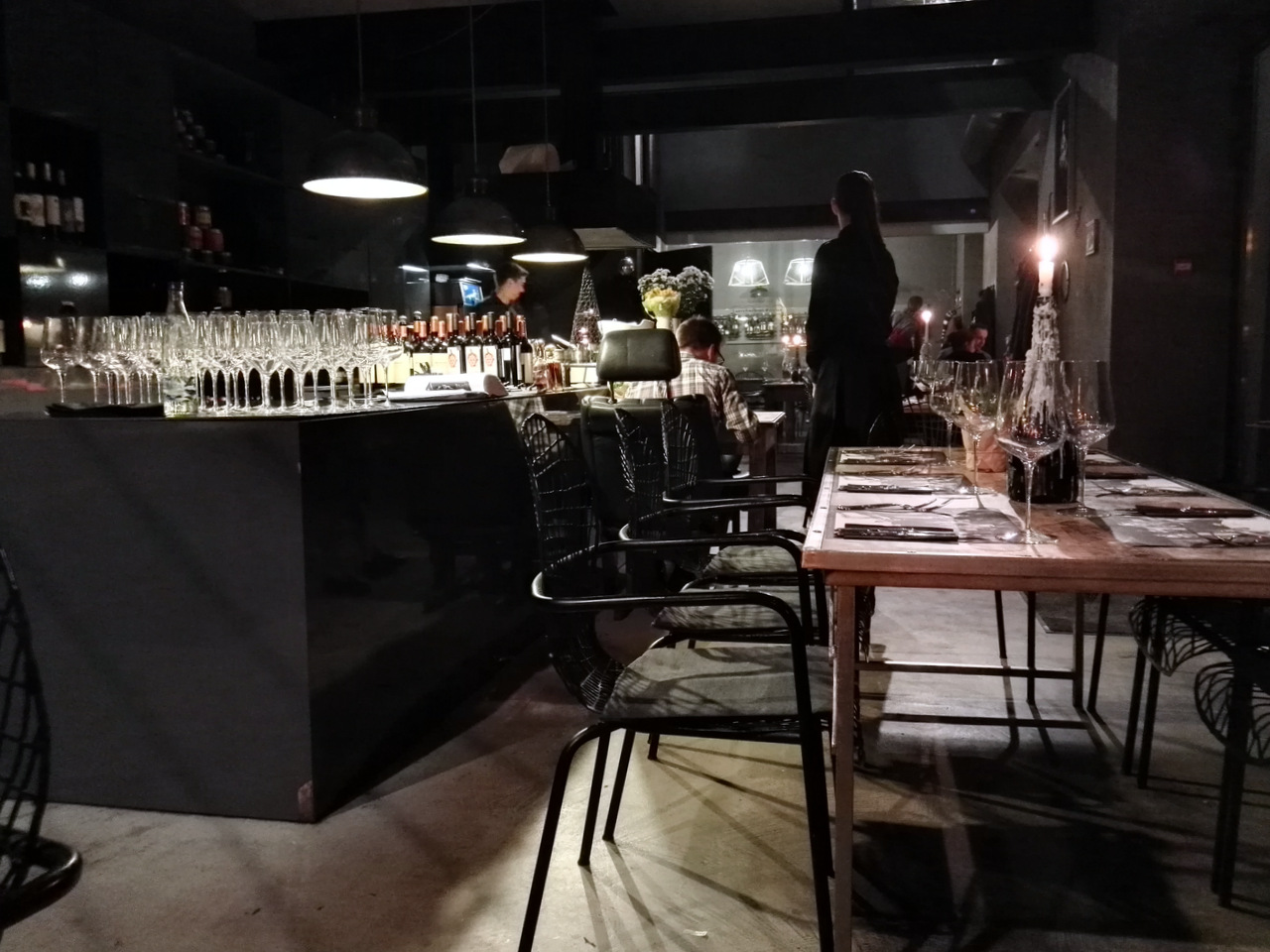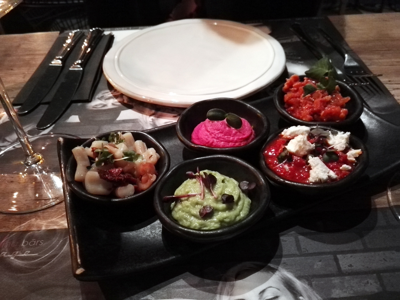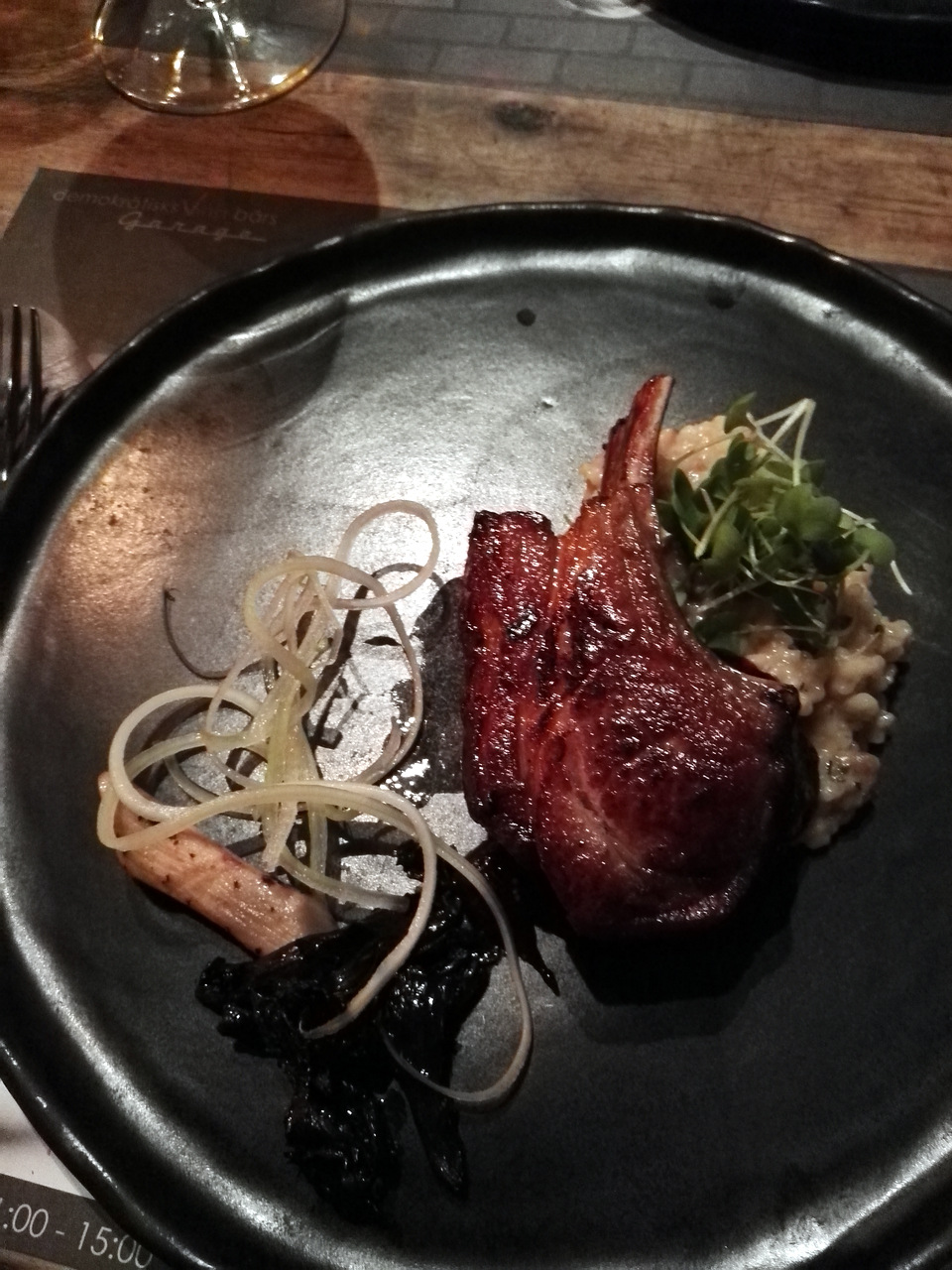 Un samedi soir, deux filles sont de sortie : il fallait tester un restaurant qui ait un peu de gueule et qui ne soit pas trop loin : direction Garage, bar à vin, à tapas et restaurant « spontané » (les tapas se font selon l’envie du chef). Situé dans une cour adjacente au Berg (un des hôtels les plus chics de Riga), cet ancien garage est tout en béton ciré et en métal, avec des tables en bois pour réchauffer un peu le tout. Tout semble parfaitement étudié ici : de l’uniforme des serveurs à l’éclairage.