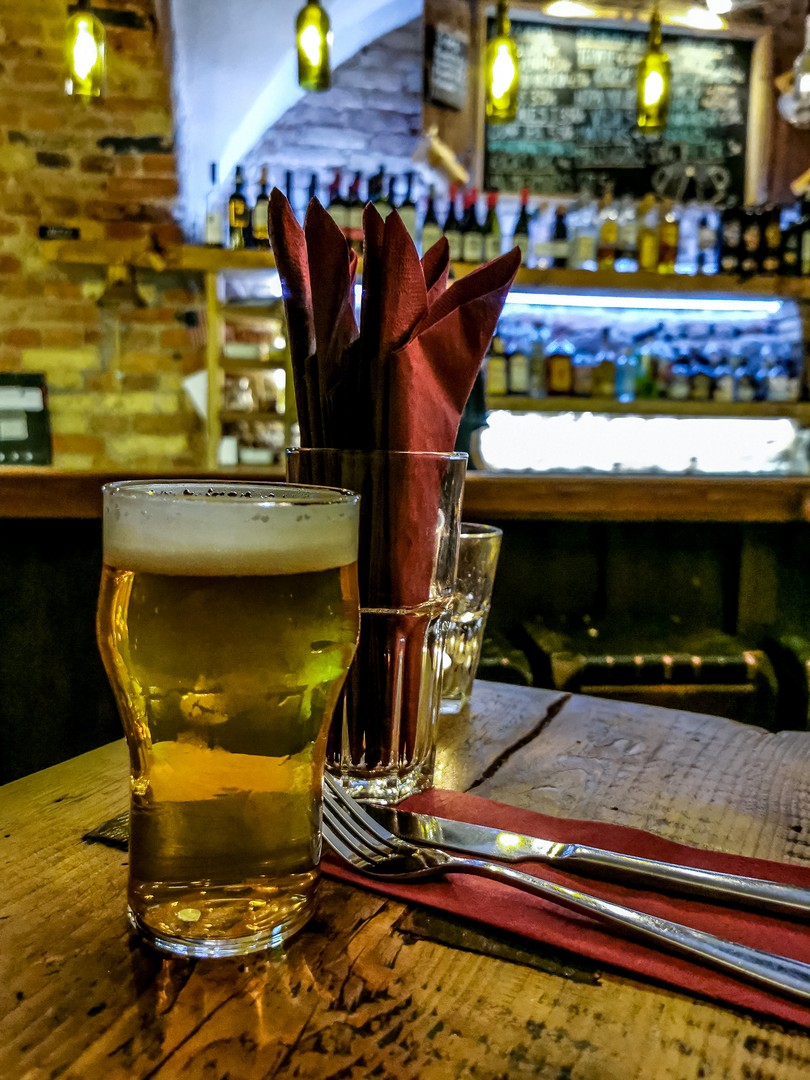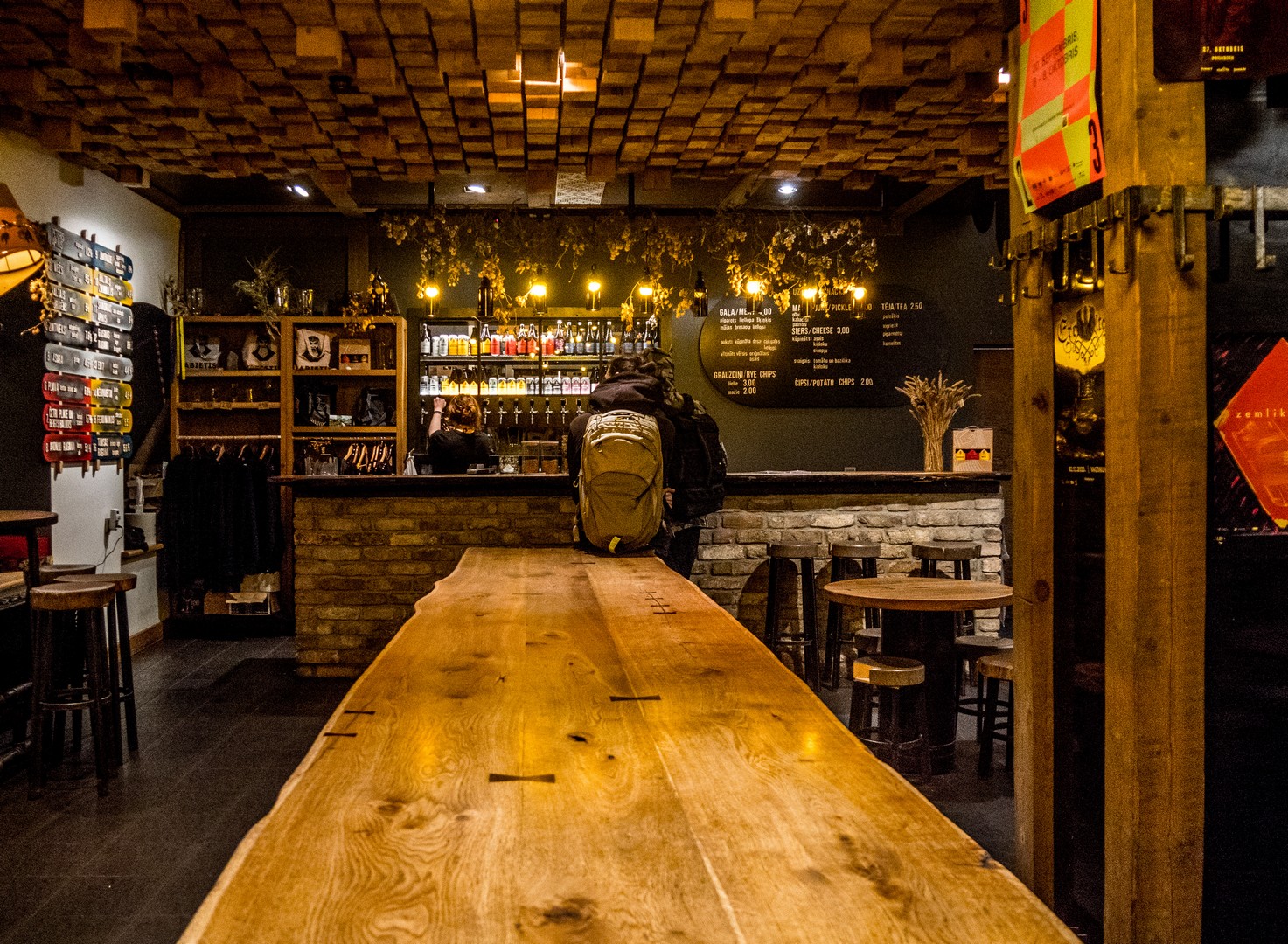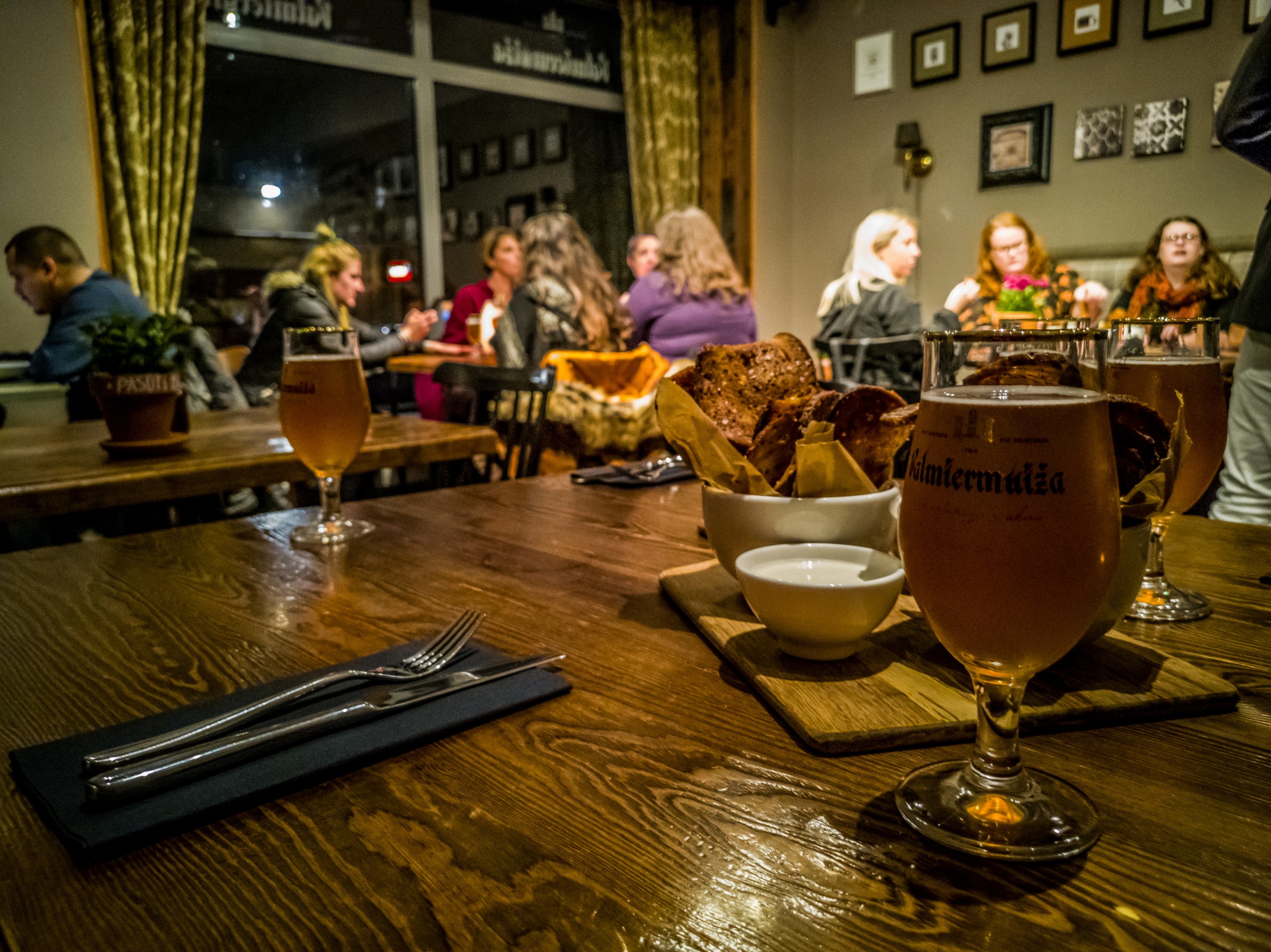 Je vous vous recommande particulièrement les pois gris servis dans un morceau de pain de seigle creux, accompagnés de bacon fumé, sauce crème à l’oignon et salade de légumes (version végé disponible avec fromage fumé et oignon caramélisé), le risotto d’orge aux carottes, oignons et viande fumée (également en version végétarienne) ou encore les boulettes lettones servies avec pommes de terre au four, choucroute, sauce tomate-oignon et crème sure. Rien qu’à la lecture, vous devez déjà être repu.e.s ! Avec son éclairage à la bougies et ses voûtes de pierre, Folkklubs offre une atmosphère unique, qui s’anime encore plus lors des concerts occasionnels. Quant à la carte des bières, elle est longue et propose exclusivement des brasseries artisanales. Petit conseil : si vous êtes plus de deux, mieux vaut réserver. Sinon, le staff vous dénichera une place au bar ou près d’un pilier.