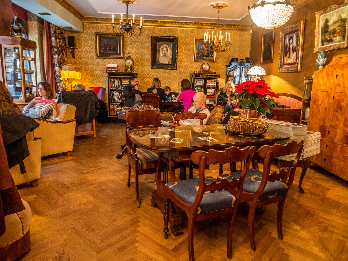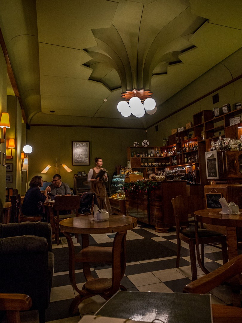 Voilà, Lectrice, Lecteur, tu as marché à travers le quartier Art Nouveau et tu prendrais bien un petit goûter : ne cherche pas plus loin que l’Art Café Sienna, un de nos coups de cœur. En poussant la porte, on a l’impression de se retrouver au début du XXème siècle. Boiseries soignées, velours partout, éclairage tamisé, profonds fauteuils (si les fauteuils en face de la grande fenêtre sont vides, sautez dessus, vous pourrez admirer le spectacle des bâtiments qui vous entourent). Ici, l’ambiance est feutrée, le service d’une politesse et d’une prévenance d’un autre temps et les desserts, complètement décadents ! Il parait que la Forêt noire est à essayer mais Sad (qui m’accompagnait lors de ma visite) et moi avons plutôt opté sur une revisitation du cheesecake… avec du lait de chèvre. Accompagné de vrai caramel bien épais avec des noisettes pour Sad et de cerises et son coulis pour moi. Autant vous dire que nous n’avions VRAIMENT pas envie de bouger !