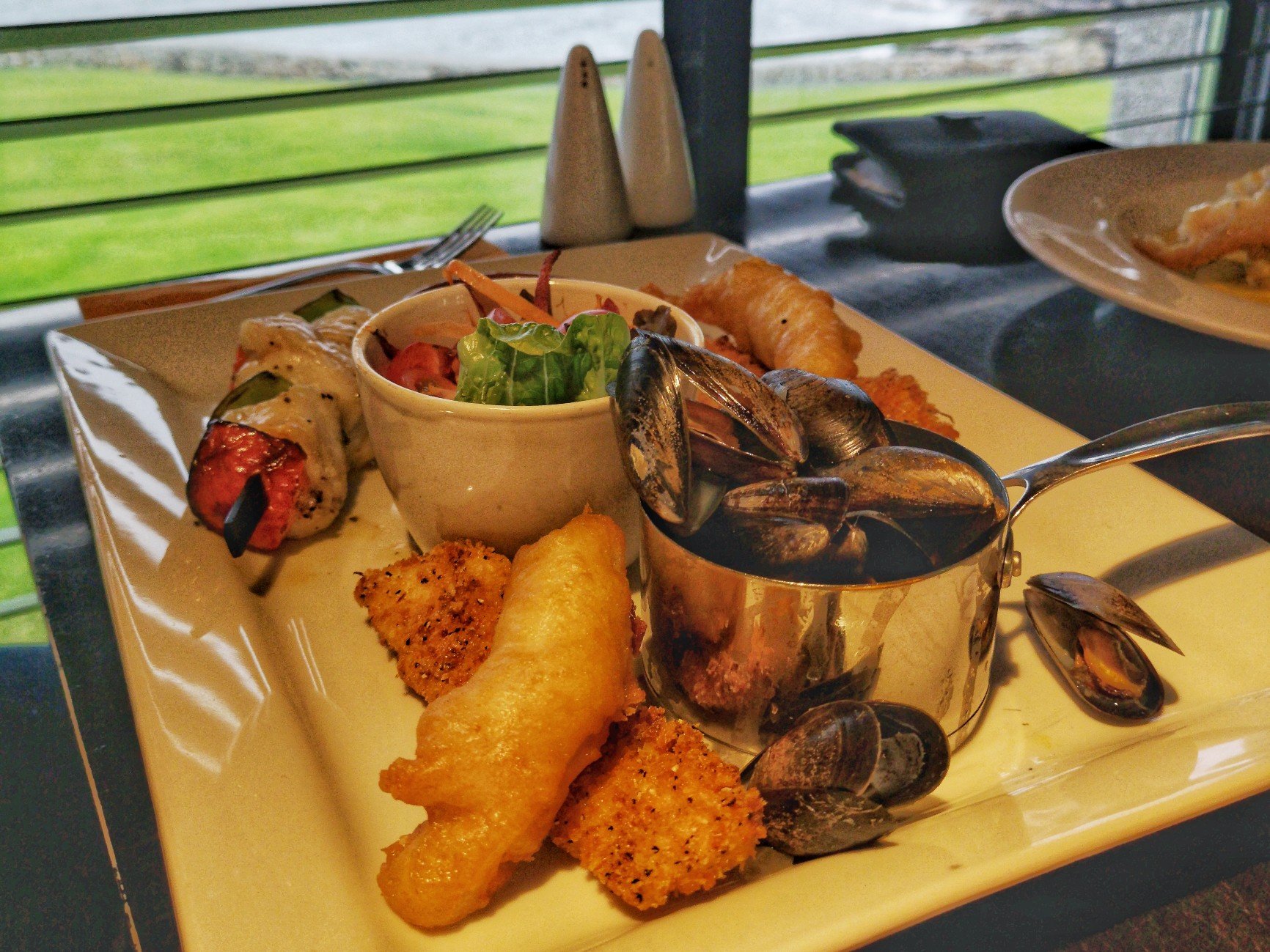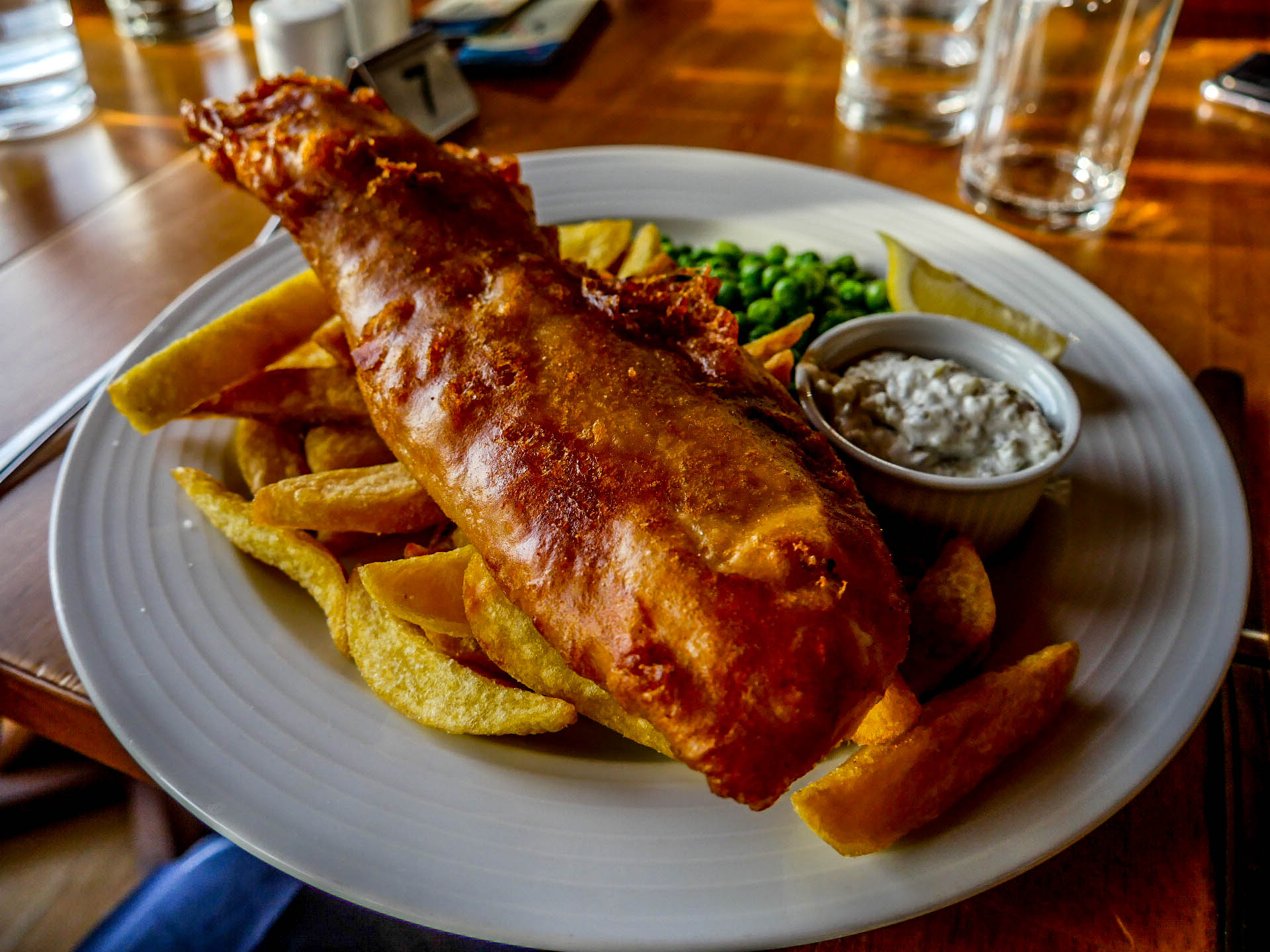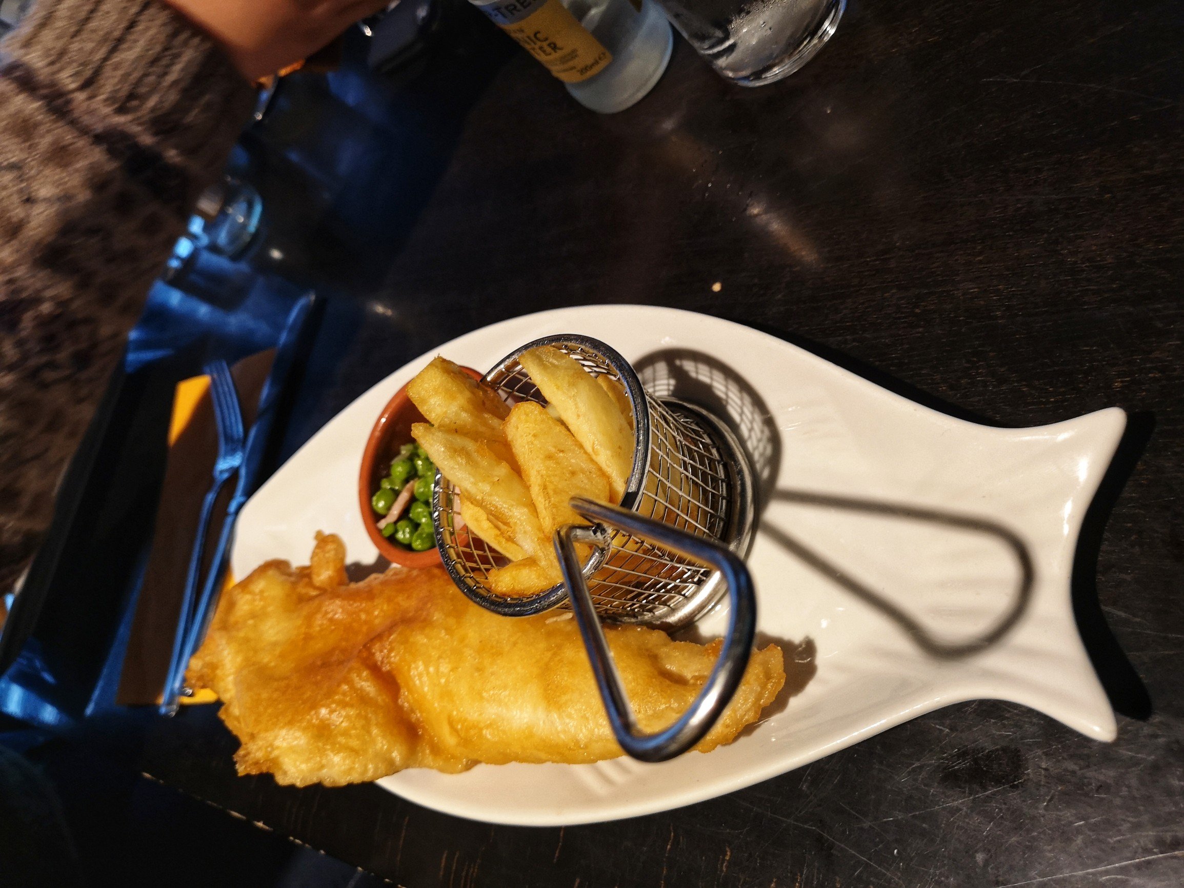 Hors du vieux centre-ville, le Lerwick Hotel est assurément plus moderne que les autres établissements, et ça se sent aussi dans son restaurant : the Bay Brasserie. Tons sombres, lignes modernes, une superbe vue sur la baie… On se dit que si le ramage se rapporte au plumage, on va bien manger. Et en effet, on passe un cran au dessus, que ce soit au niveau de la cuisine qu’au niveau des présentations. Je vais me régaler d’un bon fish and chips accompagné de grosses frites fraîches et bien sûr, de petits pois mais au lieu de la menthe ou du bacon, c’est de la pancetta qui vient donner un supplément de goût. En dessert, j’ai opté pour une panna cotta au caramel avec sa glace au pain d’épice et une sauce au chocolat-caramel salé. Une adresse recommandable, donc.