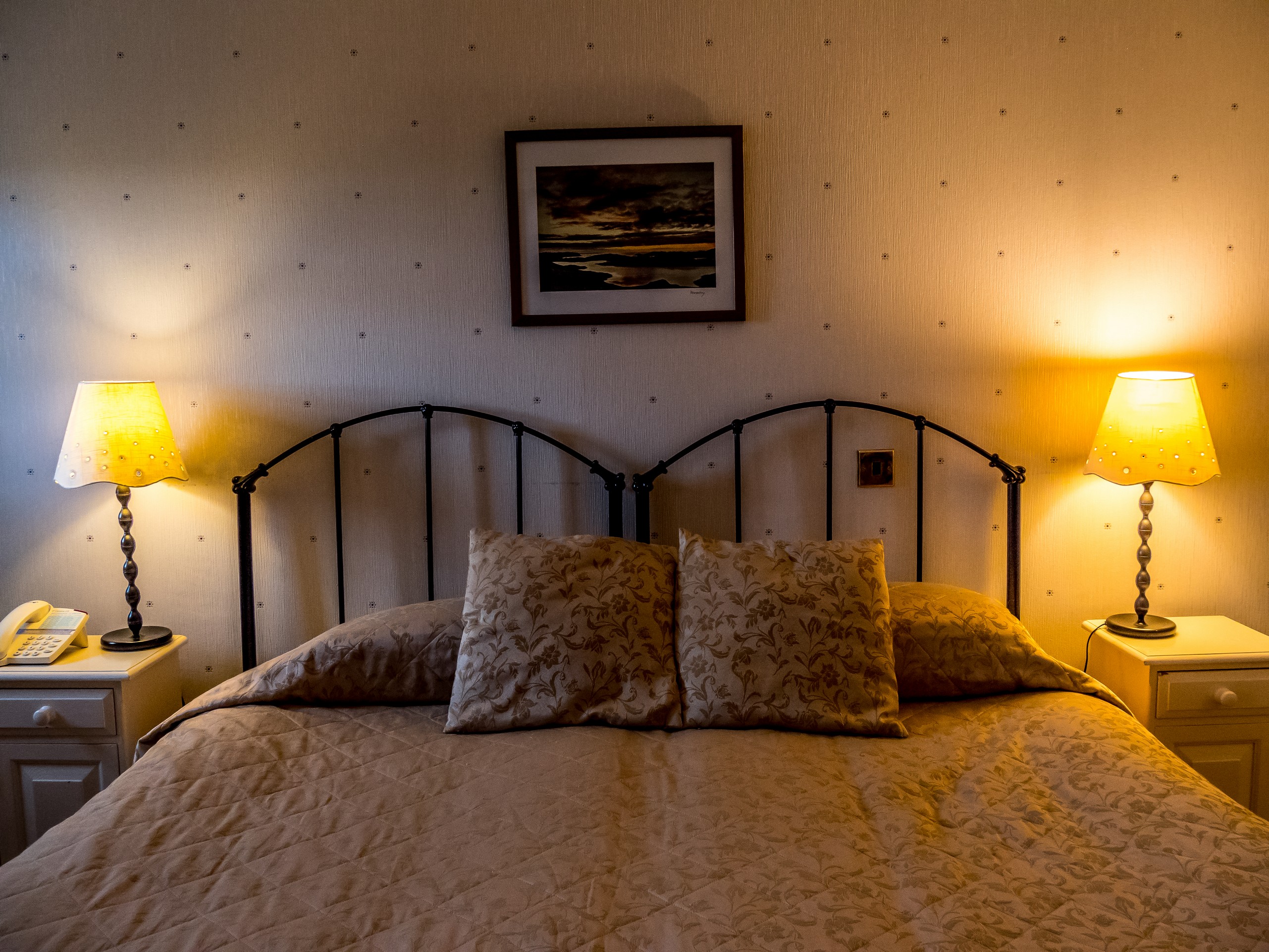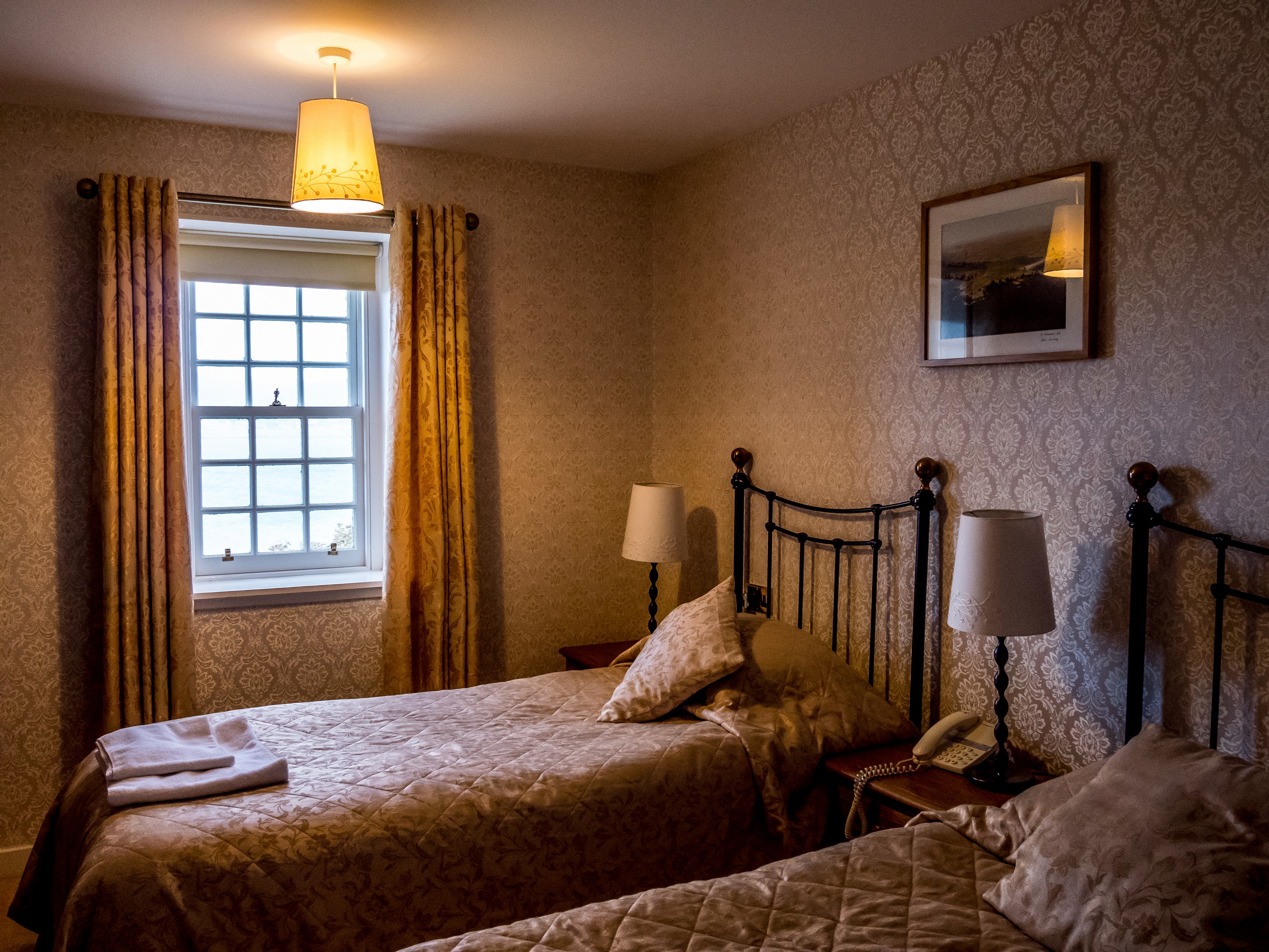 Nous avons d’abords séjourné au Grand Hotel, pile au milieu de Commercial Street (la bien nommée, vu son nombre de magasins), l’axe principal de Lerwick. Cet hôtel est logé dans une belle demeure en pierre grise, avec une architecture très écossaise. L’intérieur semble aussi avoir été figé dans le temps, tout comme la déco des chambres qui mériteraient un bon coup de rafraîchissement. Néanmoins, elles ne manquent de rien (et il existe même des chambres « single »). Un bon point pour la belle salle du petit-déjeuner avec une vue sur le vieux port de Lerwick. De quoi vous mettre en joie en dégustant votre bacon et commencer votre journée sur le bon pied ! Comptez 210 Euros pour une nuit.