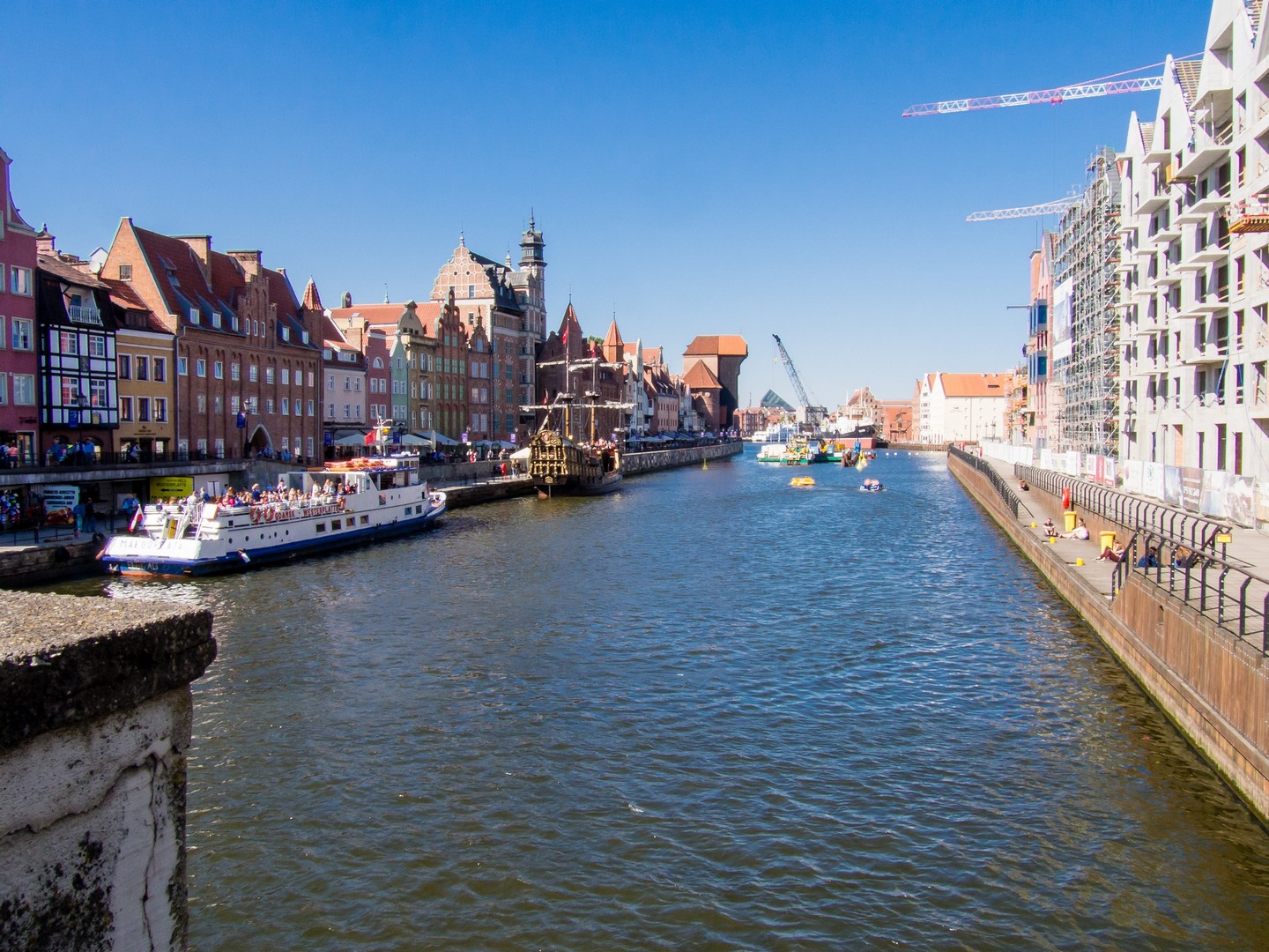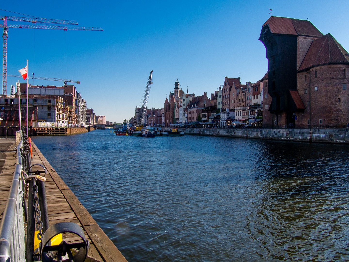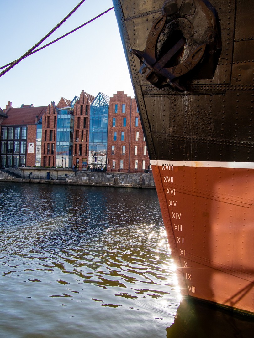 Notre promenade commence par les rives de la rivière qui a vu naître Gdansk : la Motława. Contrairement à ce qu’on pourrait penser, Gdansk n’est pas au bord de la mer, mais juste quelques kilomètres dans les terres, connectée à la Baltique par le réseau du delta de la Vistule. Mais avec ses bateaux et son chantier naval, c’est tout comme ! Et le long des quais, on ne peut pas manquer une survivante de l’époque médiévale : Zuraw. Son apparence actuelle date du milieu du XVème siècle et cette grue médiévale servait à un peu de tout : charger et décharger les marchandises, surtout les céréales, ou encore le matériel de construction des navires. En la regardant, Lectrice, Lecteur, tu remarqueras qu’elle porte des briques de couleurs différentes (ce que tu retrouveras souvent à Gdansk). C’est que Zuraw a été partiellement détruite, et incendiée en 1945. Ces briques foncées en sont les survivantes. Le reste a été reconstruit dans les années 50. Nous sommes ici sur « Granary Island », l’île au grenier. En effet, Gdansk est fait de différentes îles séparées par la rivière et de petits chenaux.