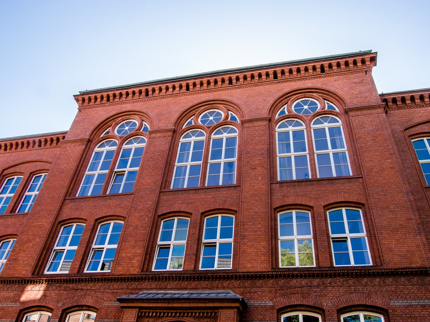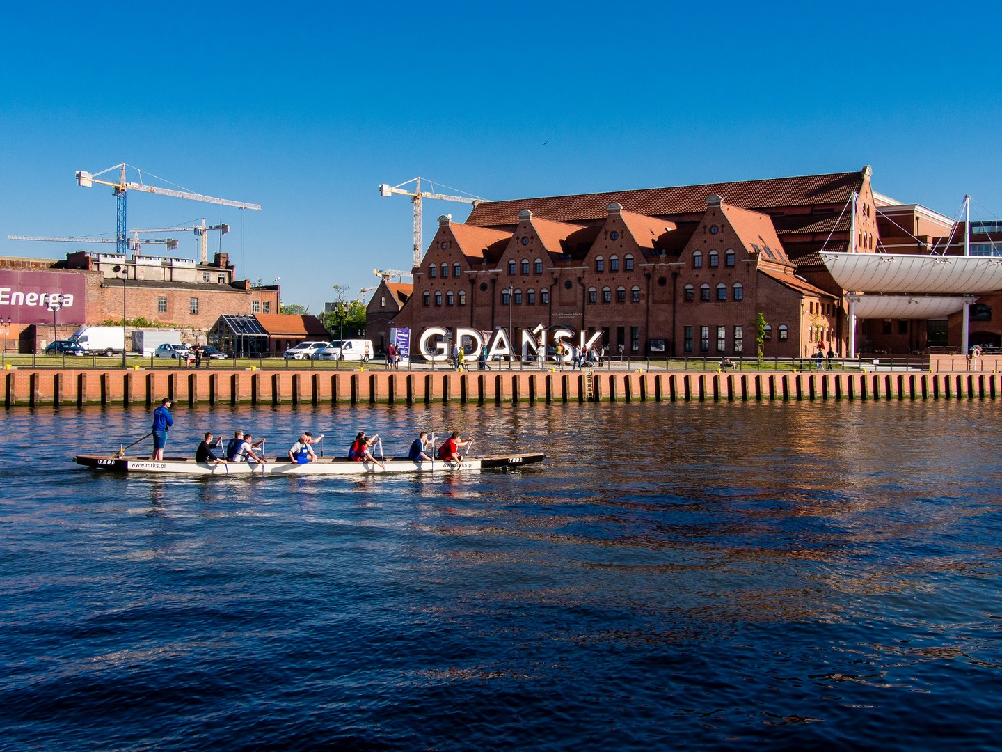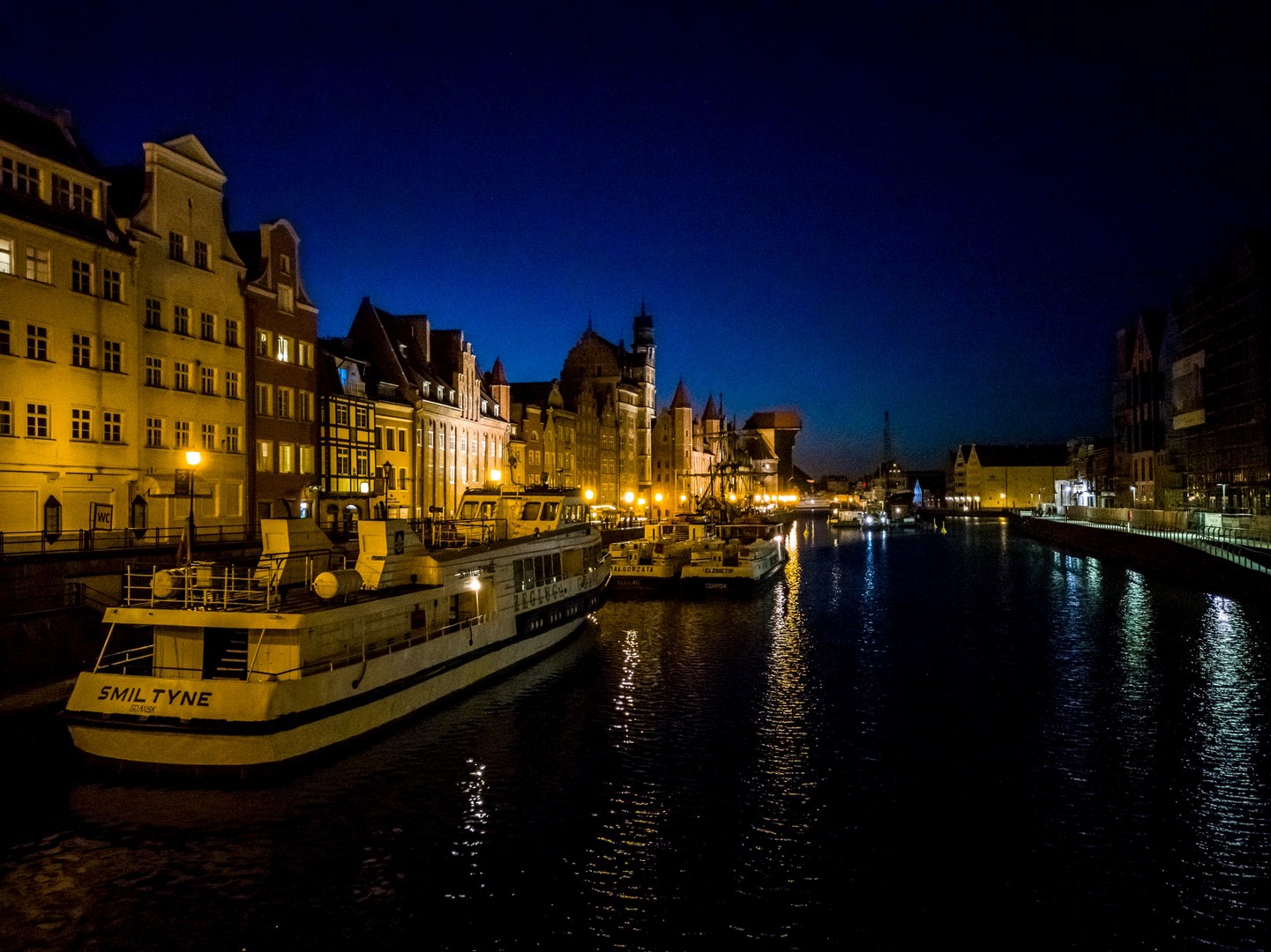Notre promenade commence par les rives de la rivière qui a vu naître Gdansk : la Motława. Contrairement à ce qu’on pourrait penser, Gdansk n’est pas au bord de la mer, mais juste quelques kilomètres dans les terres, connectée à la Baltique par le réseau du delta de la Vistule. Mais avec ses bateaux et son chantier naval, c’est tout comme ! Et le long des quais, on ne peut pas manquer une survivante de l’époque médiévale : Zuraw. Son apparence actuelle date du milieu du XVème siècle et cette grue médiévale servait à un peu de tout : charger et décharger les marchandises, surtout les céréales, ou encore le matériel de construction des navires. En la regardant, Lectrice, Lecteur, tu remarqueras qu’elle porte des briques de couleurs différentes (ce que tu retrouveras souvent à Gdansk). C’est que Zuraw a été partiellement détruite, et incendiée en 1945. Ces briques foncées en sont les survivantes. Le reste a été reconstruit dans les années 50. Nous sommes ici sur « Granary Island », l’île au grenier. En effet, Gdansk est fait de différentes îles séparées par la rivière et de petits chenaux.