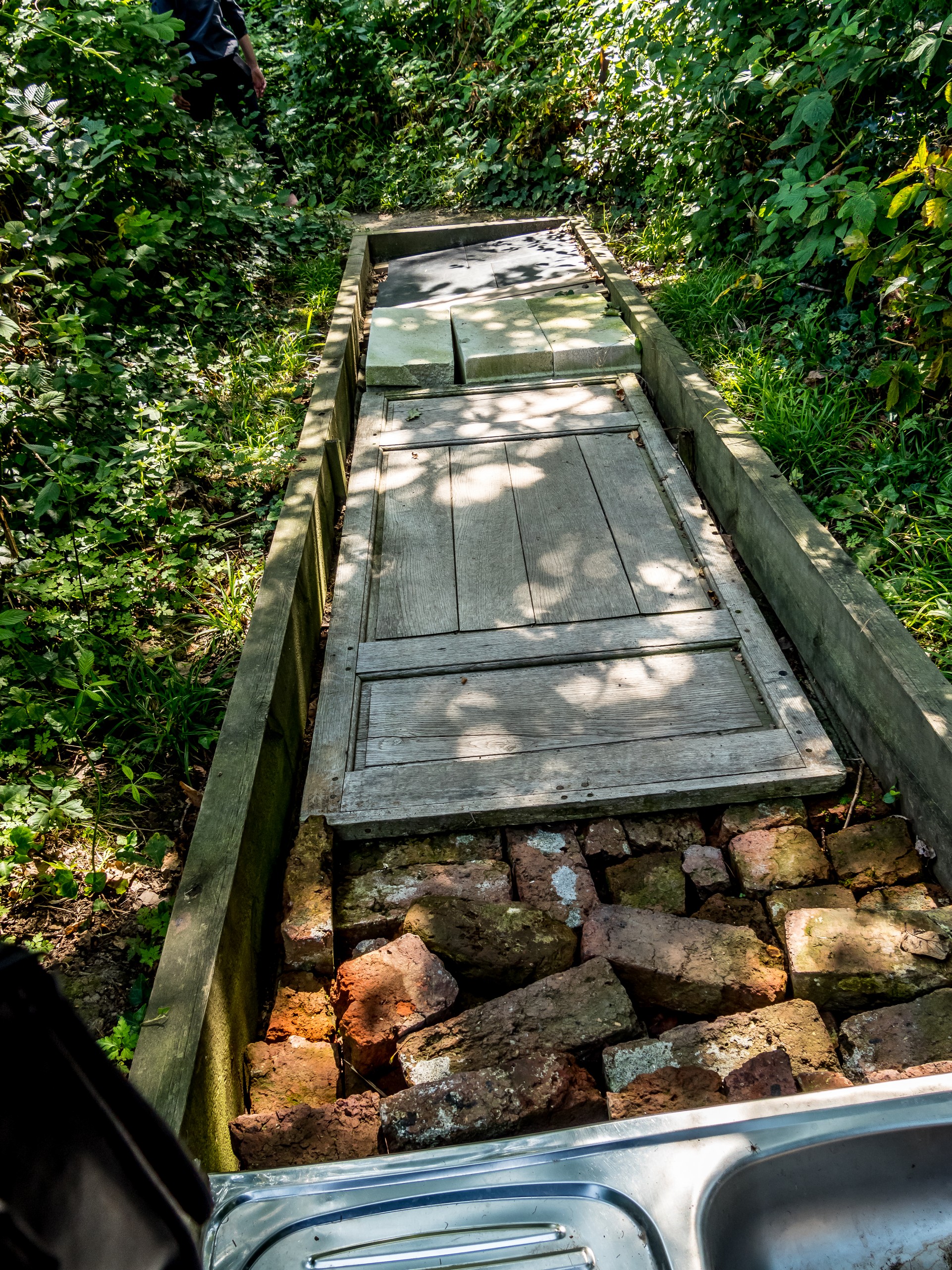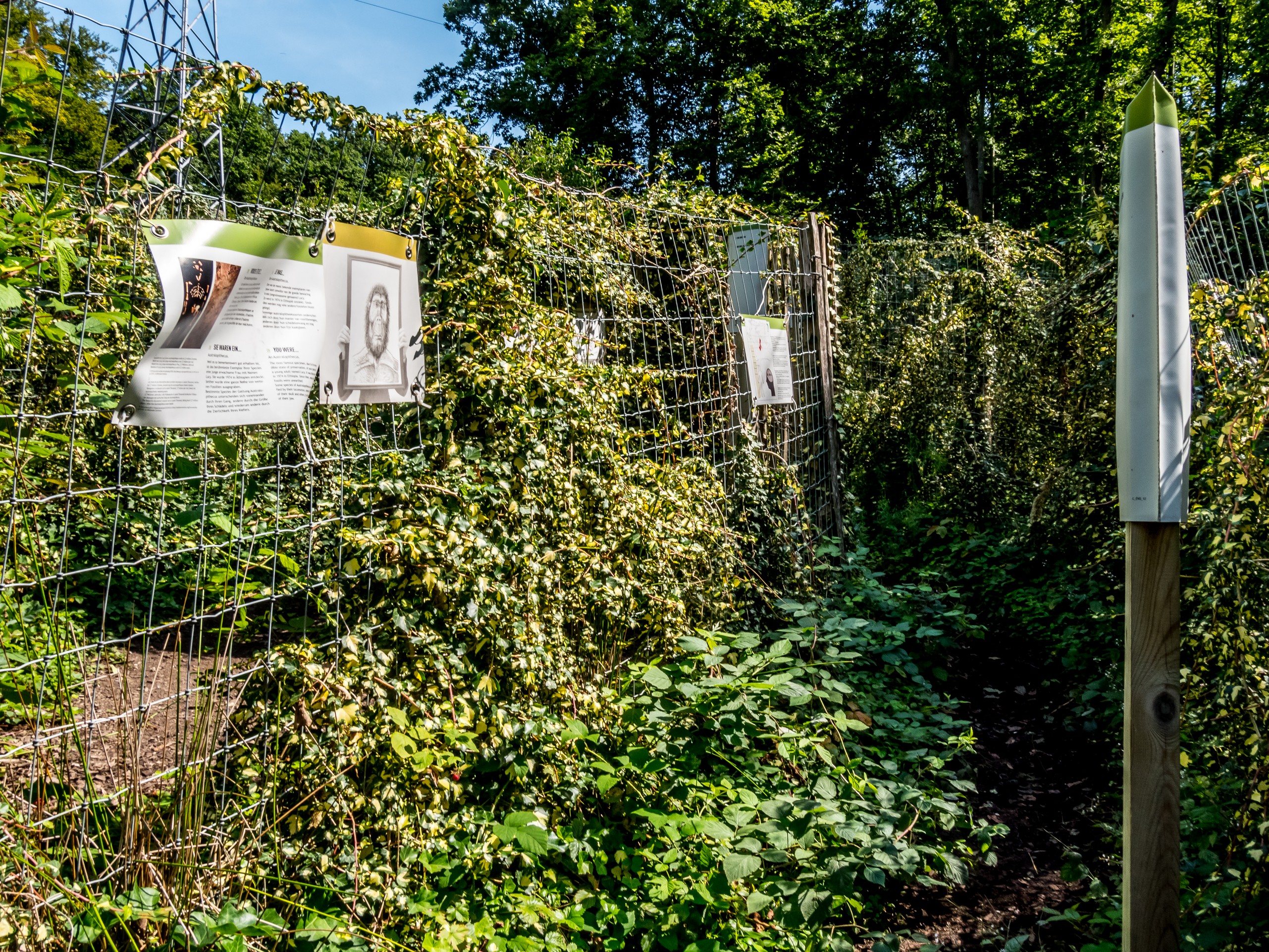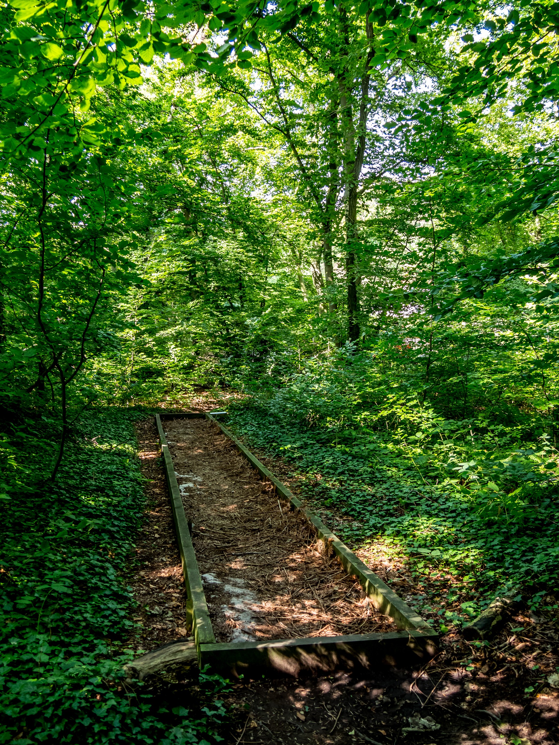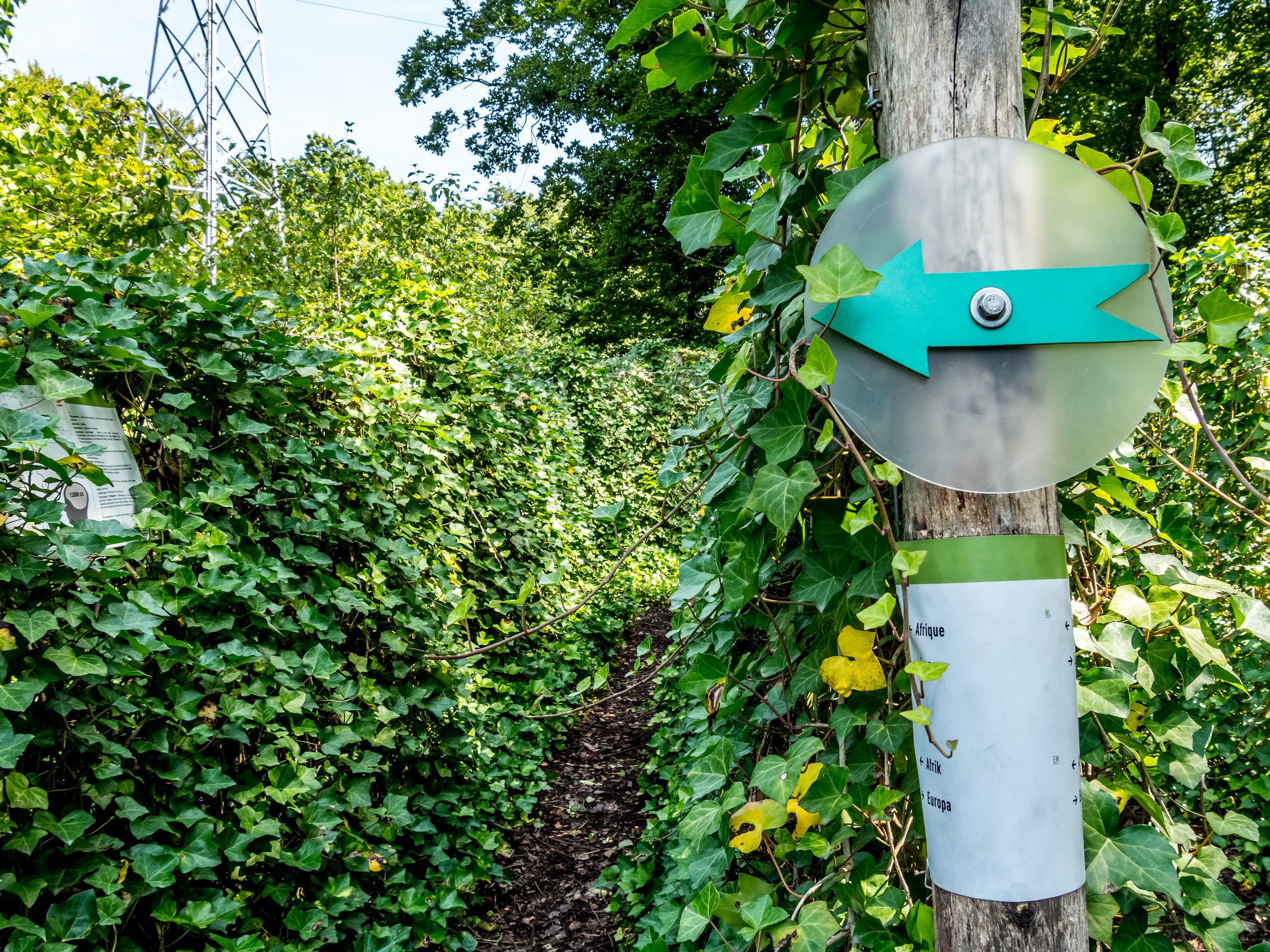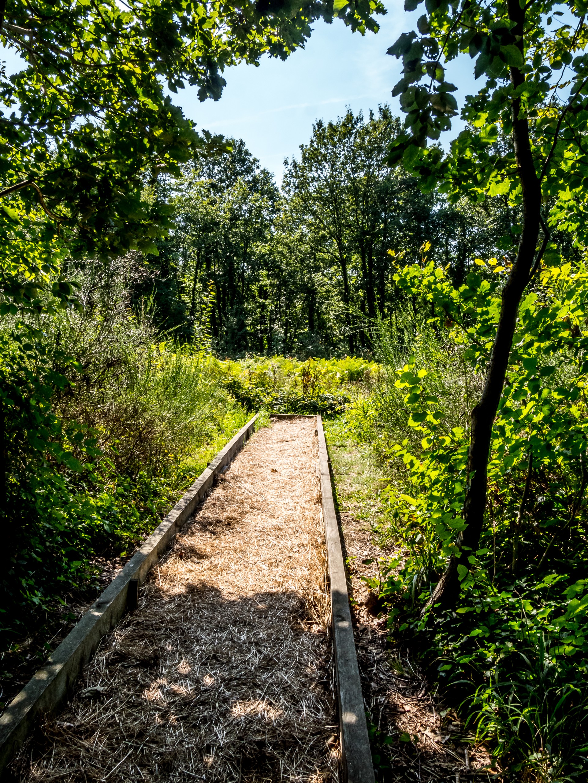 La prochaine station est un sentier pieds-nus, comme j’avais pu le voir dans l’Armentiérois avec le Sentier-va-nu-pied sauf qu’ici, nous sommes dans un petit bois. Le sentier mélange des matières organiques (comme du bois), des minéraux (des pierres) et d’autres complètement artificielles (comme un évier de cuisine). A chaque changement de matériau, des petits panneaux vous interrogent sur la place de l’espèce dans la nature, ses effets sur elle, etc. On a le choix de juste profiter de l’expérience et des sensations qu’elle procure (ça fait un bon massage parfois vigoureux selon les matières, de la voûte plantaire), de profiter du paysage qui se déroule entre bois, bosquet, clairières ou de vraiment prendre le temps de s’interroger selon les questions posées.