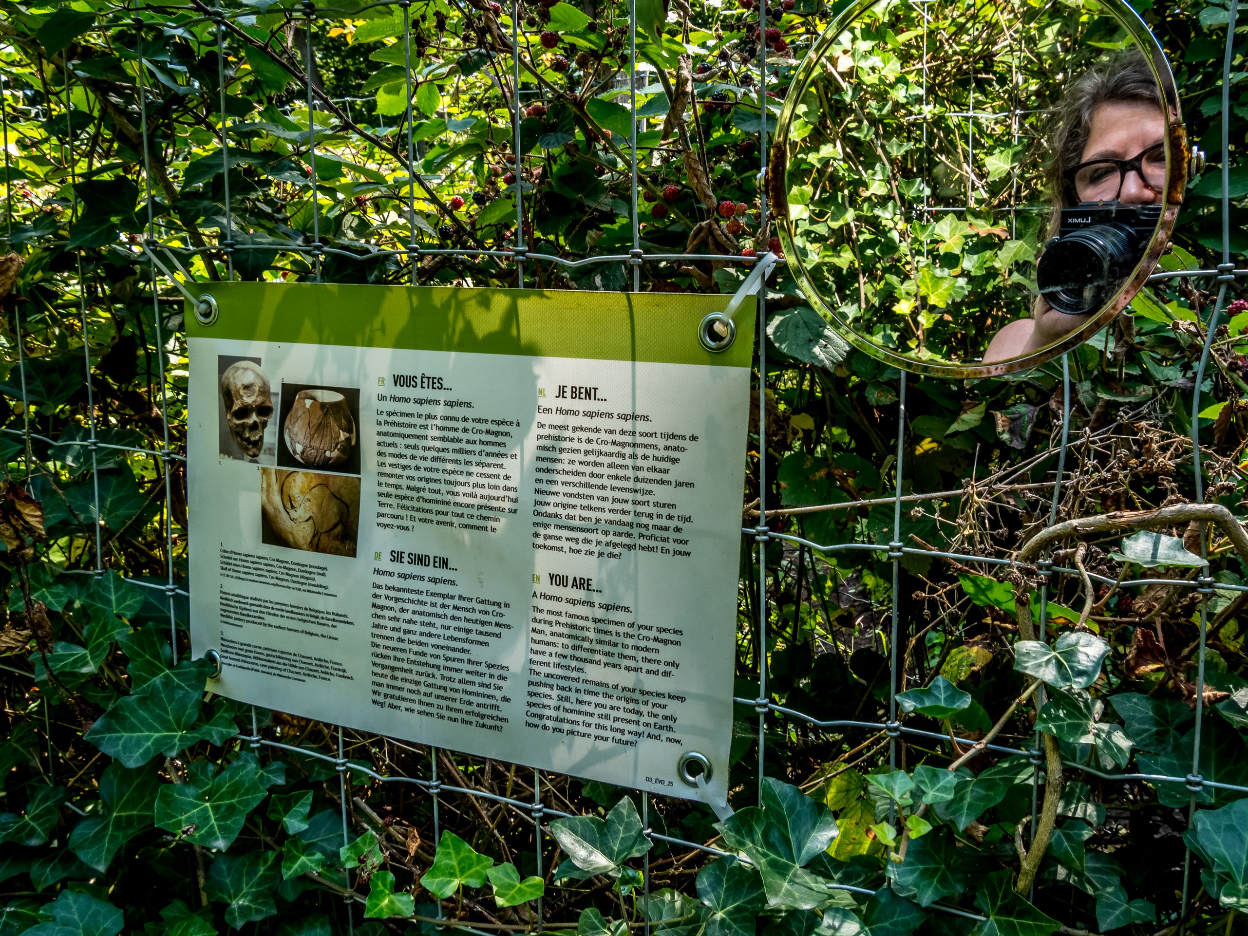 J’avais donc hâte qu’on se mette en route pour découvrir les lieux ! Le domaine est divisé en zones et si nous n’allons pas tout voir, Marie m’en montrera une bonne partie. Nous passons d’abords par l’espace du labyrinthe de l’évolution. Un vrai labyrinthe qui vous fait démarrer primate. Aux embranchements, des questions vous sont posées et si vous arrivez à éviter les extinctions (nombreuses sont les espèces disparues) vous en ressortirez singe ou homo sapiens sapiens. Une façon imagée et ludique de visualiser et de comprendre l’évolution des espèces.