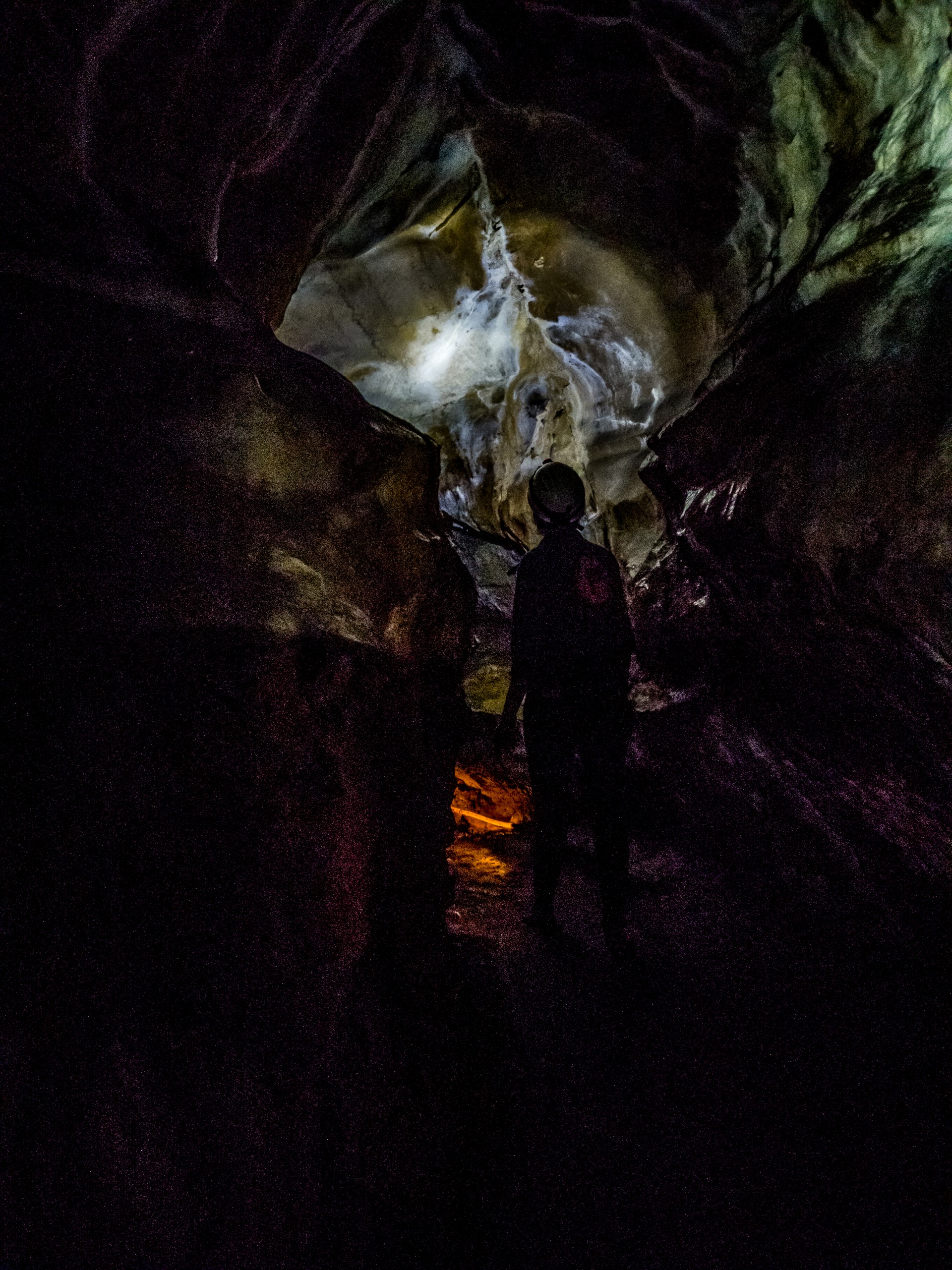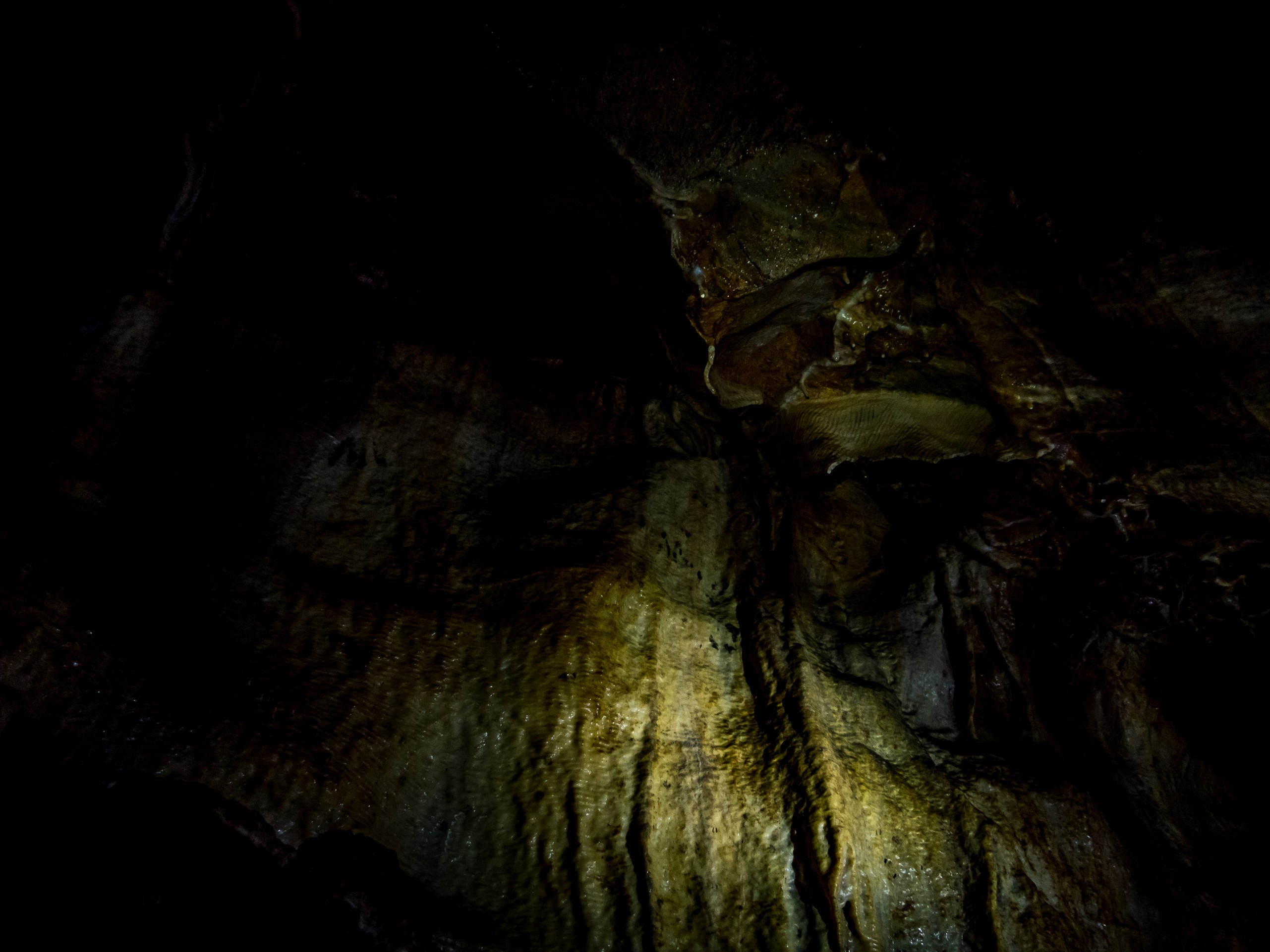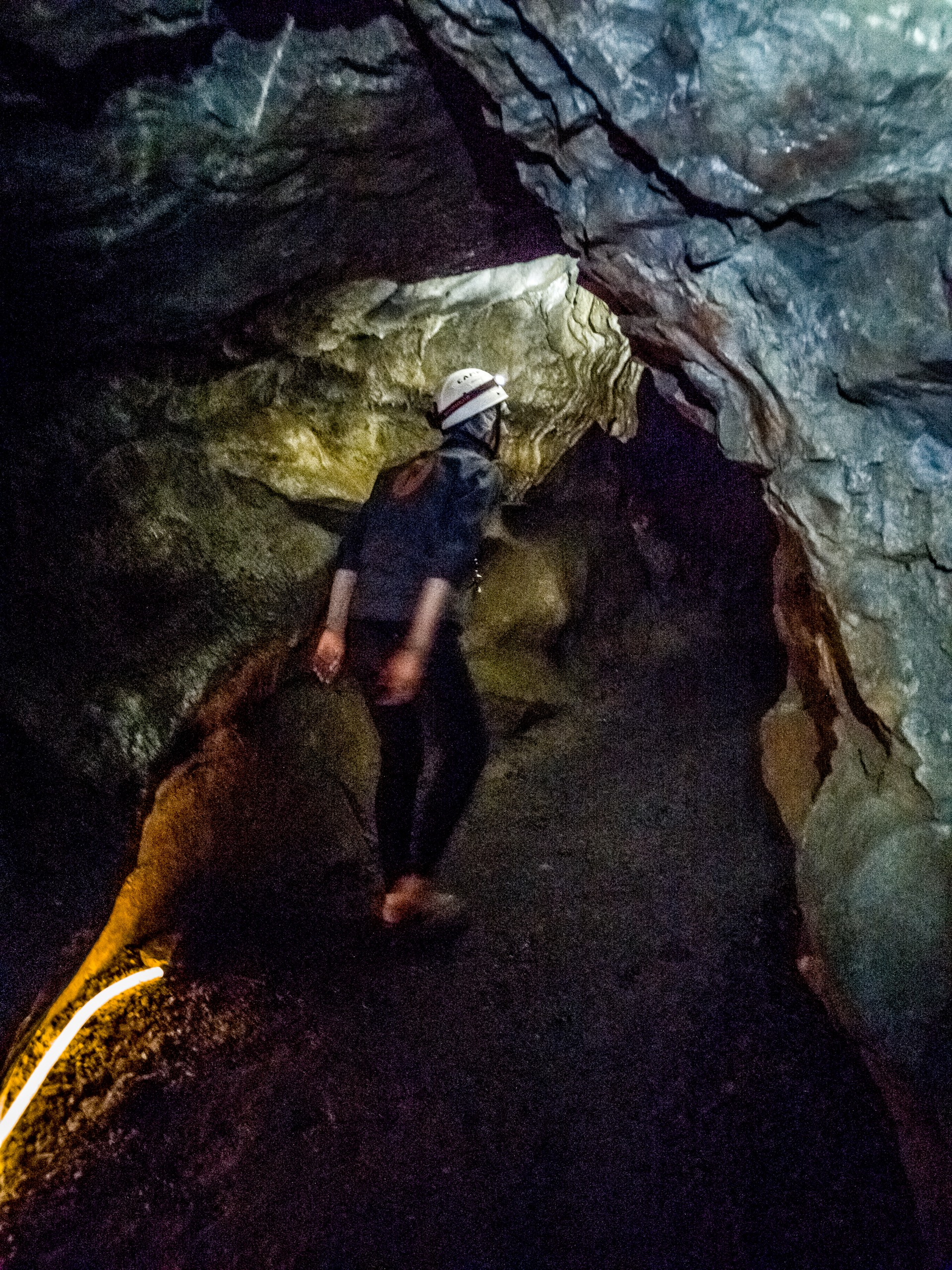 Mais avec tout ça, nous n’avons pas encore vu le lieu où tout a commencé : la fameuse Grotte de Ramioul. Et pour la visiter, c’est un peu particulier car on se met plus en moins dans la peau de ceux qui l’on découverte : elle est plongée dans le noir et elle se visite à la lumière de la lampe-torche. J’enfile donc un casque, allume ma loupiote et c’est parti ! Gros coup de bol, Marie et moi sommes les seules à se balader dedans. On a donc tout le temps d’en profiter et d’admirer les différentes salles. Elles ne sont pas spécialement spectaculaires (les salles sont petites) mais l’idée de faire la visite de cette manière est vraiment bien trouvée et permet de se rendre compte de ce qu’est la spéléologie et l’exploration de l’inconnu.