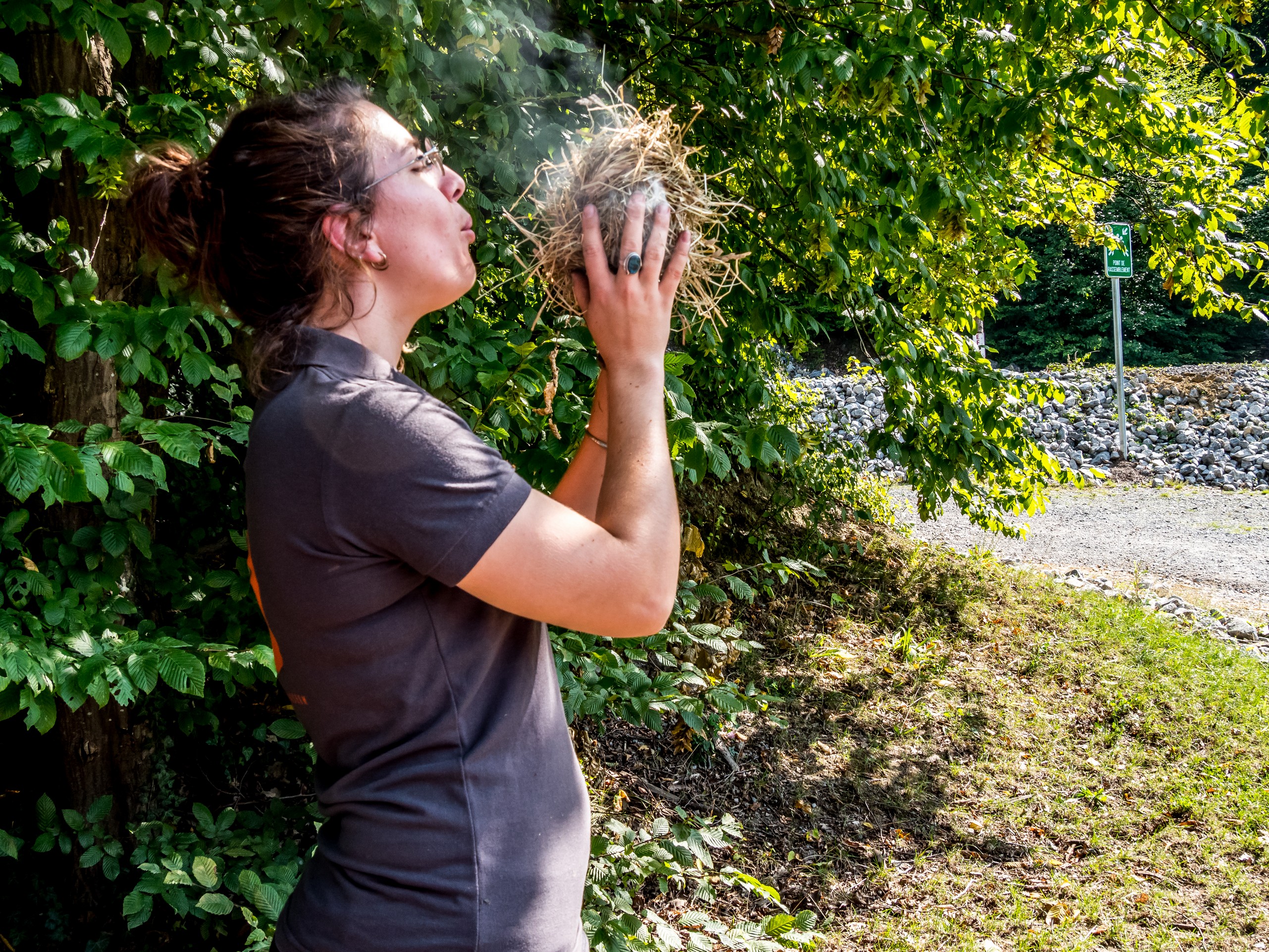 Frotter le silex contre la pyrite pour provoquer des étincelles et allumer des braises. Souffler sur les braises et ventiler jusqu’à ce que le feu prenne. C’est aussi facile que çà. J’ai même été la première à faire prendre mon feu, je suis donc prête pour Koh Lanta. Bien que je ne sois pas sûre qu’on trouve de la pyrite, du champignon et du foin sur le camp des aventuriers !