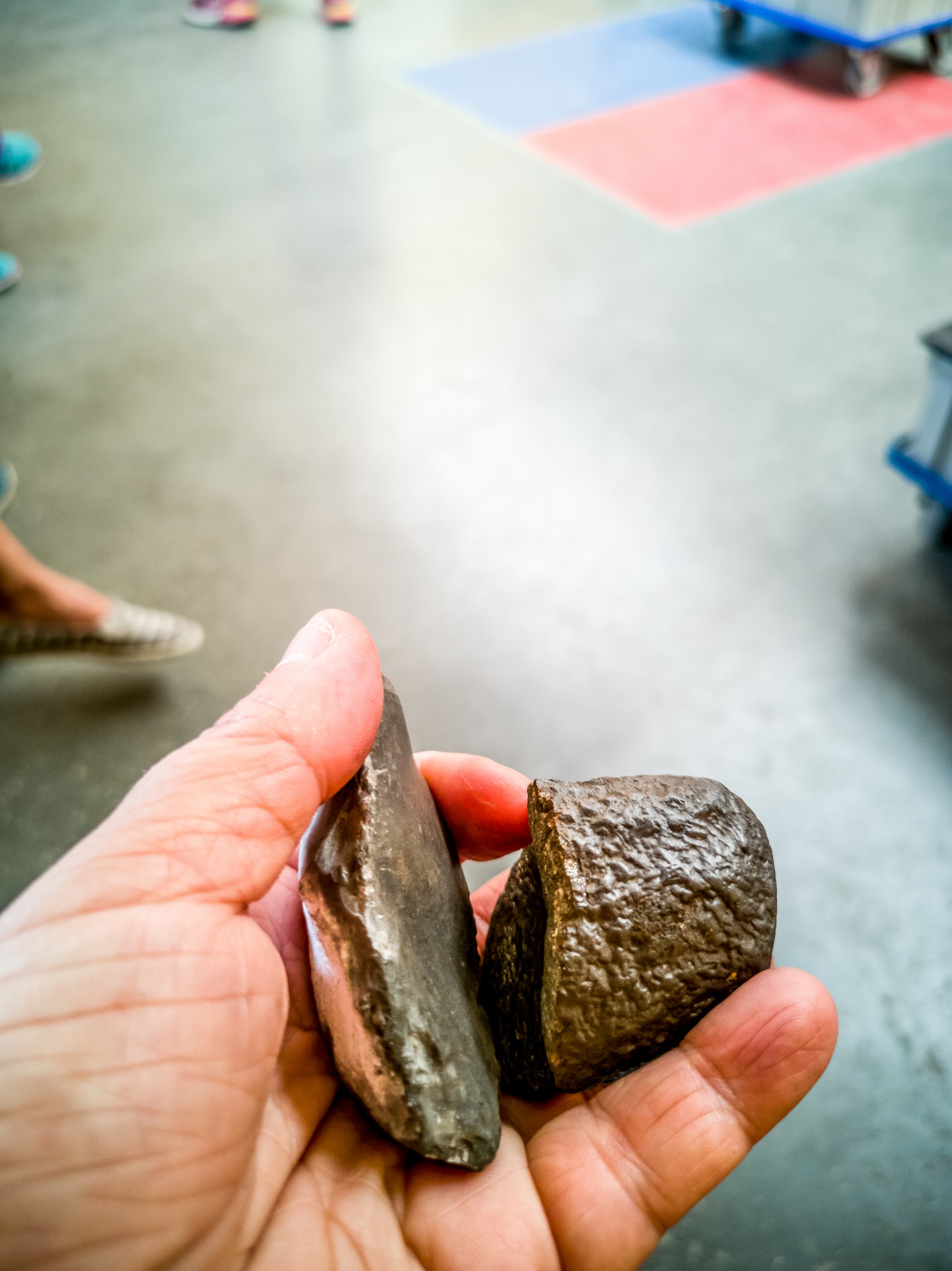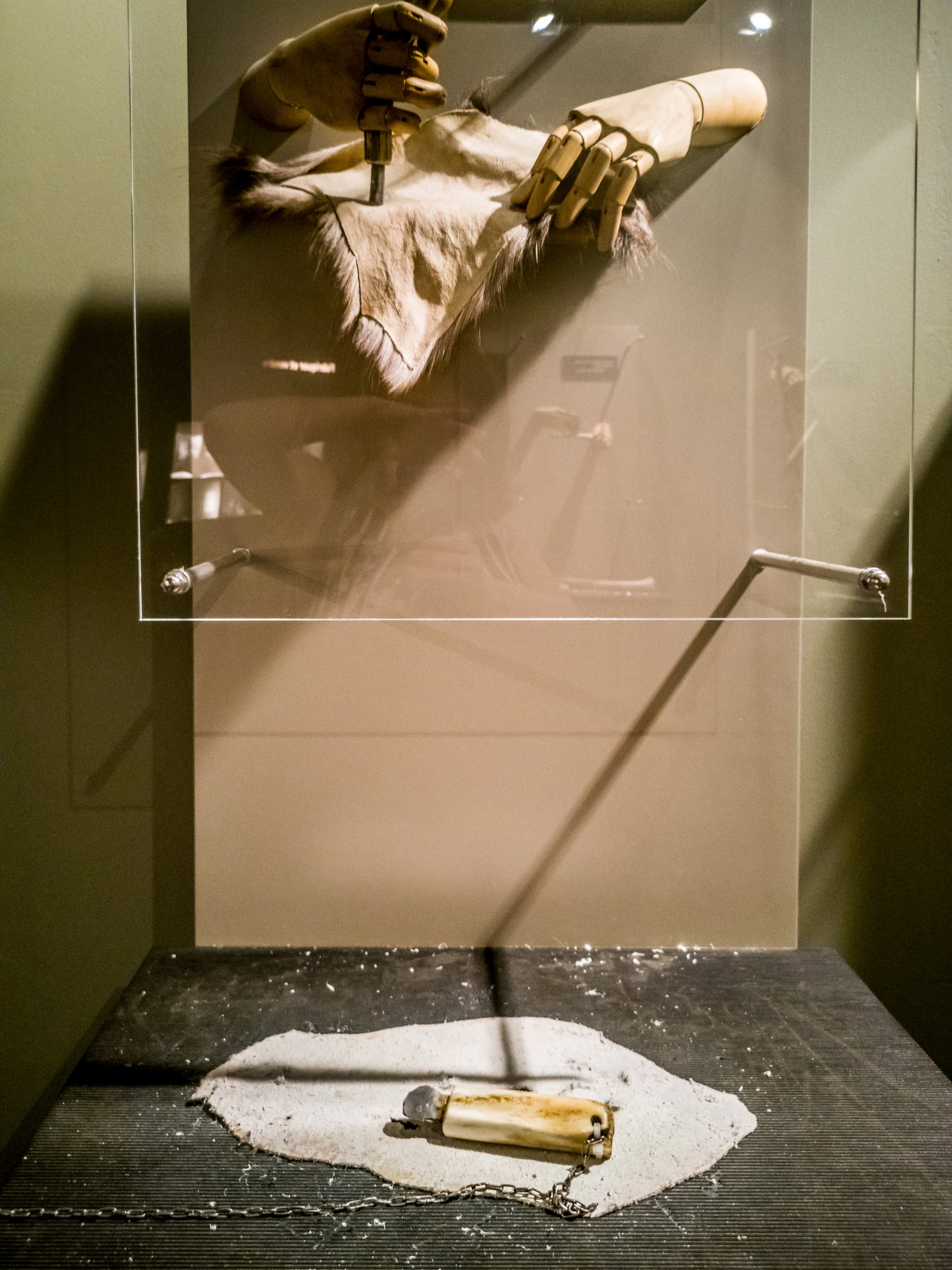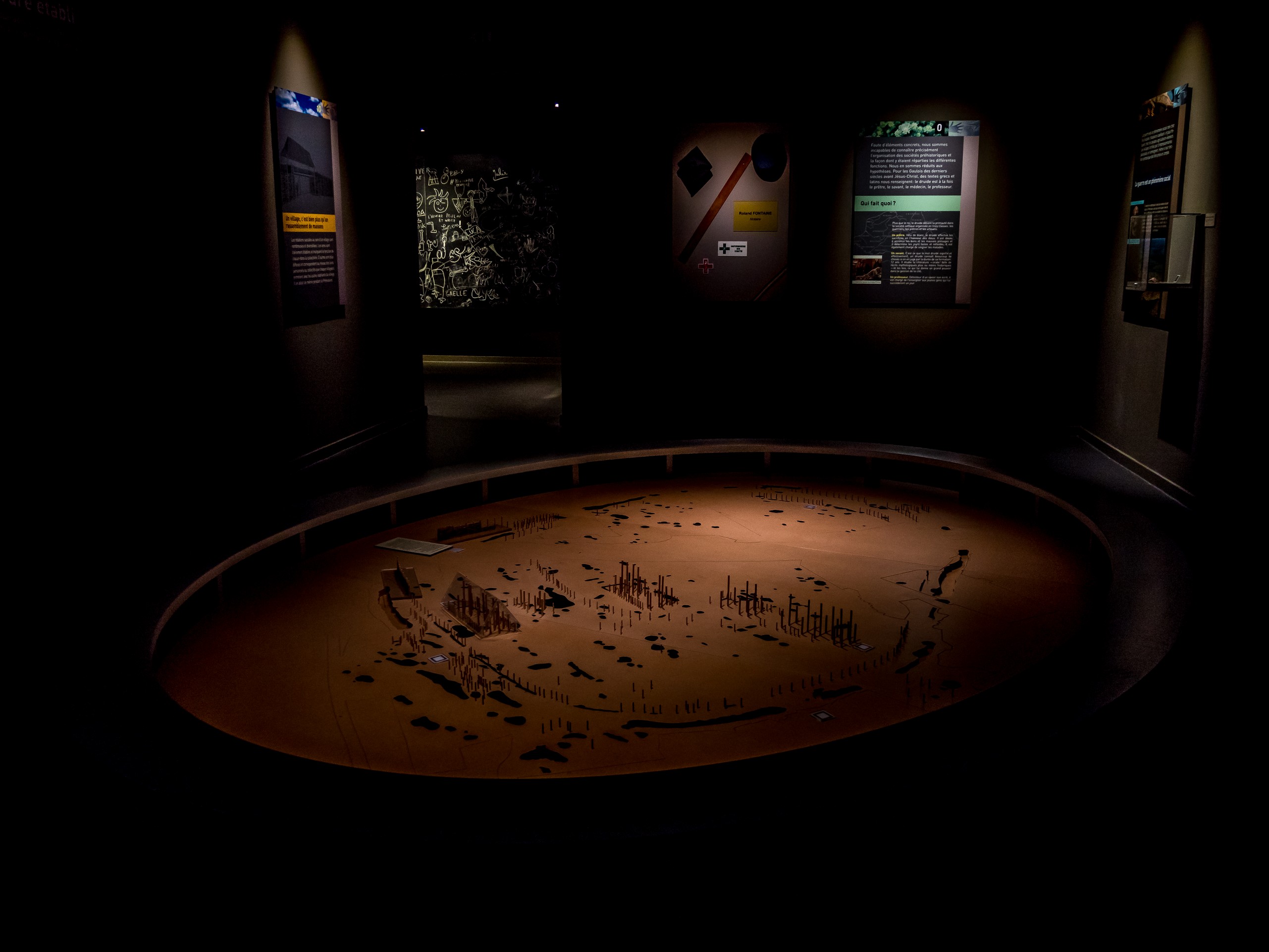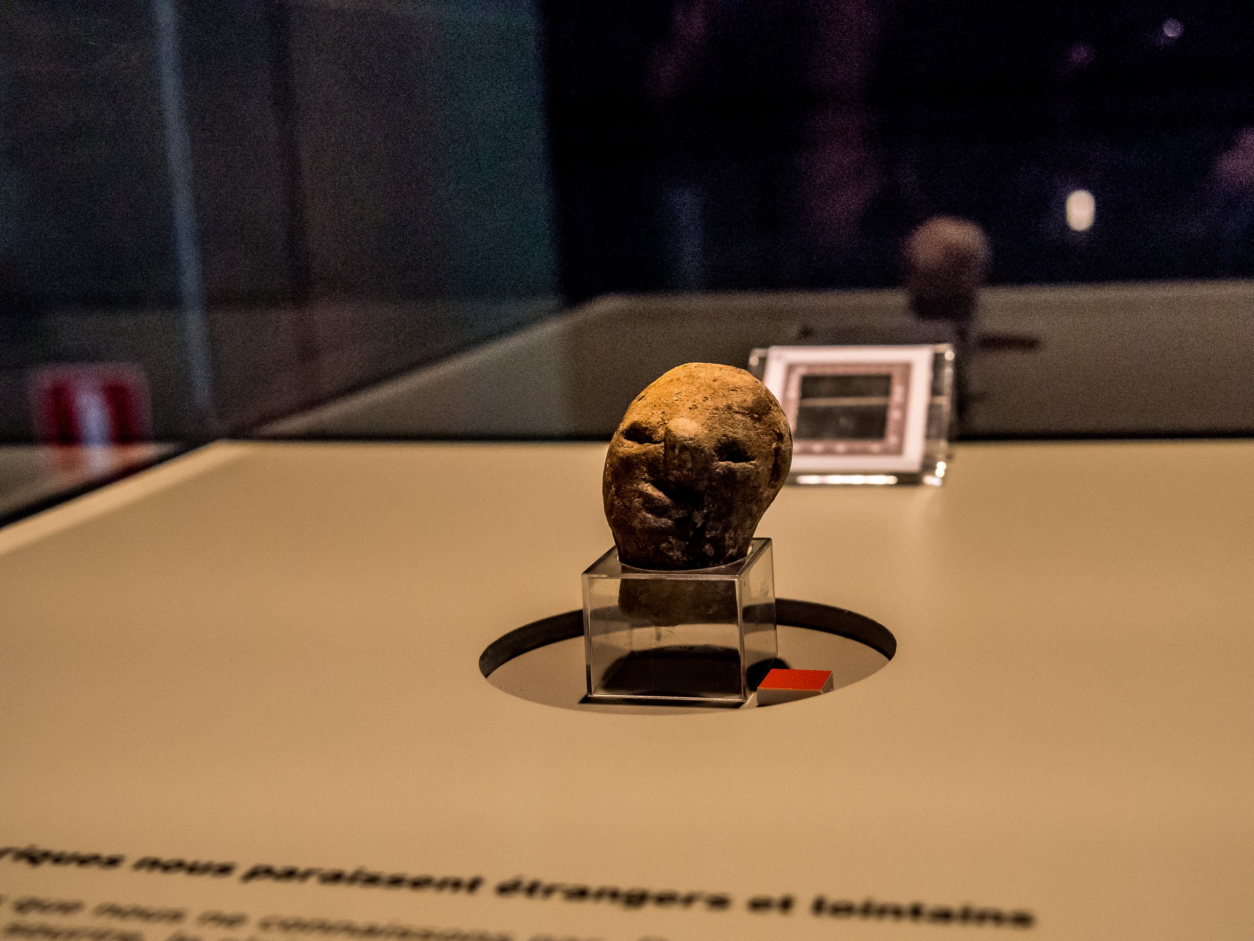 Enfin, il est temps de découvrir le pôle muséal. Après tout, dans Préhistomuséum, il y a… enfin, tu m’as suivie, Lectrice, Lecteur ! Ici aussi, il y a un petit côté ludique. Par exemple, une grande salle dans le centre de recherche explique tous les métiers qui tournent autour d’une fouille archéologique, depuis la découverte jusqu’au processus de conservation dans un musée. Ma collection préhistoire en perspective aide à rapprocher les objets archéologiques des visiteurs contemporains pour qu’on les comprennent mieux : des ossements, des outils, des poteries… tout est mis en contexte. Le clou de la visite reste quand même une petite tête en pierre qui est la représentation humaine la plus ancienne que l’on ai trouvé dans nos contrées. « Voici le premier Wallon » me dit Marie en riant et à bien y regarder, avec l’espèce de demi-sourire que l’on devine sur cette drôle de petite tête, on se dit que la réputation de bonhomie proverbiale des habitants de la région ne date pas d’hier.