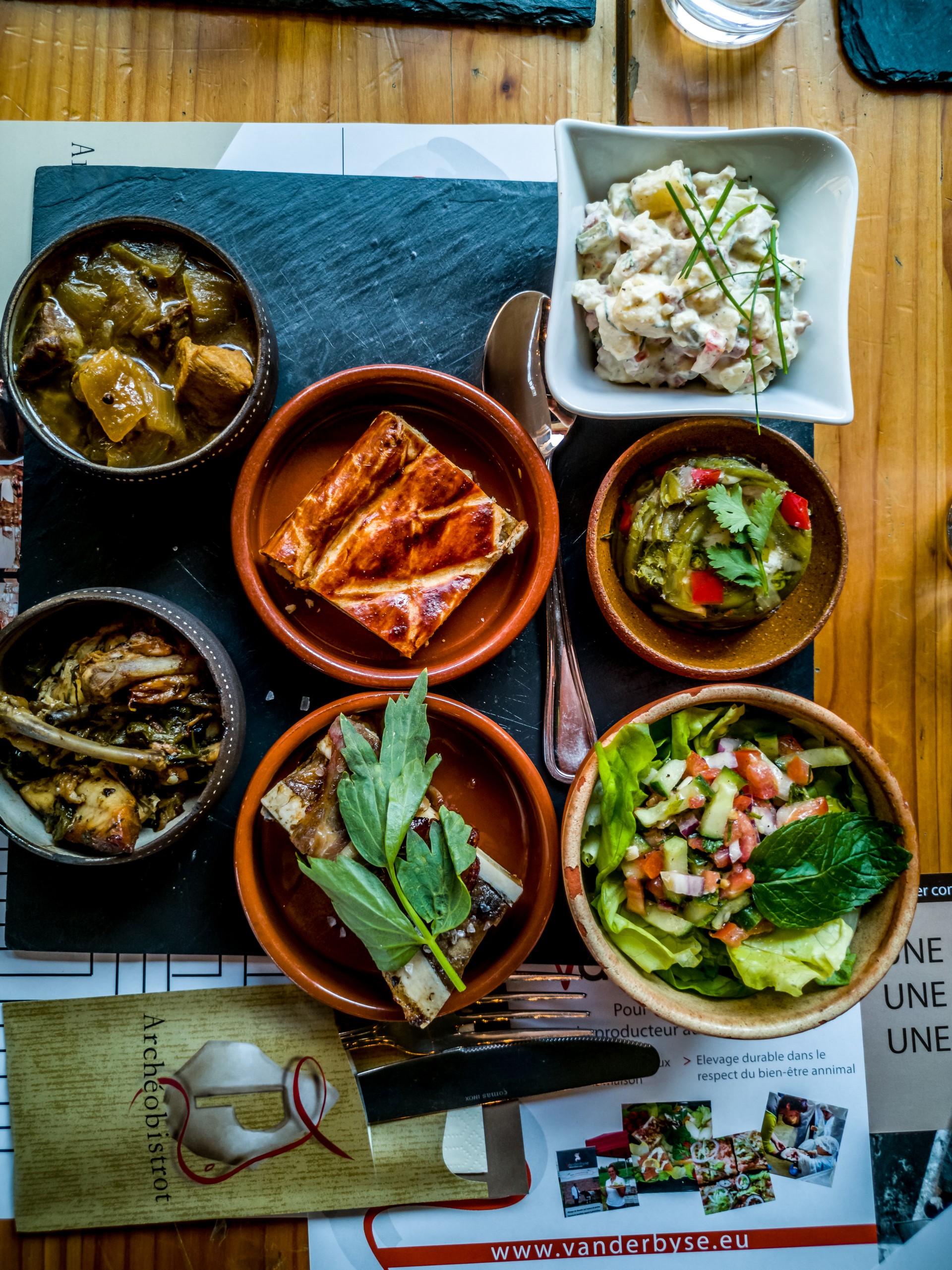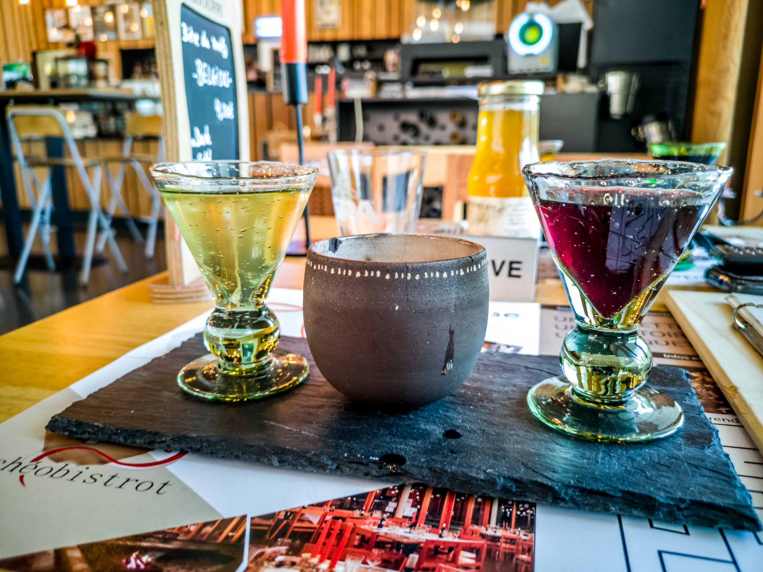 C’est au bistro (il est quasi midi) que Marie vient me rejoindre. Je vais vite me laisser contaminer par son dynamisme et sa passion du métier. Elle travaille sur le site depuis longtemps, en connaît tout les recoins et c’est autour d’un bon repas qu’elle va me faire le topo du musée. Le bistrot fait d’ailleurs lui aussi partie de l’expérience et on est loin d’un esprit « cafète » ici. Le lieu est inondé de lumière grâce a de grandes baies vitrées, couvert de bois, à la scandinave, et ses luminaires lui donnent un petit côté branché bien sympathique. Côté menu, on y retrouve des classiques de la restauration (n’oublions pas non plus qu’une grande partie des visiteurs sont des enfants, il faut donc les contenter) mais les plus aventureux choisiront le menu qui vous fait voyager à travers le temps grâce aux papilles : de la préhistoire à l’époque de la « codification » de la cuisine française et ça commence dès l’apéritif qui est composé d’un hydromel, d’hipocras et d’un alcool léger à base de sauge. Ça démarre fort mais ce ne sera rien comparé au plateau qui arrive ! Les différents plats, présentés en format « tapas », incarnent une période de l’humanité dans nos régions : un os à moelle pour la préhistoire, une recette de poulet trouvé dans un livre de cuisine qui date du règne de l’empereur Tibère, un porc sucré-salé cher au Moyen-Âge, une tourte typique de la Renaissance et enfin, un aspic de poisson pour signifier la naissance et l’élévation de la gastronomie française. Un dessert, une tarte aux pommes, est aussi prévue dans le menu mais je dois dire qu’après tous ces petits plats, j’étais repue et n’ai pas eu la force d’en manger un morceau.