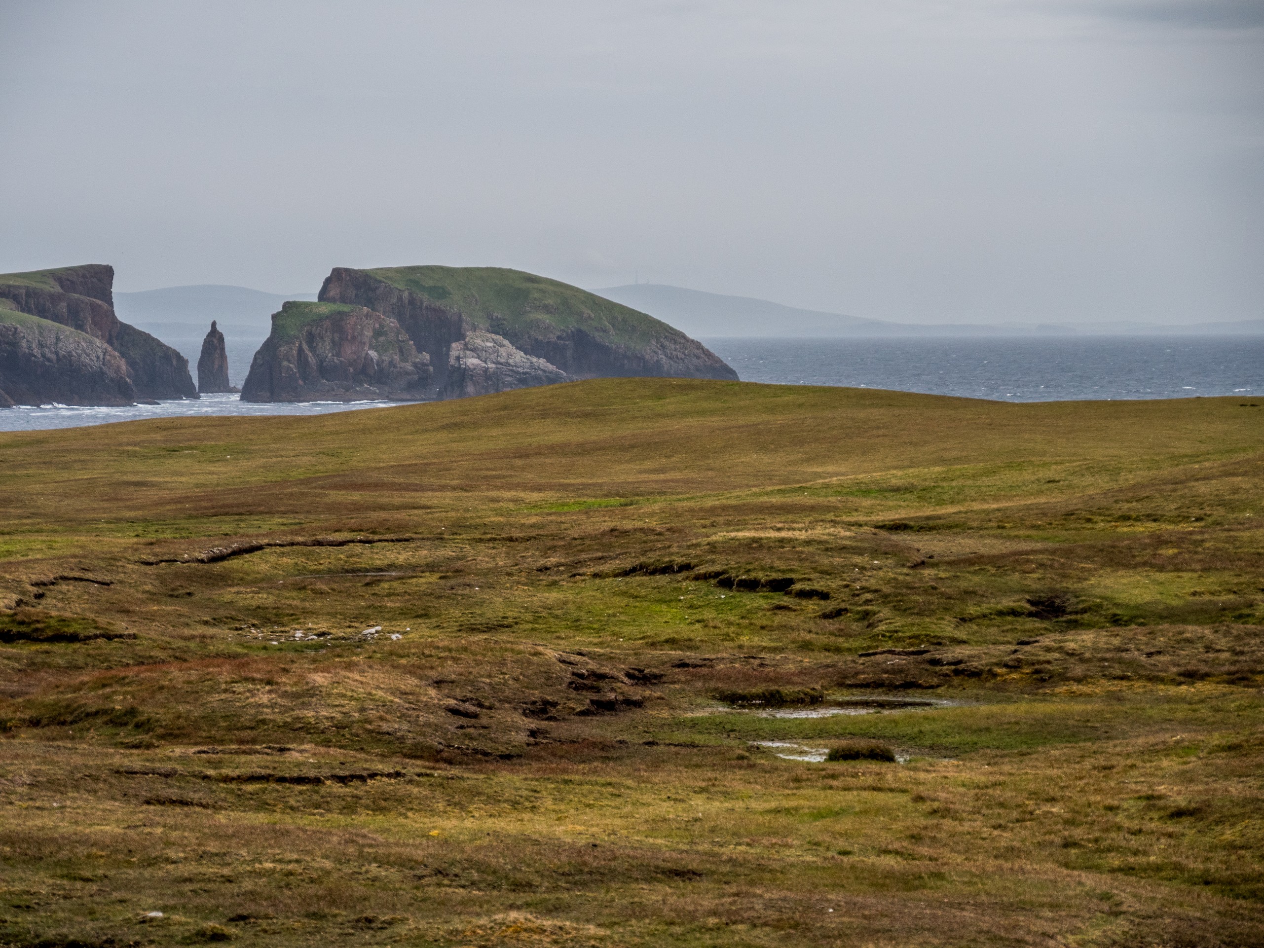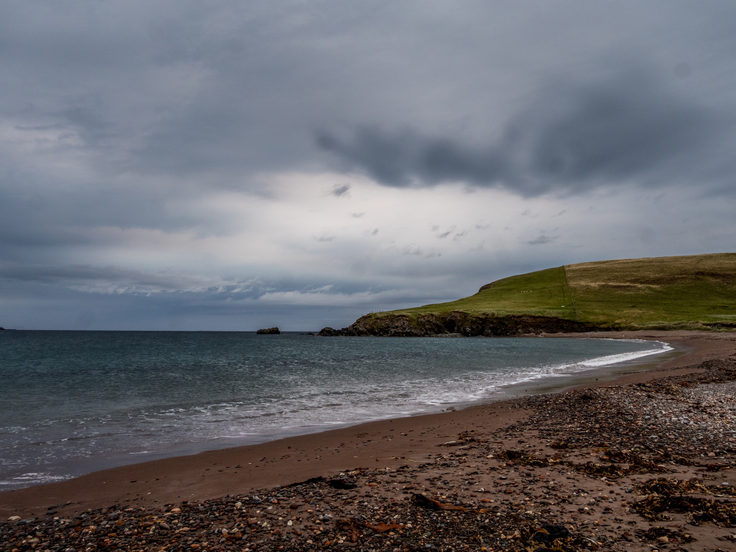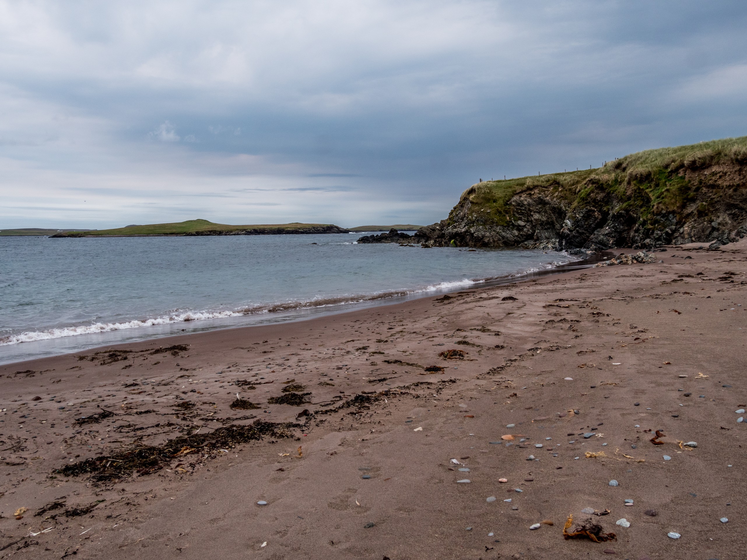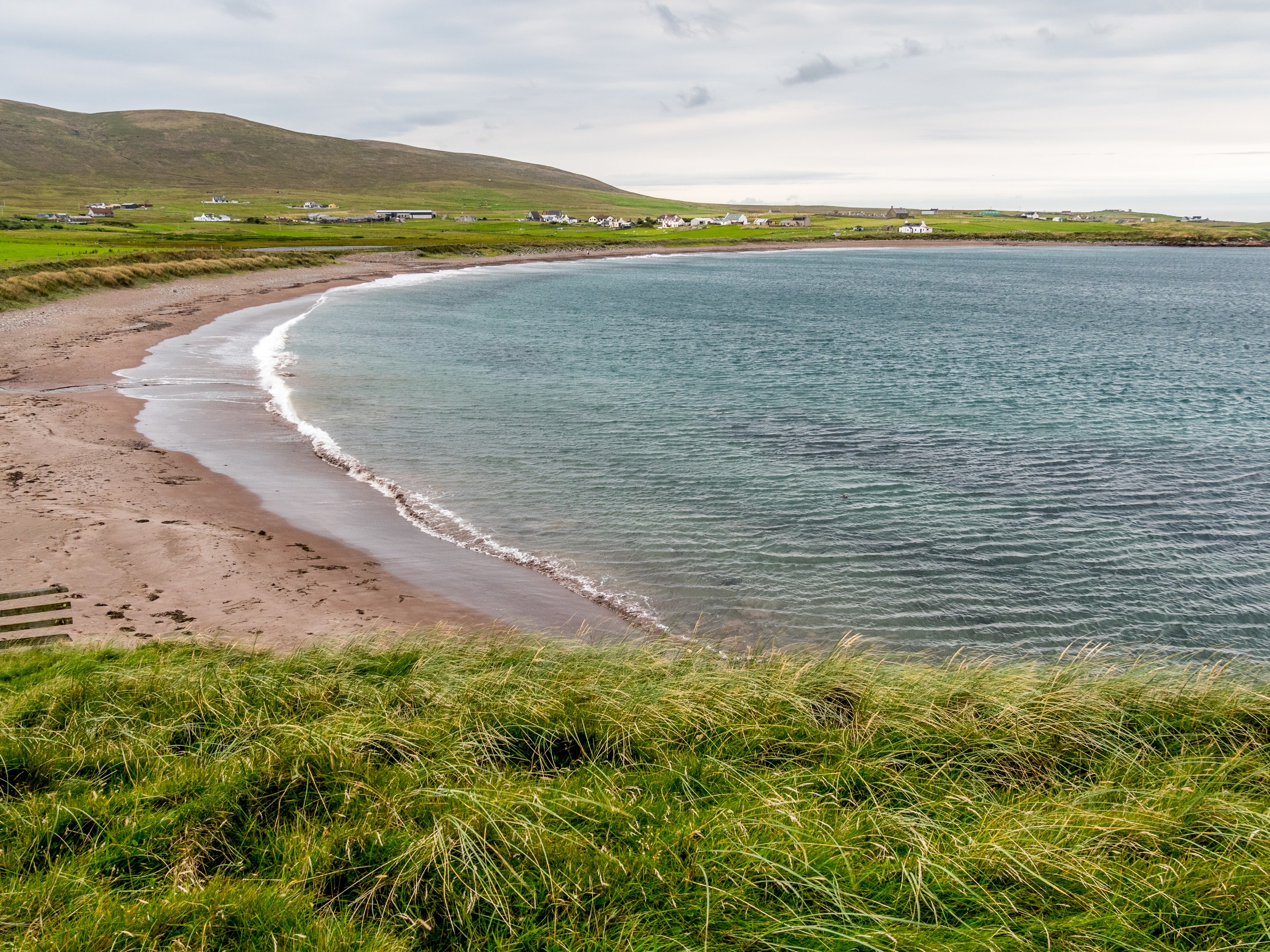 Nous continuons de nous enfoncer dans West Mainland. Pas très loin de Sandness, on trouve la plage de Melby Beach, qui fut l’une de mes préférées. Pourquoi ? Parce qu’elle est différente ! Fini le sable clair, blanc ou blond que nous avions vu jusqu’ici. Ici, le sable a la couleur du cuir ou du caramel. Cette belle plage fermée par une falaise à sa droite, exposée à l’Atlantique, est parsemée de petits rochers et de bois flotté. C’est donc une plage sauvage ! Il y a toute une « costal walk » dans le secteur mais nous avons opté pour marcher tout en haut de la falaise et là, j’ai un choc esthétique : le brun chaud du sable, les nuances de l’eau qui allaient du bleu-vert, au bleu pétrole en passant par le bleu marine, les nuances du vert foncé de la lande avec le vert plus tendre des prairies forment un ensemble qui ravit l’œil (d’ailleurs, j’ai décidé de rhabiller quand mon salon, quand je le pourrais, avec ces tons-là). Et les phoques sont même venus nous dire bonjour !