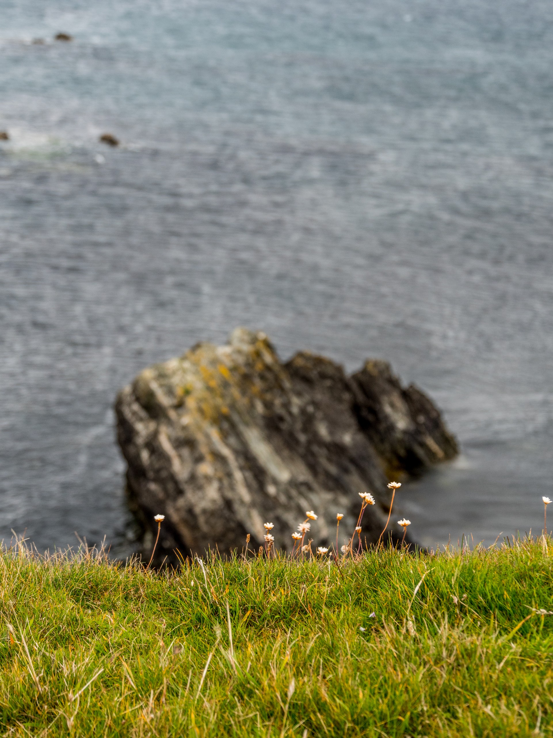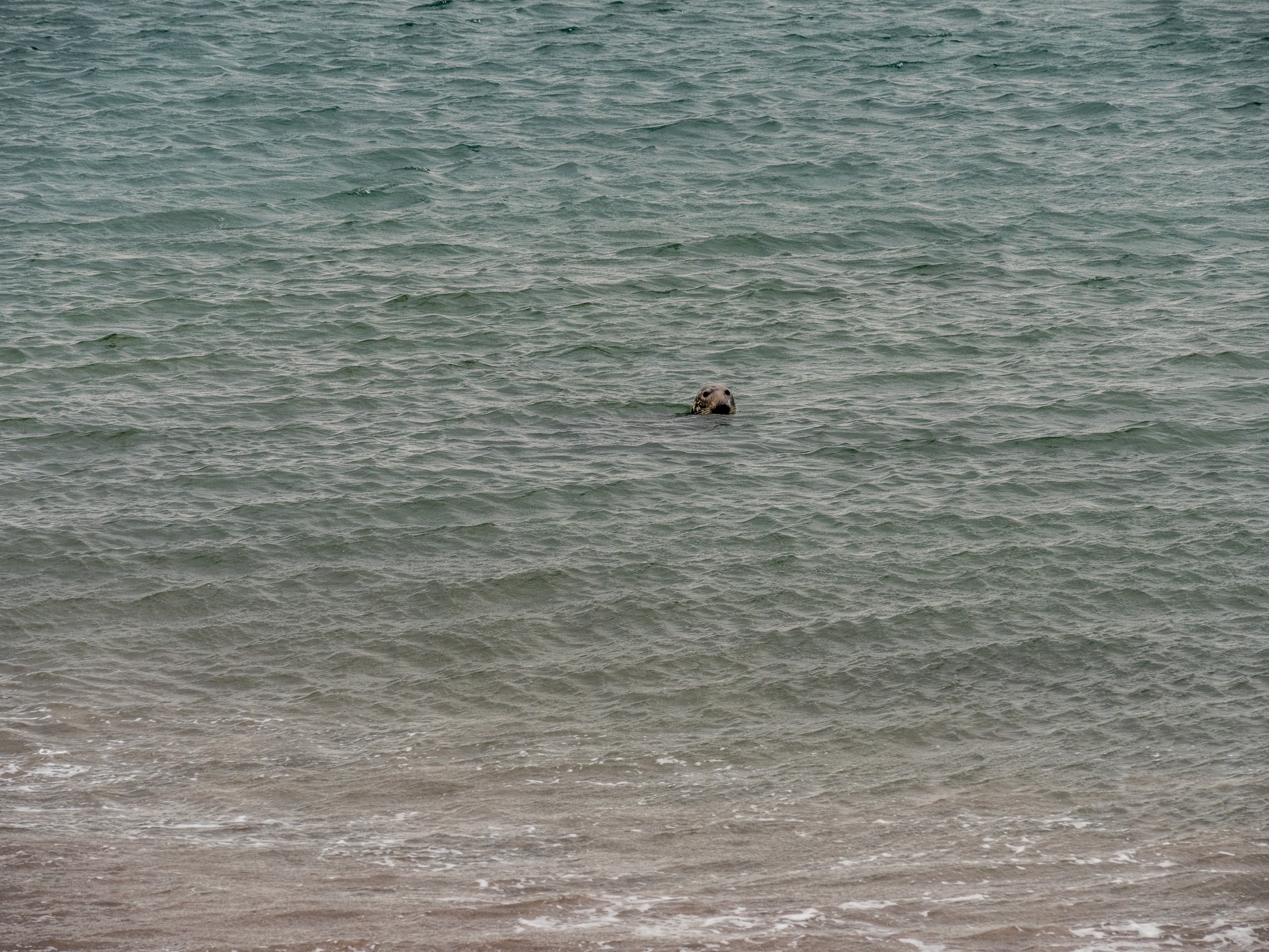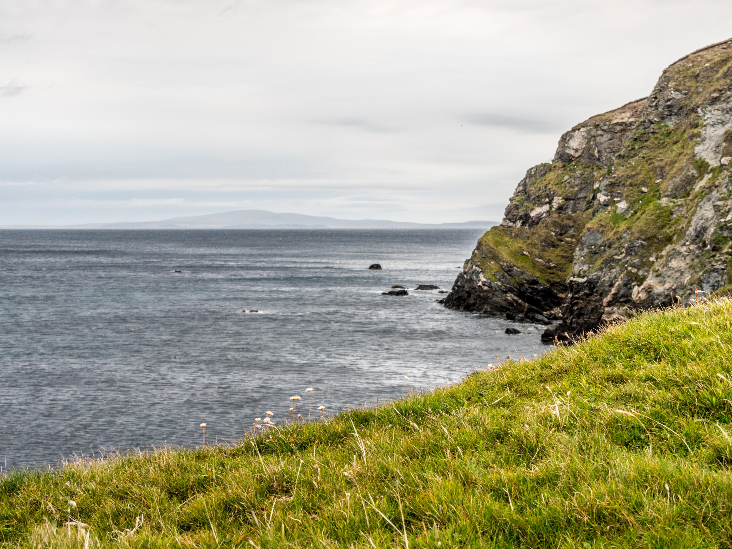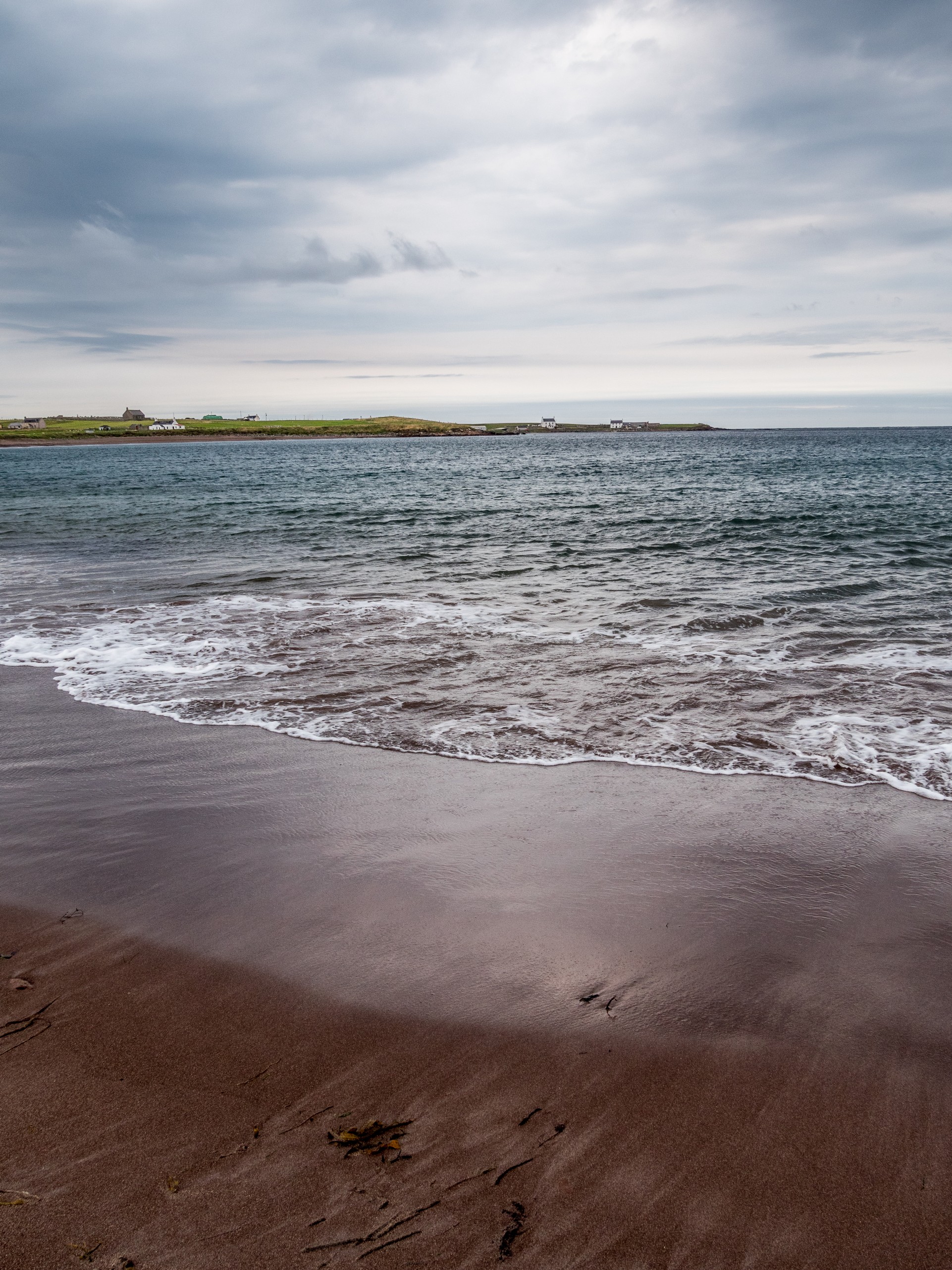 Nous continuons de nous enfoncer dans West Mainland. Pas très loin de Sandness, on trouve la plage de Melby Beach, qui fut l’une de mes préférées. Pourquoi ? Parce qu’elle est différente ! Fini le sable clair, blanc ou blond que nous avions vu jusqu’ici. Ici, le sable a la couleur du cuir ou du caramel. Cette belle plage fermée par une falaise à sa droite, exposée à l’Atlantique, est parsemée de petits rochers et de bois flotté. C’est donc une plage sauvage ! Il y a toute une « costal walk » dans le secteur mais nous avons opté pour marcher tout en haut de la falaise et là, j’ai un choc esthétique : le brun chaud du sable, les nuances de l’eau qui allaient du bleu-vert, au bleu pétrole en passant par le bleu marine, les nuances du vert foncé de la lande avec le vert plus tendre des prairies forment un ensemble qui ravit l’œil (d’ailleurs, j’ai décidé de rhabiller quand mon salon, quand je le pourrais, avec ces tons-là). Et les phoques sont même venus nous dire bonjour !