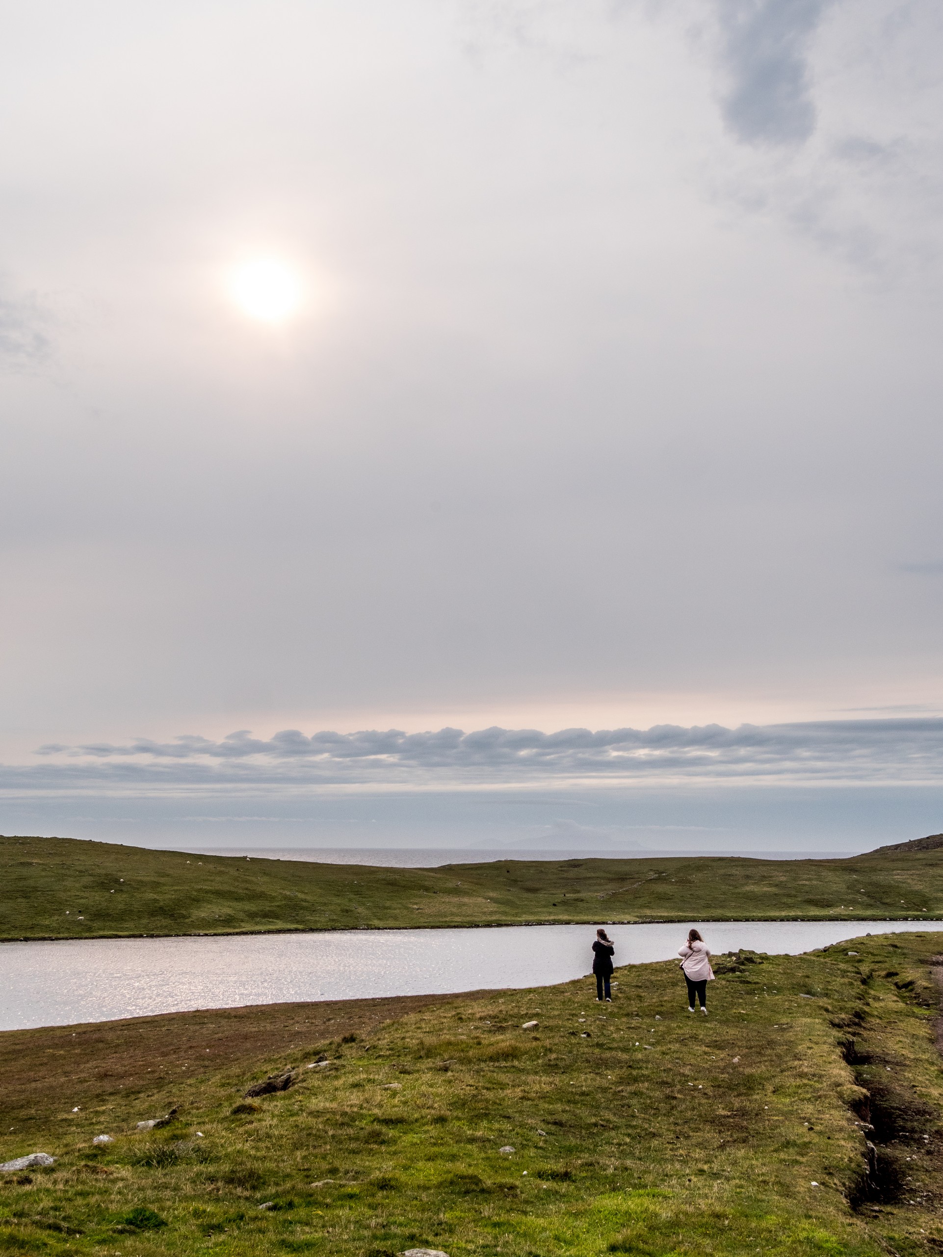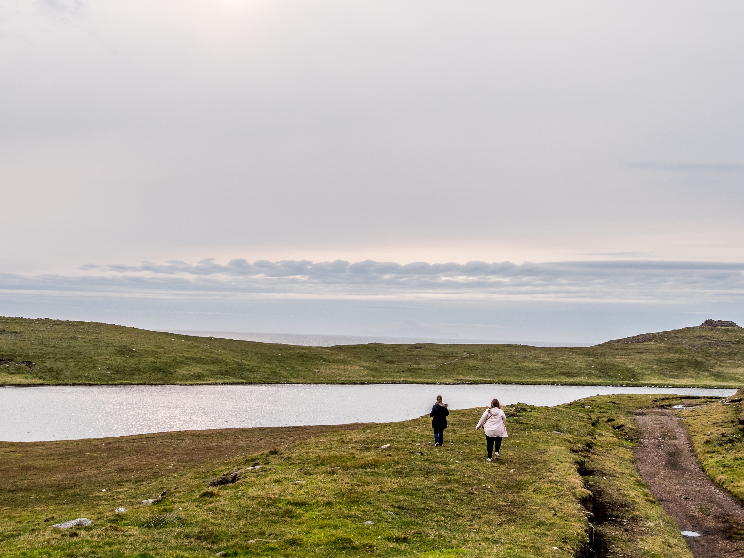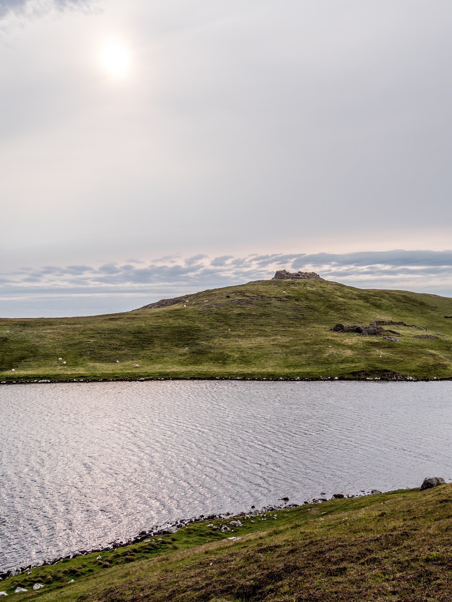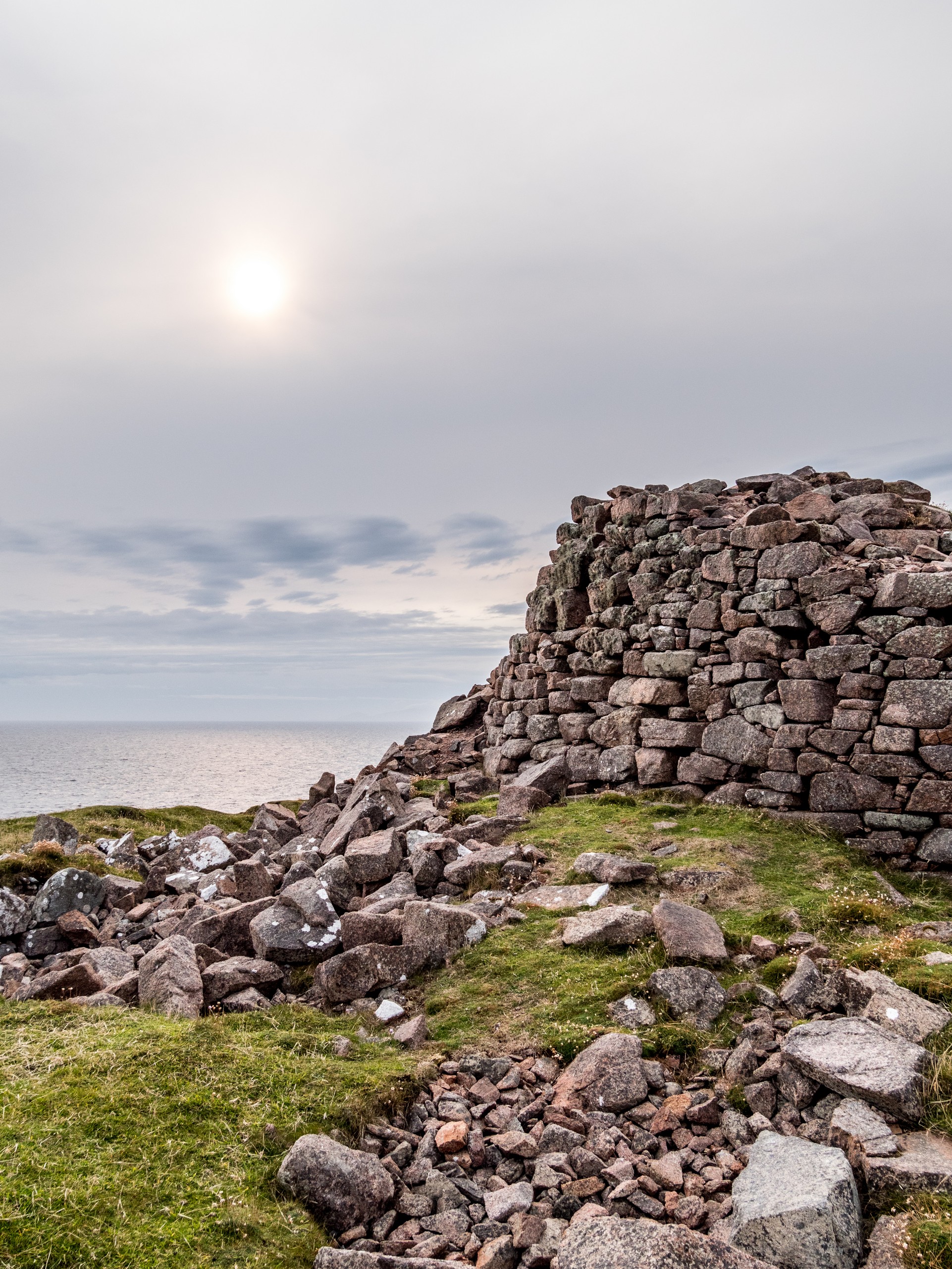 Lorsqu’on arrive au bout de la route, dans un paysage désolé, le mot « seules au monde » n’est pas de trop. Avec ce ciel lourd, un vent qui souffle allègrement et un paysage sévère, on a envie de se laisser aller à de grands élans de l’âme. Le sentiment d’abandon est encore renforcé lorsque l’on passe à côté de ruines de fermes. La vallée était habitée. Autrefois. Le sentier qui longue le broch est rempli de tourbe que l’on voit creusée sur plus d’un mètre. Au fur et à mesure de la balade, nous commençons à remonter doucement. Le paysage au-delà de la vallée se dévoile et le ciel aussi. Le soleil fait de son mieux pour sortir et c’est un globe pâle qui transperce des nuages devenus nacrés. Sur le loch, ses reflets apparaissent rose pâle. J’ai l’impression d’être dans un rêve étrange, à parcourir des limbes sans fin où le temps n’existe plus. L’impression est brisée lorsque nous traversons un passage en pierre qui ferme le loch. Une belle colline s’élève devant nous ; devant les ruines blanches d’une ancienne ferme, en haut, les restes circulaires du broch. On démarre la grimpette et au fur et à mesure, le paysage caché par la colline se révèle : c’est l’océan, tourmenté, qui s’offre à nous yeux. Une côte découpée, battue par les vents et la force des vagues dont le grondement nous parvient jusque-là. C’est spectaculaire et tellement prenant… Le genre de moment qui te fait sentir vivant.e. Du broc, il ne reste quasi rien Juste quelques étages de pierre de granit rose, une drôle de couleur dans un paysage aux couleurs sombres et sobres, qui répond comme un écho au soleil qui se mire dans l’océan, là très, très loin ver le Groenland.