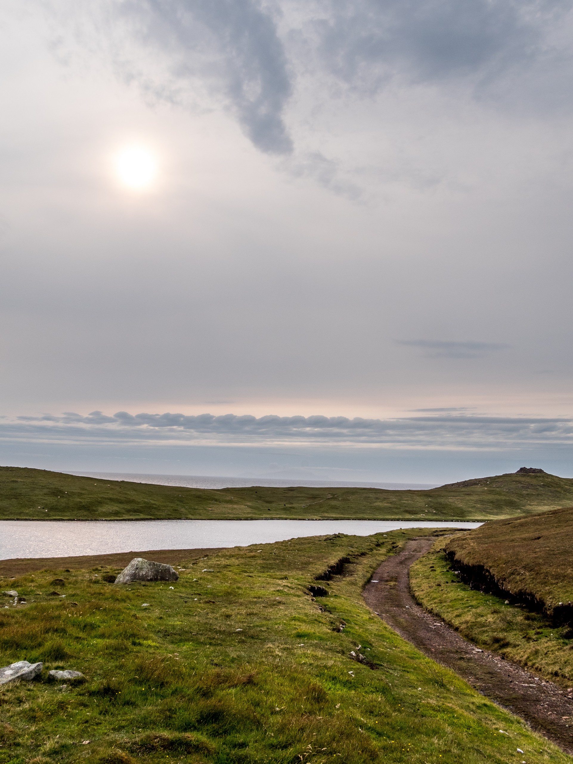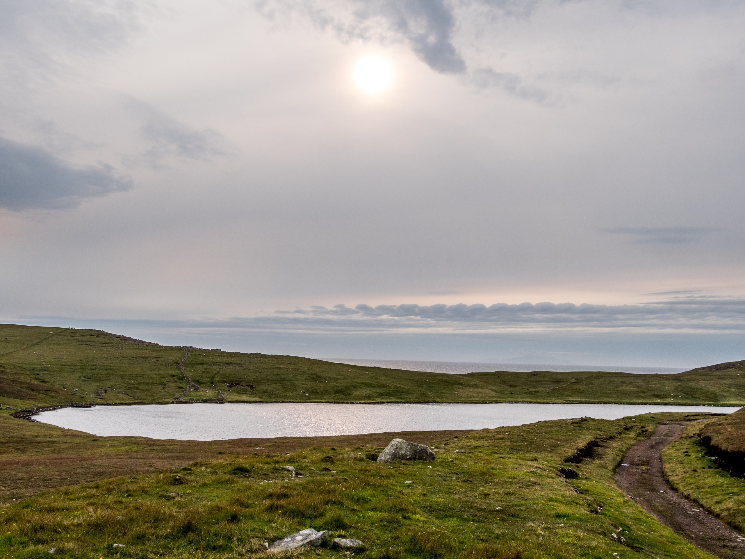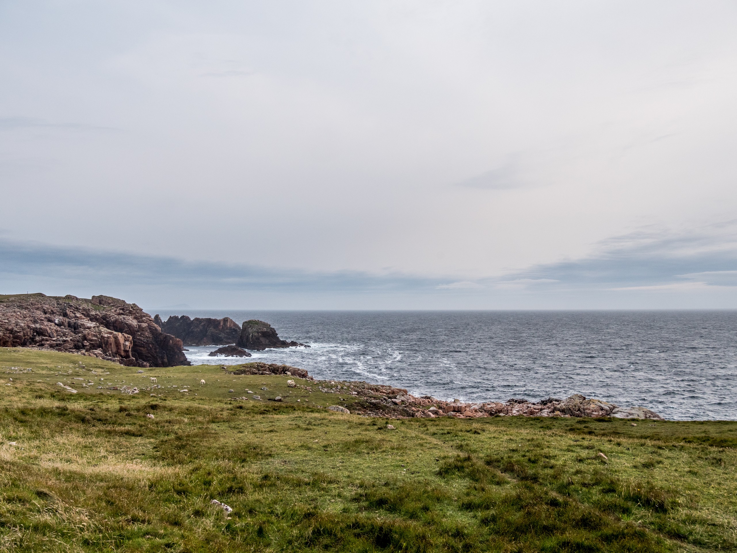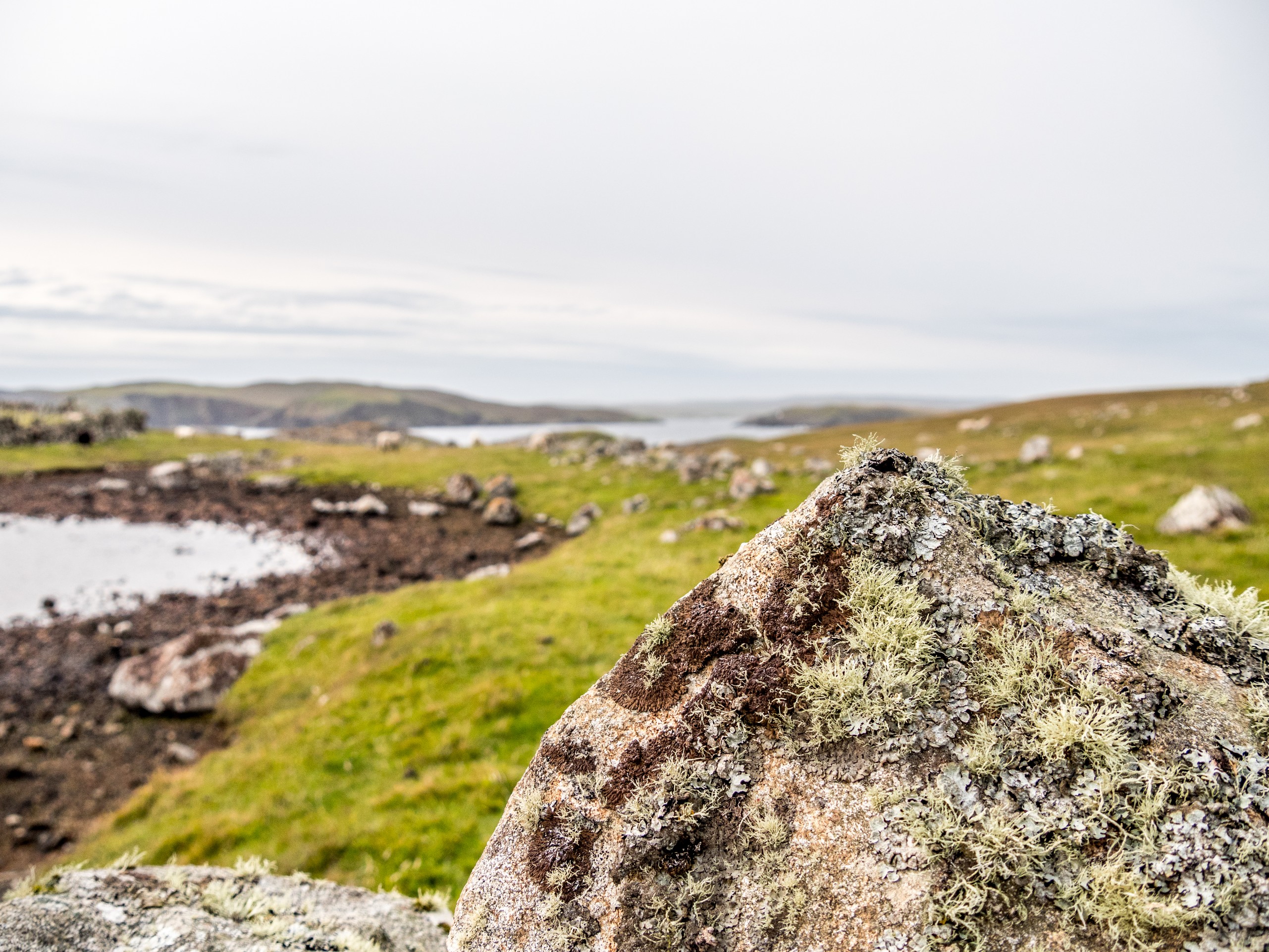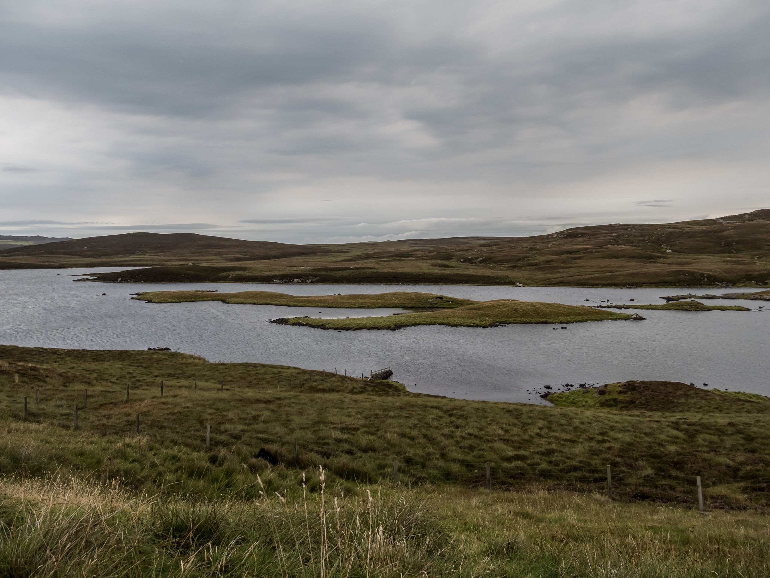Lorsqu’on arrive au bout de la route, dans un paysage désolé, le mot « seules au monde » n’est pas de trop. Avec ce ciel lourd, un vent qui souffle allègrement et un paysage sévère, on a envie de se laisser aller à de grands élans de l’âme. Le sentiment d’abandon est encore renforcé lorsque l’on passe à côté de ruines de fermes. La vallée était habitée. Autrefois. Le sentier qui longue le broch est rempli de tourbe que l’on voit creusée sur plus d’un mètre. Au fur et à mesure de la balade, nous commençons à remonter doucement. Le paysage au-delà de la vallée se dévoile et le ciel aussi. Le soleil fait de son mieux pour sortir et c’est un globe pâle qui transperce des nuages devenus nacrés. Sur le loch, ses reflets apparaissent rose pâle. J’ai l’impression d’être dans un rêve étrange, à parcourir des limbes sans fin où le temps n’existe plus. L’impression est brisée lorsque nous traversons un passage en pierre qui ferme le loch. Une belle colline s’élève devant nous ; devant les ruines blanches d’une ancienne ferme, en haut, les restes circulaires du broch. On démarre la grimpette et au fur et à mesure, le paysage caché par la colline se révèle : c’est l’océan, tourmenté, qui s’offre à nous yeux. Une côte découpée, battue par les vents et la force des vagues dont le grondement nous parvient jusque-là. C’est spectaculaire et tellement prenant… Le genre de moment qui te fait sentir vivant.e. Du broc, il ne reste quasi rien Juste quelques étages de pierre de granit rose, une drôle de couleur dans un paysage aux couleurs sombres et sobres, qui répond comme un écho au soleil qui se mire dans l’océan, là très, très loin ver le Groenland.