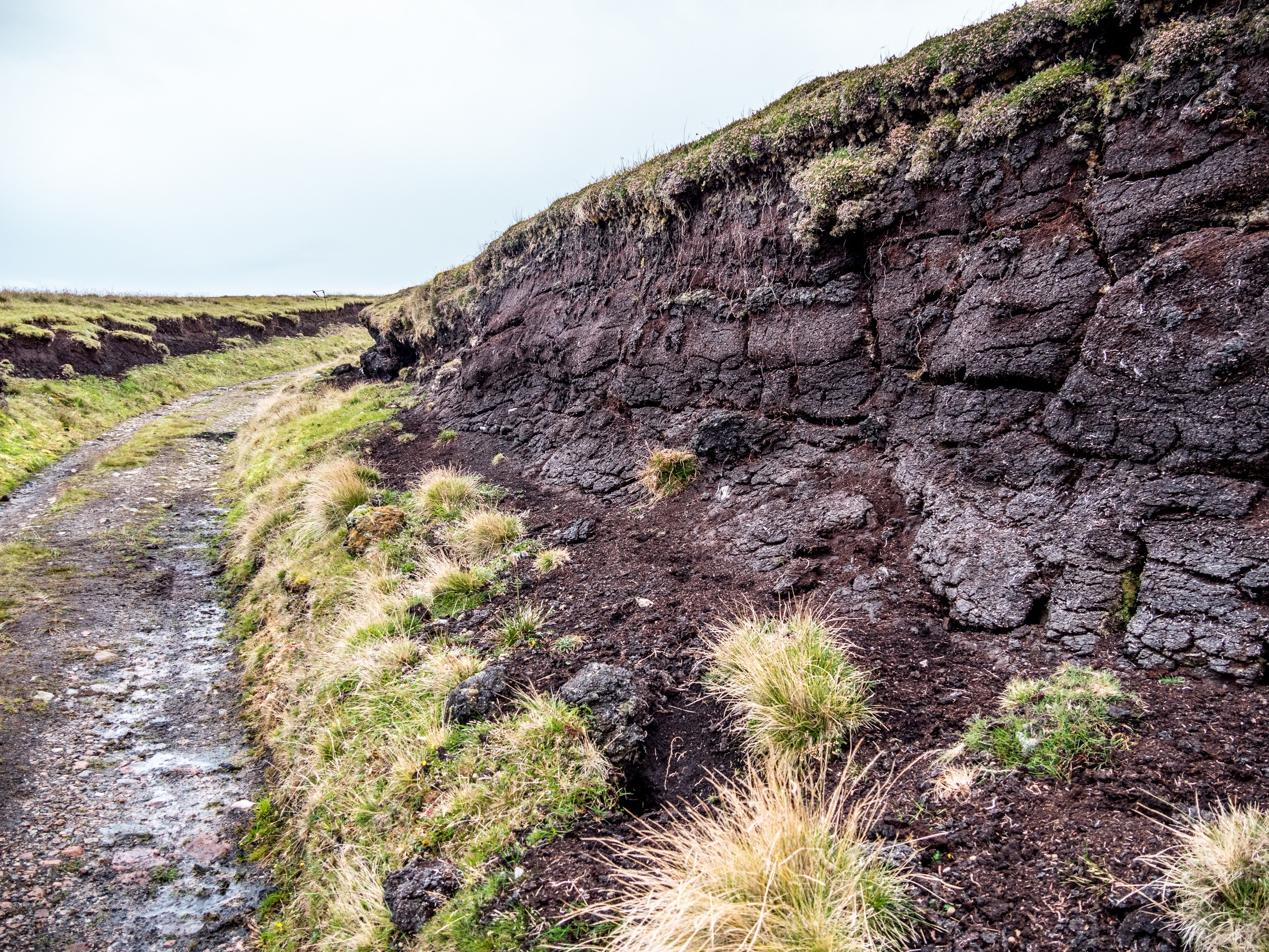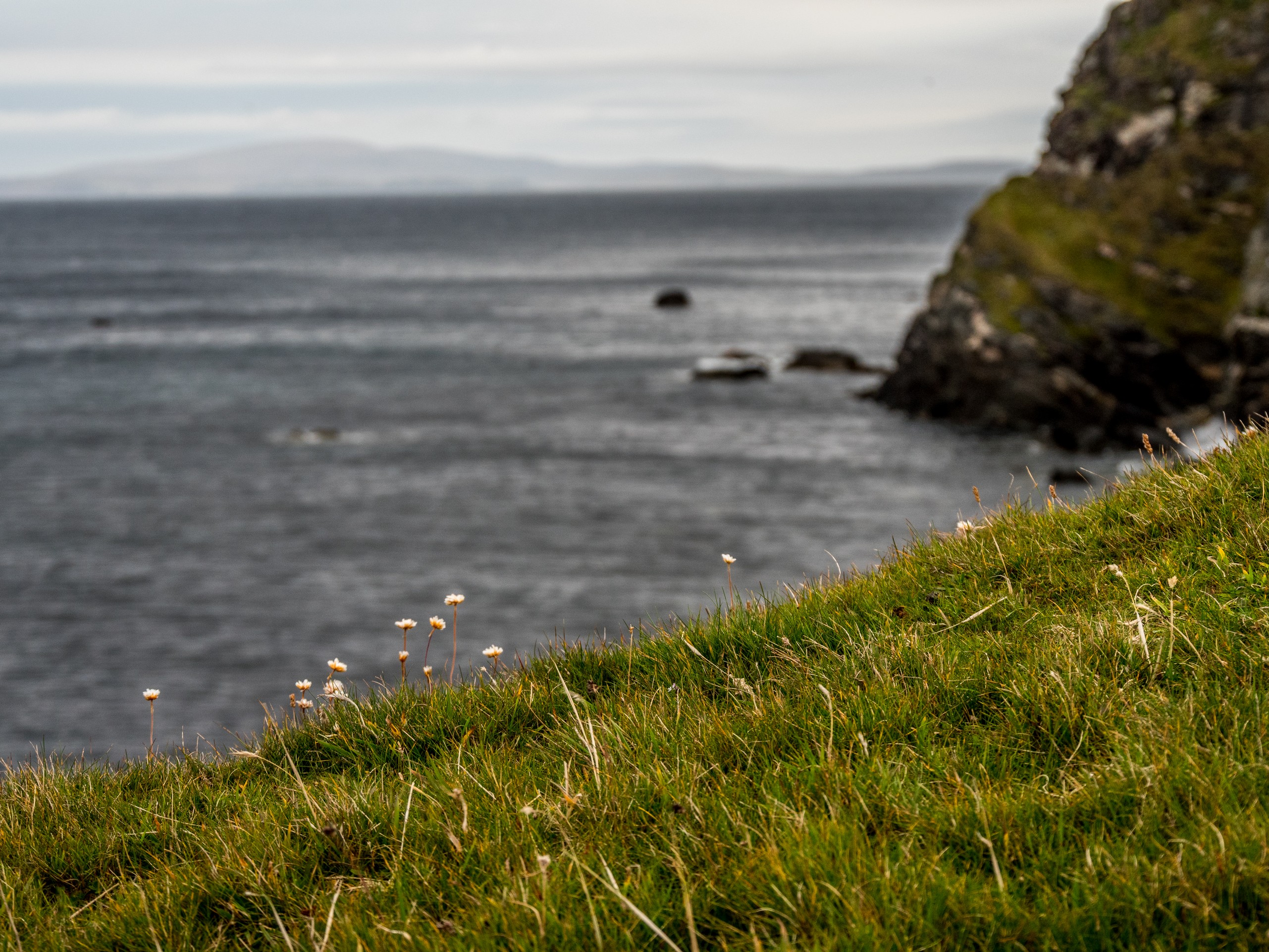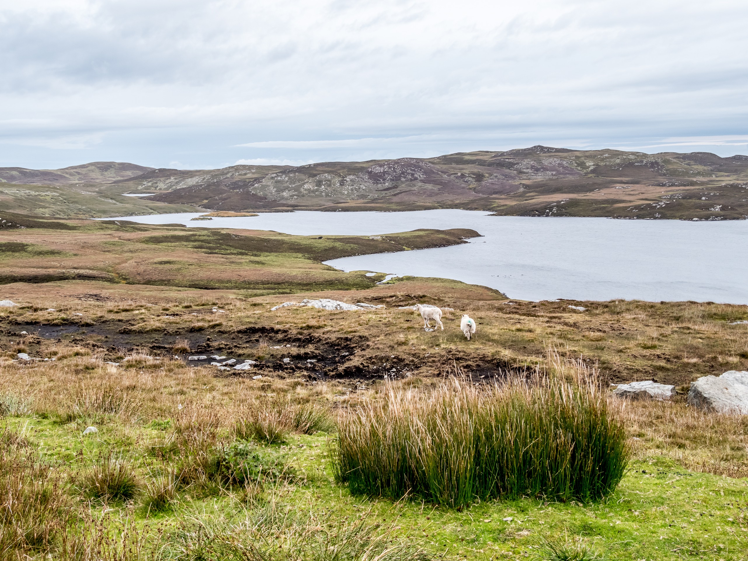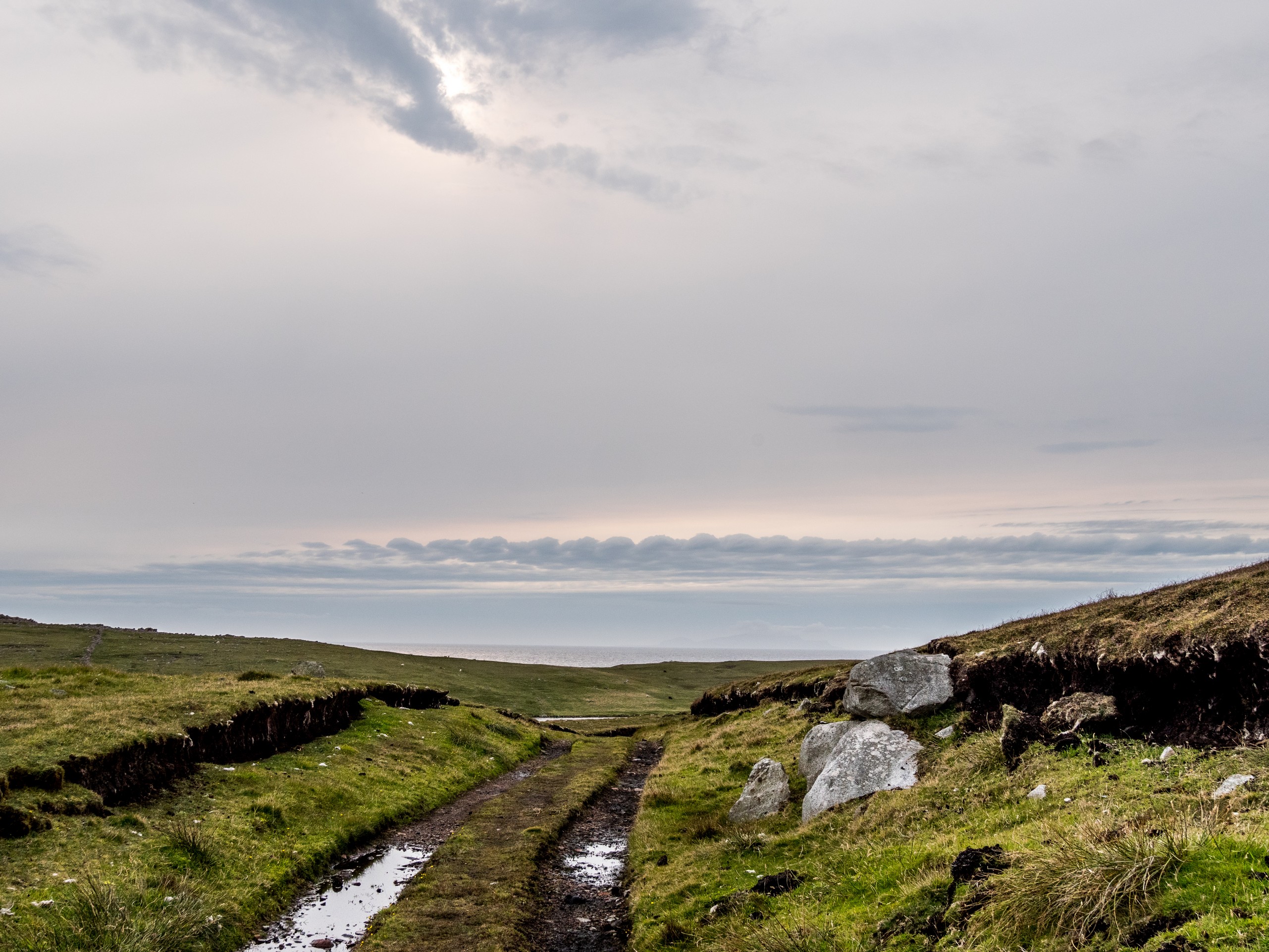 Lorsqu’on arrive au bout de la route, dans un paysage désolé, le mot « seules au monde » n’est pas de trop. Avec ce ciel lourd, un vent qui souffle allègrement et un paysage sévère, on a envie de se laisser aller à de grands élans de l’âme. Le sentiment d’abandon est encore renforcé lorsque l’on passe à côté de ruines de fermes. La vallée était habitée. Autrefois. Le sentier qui longue le broch est rempli de tourbe que l’on voit creusée sur plus d’un mètre. Au fur et à mesure de la balade, nous commençons à remonter doucement. Le paysage au-delà de la vallée se dévoile et le ciel aussi. Le soleil fait de son mieux pour sortir et c’est un globe pâle qui transperce des nuages devenus nacrés. Sur le loch, ses reflets apparaissent rose pâle. J’ai l’impression d’être dans un rêve étrange, à parcourir des limbes sans fin où le temps n’existe plus. L’impression est brisée lorsque nous traversons un passage en pierre qui ferme le loch. Une belle colline s’élève devant nous ; devant les ruines blanches d’une ancienne ferme, en haut, les restes circulaires du broch. On démarre la grimpette et au fur et à mesure, le paysage caché par la colline se révèle : c’est l’océan, tourmenté, qui s’offre à nous yeux. Une côte découpée, battue par les vents et la force des vagues dont le grondement nous parvient jusque-là. C’est spectaculaire et tellement prenant… Le genre de moment qui te fait sentir vivant.e. Du broc, il ne reste quasi rien Juste quelques étages de pierre de granit rose, une drôle de couleur dans un paysage aux couleurs sombres et sobres, qui répond comme un écho au soleil qui se mire dans l’océan, là très, très loin ver le Groenland.
