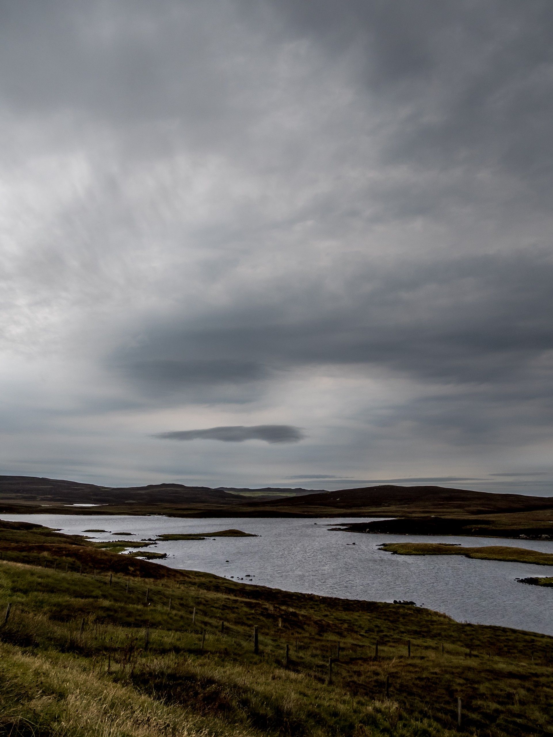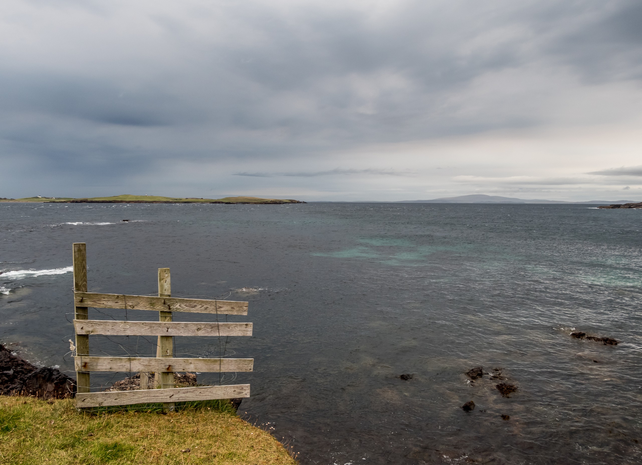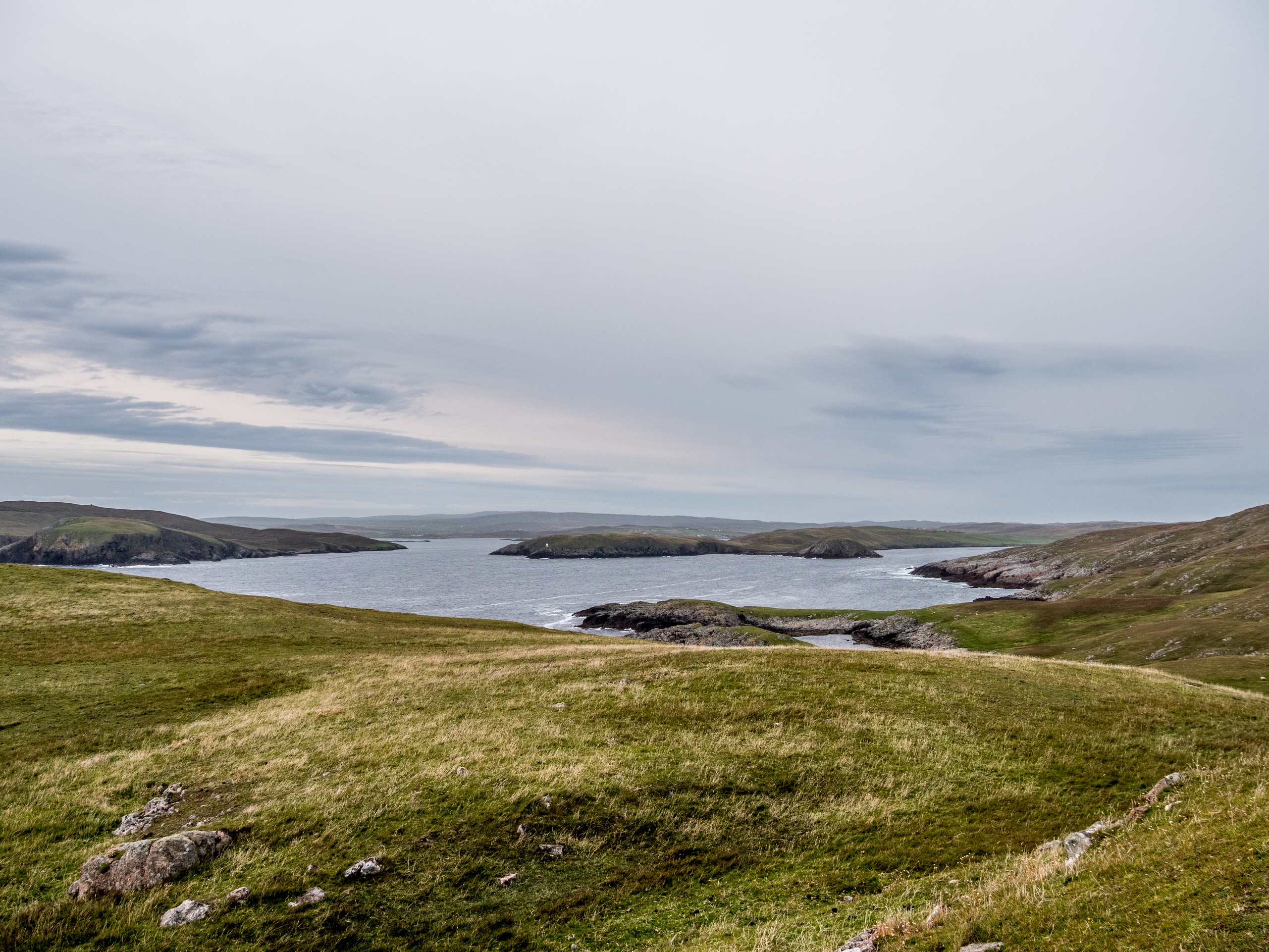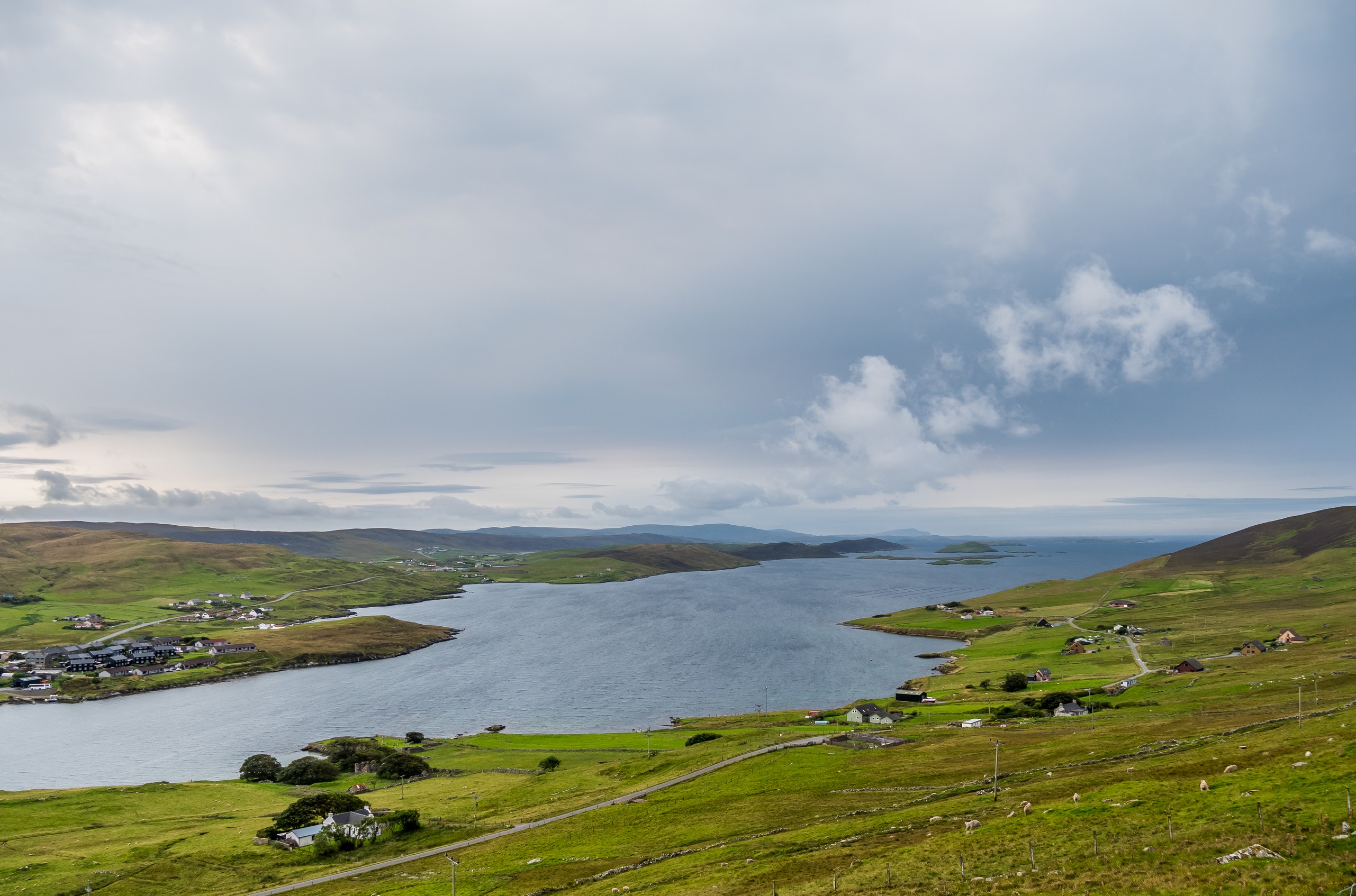 Les jours se suivent et ne se ressemblent pas sur les Shetland ! Ce matin, nous allons prendre la route de West Mainland, une des parties les moins habitées de la grande île. Demain, ce sera le tour de Northmavine mais en attendant, nous avons une météo de circonstance pour nous accompagner : grise et bouchée. Il ne pleut pas mais les nuages font la sarabande dans le ciel. Tous ces nuages apportent une sérieuse dose dramatique et sévère au paysage.
