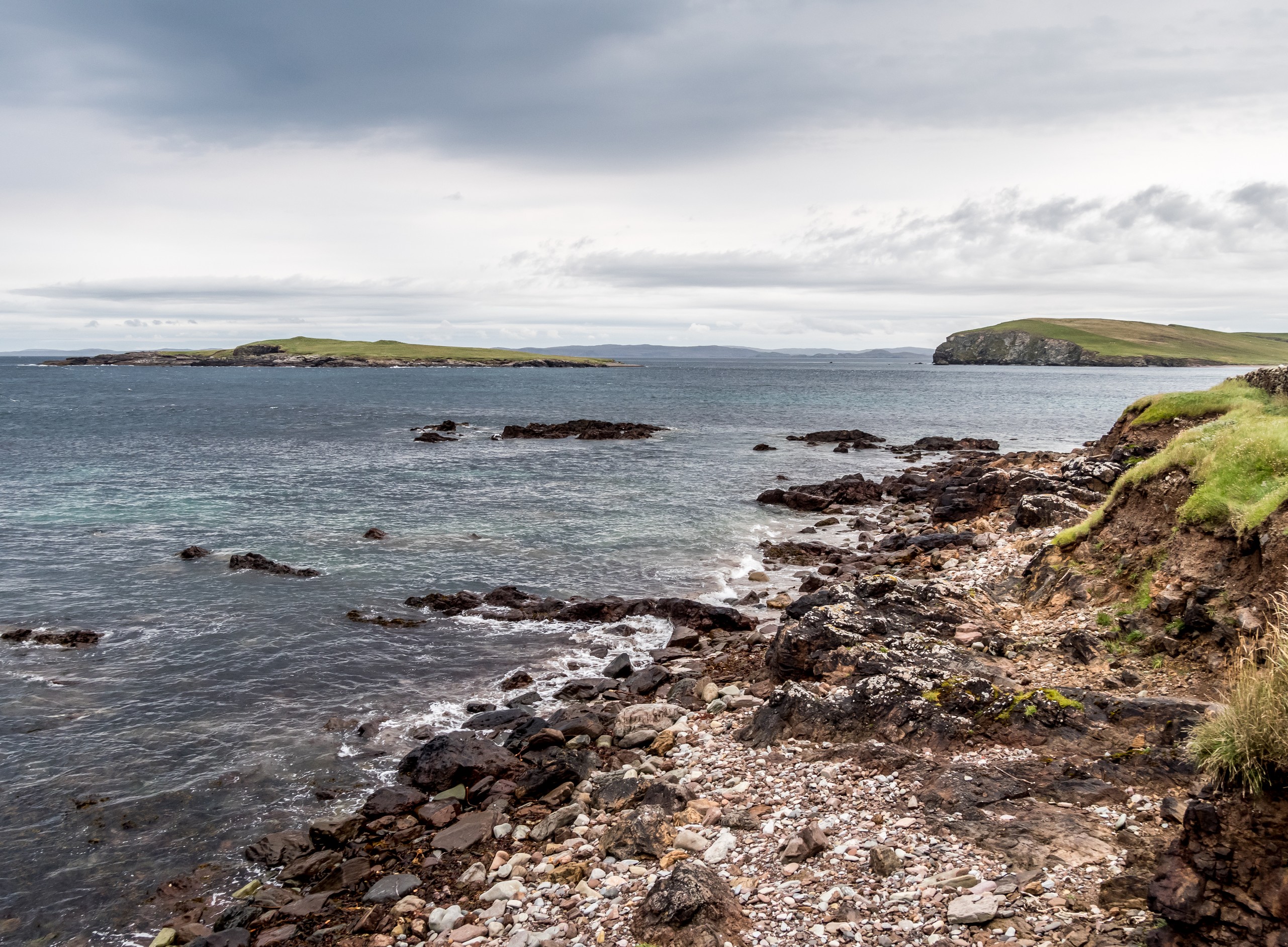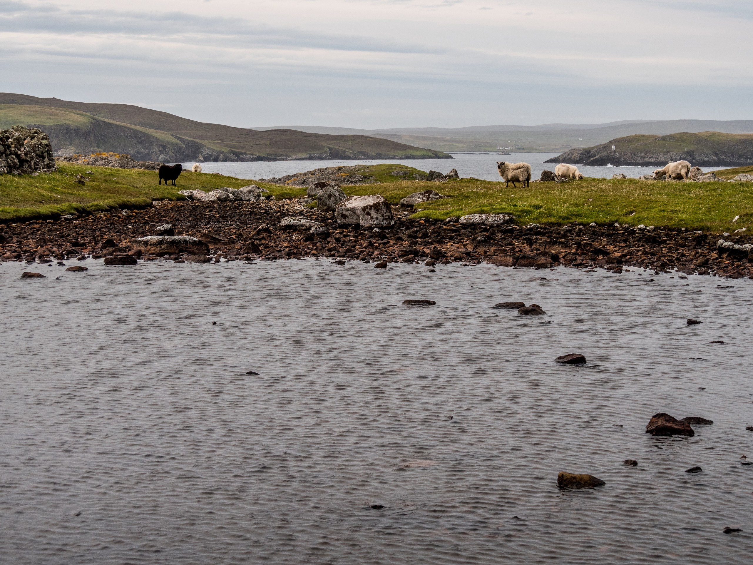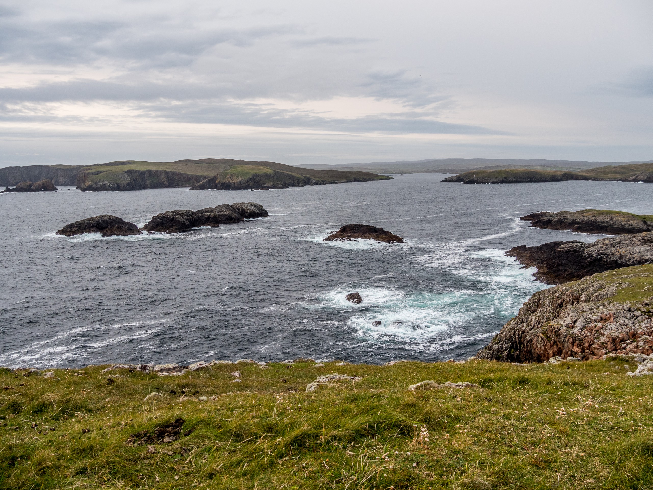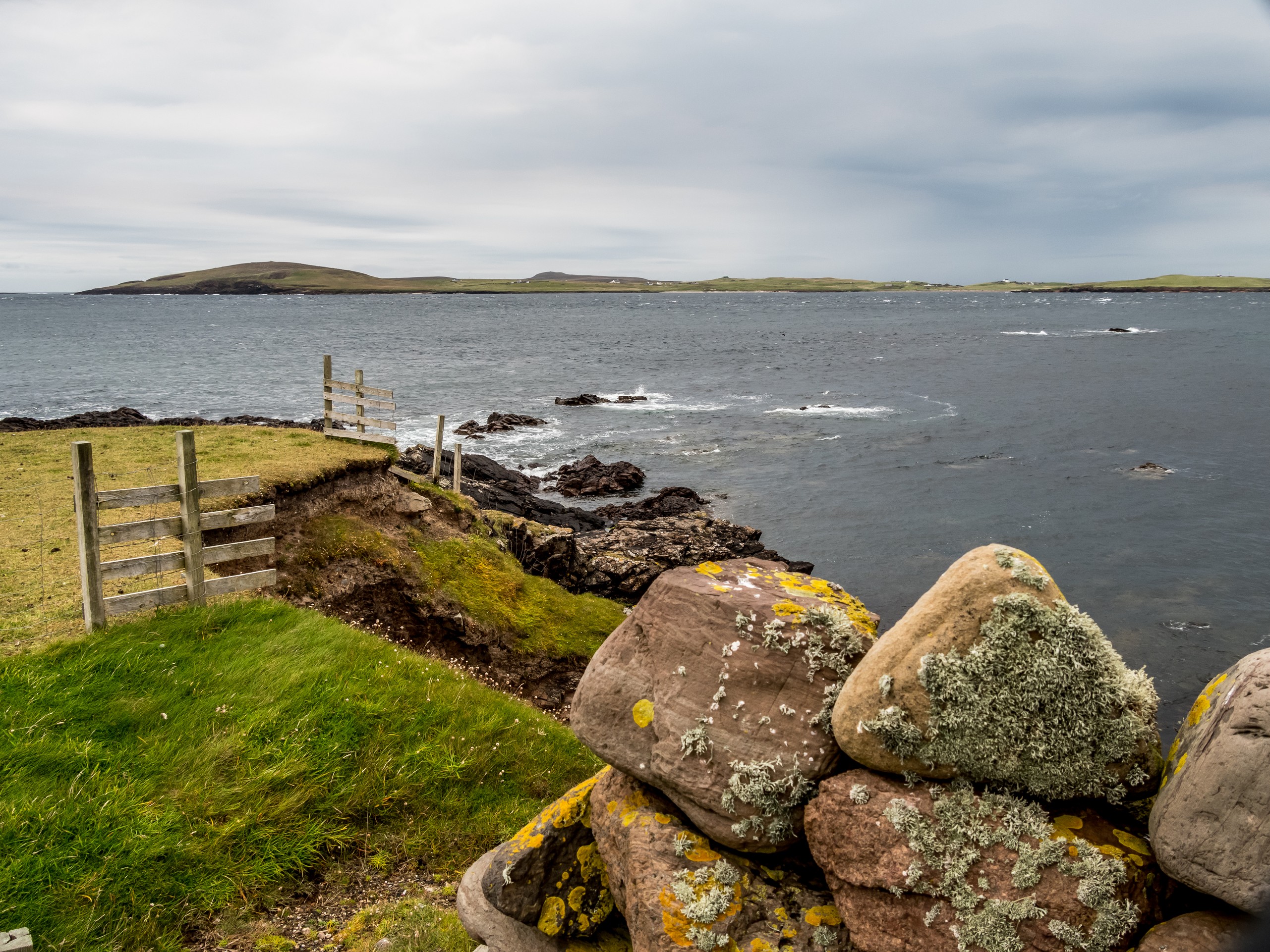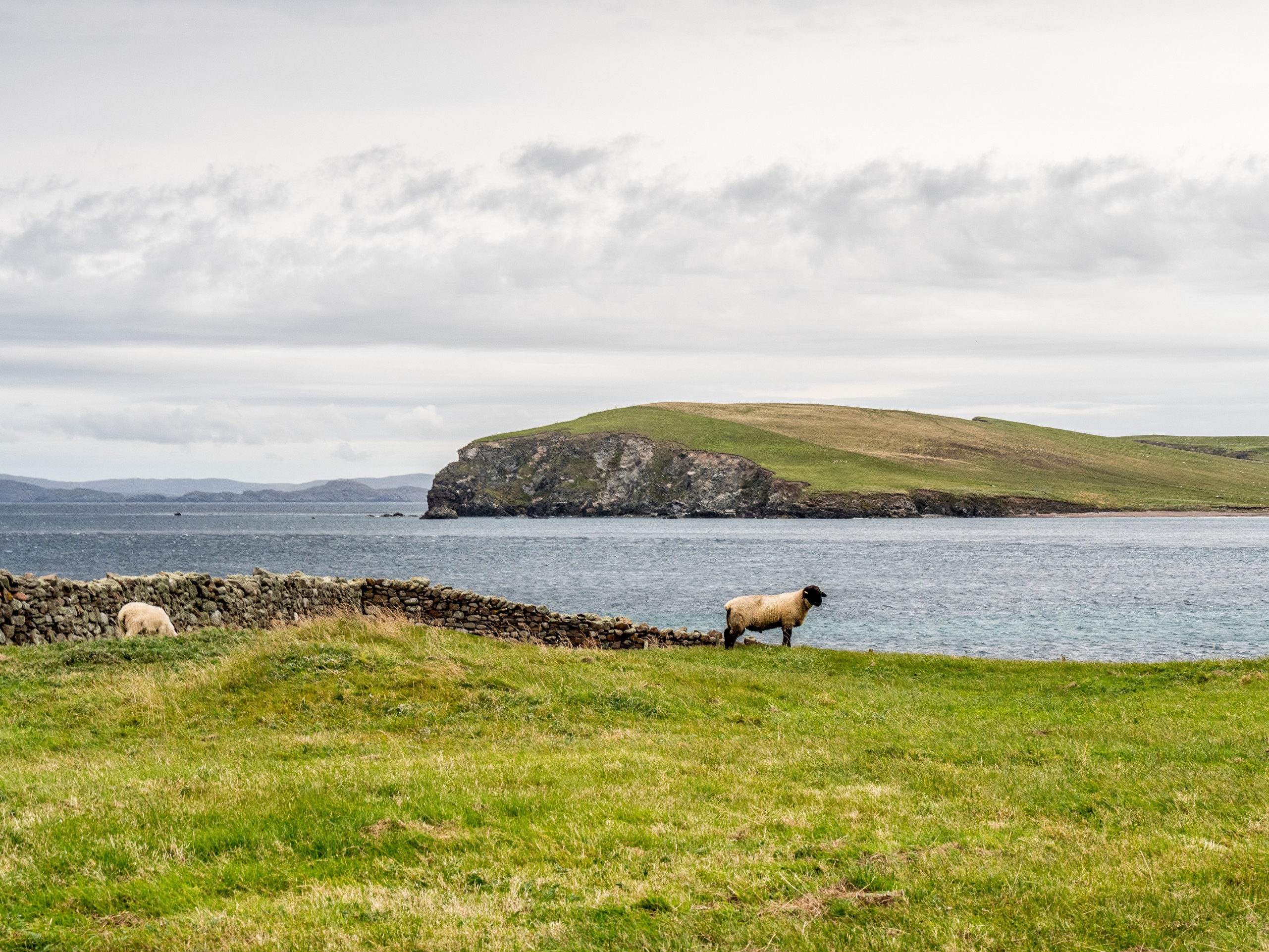 Les jours se suivent et ne se ressemblent pas sur les Shetland ! Ce matin, nous allons prendre la route de West Mainland, une des parties les moins habitées de la grande île. Demain, ce sera le tour de Northmavine mais en attendant, nous avons une météo de circonstance pour nous accompagner : grise et bouchée. Il ne pleut pas mais les nuages font la sarabande dans le ciel. Tous ces nuages apportent une sérieuse dose dramatique et sévère au paysage.
