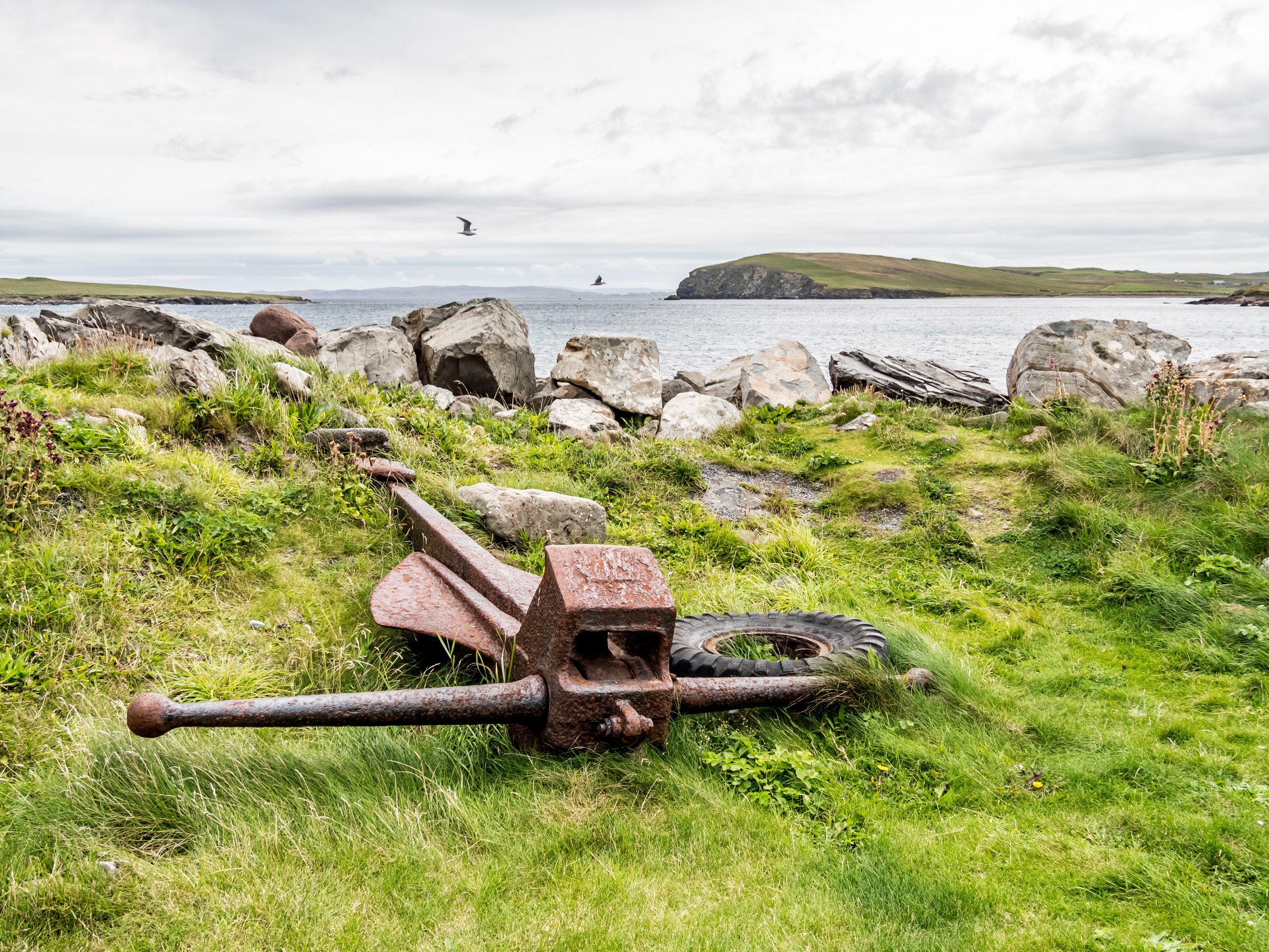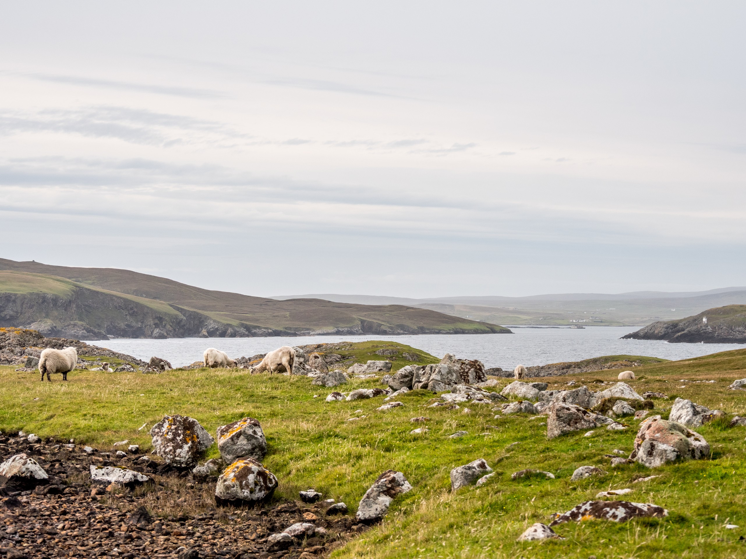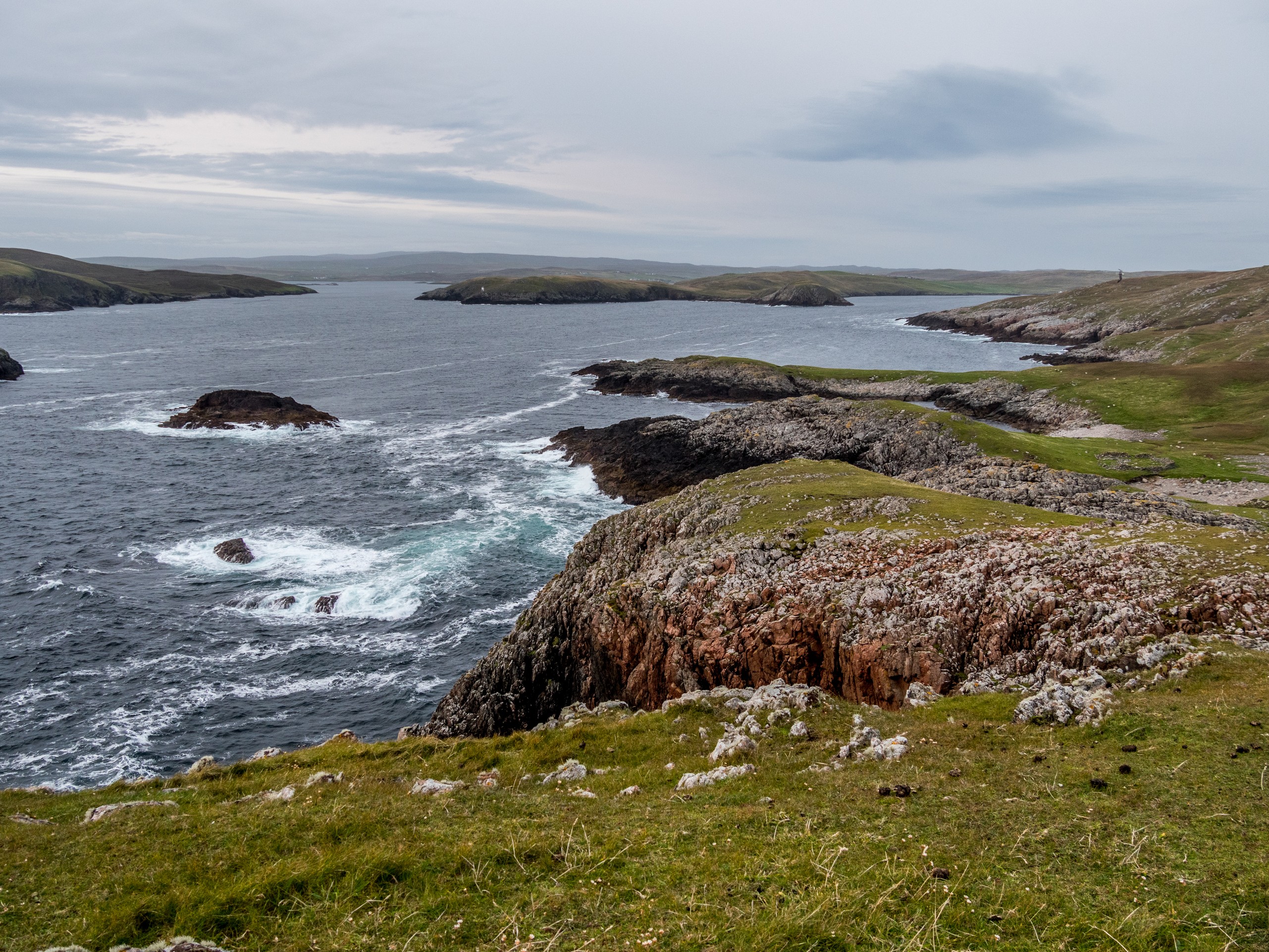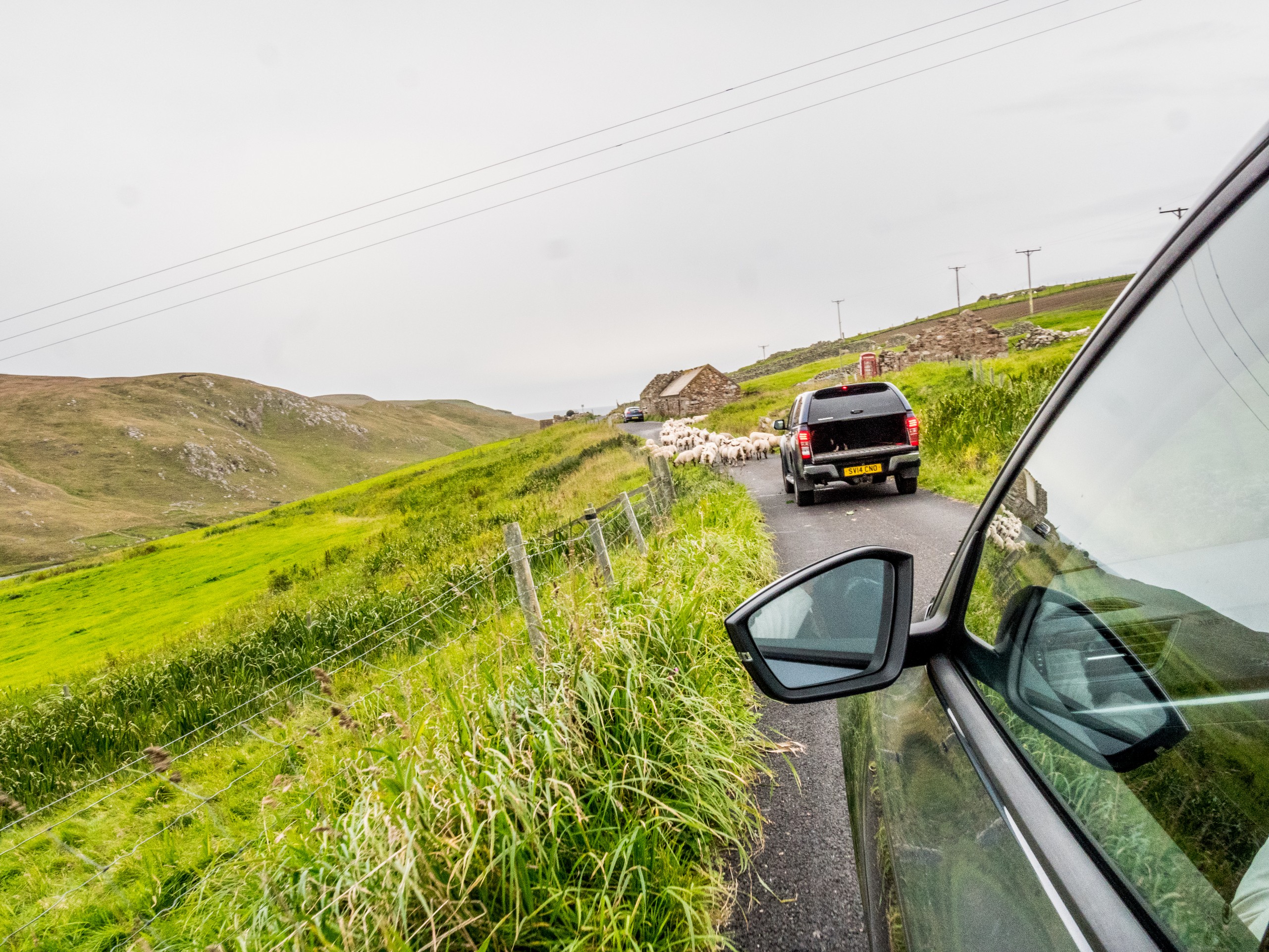 Les jours se suivent et ne se ressemblent pas sur les Shetland ! Ce matin, nous allons prendre la route de West Mainland, une des parties les moins habitées de la grande île. Demain, ce sera le tour de Northmavine mais en attendant, nous avons une météo de circonstance pour nous accompagner : grise et bouchée. Il ne pleut pas mais les nuages font la sarabande dans le ciel. Tous ces nuages apportent une sérieuse dose dramatique et sévère au paysage.