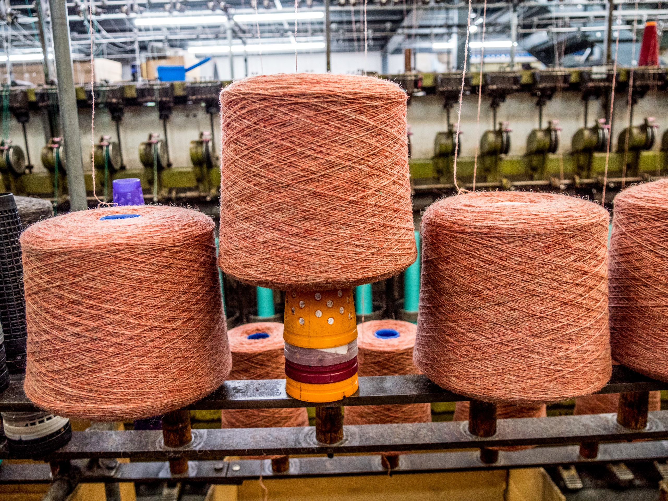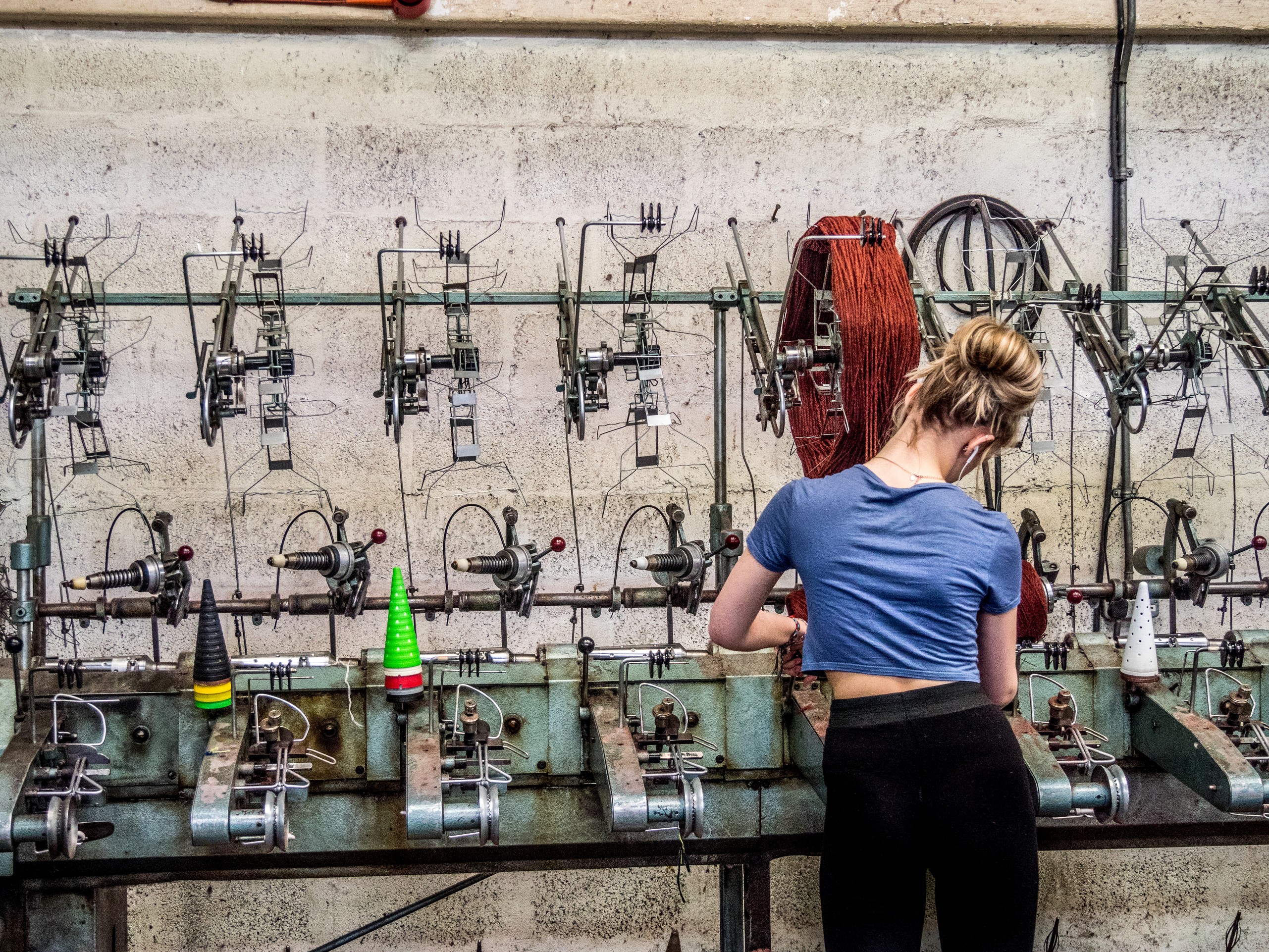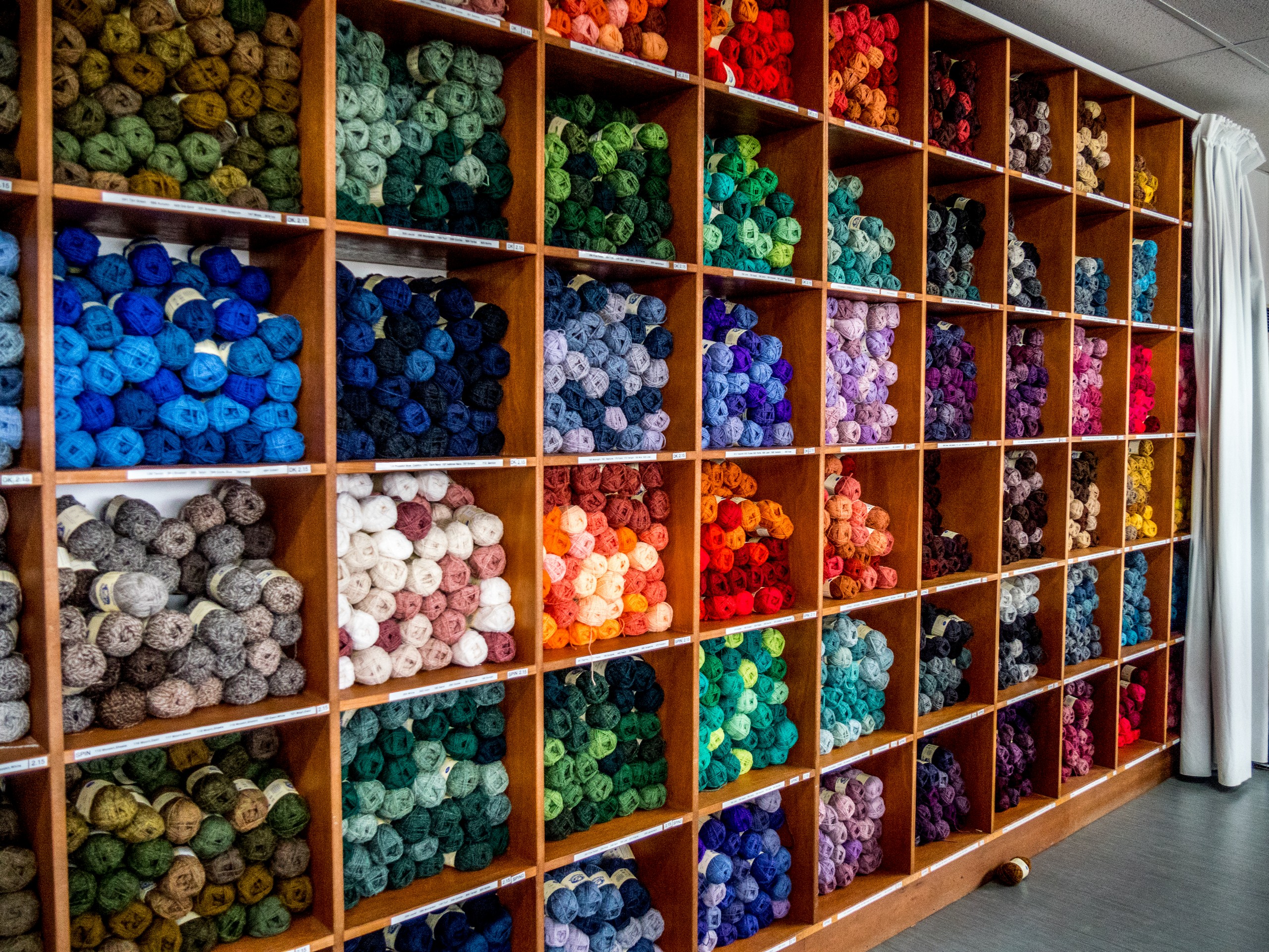 Dans la partie du nettoyage et de la préparation de la laine avant de la filer, rien n’a changé depuis plus de 100 ans. Ce sont les mêmes machines ! Et c’est plutôt comique de voir que la laine circule de poste en poste via des tubes en hauteur ! Du nettoyage de la laine, en passant par la filature, l’embobinèrent et la confection (avec une machine japonaise des années 90), Jamieson’s contrôle la chaîne totale de production. Et une fois que vous avez vu comment les pelotes ‘unicolore, bicolore, chinée, etc. etc.) sont faites et devant le grand nuancier du magasin, vous aurez envie de vous y mettre. Ça tombe bien : des patrons sont en vente et vous pourrez apprendre à faire votre pull « Fair Isle » tou.te.s seul.e.s !