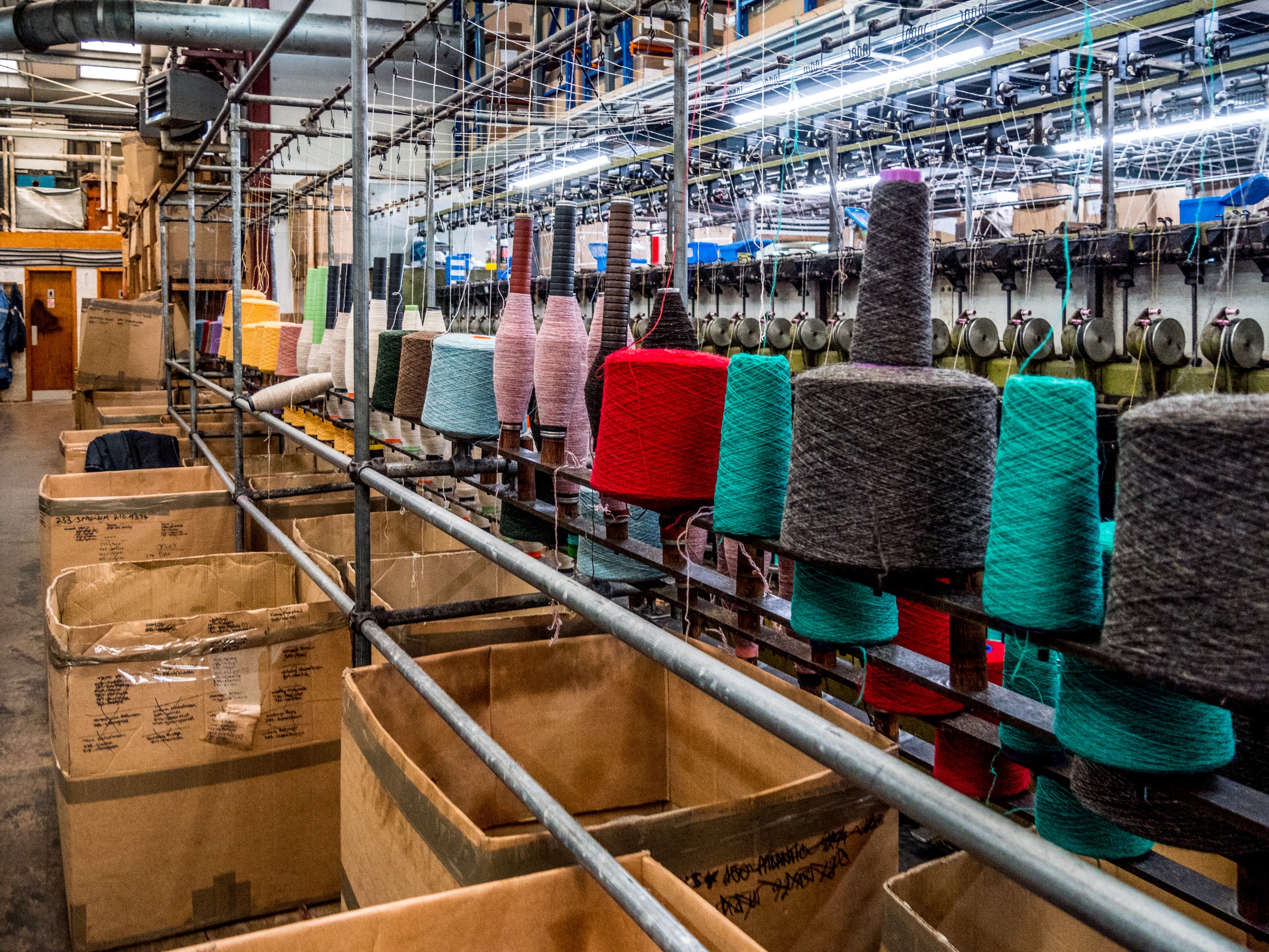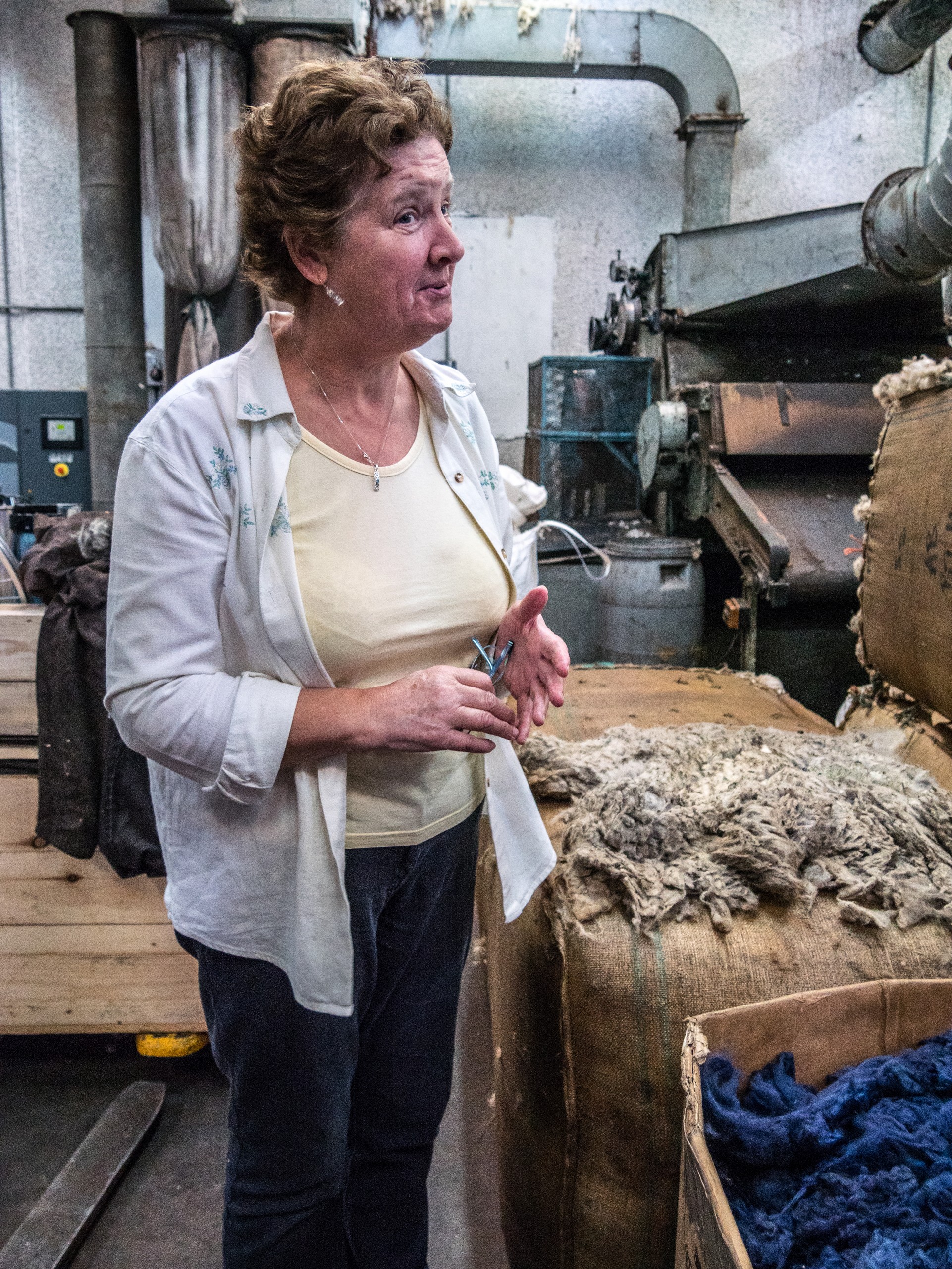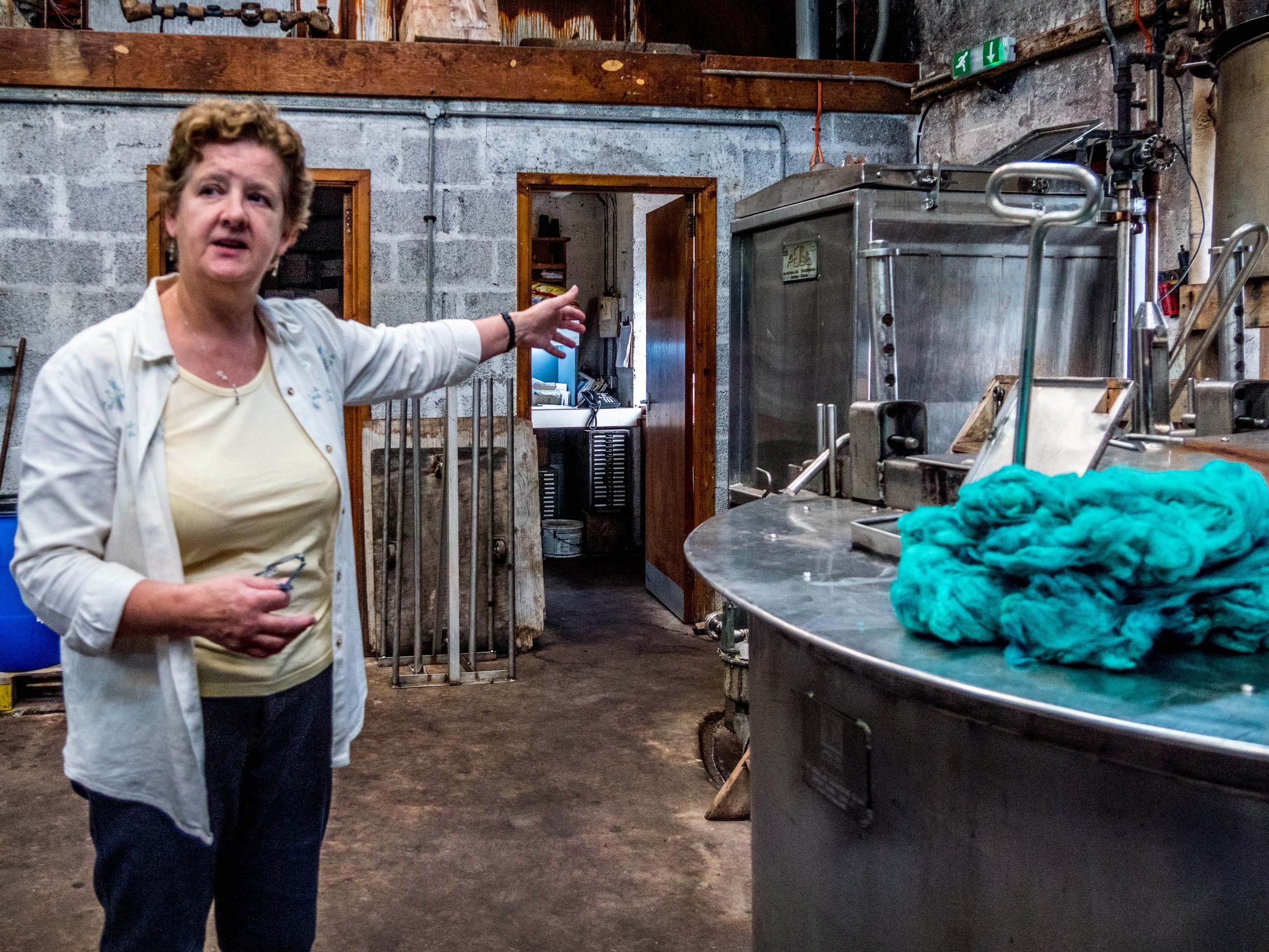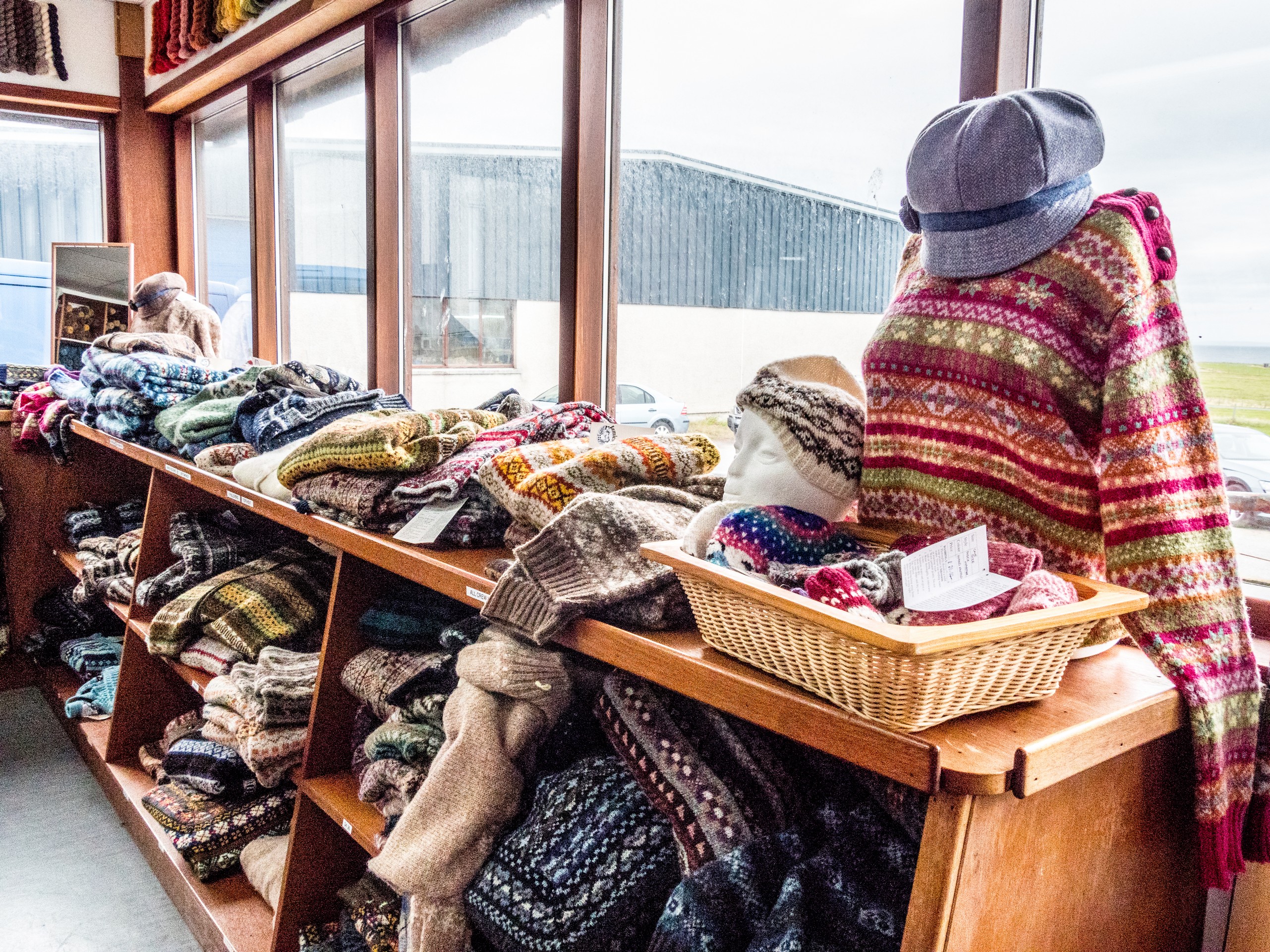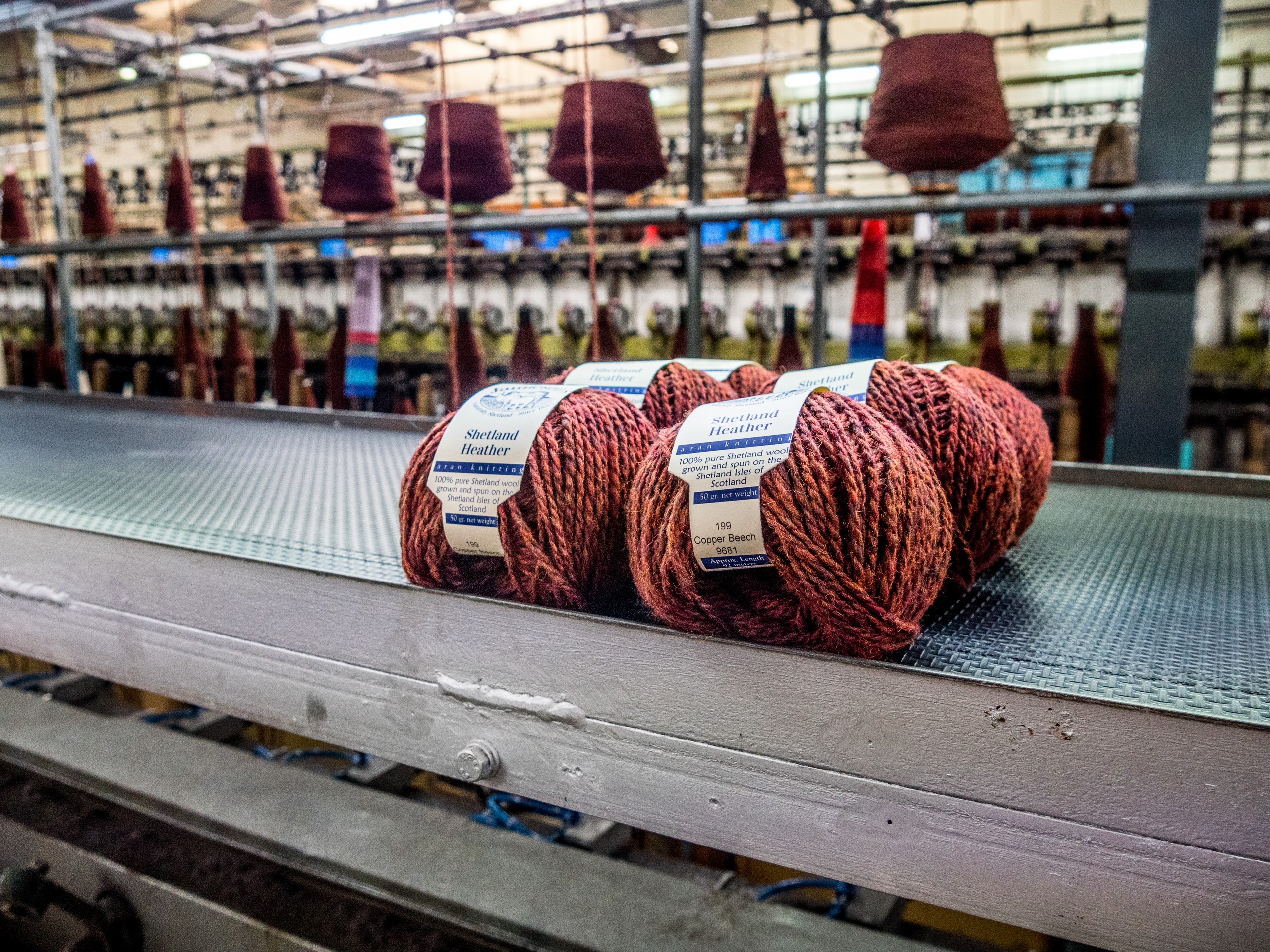 Bien qu’ailleurs désertée, West Mainland abrite un vrai trésor : la seule filature de laine encore en activité dans les Shetland. Jamieson’s est un nom bien connu des passionnés de tricot et aucun pull shetland ne peut porter ce nom s’il n’est pas fait avec des pelotes de Jamieson’s (sauf production propre) ! Jamieson’s of Shetland a son magasin à Lerwick mais dispose aussi d’une boutique à la filature. Nous avions contacté la filature à l’avance pour pouvoir la visiter et c’est Elaine, la patronne qui va nous faire le tour du propriétaire.