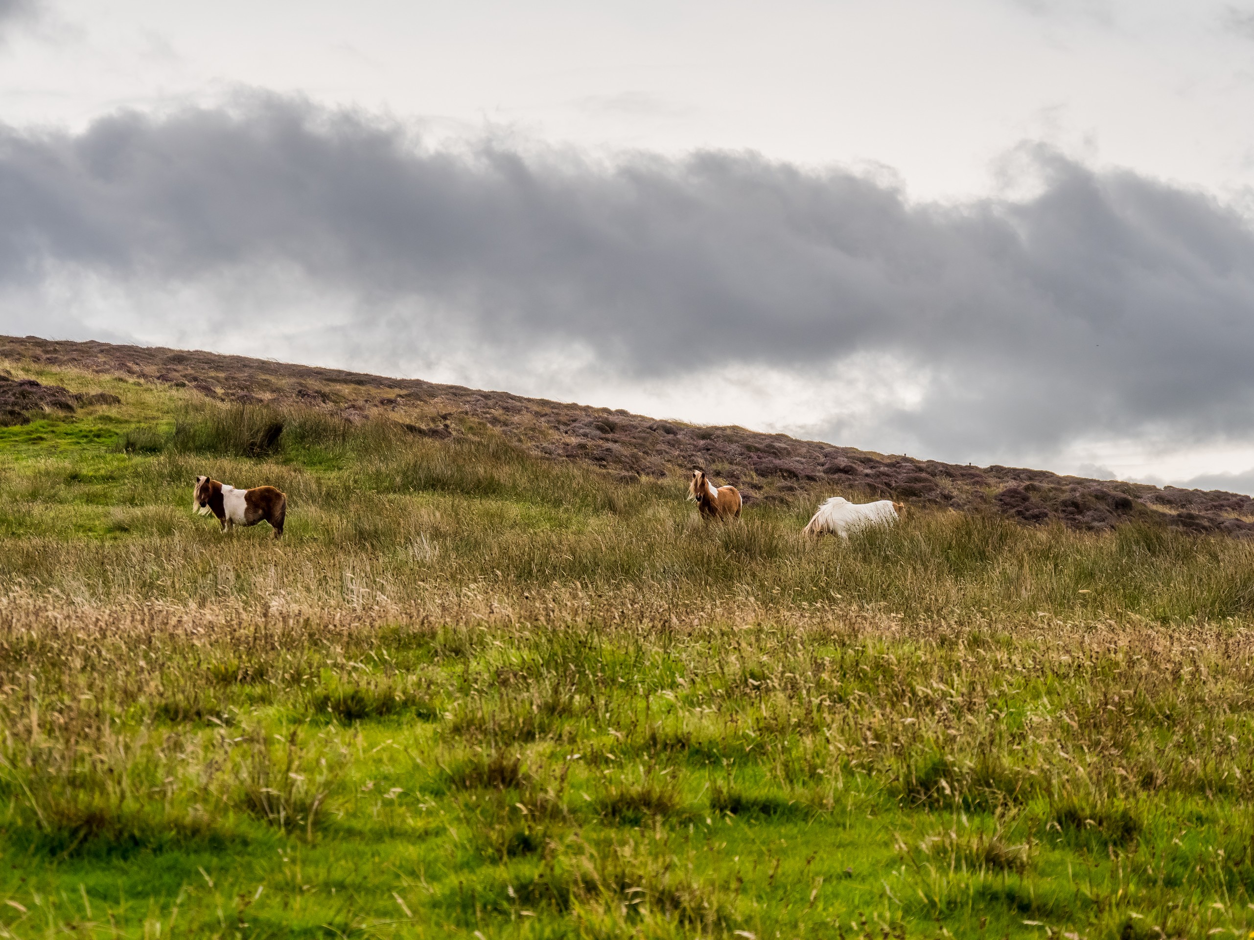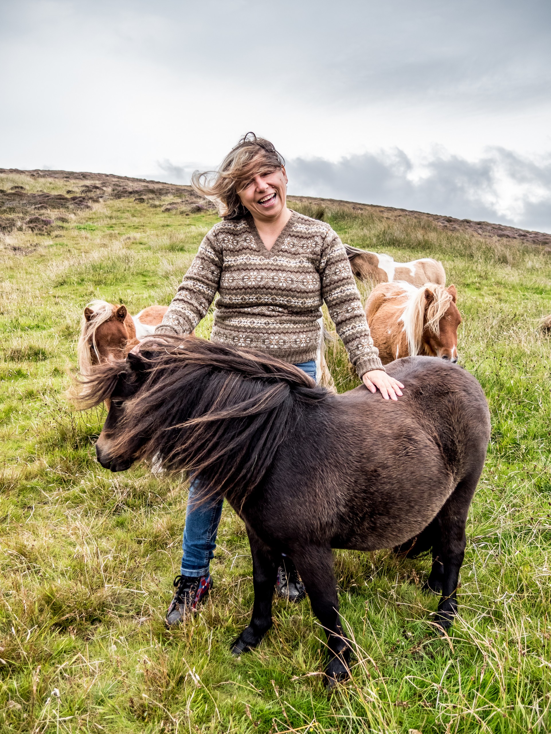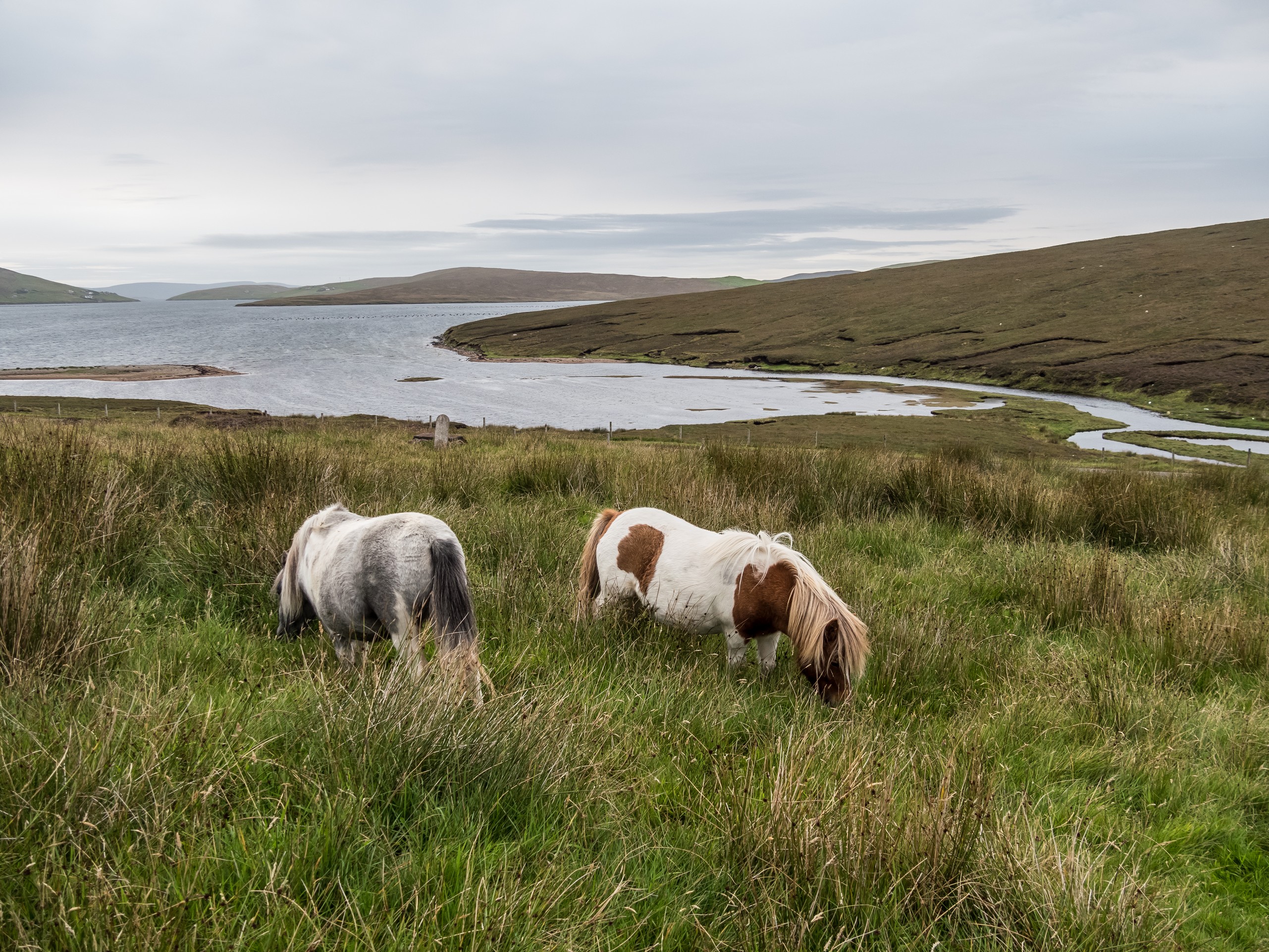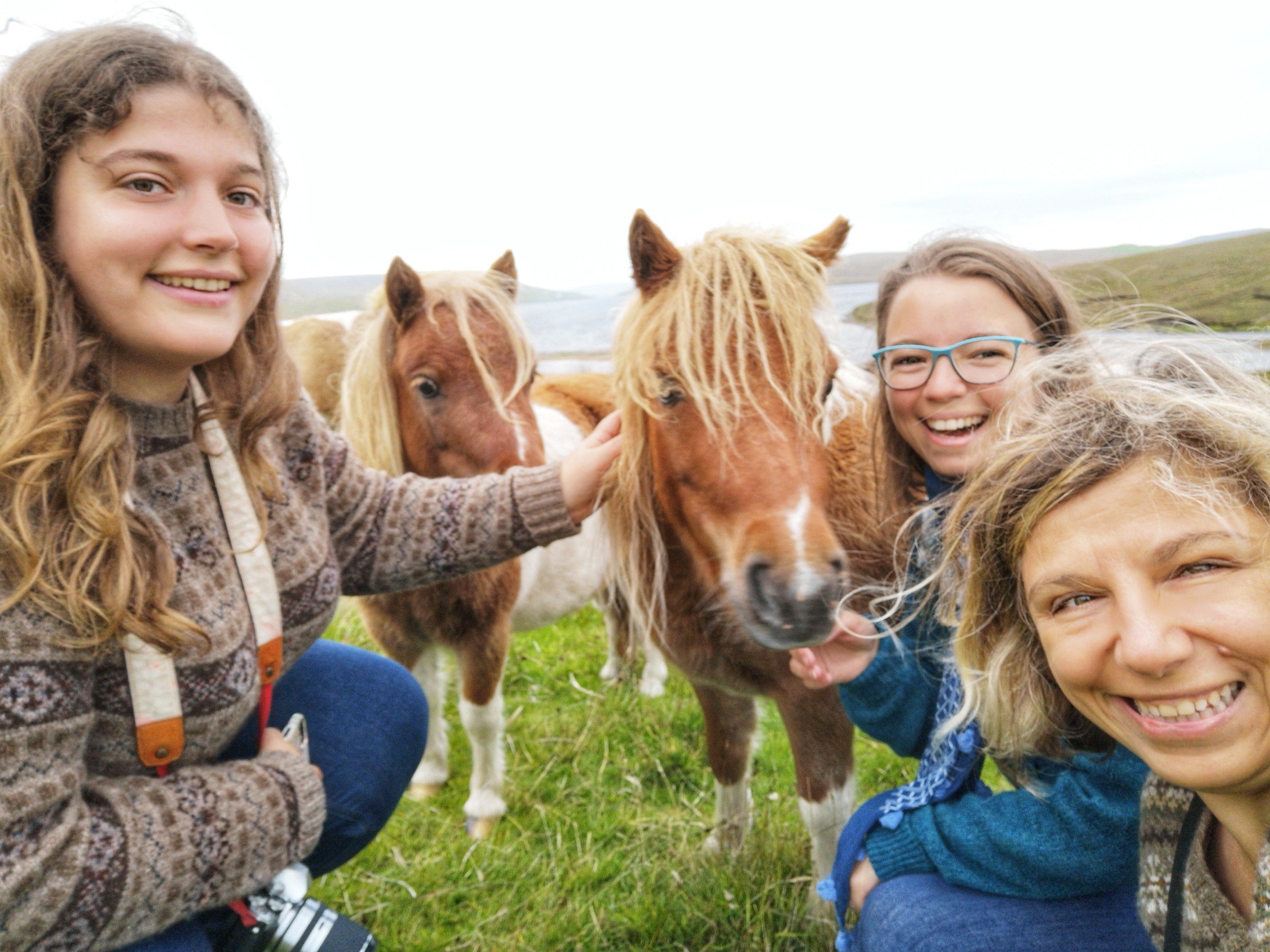 C’est bien simple, pendant que nous roulons, nous n’avons pas l’impression d’être dans la même île. Seul le vert vif de l’herbe donne une touche de couleur et pour la première fois depuis le début le début du séjour, nous perdons de vue la mer. Nous voilà qui roulons dans la lande, mélancolique et déserte. Sur ses flancs, les bruyères finissent de faner et jettent leur pâle couleur, comme un acte désespéré avant de mourir. C’est étonnant comme la météo peut influer sur un paysage, sa perception et notre humeur. Nous sommes plongées, absorbées par ce panorama désolé…. Jusqu’à ce que nous approchions du hameau de Bixter et que nos regards soient attirés par de grandes taches sur la prairie. Il n’y a pas à s’y tromper : ce sont des poneys et il doit y en avoir une dizaine ! On se précipite donc vers eux et sans problèmes, ils se laissent approcher, et même viennent vers nous et commencent à nous renifler. Je regrette un peu de ne pas avoir de pain ou de carottes, les pauvres doivent être déçus ! Bientôt, nous voilà entourées par les moins timides des poneys et on a tout le temps de les photographier… et de se faire prendre en photo avec eux dans nos beaux pulls ou gilet en pure laine des Shetland achetés la veille. Avec ce ciel rempli de nuages, la prairie et la lande et une mer bleue marine au loin, c’est vraiment LE moment quintessensciellement Shetland du voyage.
