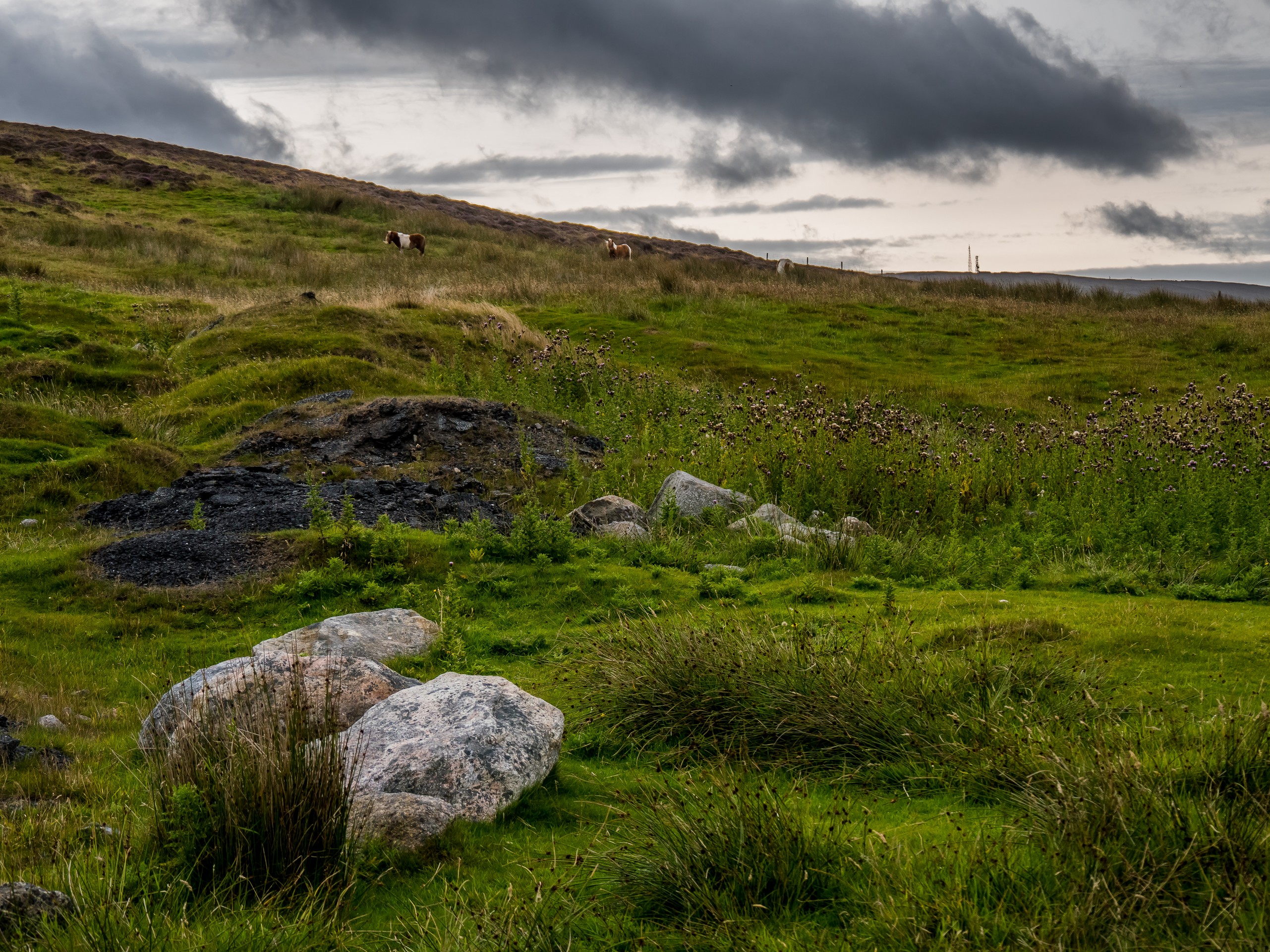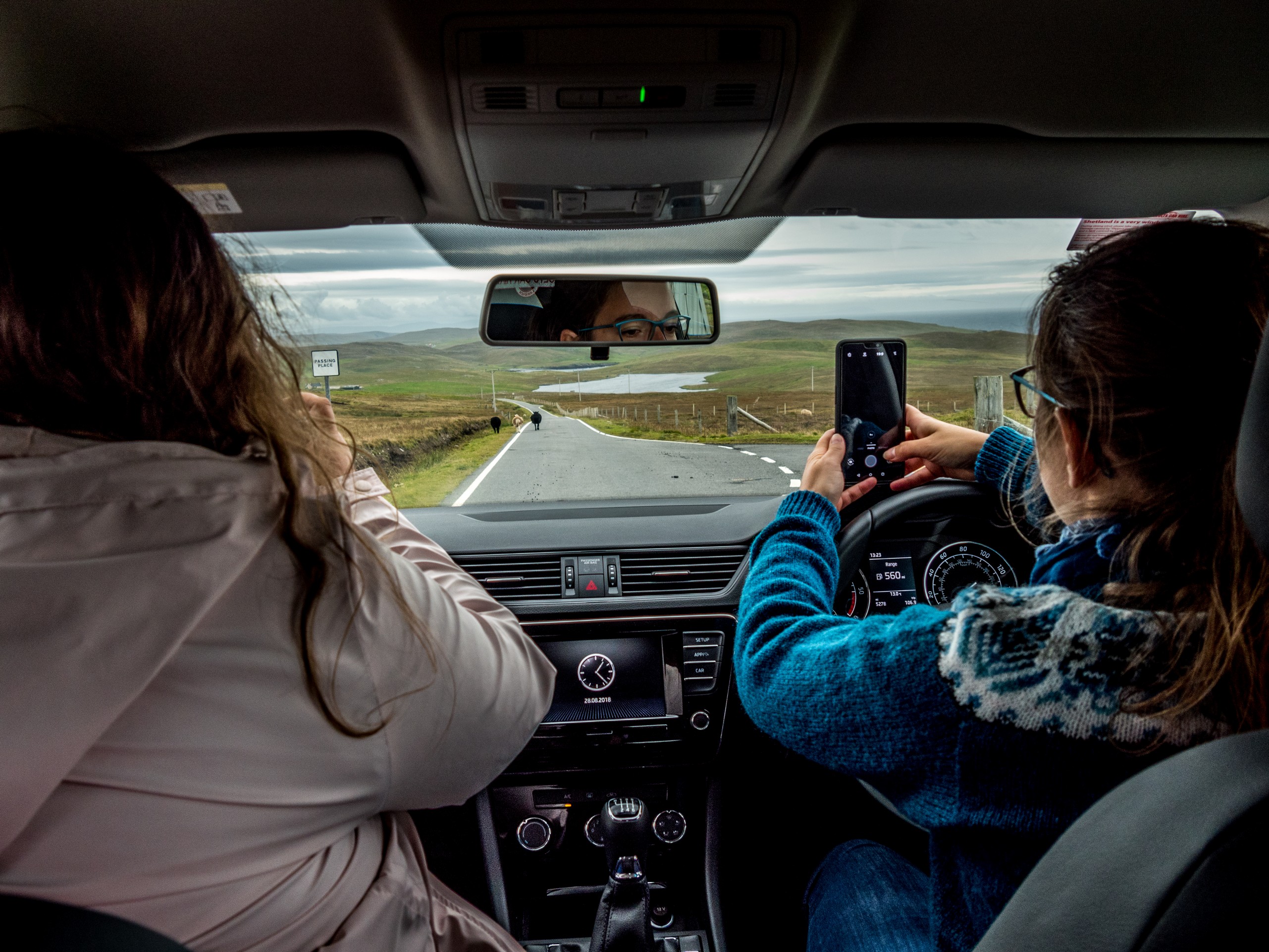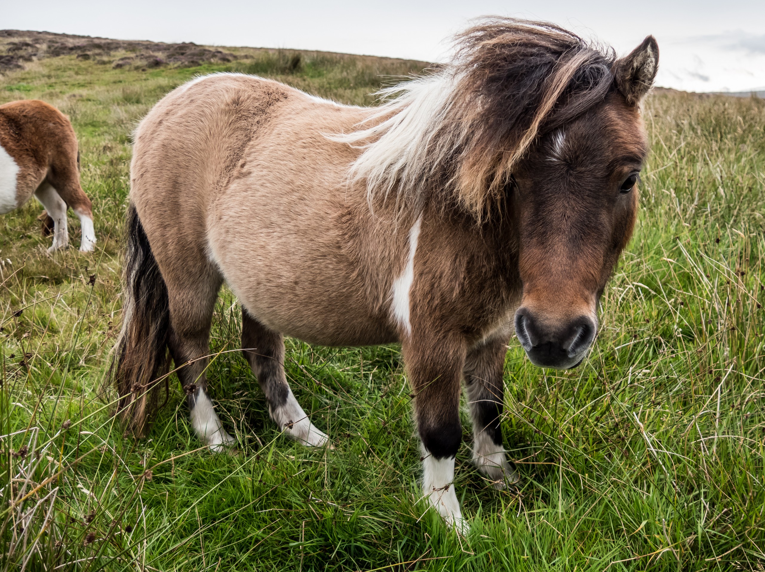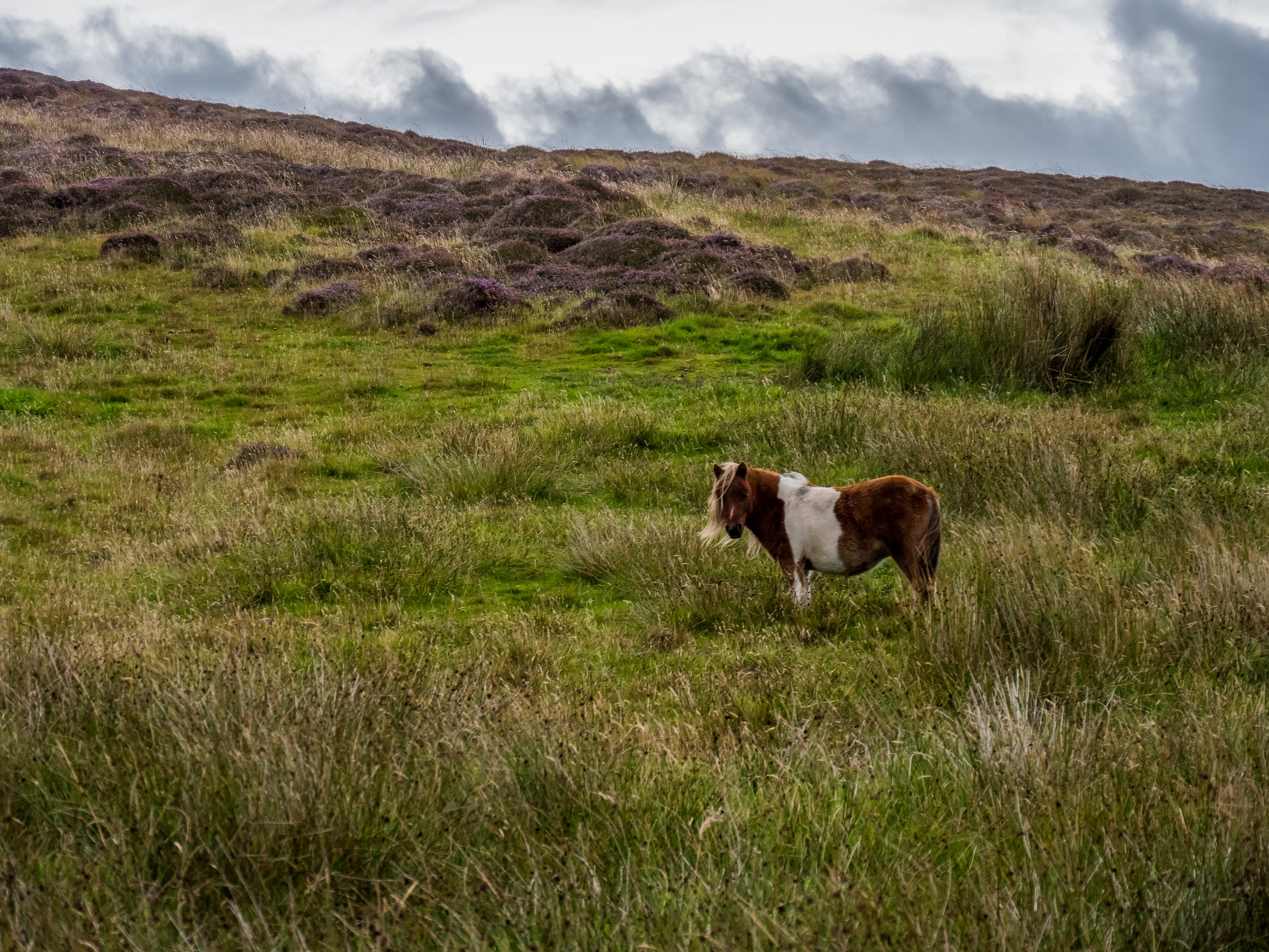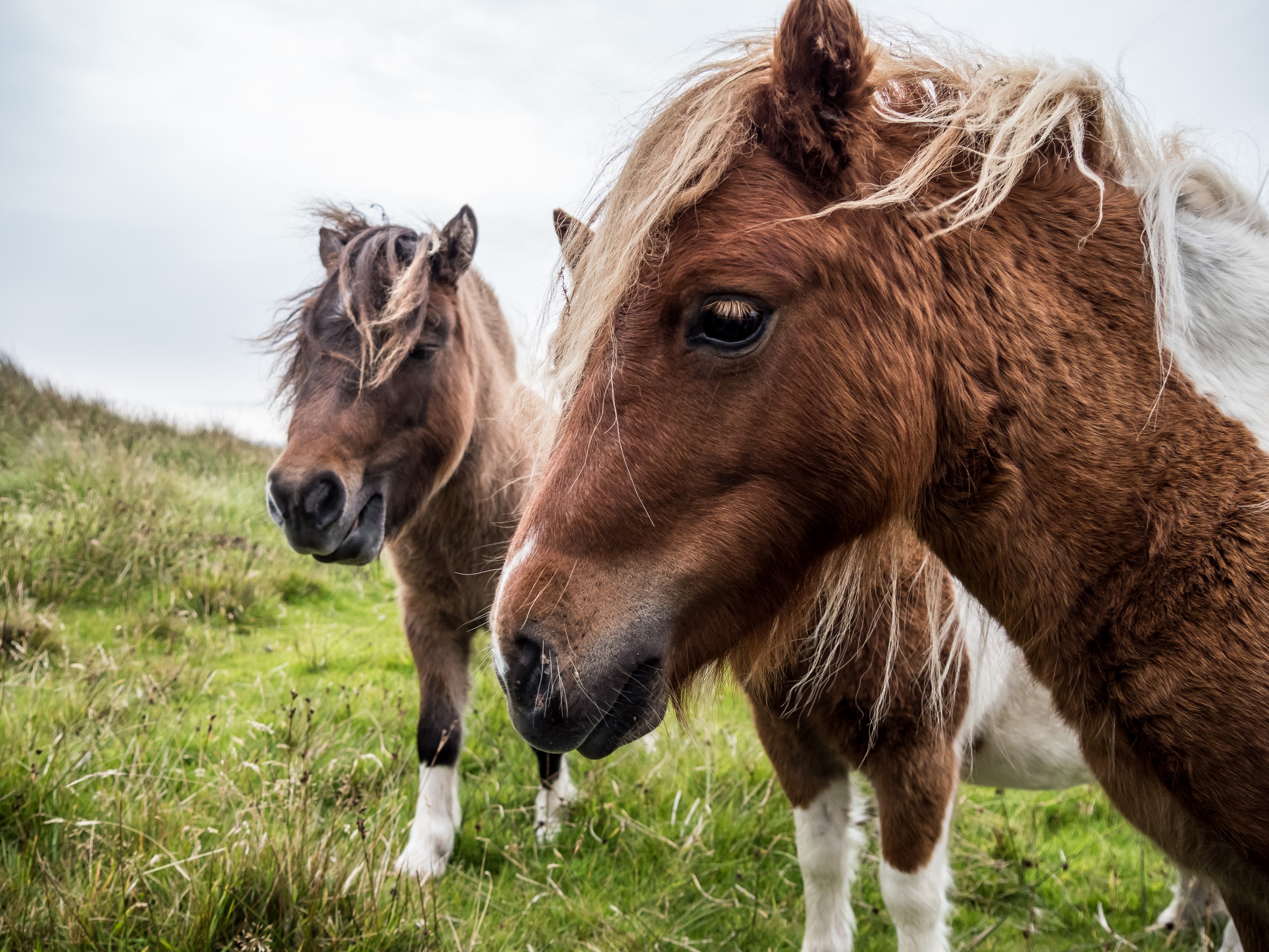 C’est bien simple, pendant que nous roulons, nous n’avons pas l’impression d’être dans la même île. Seul le vert vif de l’herbe donne une touche de couleur et pour la première fois depuis le début le début du séjour, nous perdons de vue la mer. Nous voilà qui roulons dans la lande, mélancolique et déserte. Sur ses flancs, les bruyères finissent de faner et jettent leur pâle couleur, comme un acte désespéré avant de mourir. C’est étonnant comme la météo peut influer sur un paysage, sa perception et notre humeur. Nous sommes plongées, absorbées par ce panorama désolé…. Jusqu’à ce que nous approchions du hameau de Bixter et que nos regards soient attirés par de grandes taches sur la prairie. Il n’y a pas à s’y tromper : ce sont des poneys et il doit y en avoir une dizaine ! On se précipite donc vers eux et sans problèmes, ils se laissent approcher, et même viennent vers nous et commencent à nous renifler. Je regrette un peu de ne pas avoir de pain ou de carottes, les pauvres doivent être déçus ! Bientôt, nous voilà entourées par les moins timides des poneys et on a tout le temps de les photographier… et de se faire prendre en photo avec eux dans nos beaux pulls ou gilet en pure laine des Shetland achetés la veille. Avec ce ciel rempli de nuages, la prairie et la lande et une mer bleue marine au loin, c’est vraiment LE moment quintessensciellement Shetland du voyage.